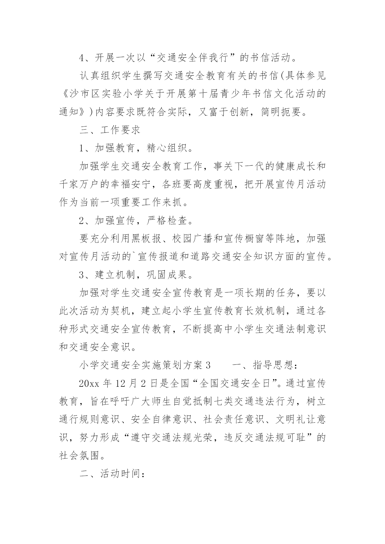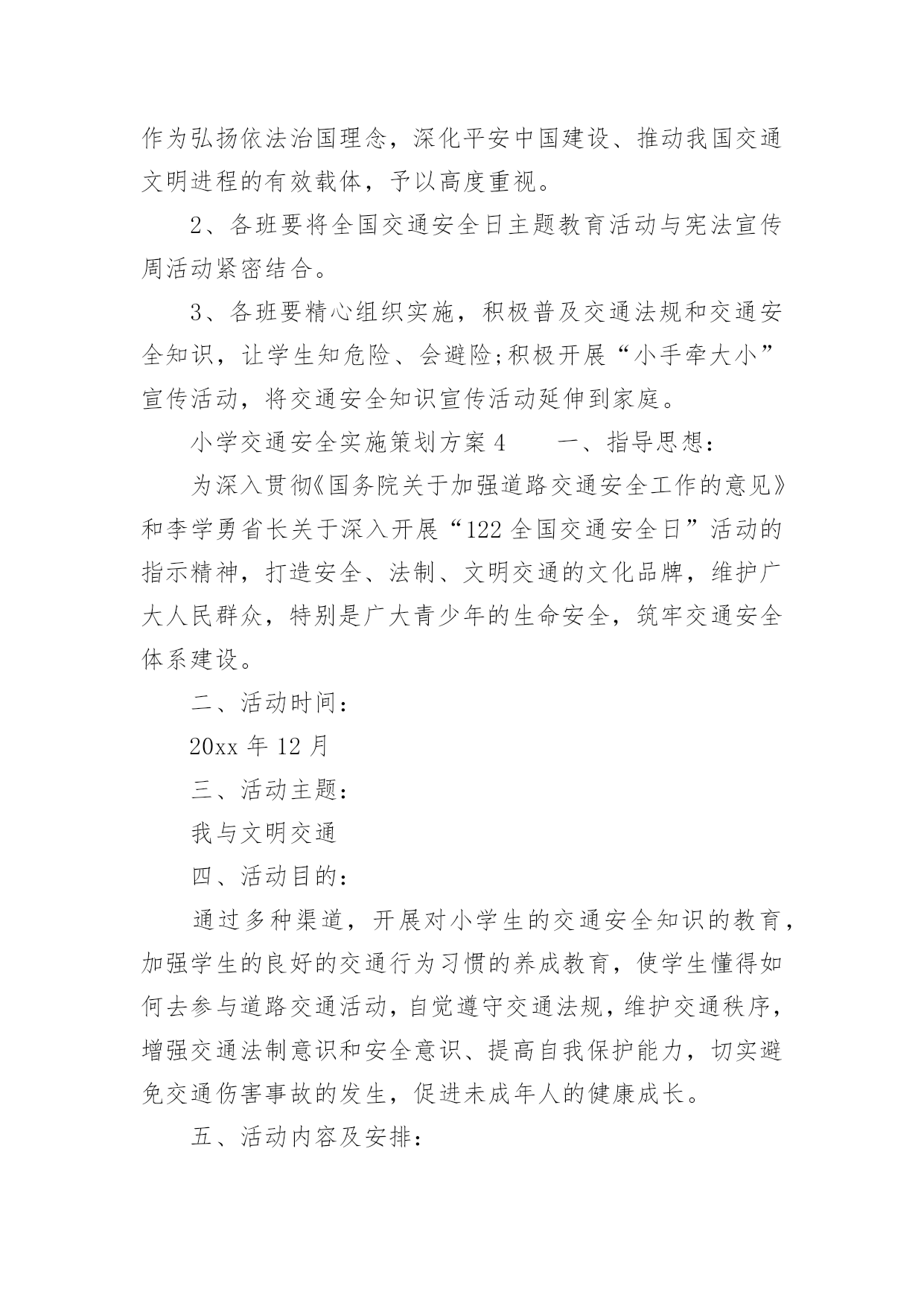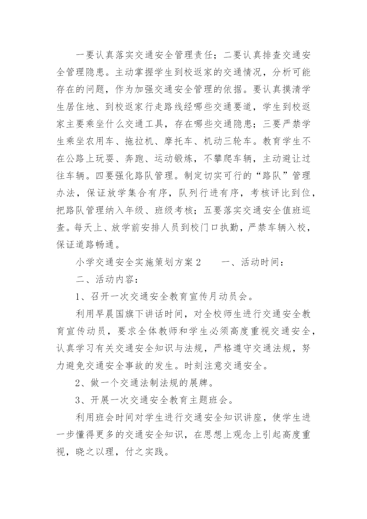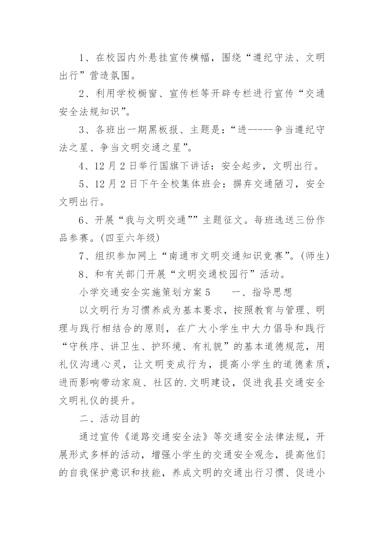 小学交通安全实施策划方案小学交通安全实施策划方案范文(精选5篇)为了确保事情或工作安全顺利进行,就常常需要事先准备方案,方案一般包括指导思想、主要目标、工作重点、实施步骤、政策措施、具体要求等项目。那么应当如何制定方案呢?以下是小编为大家整理的小学交通安全实施策划方案范文(精选5篇),欢迎大家借鉴与参考,希望对大家有所帮助。小学交通安全实施策划方案1一、总体思路按照“政府领导、部门协作、齐抓共管、综合治理”的道路交通安全管理格局,坚持“安全第一,预防为主、综合治理”方案,牢固树立“隐患即事故”,“安全即发展”的理念。强化师生的安全意识,在校园内大力宣传交通方面的法律法规,进一步加大交通安全隐患排查治理力度,保障师生的生命财产安全。二、工作目标通过本次交通安全集中整治行动,对学生的交通安全教育到位,不发生涉及学校或学生责任的重特大交通事故;对校园内外的交通管理到位,不发生校内外道路交通事故。通过专项整治,我校交通安全隐患得到根本性治理,交通安全条件充分改善;校园周边交通安全设施更加完善。三、成立道路交通安全整治小组组长:苏孝春副组长:许兴贵成员:各班班主任四、整治内容(一)完善学校交通安全制度。(二)将交通安全教育纳入学校教育教学计划,定期开展以交通安全为主题的教育活动。(三)加强对学生放学乘坐车辆进行督察。(四)禁止学生骑自行车上下学,对学生回家途中加强教育,路途中严禁打闹,追逐,遵守交通规则。(五)坚持上下学排路队并由值班领导和教师在校门口接送学生。五、整治步骤学校交通安全隐患排查治理工作实施。(一)调查摸底,隐患排查按照要求制定实施方案,对本校交通安全隐患进行拉网式排查,及时对排查出的事故隐患进行梳理建档,着重排查以下几种情况:1、学生骑自行车上下学情况。2、学生回家情况。3、校门路口警示标志。(二)制定措施,集中整治阶段针对排查出的交通安全隐患,实行分级负责,逐一整改,做到整改、责任、措施、时间、预案“五落实”,确保安全无事故。1、健全组织,明确职责。结合这次交通安全集中整治活动,完善安全组织,形成安全管理网络。建立交通安全集中整治行动领导小组,制定方案,合理分工,明确职责,展开工作,严格落实。2、大力宣传,强化意识。要把交通安全知识纳入学校教学计划和法制教育内容,通过主题班会、板报宣传、校园广播、国旗下讲话等多种形式,组织学生、教职工学习交通法律法规和交通安全基本知识,提高交通安全意识和自我防护能力,养成文明交通行为,彻底告别交通陋习。3、制定措施,全面整改。对排查出的交通安全隐患,深入研究,逐一制定整改计划,落实整改措施,治理安全隐患。校长严格把关,不留死角,做到“四不放过”。4、突出重点,加强督查。要抓住本校交通安全的重点隐患,制定切实可行的防范措施,组织专人专项管理,并制定道路交通安全事故应急预案。5、健全制度,长效管理。根据本校实际情况,健全各项规章制度,建立交通安全管理台账,把交通安全管理作为本校安全管理的一个重要组成部分,实行常规管理,完善应急救援预案,积极开展应急演练,提高应急处置能力。签订师生安全责任书,充分掌握师生员工乘车情况、学生上下学情况等,及时发现新情况,不断研究新问题,落实新措施,杜绝新隐患。六、工作要求(一)提高认识,宣传到位。迅速召开会议,及时传达长春中心小学《2017年秋季道路交通安全综合整治方案的通知》精神,进一步进行动员部署。组织教师向学生宣讲交通安全常识,教育学生不乘超载车、不乘“黑车”、不乘三轮车、农用车、拖拉机等非客运车辆,自觉抵制各类交通违法行为,提高安全防范意识;要利用广播开展专题宣传,广泛开展交通安全提示;切实加大宣传力度,借助校园广播、墙报、主题班会、签订《交通安全责任书》等形式深入宣传道路交通安全专项整治行动,劝告学生家长不雇用无资质的车辆、驾驶人接送学生。同时,要设立监督举报电话,鼓励广大群众积极举报非法接送学生车辆。全方位、针对性地抓好学生交通安全教育,普及交通安全常识,提高自护能力,做到“不伤害自己,不伤害他人,不被他人伤害”。(二)加强领导,落实责任。成立学校交通安全专项整治工作领导小组。进一步明确校长、班主任、任课教师在交通安全管理和教育方面的职责,按照“谁主管、谁负责;谁在岗、谁负责”的要求,结合实际,制定工作方案、明确分工、落实责任、精心组织,使全体教职员工都承担起安全管理和教育的责任,形成统一领导,分工负责、协调一致的工作格局。(三)加强管理,排查到位。一要认真落实交通安全管理责任;二要认真排查交通安全管理隐患。主动掌握学生到校返家的交通情况,分析可能存在的问题,作为加强交通安全管理的依据。要认真摸清学生居住地、到校返家行走路线经哪些交通要道,学生到校返家主要乘坐什么交通工具,存在哪些交通隐患;三要严禁学生乘坐农用车、拖拉机、摩托车、机动三轮车。教