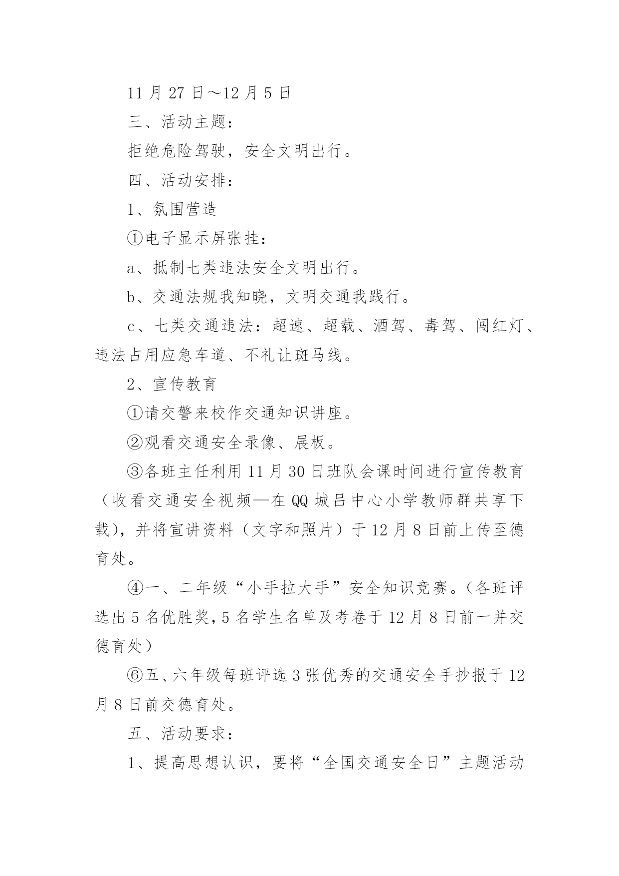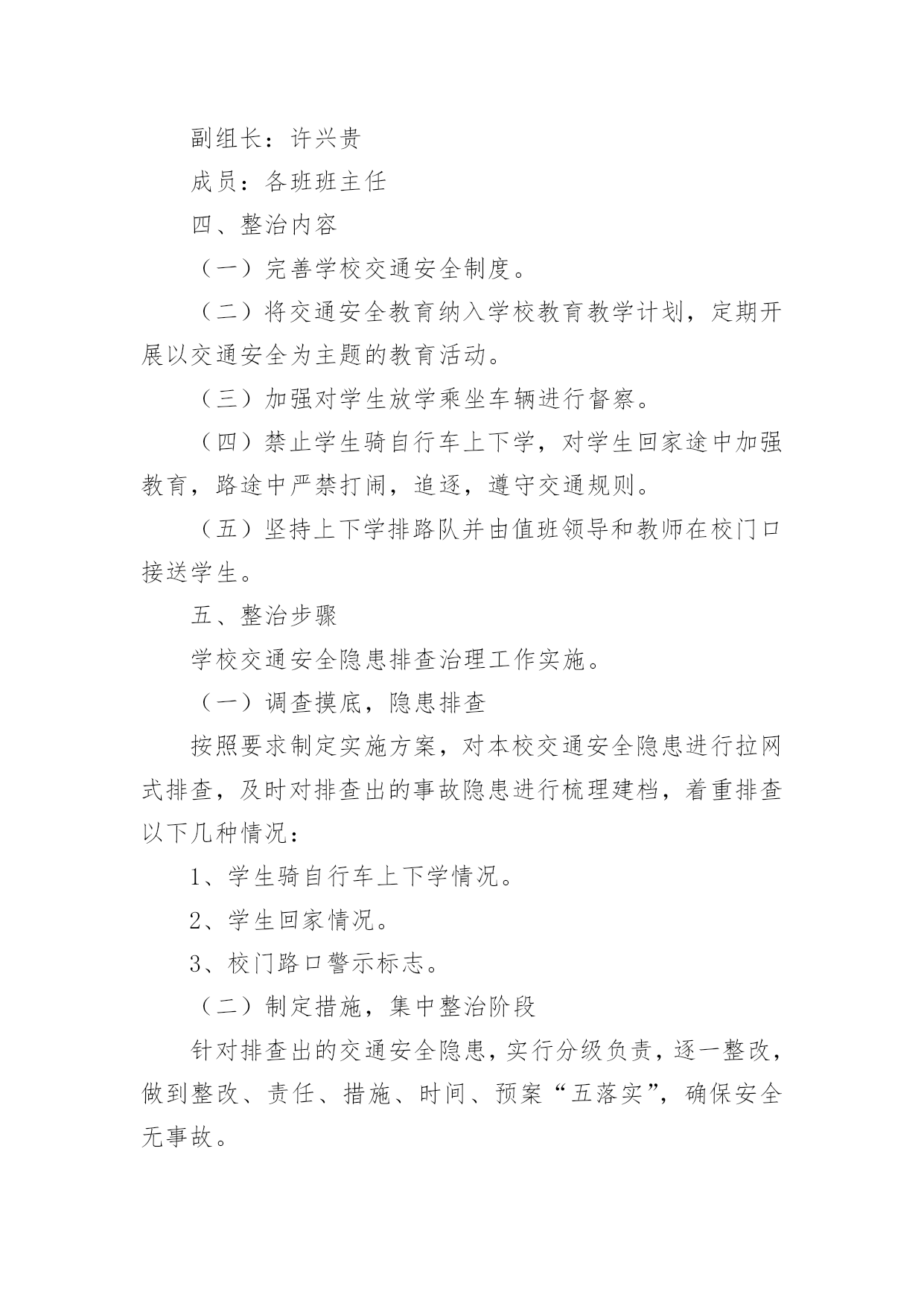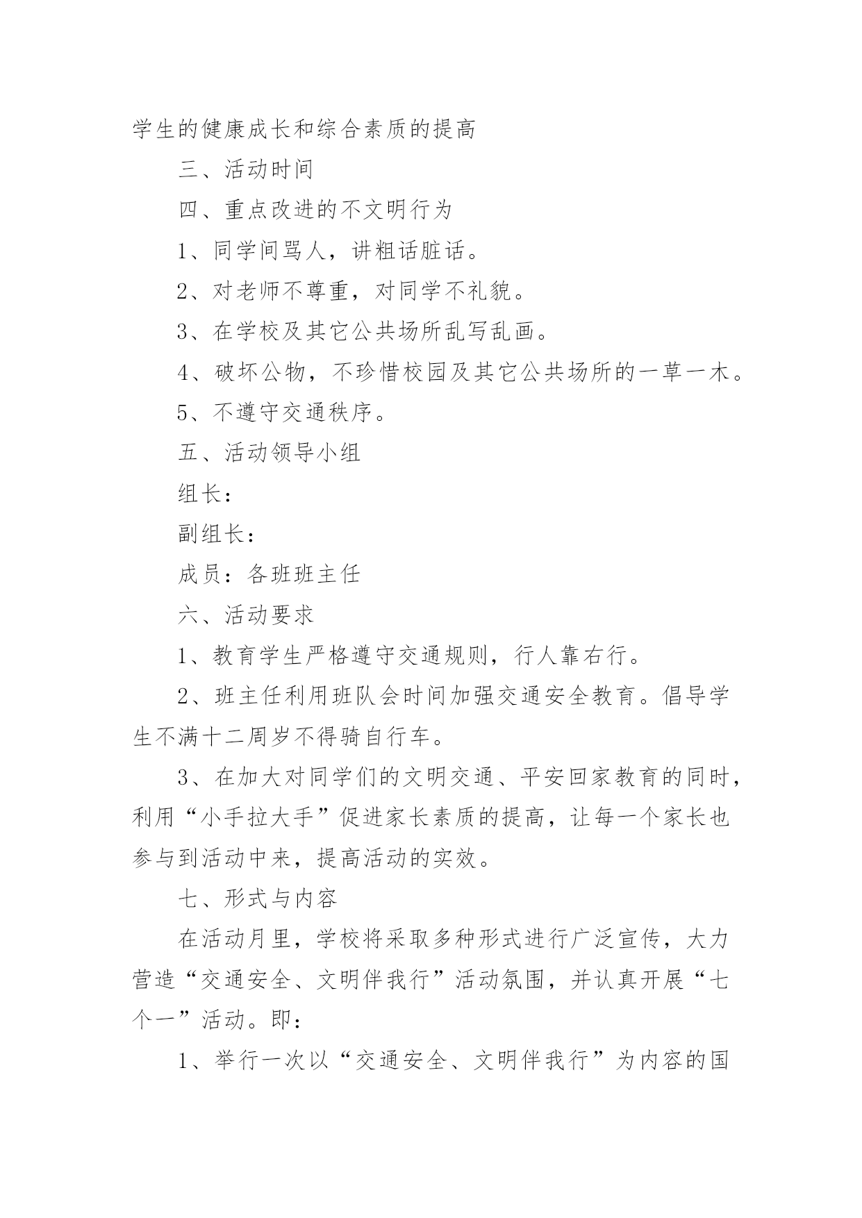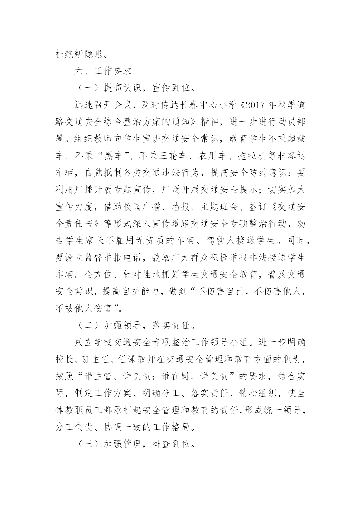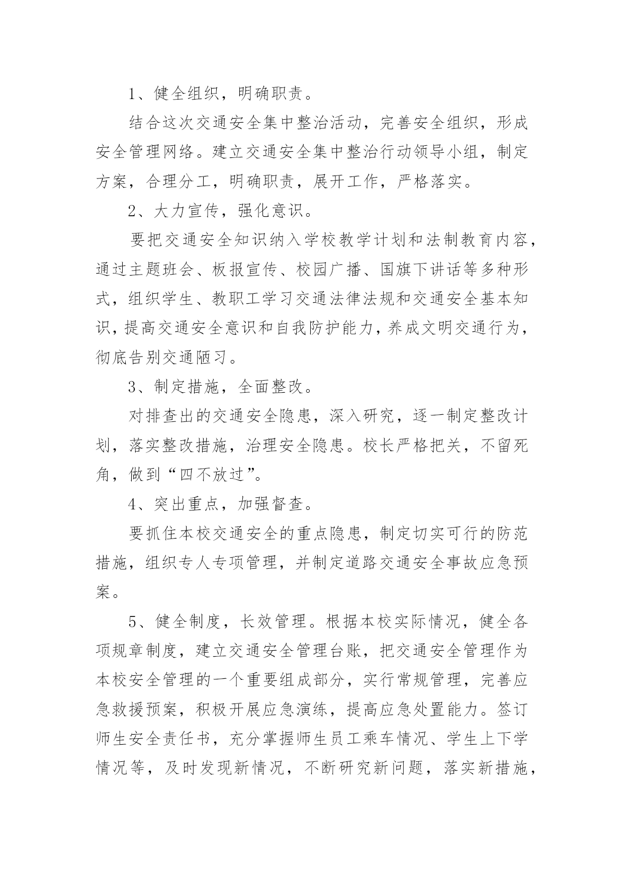 小学交通安全实施策划方案小学交通安全实施策划方案范文(精选5篇)为了确保事情或工作安全顺利进行,就常常需要事先准备方案,方案一般包括指导思想、主要目标、工作重点、实施步骤、政策措施、具体要求等项目。那么应当如何制定方案呢?以下是小编为大家整理的小学交通安全实施策划方案范文(精选5篇),欢迎大家借鉴与参考,希望对大家有所帮助。小学交通安全实施策划方案1一、总体思路按照“政府领导、部门协作、齐抓共管、综合治理”的道路交通安全管理格局,坚持“安全第一,预防为主、综合治理”方案,牢固树立“隐患即事故”,“安全即发展”的理念。强化师生的安全意识,在校园内大力宣传交通方面的法律法规,进一步加大交通安全隐患排查治理力度,保障师生的生命财产安全。二、工作目标通过本次交通安全集中整治行动,对学生的交通安全教育到位,不发生涉及学校或学生责任的重特大交通事故;对校园内外的交通管理到位,不发生校内外道路交通事故。通过专项整治,我校交通安全隐患得到根本性治理,交通安全条件充分改善;校园周边交通安全设施更加完善。三、成立道路交通安全整治小组组长:苏孝春副组长:许兴贵成员:各班班主任四、整治内容(一)完善学校交通安全制度。(二)将交通安全教育纳入学校教育教学计划,定期开展以交通安全为主题的教育活动。(三)加强对学生放学乘坐车辆进行督察。(四)禁止学生骑自行车上下学,对学生回家途中加强教育,路途中严禁打闹,追逐,遵守交通规则。(五)坚持上下学排路队并由值班领导和教师在校门口接送学生。五、整治步骤学校交通安全隐患排查治理工作实施。(一)调查摸底,隐患排查按照要求制定实施方案,对本校交通安全隐患进行拉网式排查,及时对排查出的事故隐患进行梳理建档,着重排查以下几种情况:1、学生骑自行车上下学情况。2、学生回家情况。3、校门路口警示标志。(二)制定措施,集中整治阶段针对排查出的交通安全隐患,实行分级负责,逐一整改,做到整改、责任、措施、时间、预案“五落实”,确保安全无事故。1、健全组织,明确职责。结合这次交通安全集中整治活动,完善安全组织,形成安全管理网络。建立交通安全集中整治行动领导小组,制定方案,合理分工,明确职责,展开工作,严格落实。2、大力宣传,强化意识。要把交通安全知识纳入学校教学计划和法制教育内容,通过主题班会、板报宣传、校园广播、国旗下讲话等多种形式,组织学生、教职工学习交通法律法规和交通安全基本知识,提高交通安全意识和自我防护能力,养成文明交通行为,彻底告别交通陋习。3、制定措施,全面整改。对排查出的交通安全隐患,深入研究,逐一制定整改计划,落实整改措施,治理安全隐患。校长严格把关,不留死角,做到“四不放过”。4、突出重点,加强督查。要抓住本校交通安全的重点隐患,制定切实可行的防范措施,组织专人专项管理,并制定道路交通安全事故应急预案。5、健全制度,长效管理。根据本校实际情况,健全各项规章制度,建立交通安全管理台账,把交通安全管理作为本校安全管理的一个重要组成部分,实行常规管理,完善应急救援预案,积极开展应急演练,提高应急处置能力。签订师生安全责任书,充分掌握师生员工乘车情况、学生上下学情况等,及时发现新情况,不断研究新问题,落实新措施,杜绝新隐患。六、工作要求(一)提高认识,宣传到位。迅速召开会议,及时传达长春中心小学《2017年秋季道路交通安全综合整治方案的通知》精神,进一步进行动员部署。组织教师向学生宣讲交通安全常识,教育学生不乘超载车、不乘“黑车”、不乘三轮车、农用车、拖拉机等非客运车辆,自觉抵制各类交通违法行为,提高安全防范意识;要利用广播开展专题宣传,广泛开展交通安全提示;切实加大宣传力度,借助校园广播、墙报、主题班会、签订《交通安全责任书》等形式深入宣传道路交通安全专项整治行动,劝告学生家长不雇用无资质的车辆、驾驶人接送学生。同时,要设立监督举报电话,鼓励广大群众积极举报非法接送学生车辆。全方位、针对性地抓好学生交通安全教育,普及交通安全常识,提高自护能力,做到“不伤害自己,不伤害他人,不被他人伤害”。(二)加强领导,落实责任。成立学校交通安全专项整治工作领导小组。进一步明确校长、班主任、任课教师在交通安全管理和教育方面的职责,按照“谁主管、谁负责;谁在岗、谁负责”的要求,结合实际,制定工作方案、明确分工、落实责任、精心组织,使全体教职员工都承担起安全管理和教育的责任,形成统一领导,分工负责、协调一致的工作格局。(三)加强管理,排查到位。一要认真落实交通安全管理责任;二要认真排查交通安全管理隐患。主动掌握学生到校返家的交通情况,分析可能存在的问题,作为加强交通安全管理的依据。要认真摸清学生居住地、到校返家行走路线经哪些交通要道,学生到校返家主要乘坐什么交通工具,存在哪些交通隐患;三要严禁学生乘坐农用车、拖拉机、摩托车、机动三轮车。教