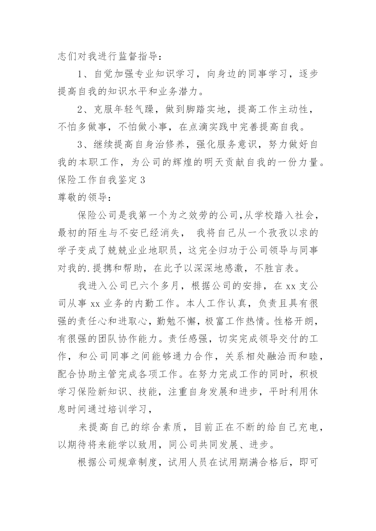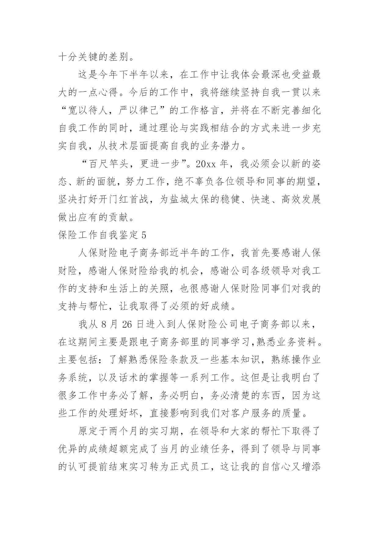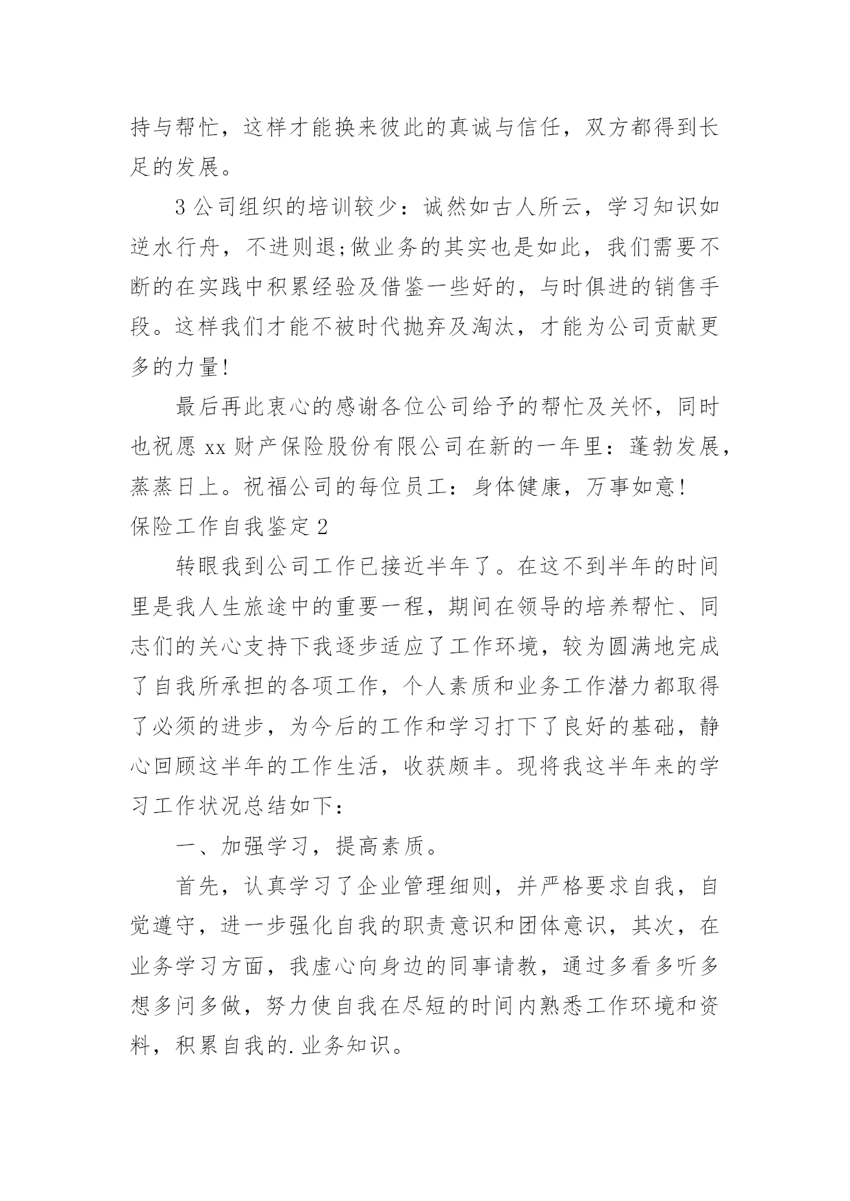 保险工作自我鉴定保险工作自我鉴定自我鉴定是个人对一个时期的学习或工作进行自我总结,它能够给人努力工作的动力,因此我们是时候回头做好总结。那么你知道自我鉴定如何写吗?以下是小编精心整理的保险工作自我鉴定,仅供参考,大家一起来看看吧。保险工作自我鉴定1我是财产保险股份有限公司的一名普通的业务员,我入司2年以来,无时不刻的感受着财产保险文化的熏陶。在那种:以人为本,我为人人,人人为我的公司精神礼貌的感染下,自身素质得到了快速的提高和成长,在此我衷心的感谢公司各位领导给予的关怀与帮忙。同时在近两年的工作中也遇到了一些困难和问题。例如:1公司的出单系统程序比较的不给力,有时出个单子因为系统的缘故,需要客户多等将近半个至一个小时,这样一来的后果将是导致客户产生不信任感和焦躁情绪,以至于对我们业务员以后的展业造成必须影响。2公司核保政策变动较快:对于我们业务员来说,如果业务要做的好,平时就需要有一些大客户的'支持与帮忙,在此状况下同样的我们也需要给予这些客户些政策上的支持与帮忙,这样才能换来彼此的真诚与信任,双方都得到长足的发展。3公司组织的培训较少:诚然如古人所云,学习知识如逆水行舟,不进则退;做业务的其实也是如此,我们需要不断的在实践中积累经验及借鉴一些好的,与时俱进的销售手段。这样我们才能不被时代抛弃及淘汰,才能为公司贡献更多的力量!最后再此衷心的感谢各位公司给予的帮忙及关怀,同时也祝愿xx财产保险股份有限公司在新的一年里:蓬勃发展,蒸蒸日上。祝福公司的每位员工:身体健康,万事如意!保险工作自我鉴定2转眼我到公司工作已接近半年了。在这不到半年的时间里是我人生旅途中的重要一程,期间在领导的培养帮忙、同志们的关心支持下我逐步适应了工作环境,较为圆满地完成了自我所承担的各项工作,个人素质和业务工作潜力都取得了必须的进步,为今后的工作和学习打下了良好的基础,静心回顾这半年的工作生活,收获颇丰。现将我这半年来的学习工作状况总结如下:一、加强学习,提高素质。首先,认真学习了企业管理细则,并严格要求自我,自觉遵守,进一步强化自我的职责意识和团体意识,其次,在业务学习方面,我虚心向身边的同事请教,通过多看多听多想多问多做,努力使自我在尽短的时间内熟悉工作环境和资料,积累自我的.业务知识。此外,根据公司安排参加了新员工入职培训。在培训中,通过戴经理和王经理教育,对公司的发展历程、和企业文化有了更深的了解,为我更好的投入工作打下了良好基础。二、踏实肯干,完成工作。在公司工作的半年中,通过领导和同事们的耐心指导,我在熟悉的基础上基本能完成办公室的各项日常工作,期间我具体工作主要包括以下几个方面:第一,负责装饰公司的接发货,装饰公司的货物有不少是易损坏货物,所以我到快递公司接发货时都要认真检查货物是否齐全,有没有损坏,并且准确核对货款,回到装饰公司后和装饰公司仓库管理人员做好交接。第二,负责带领公司各店购车客户的新车挂牌工作,公司各店业务员有的对新车注册登记表的填写要求不是很清楚,这就要求我们对每个挂牌的客户手续要认真细致的检查一遍并参照手续到车辆上核对车架号和发动机号是否一致,有错误的地方及时改正,以免到了车管所后因手续问题耽误时间。第三,六月份我开始负责汽车保险工作,由于以前从来没有接触过汽车保险,对保险知识知之甚少,所以要边学边干、边干边学,做到脑勤手勤嘴勤,多想、多记、多问,争取尽早掌握工作方法,尽快适应工作岗位。半年来,我在学习和工作中逐步成长、成熟,但我清楚自身还有很多不足,比如工作潜力和创新意识不足、知识水平有待提高等。今后我将努力做到以下几点,期望领导和同志们对我进行监督指导:1、自觉加强专业知识学习,向身边的同事学习,逐步提高自我的知识水平和业务潜力。2、克服年轻气躁,做到脚踏实地,提高工作主动性,不怕多做事,不怕做小事,在点滴实践中完善提高自我。3、继续提高自身治修养,强化服务意识,努力做好自我的本职工作,为公司的辉煌的明天贡献自我的一份力量。保险工作自我鉴定3尊敬的领导:保险公司是我第一个为之效劳的公司,从学校踏入社会,最初的陌生与不安已经消失,我将自己从一个孜孜以求的学子变成了兢兢业业地职员,这完全归功于公司领导与同事对我的.提携和帮助,在此予以深深地感激,不胜言表。我进入公司已六个多月,根据公司的安排,在xx支公司从事xx业务的内勤工作。本人工作认真,负责且具有很强的责任心和进取心,勤勉不懈,极富工作热情。性格开朗,有很强的团队协作能力。责任感强,切实完成领导交付的工作,和公司同事之间能够通力合作,关系相处融洽而和睦,配合协助主管完成各项工作。在努力完成工作的同时,积极学习保险新知识、技能,注重自身发展和进步,平时利用休息时间通过培训学习,来提高自己的综合素质,目前正在不断的给自己充电,以期待将来能学以致用,同公司共同发展、进步