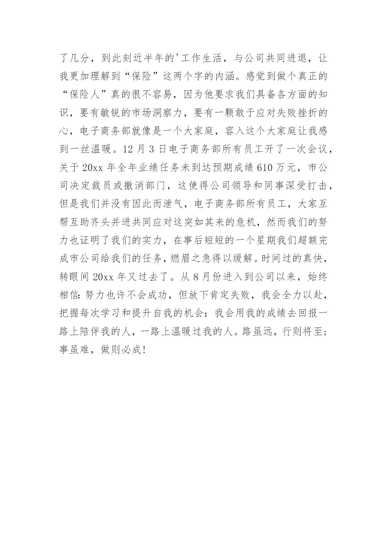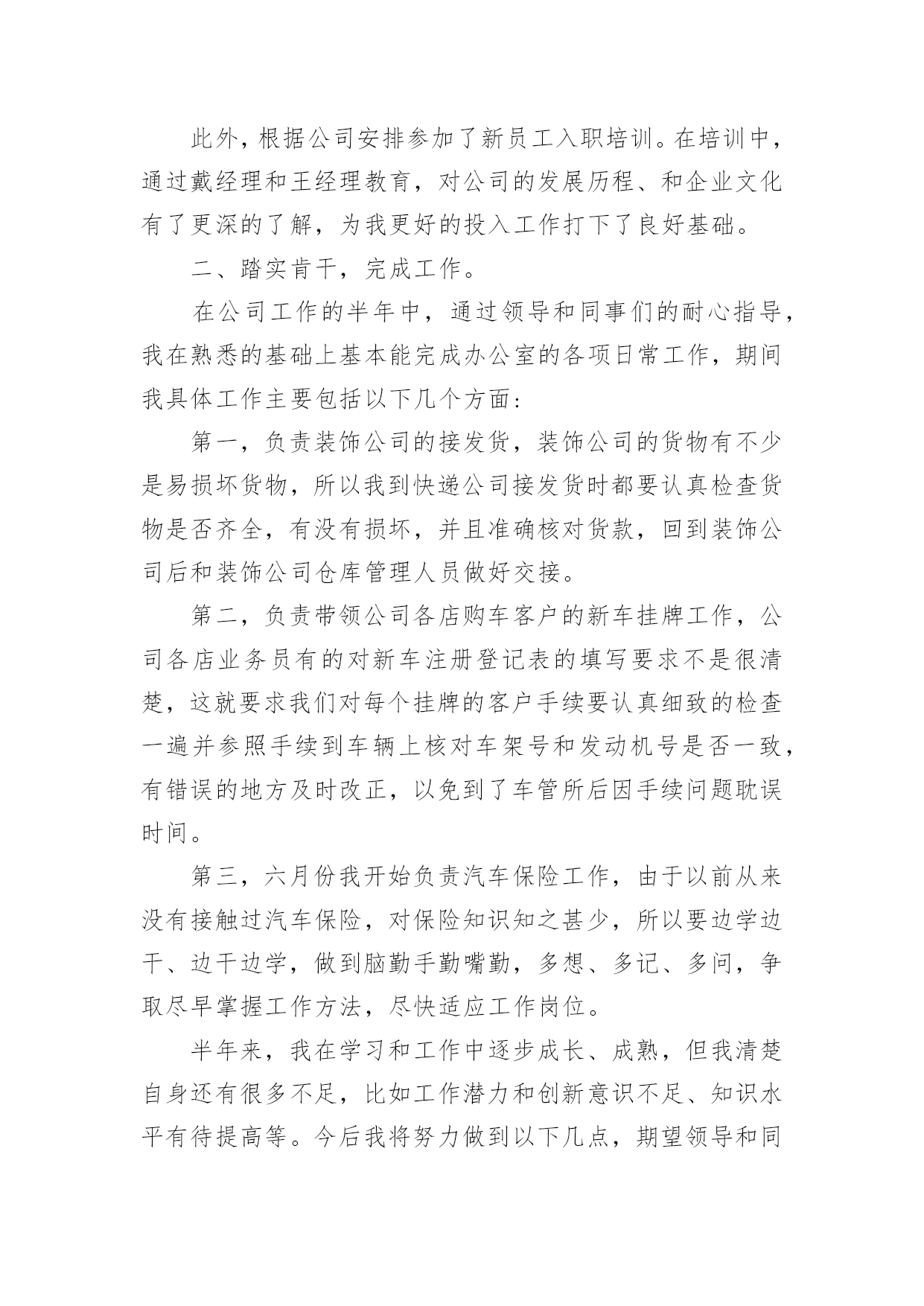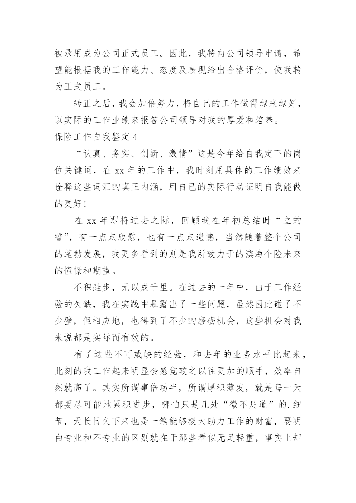 保险工作自我鉴定保险工作自我鉴定自我鉴定是个人对一个时期的学习或工作进行自我总结,它能够给人努力工作的动力,因此我们是时候回头做好总结。那么你知道自我鉴定如何写吗?以下是小编精心整理的保险工作自我鉴定,仅供参考,大家一起来看看吧。保险工作自我鉴定1我是财产保险股份有限公司的一名普通的业务员,我入司2年以来,无时不刻的感受着财产保险文化的熏陶。在那种:以人为本,我为人人,人人为我的公司精神礼貌的感染下,自身素质得到了快速的提高和成长,在此我衷心的感谢公司各位领导给予的关怀与帮忙。同时在近两年的工作中也遇到了一些困难和问题。例如:1公司的出单系统程序比较的不给力,有时出个单子因为系统的缘故,需要客户多等将近半个至一个小时,这样一来的后果将是导致客户产生不信任感和焦躁情绪,以至于对我们业务员以后的展业造成必须影响。2公司核保政策变动较快:对于我们业务员来说,如果业务要做的好,平时就需要有一些大客户的'支持与帮忙,在此状况下同样的我们也需要给予这些客户些政策上的支持与帮忙,这样才能换来彼此的真诚与信任,双方都得到长足的发展。3公司组织的培训较少:诚然如古人所云,学习知识如逆水行舟,不进则退;做业务的其实也是如此,我们需要不断的在实践中积累经验及借鉴一些好的,与时俱进的销售手段。这样我们才能不被时代抛弃及淘汰,才能为公司贡献更多的力量!最后再此衷心的感谢各位公司给予的帮忙及关怀,同时也祝愿xx财产保险股份有限公司在新的一年里:蓬勃发展,蒸蒸日上。祝福公司的每位员工:身体健康,万事如意!保险工作自我鉴定2转眼我到公司工作已接近半年了。在这不到半年的时间里是我人生旅途中的重要一程,期间在领导的培养帮忙、同志们的关心支持下我逐步适应了工作环境,较为圆满地完成了自我所承担的各项工作,个人素质和业务工作潜力都取得了必须的进步,为今后的工作和学习打下了良好的基础,静心回顾这半年的工作生活,收获颇丰。现将我这半年来的学习工作状况总结如下:一、加强学习,提高素质。首先,认真学习了企业管理细则,并严格要求自我,自觉遵守,进一步强化自我的职责意识和团体意识,其次,在业务学习方面,我虚心向身边的同事请教,通过多看多听多想多问多做,努力使自我在尽短的时间内熟悉工作环境和资料,积累自我的.业务知识。此外,根据公司安排参加了新员工入职培训。在培训中,通过戴经理和王经理教育,对公司的发展历程、和企业文化有了更深的了解,为我更好的投入工作打下了良好基础。二、踏实肯干,完成工作。在公司工作的半年中,通过领导和同事们的耐心指导,我在熟悉的基础上基本能完成办公室的各项日常工作,期间我具体工作主要包括以下几个方面:第一,负责装饰公司的接发货,装饰公司的货物有不少是易损坏货物,所以我到快递公司接发货时都要认真检查货物是否齐全,有没有损坏,并且准确核对货款,回到装饰公司后和装饰公司仓库管理人员做好交接。第二,负责带领公司各店购车客户的新车挂牌工作,公司各店业务员有的对新车注册登记表的填写要求不是很清楚,这就要求我们对每个挂牌的客户手续要认真细致的检查一遍并参照手续到车辆上核对车架号和发动机号是否一致,有错误的地方及时改正,以免到了车管所后因手续问题耽误时间。第三,六月份我开始负责汽车保险工作,由于以前从来没有接触过汽车保险,对保险知识知之甚少,所以要边学边干、边干边学,做到脑勤手勤嘴勤,多想、多记、多问,争取尽早掌握工作方法,尽快适应工作岗位。半年来,我在学习和工作中逐步成长、成熟,但我清楚自身还有很多不足,比如工作潜力和创新意识不足、知识水平有待提高等。今后我将努力做到以下几点,期望领导和同志们对我进行监督指导:1、自觉加强专业知识学习,向身边的同事学习,逐步提高自我的知识水平和业务潜力。2、克服年轻气躁,做到脚踏实地,提高工作主动性,不怕多做事,不怕做小事,在点滴实践中完善提高自我。3、继续提高自身治修养,强化服务意识,努力做好自我的本职工作,为公司的辉煌的明天贡献自我的一份力量。保险工作自我鉴定3尊敬的领导:保险公司是我第一个为之效劳的公司,从学校踏入社会,最初的陌生与不安已经消失,我将自己从一个孜孜以求的学子变成了兢兢业业地职员,这完全归功于公司领导与同事对我的.提携和帮助,在此予以深深地感激,不胜言表。我进入公司已六个多月,根据公司的安排,在xx支公司从事xx业务的内勤工作。本人工作认真,负责且具有很强的责任心和进取心,勤勉不懈,极富工作热情。性格开朗,有很强的团队协作能力。责任感强,切实完成领导交付的工作,和公司同事之间能够通力合作,关系相处融洽而和睦,配合协助主管完成各项工作。在努力完成工作的同时,积极学习保险新知识、技能,注重自身发展和进步,平时利用休息时间通过培训学习,来提高自己的综合素质,目前正在不断的给自己充电,以期待将来能学以致用,同公司共同发展、进步