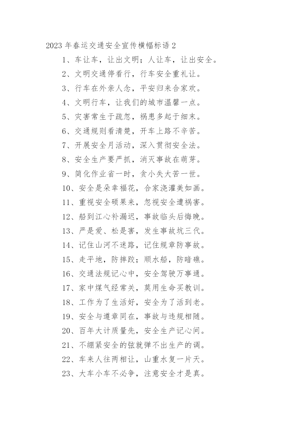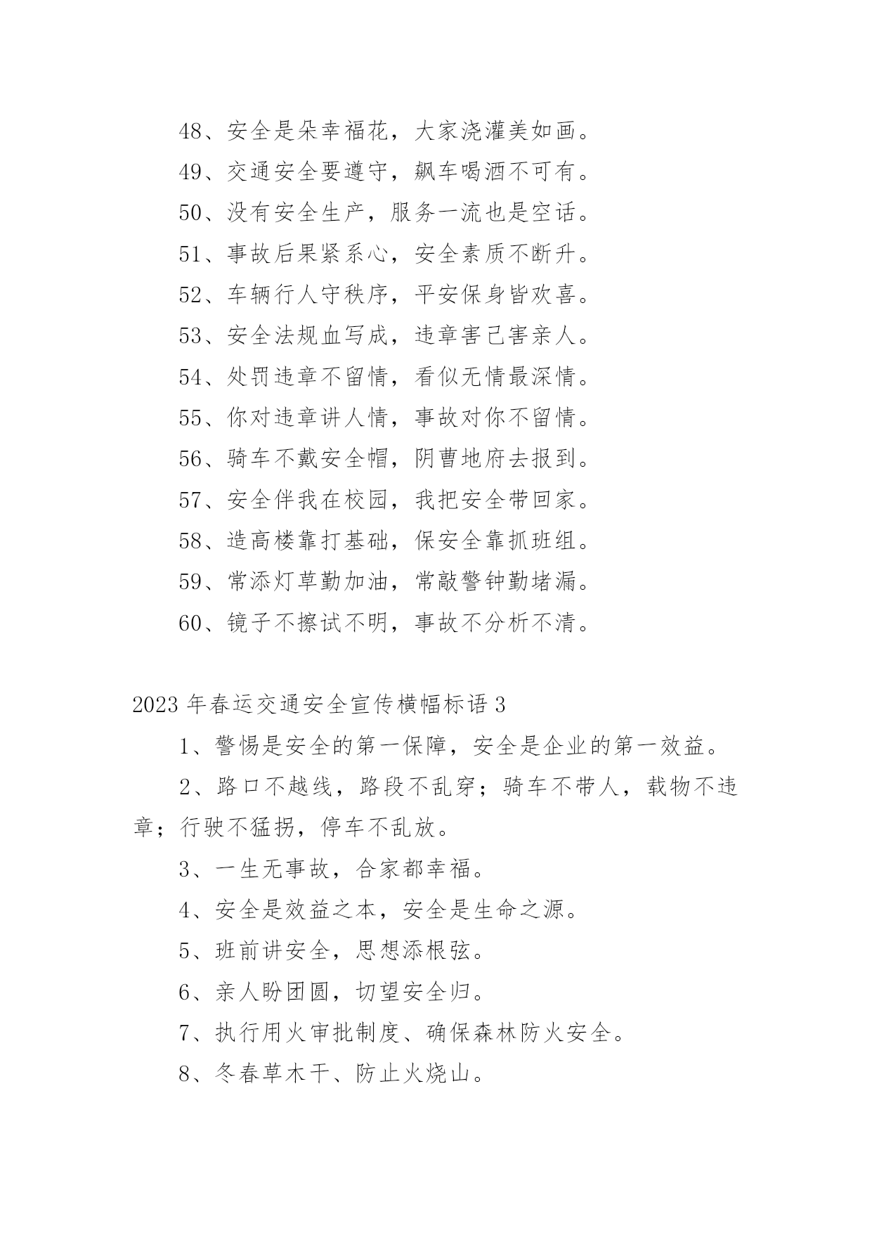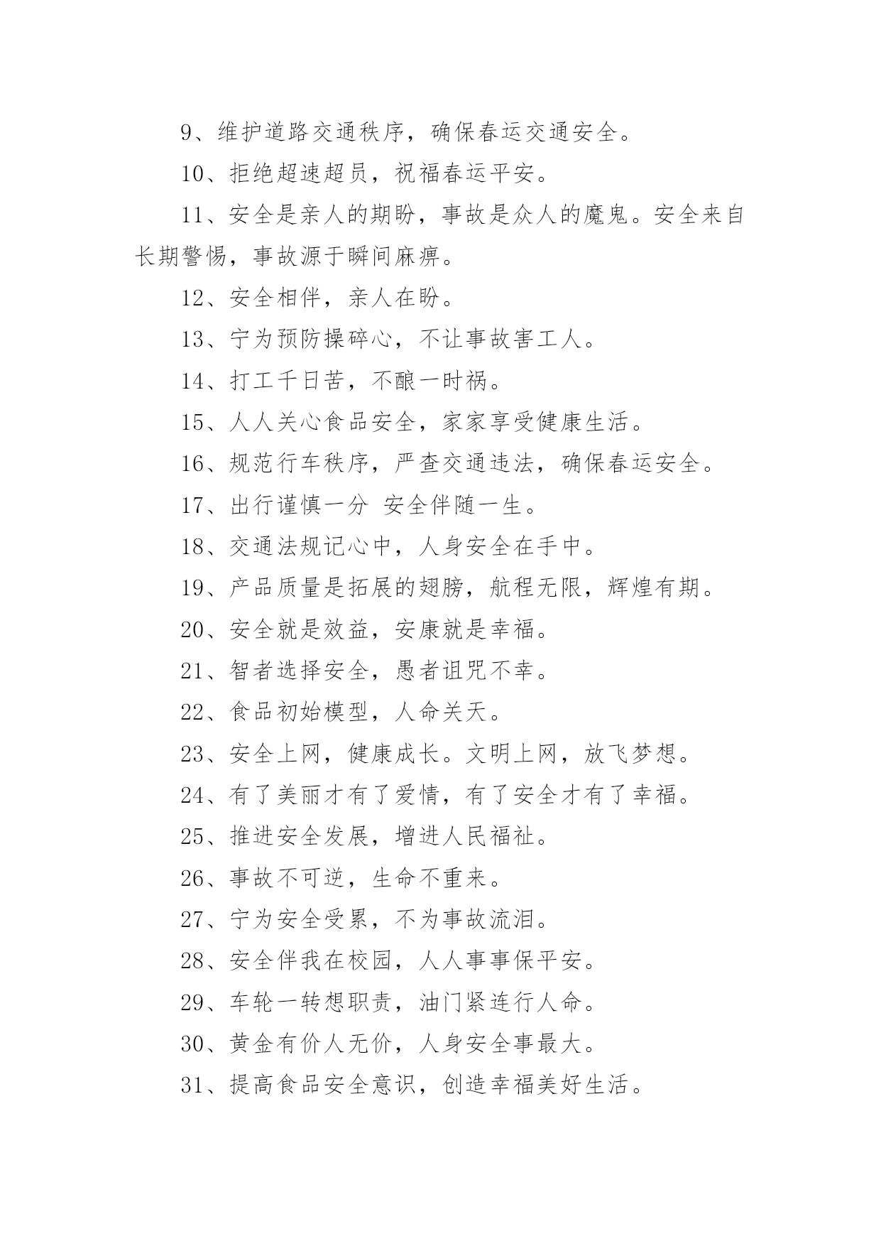 春运交通安全宣传横幅标语2023年春运交通安全宣传横幅标语无论是在学校还是在社会中,大家总少不了接触一些耳熟能详的标语吧,标语是指文字简练、意义鲜明的宣传、鼓动口号。那么问题来了,到底什么样的标语才经典呢?下面是小编整理的2023年春运交通安全宣传横幅标语,供大家参考借鉴,希望可以帮助到有需要的朋友。2023年春运交通安全宣传横幅标语11、细节体现礼貌,停车展现风貌,合力创建全国文明城市。2、遵守规范停车,争创文明市民。3、停文明车,做文明人。4、严禁违章停车,共建文明城市。5、停出一份友爱,停出一份文明,停出一份风景。6、文明,从排车开始;素质,让整齐体现。7、车停人停,文明不停;车走人走,文明传递。8、点点滴滴,停车体现人格;整整齐齐,文明树立新风。9、与青春赛跑,向文明迈步。10、车如人,人如车,不要金库银库,只要文明车库。2023年春运交通安全宣传横幅标语21、车让车,让出文明;人让车,让出安全。2、文明交通停看行,行车安全重礼让。3、行车在外亲人念,平安归来合家欢。4、文明行车,让我们的城市温馨一点。5、灾害常生于疏忽,祸患多起于细末。6、交通规则看清楚,开车上路不辛苦。7、开展安全月活动,深入贯彻安全法。8、安全生产要严抓,消灭事故在萌芽。9、简化作业省一时,贪小失大苦一世。10、安全是朵幸福花,合家浇灌美如画。11、重视安全硕果来,忽视安全遭祸害。12、船到江心补漏迟,事故临头后悔晚。13、严是爱、松是害,发生事故坑三代。14、记住山河不迷路,记住规章防事故。15、走平地,防摔跤;顺水船,防暗礁。16、交通法规记心中,安全驾驶万事通。17、家中煤气经常关,莫用生命买教训。18、工作为了生活好,安全为了活到老。19、安全与遵章同在,事故与违规相随。20、百年大计质量先,安全生产记心间。21、不绷紧安全的弦就弹不出生产的调。22、车来人往两相让,山重水复一片天。23、大车小车不必争,注意安全才是真。24、爱妻爱子爱家庭,无视安全等于零。25、违章作业要批评,道是无情却有情。26、马路就像老虎口,不留神就没活口。27、病魔乘体虚而入,灾祸因麻痹而生。28、爱妻爱子爱家庭,无视交规等于零。29、安全警钟日日鸣,平安大道天天行。30、天长地久有尽时,安全生产无绝期。31、安全第一是真理,全家不能没有你。32、安全措施订得细,事故预防有保证。33、有妻有子有家庭,没有安全等于零。34、精心施工建精品,与时俱进创辉煌。35、生命可贵当珍爱,丝毫麻痹都是害。36、不追不跑不打闹,平平安安到学校。37、严是生命的呼唤,松是的开端。38、寒霜偏打无根草,事故专找懒惰人。39、见火不救火烧身,有章不循祸缠身。40、作业时戴安全帽,流汗总比流血好。41、安全生产勿侥幸,违章蛮干要人命。42、安全生命紧相连,遵章守纪记心间。43、提供一流的服务,树立一流的`品质。44、居安思危年年乐,警钟长鸣岁岁欢。45、开车不系安全带,牛头马面在等待。46、只要你我多用心,交通恶运不降临。47、万千产品堆成山,一星火源毁于旦。48、安全是朵幸福花,大家浇灌美如画。49、交通安全要遵守,飙车喝酒不可有。50、没有安全生产,服务一流也是空话。51、事故后果紧系心,安全素质不断升。52、车辆行人守秩序,平安保身皆欢喜。53、安全法规血写成,违章害己害亲人。54、处罚违章不留情,看似无情最深情。55、你对违章讲人情,事故对你不留情。56、骑车不戴安全帽,阴曹地府去报到。57、安全伴我在校园,我把安全带回家。58、造高楼靠打基础,保安全靠抓班组。59、常添灯草勤加油,常敲警钟勤堵漏。60、镜子不擦试不明,事故不分析不清。2023年春运交通安全宣传横幅标语31、警惕是安全的第一保障,安全是企业的第一效益。2、路口不越线,路段不乱穿;骑车不带人,载物不违章;行驶不猛拐,停车不乱放。3、一生无事故,合家都幸福。4、安全是效益之本,安全是生命之源。5、班前讲安全,思想添根弦。6、亲人盼团圆,切望安全归。7、执行用火审批制度、确保森林防火安全。8、冬春草木干、防止火烧山。9、维护道路交通秩序,确保春运交通安全。10、拒绝超速超员,祝福春运平安。11、安全是亲人的期盼,事故是众人的魔鬼。安全来自长期警惕,事故源于瞬间麻痹。12、安全相伴,亲人在盼。13、宁为预防操碎心,不让事故害工人。14、打工千日苦,不酿一时祸。15、人人关心食品安全,家家享受健康生活。16、规范行车秩序,严查交通违法,确保春运安全。17、出行谨慎一分安全伴随一生。18、交通法规记心中,人身安全在手中。19、产品质量是拓展的翅膀,航程无限,辉煌有期。20、安全就是效益,安康就是幸福。21、智者选择安全,愚者诅咒不幸。22、食品初始模型,人命关天。23、安全上网,健康成长。文明上网,放飞梦想。24、有了