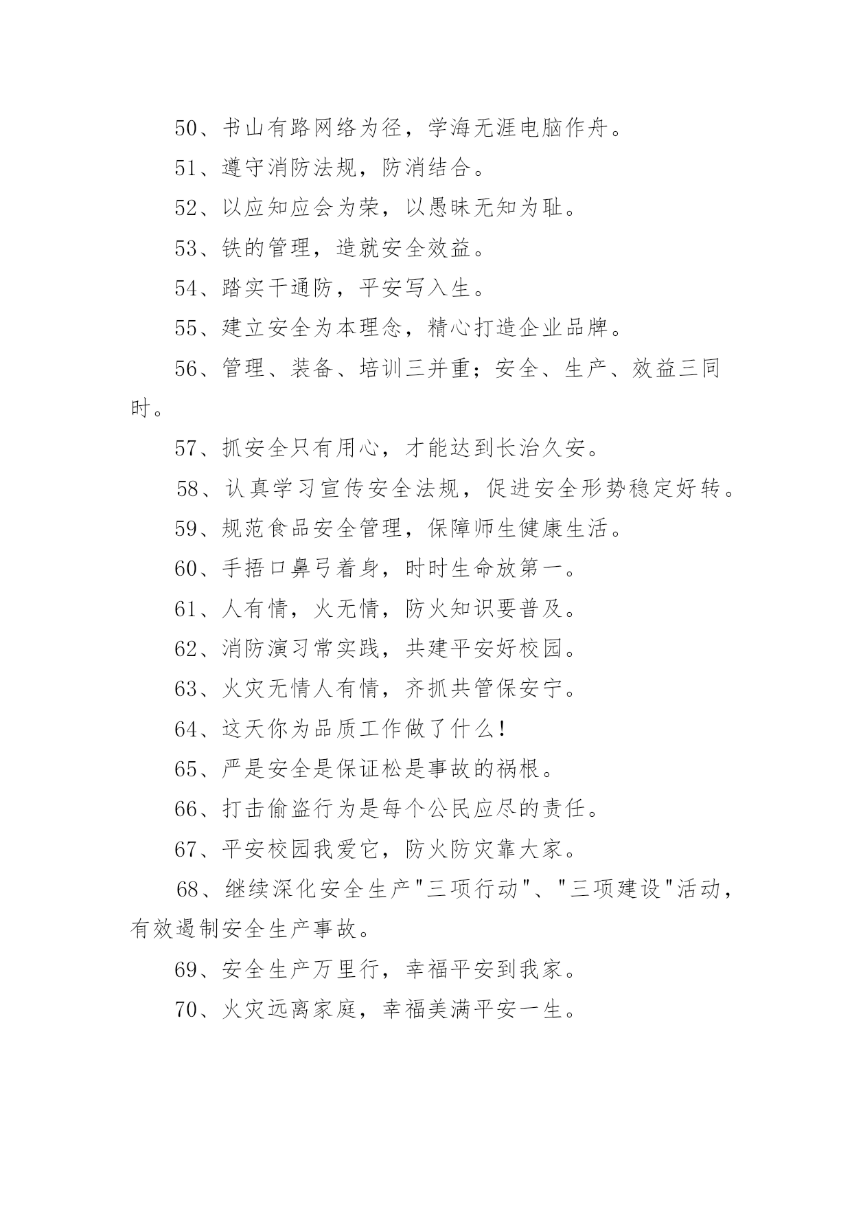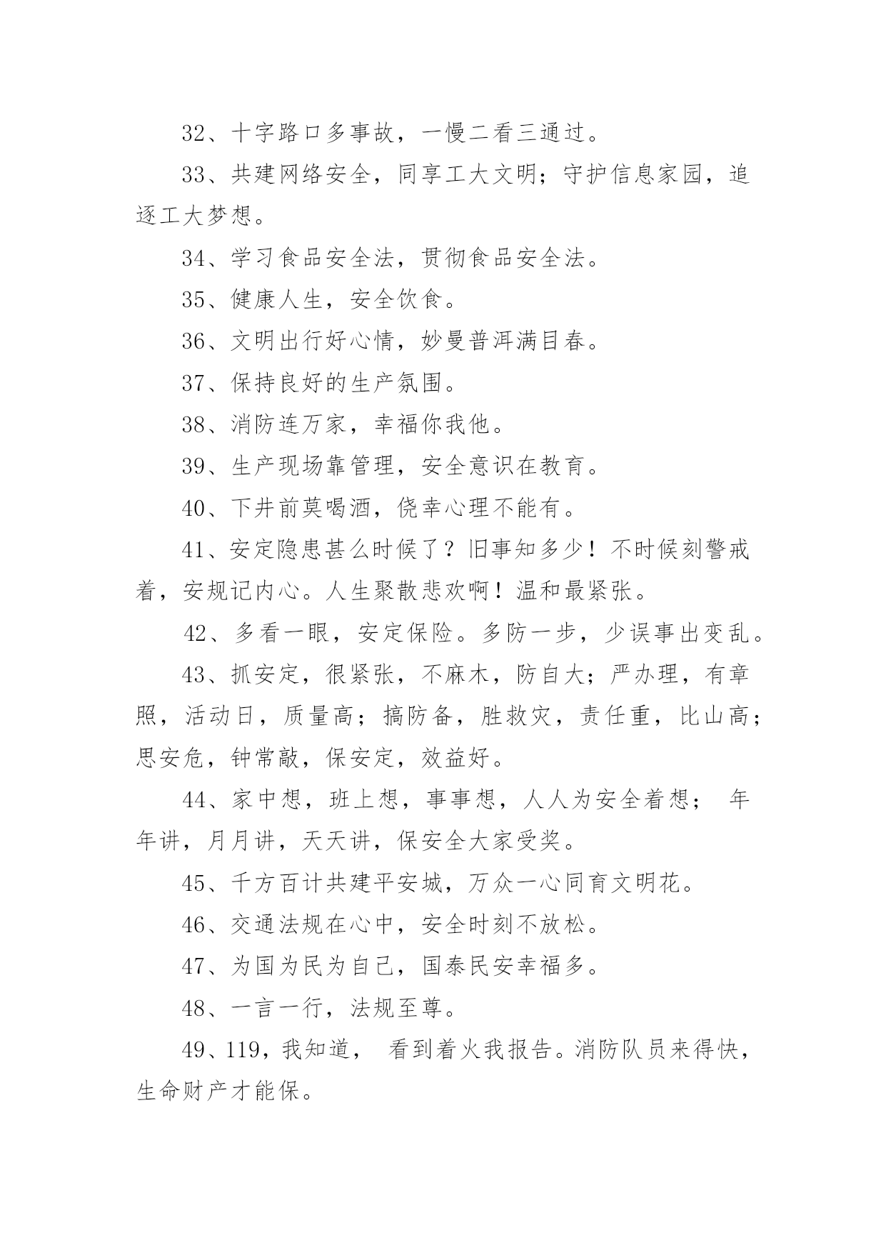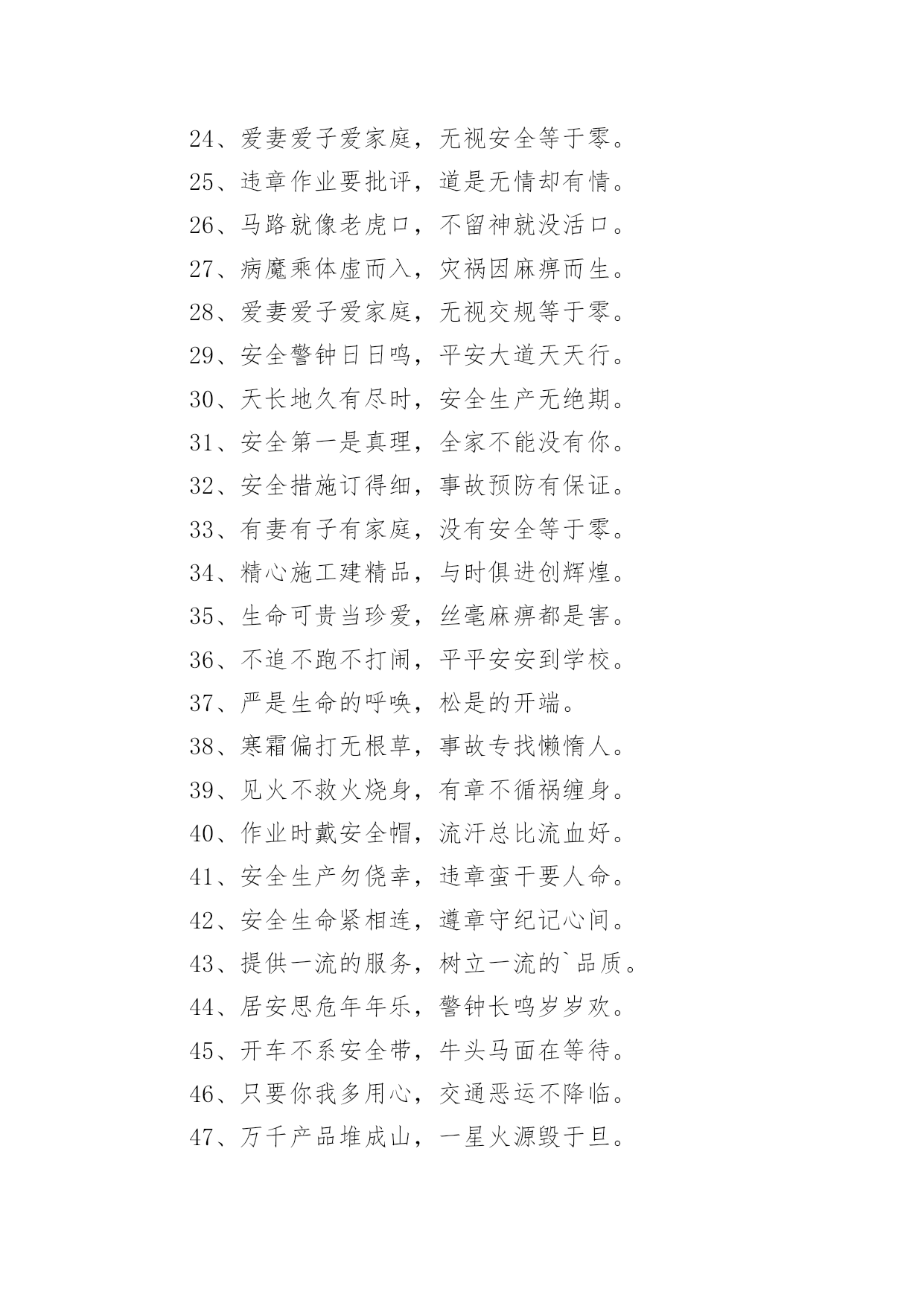 春运交通安全宣传横幅标语2023年春运交通安全宣传横幅标语无论是在学校还是在社会中,大家总少不了接触一些耳熟能详的标语吧,标语是指文字简练、意义鲜明的宣传、鼓动口号。那么问题来了,到底什么样的标语才经典呢?下面是小编整理的2023年春运交通安全宣传横幅标语,供大家参考借鉴,希望可以帮助到有需要的朋友。2023年春运交通安全宣传横幅标语11、细节体现礼貌,停车展现风貌,合力创建全国文明城市。2、遵守规范停车,争创文明市民。3、停文明车,做文明人。4、严禁违章停车,共建文明城市。5、停出一份友爱,停出一份文明,停出一份风景。6、文明,从排车开始;素质,让整齐体现。7、车停人停,文明不停;车走人走,文明传递。8、点点滴滴,停车体现人格;整整齐齐,文明树立新风。9、与青春赛跑,向文明迈步。10、车如人,人如车,不要金库银库,只要文明车库。2023年春运交通安全宣传横幅标语21、车让车,让出文明;人让车,让出安全。2、文明交通停看行,行车安全重礼让。3、行车在外亲人念,平安归来合家欢。4、文明行车,让我们的城市温馨一点。5、灾害常生于疏忽,祸患多起于细末。6、交通规则看清楚,开车上路不辛苦。7、开展安全月活动,深入贯彻安全法。8、安全生产要严抓,消灭事故在萌芽。9、简化作业省一时,贪小失大苦一世。10、安全是朵幸福花,合家浇灌美如画。11、重视安全硕果来,忽视安全遭祸害。12、船到江心补漏迟,事故临头后悔晚。13、严是爱、松是害,发生事故坑三代。14、记住山河不迷路,记住规章防事故。15、走平地,防摔跤;顺水船,防暗礁。16、交通法规记心中,安全驾驶万事通。17、家中煤气经常关,莫用生命买教训。18、工作为了生活好,安全为了活到老。19、安全与遵章同在,事故与违规相随。20、百年大计质量先,安全生产记心间。21、不绷紧安全的弦就弹不出生产的调。22、车来人往两相让,山重水复一片天。23、大车小车不必争,注意安全才是真。24、爱妻爱子爱家庭,无视安全等于零。25、违章作业要批评,道是无情却有情。26、马路就像老虎口,不留神就没活口。27、病魔乘体虚而入,灾祸因麻痹而生。28、爱妻爱子爱家庭,无视交规等于零。29、安全警钟日日鸣,平安大道天天行。30、天长地久有尽时,安全生产无绝期。31、安全第一是真理,全家不能没有你。32、安全措施订得细,事故预防有保证。33、有妻有子有家庭,没有安全等于零。34、精心施工建精品,与时俱进创辉煌。35、生命可贵当珍爱,丝毫麻痹都是害。36、不追不跑不打闹,平平安安到学校。37、严是生命的呼唤,松是的开端。38、寒霜偏打无根草,事故专找懒惰人。39、见火不救火烧身,有章不循祸缠身。40、作业时戴安全帽,流汗总比流血好。41、安全生产勿侥幸,违章蛮干要人命。42、安全生命紧相连,遵章守纪记心间。43、提供一流的服务,树立一流的`品质。44、居安思危年年乐,警钟长鸣岁岁欢。45、开车不系安全带,牛头马面在等待。46、只要你我多用心,交通恶运不降临。47、万千产品堆成山,一星火源毁于旦。48、安全是朵幸福花,大家浇灌美如画。49、交通安全要遵守,飙车喝酒不可有。50、没有安全生产,服务一流也是空话。51、事故后果紧系心,安全素质不断升。52、车辆行人守秩序,平安保身皆欢喜。53、安全法规血写成,违章害己害亲人。54、处罚违章不留情,看似无情最深情。55、你对违章讲人情,事故对你不留情。56、骑车不戴安全帽,阴曹地府去报到。57、安全伴我在校园,我把安全带回家。58、造高楼靠打基础,保安全靠抓班组。59、常添灯草勤加油,常敲警钟勤堵漏。60、镜子不擦试不明,事故不分析不清。2023年春运交通安全宣传横幅标语31、警惕是安全的第一保障,安全是企业的第一效益。2、路口不越线,路段不乱穿;骑车不带人,载物不违章;行驶不猛拐,停车不乱放。3、一生无事故,合家都幸福。4、安全是效益之本,安全是生命之源。5、班前讲安全,思想添根弦。6、亲人盼团圆,切望安全归。7、执行用火审批制度、确保森林防火安全。8、冬春草木干、防止火烧山。9、维护道路交通秩序,确保春运交通安全。10、拒绝超速超员,祝福春运平安。11、安全是亲人的期盼,事故是众人的魔鬼。安全来自长期警惕,事故源于瞬间麻痹。12、安全相伴,亲人在盼。13、宁为预防操碎心,不让事故害工人。14、打工千日苦,不酿一时祸。15、人人关心食品安全,家家享受健康生活。16、规范行车秩序,严查交通违法,确保春运安全。17、出行谨慎一分安全伴随一生。18、交通法规记心中,人身安全在手中。19、产品质量是拓展的翅膀,航程无限,辉煌有期。20、安全就是效益,安康就是幸福。21、智者选择安全,愚者诅咒不幸。22、食品初始模型,人命关天。23、安全上网,健康成长。文明上网,放飞梦想。24、有了