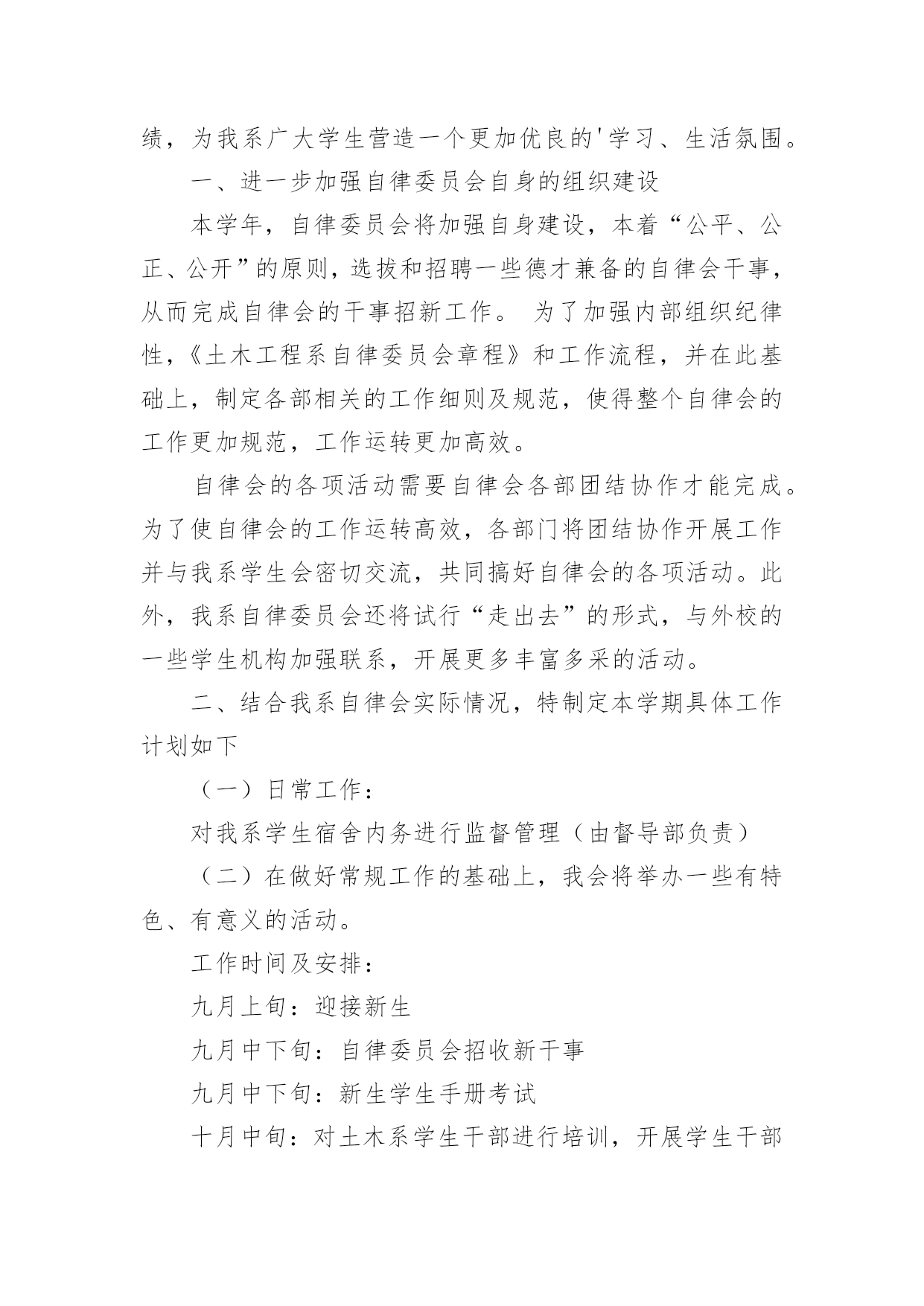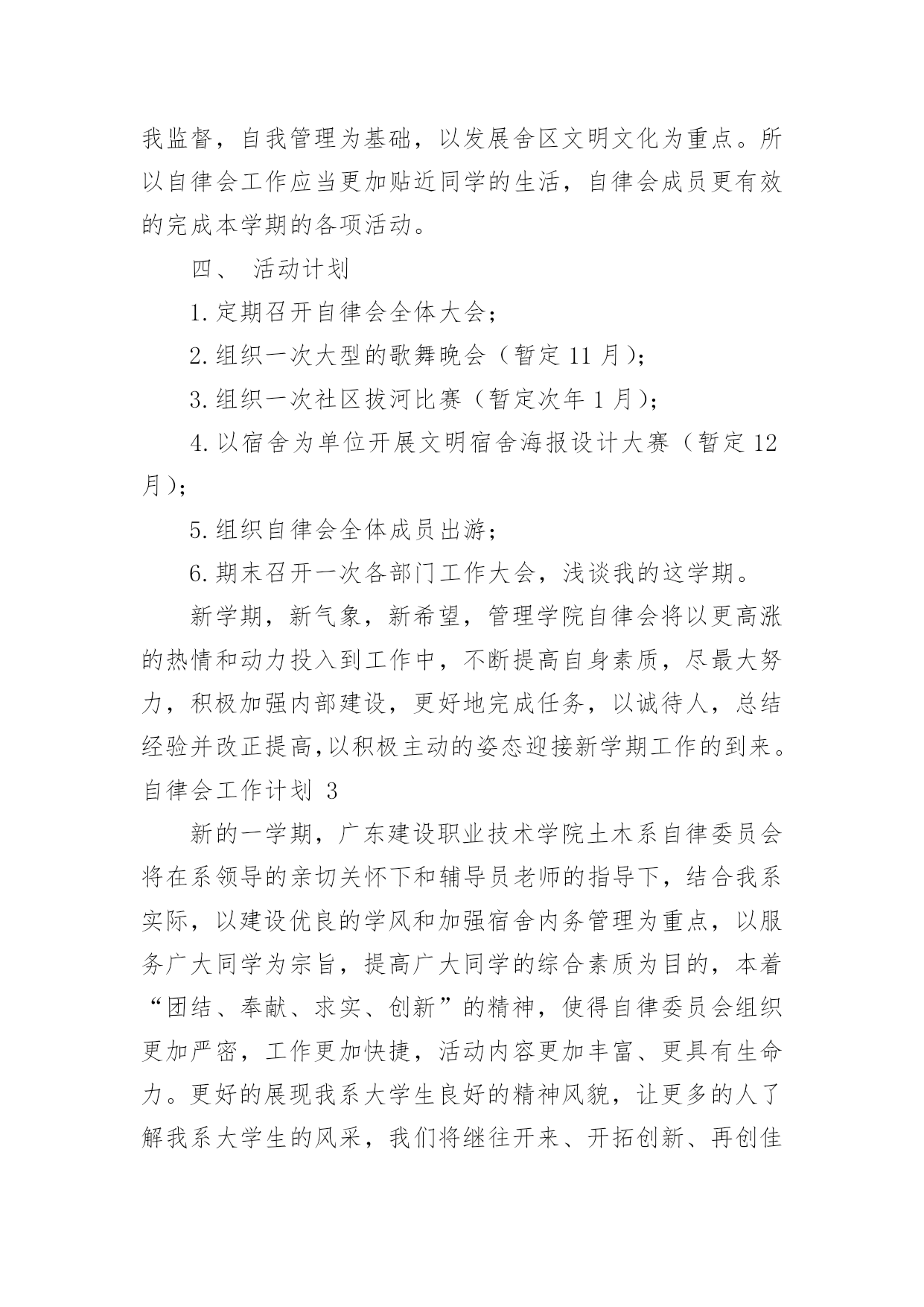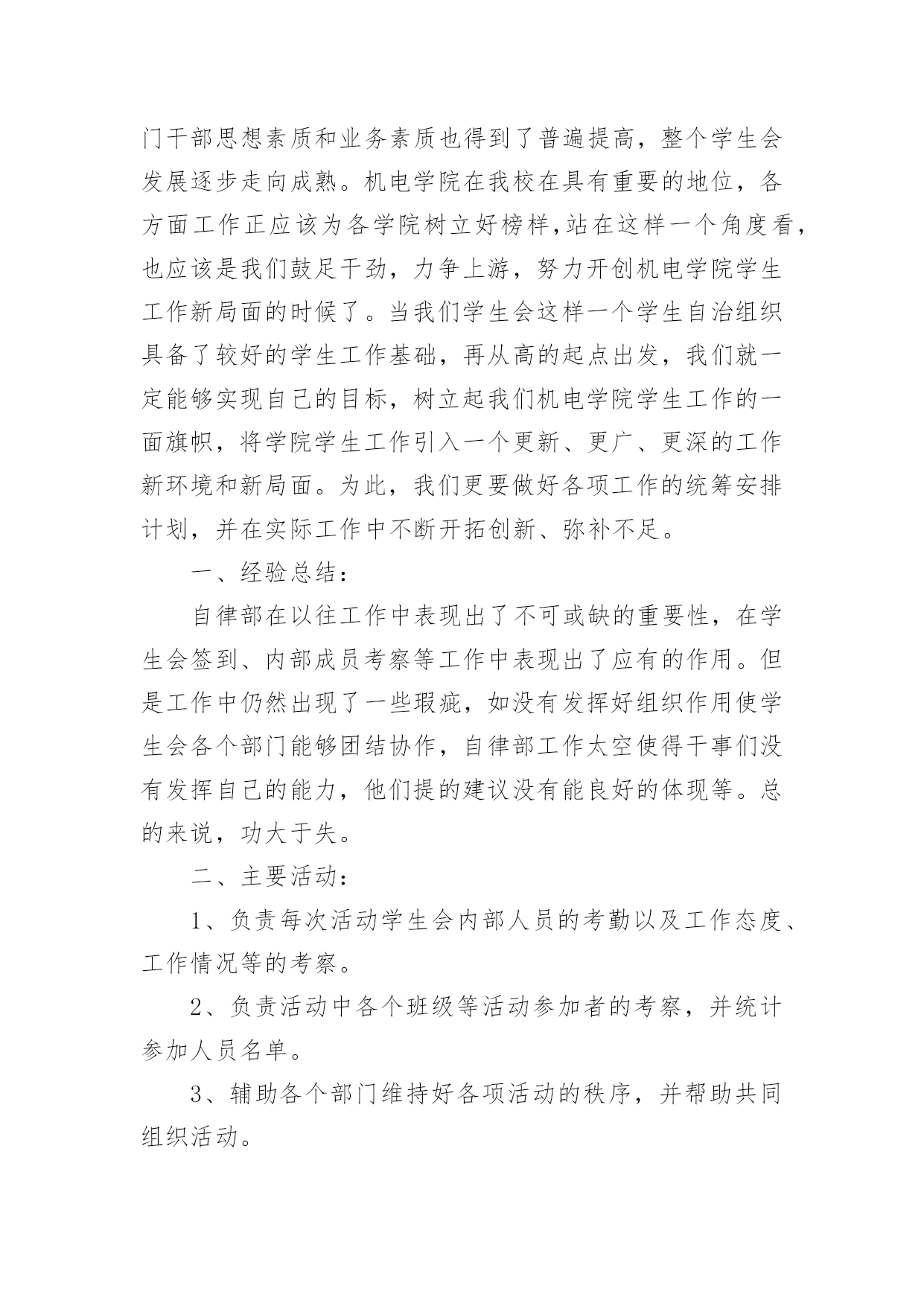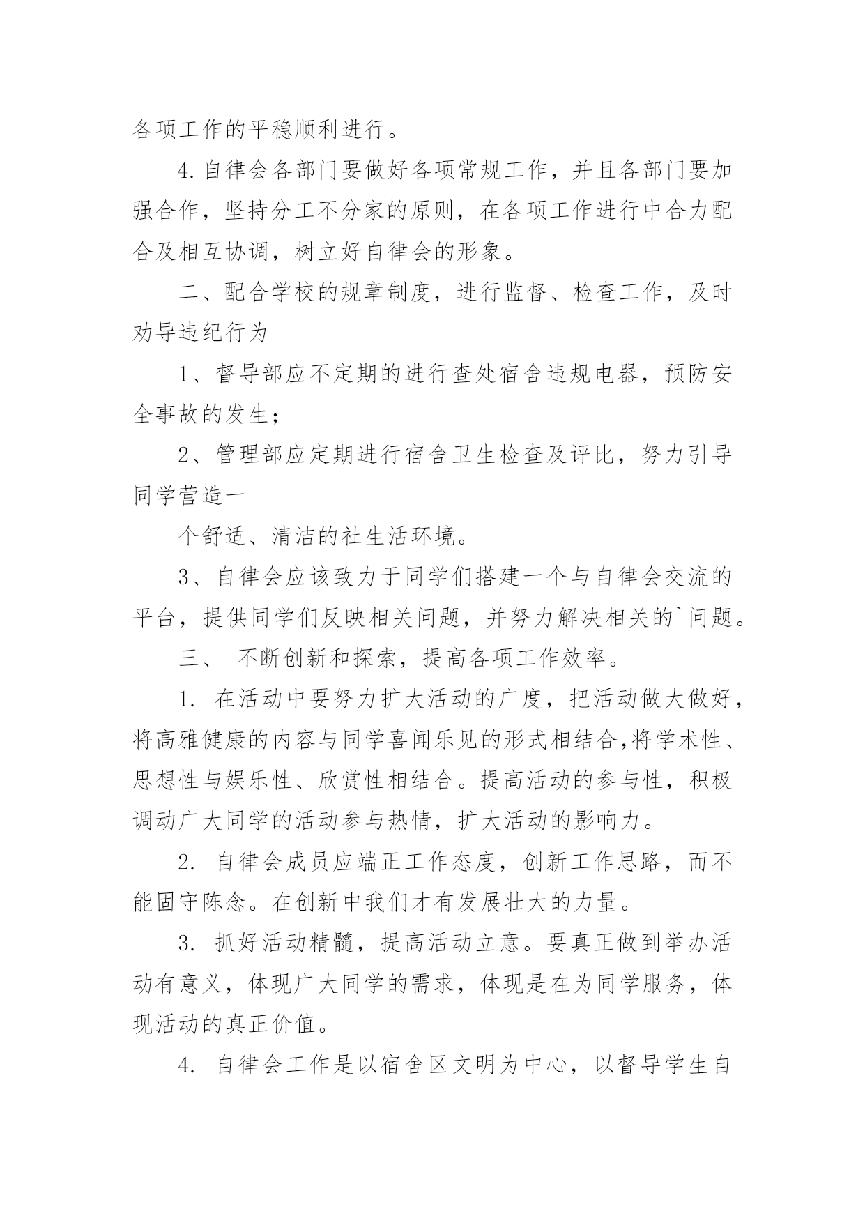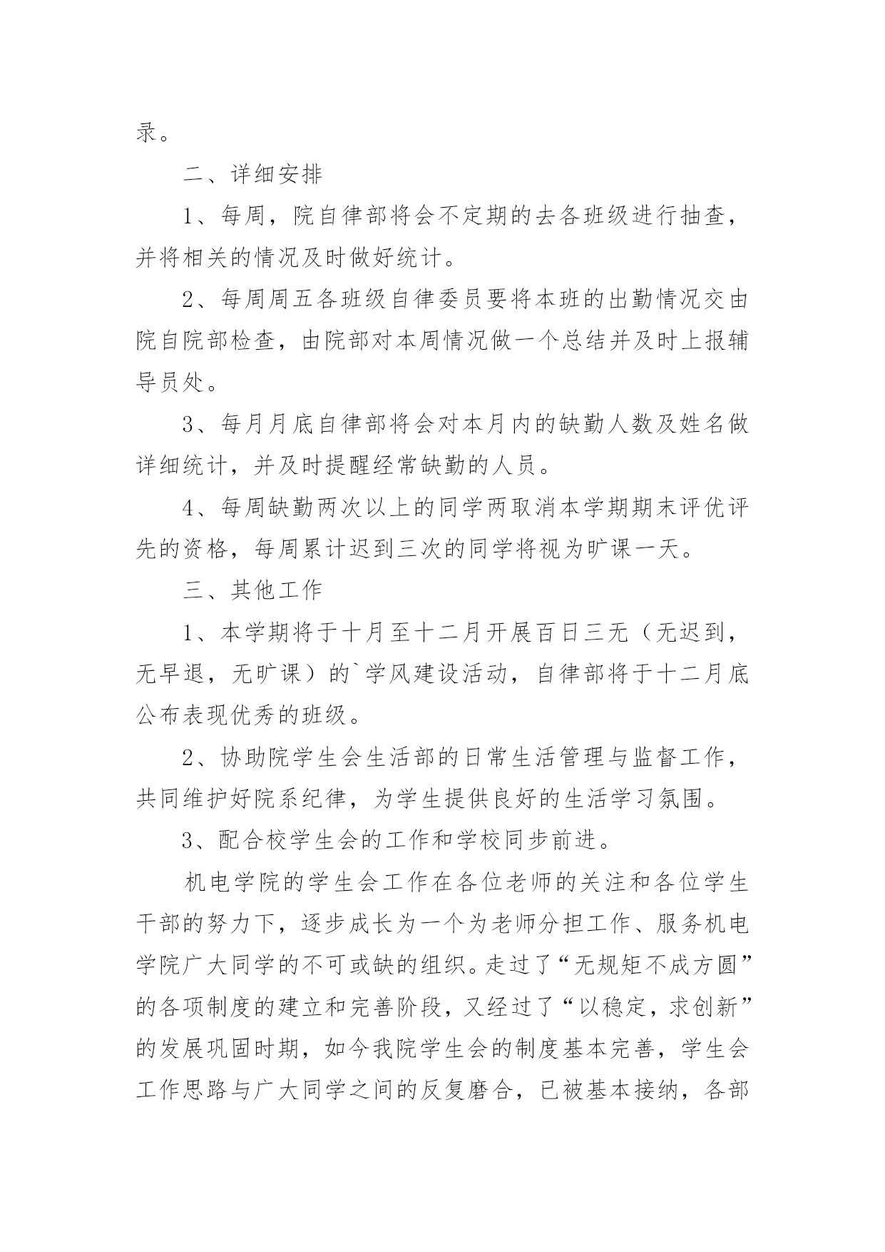 自律会工作计划自律会工作计划时间过得太快,让人猝不及防,我们又将接触新的知识,学习新的技能,积累新的经验,来为以后的工作做一份计划吧。相信大家又在为写计划犯愁了?下面是小编整理的自律会工作计划,欢迎大家借鉴与参考,希望对大家有所帮助。自律会工作计划1新学期开始,经济与管理学院自律部为配合学生会工作有序进行,将和院学生会其他部门建立密切关系,形成互相竞争互相帮助的良好氛围,提高部门办事效率,树立自律部良好形象。同时本部将充分调动各成员的积极性和主观能动性,深入了解和发展自律部成员的能力和特长,以共同维护学校的正常秩序,为同学们提供良好的学生环境。因此,自律部为切实贯彻院学生会的工作方针,实现我部设立的宗旨,特将本学期的工作安排如下:一、常规工作1、认真做好考勤,核查各班的出勤人数及缺勤情况,并做好详细记录。2、规范院风院纪,切实做到公平公正。3学院举行的各项活动,自律部都会配合其他各部门共同维护现场纪律,确保活动正常进行,并做好相关的工作记录。二、详细安排1、每周,院自律部将会不定期的去各班级进行抽查,并将相关的情况及时做好统计。2、每周周五各班级自律委员要将本班的出勤情况交由院自院部检查,由院部对本周情况做一个总结并及时上报辅导员处。3、每月月底自律部将会对本月内的缺勤人数及姓名做详细统计,并及时提醒经常缺勤的人员。4、每周缺勤两次以上的同学两取消本学期期末评优评先的资格,每周累计迟到三次的同学将视为旷课一天。三、其他工作1、本学期将于十月至十二月开展百日三无(无迟到,无早退,无旷课)的`学风建设活动,自律部将于十二月底公布表现优秀的班级。2、协助院学生会生活部的日常生活管理与监督工作,共同维护好院系纪律,为学生提供良好的生活学习氛围。3、配合校学生会的工作和学校同步前进。机电学院的学生会工作在各位老师的关注和各位学生干部的努力下,逐步成长为一个为老师分担工作、服务机电学院广大同学的不可或缺的组织。走过了“无规矩不成方圆”的各项制度的建立和完善阶段,又经过了“以稳定,求创新”的发展巩固时期,如今我院学生会的制度基本完善,学生会工作思路与广大同学之间的反复磨合,已被基本接纳,各部门干部思想素质和业务素质也得到了普遍提高,整个学生会发展逐步走向成熟。机电学院在我校在具有重要的地位,各方面工作正应该为各学院树立好榜样,站在这样一个角度看,也应该是我们鼓足干劲,力争上游,努力开创机电学院学生工作新局面的时候了。当我们学生会这样一个学生自治组织具备了较好的学生工作基础,再从高的起点出发,我们就一定能够实现自己的目标,树立起我们机电学院学生工作的一面旗帜,将学院学生工作引入一个更新、更广、更深的工作新环境和新局面。为此,我们更要做好各项工作的统筹安排计划,并在实际工作中不断开拓创新、弥补不足。一、经验总结:自律部在以往工作中表现出了不可或缺的重要性,在学生会签到、内部成员考察等工作中表现出了应有的作用。但是工作中仍然出现了一些瑕疵,如没有发挥好组织作用使学生会各个部门能够团结协作,自律部工作太空使得干事们没有发挥自己的能力,他们提的建议没有能良好的体现等。总的来说,功大于失。二、主要活动:1、负责每次活动学生会内部人员的考勤以及工作态度、工作情况等的考察。2、负责活动中各个班级等活动参加者的考察,并统计参加人员名单。3、辅助各个部门维持好各项活动的秩序,并帮助共同组织活动。4、负责运动会表演方队的训练。5、精神文化周组织我院学生收集文明和不文明的现象,包括照相,绘画形式展出,以提醒学生提高的综合素质。6、文明宿舍评比本学期我部依然会对院内进行文明宿舍的评比。对院内所有宿舍进行全面检查,包括卫生、内务等方面,所有宿舍计分评比,最后根据分数高低评出文明宿舍。7、安全检查安全之事无大小。本学期我部门将会对院内所有宿舍进行不定时的安全检查,主要检查宿舍内违章电器使用情况。一经发现有使用违章电器的情况,电器没收并处以惩罚。8、组织机电学院乒乓球赛(计划在开学前两个月内进行)。三、工作要求1、工作时要认真仔细,在速度的同时保质量完成工作。2、要讲文明礼貌,在工作中注意自己的言谈举止。3、在实践中积累经验,熟练业务,提高水平。(一)提高各种素质秘书处是一个工作比较繁琐的部门。接触其他部门的机会比较多。这就更能体现出高素质培养的急切性和重要性。(二)立良好的工作形象树立良好的工作形象是学生工作的一个有利条件,本学期重点抓好以下方面:一是抓好学生干部在日常生活中的言行举止问题。二是抓好业务素质,做到公正严明、不以公谋私。三是搞好学生干部和同学关系以便日后工作顺利进行。四、部门建设:就以往来说,自律部都是一个工作相对轻松的部门,主要负责学生会的签到工作,并无其他自己组织的影响较大的活动。我部希望从今年起大力狠抓学生会内部纪律,并组织一些活动丰富部门生活。