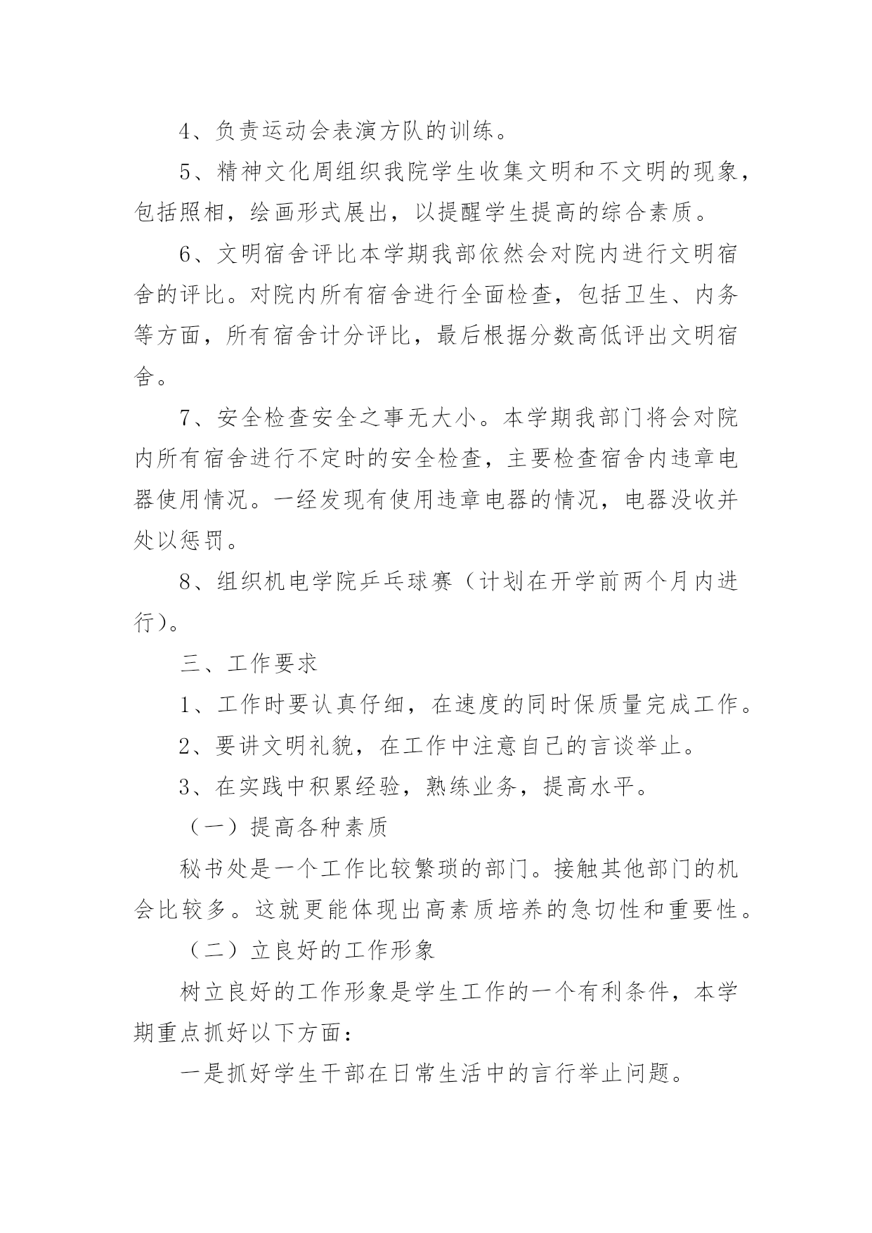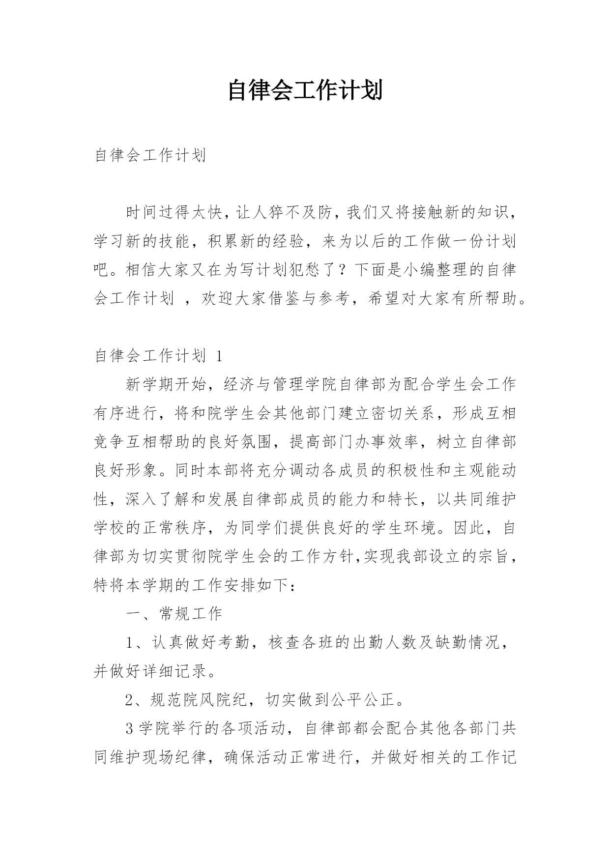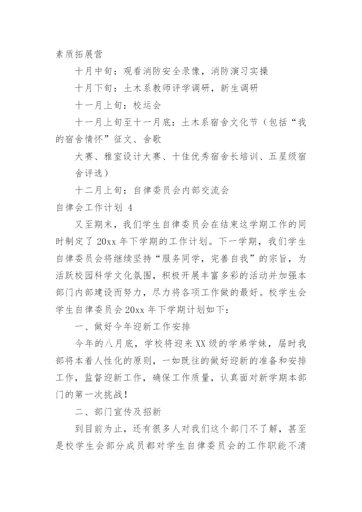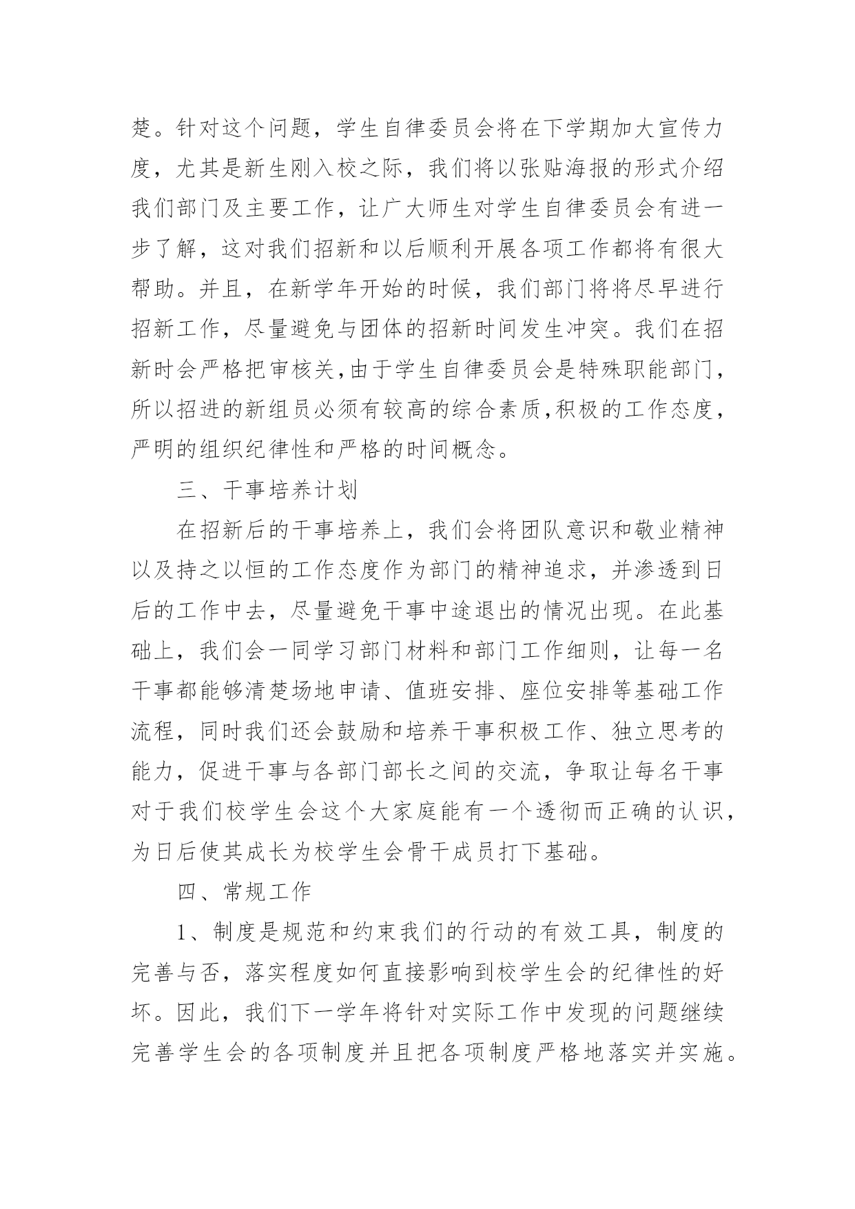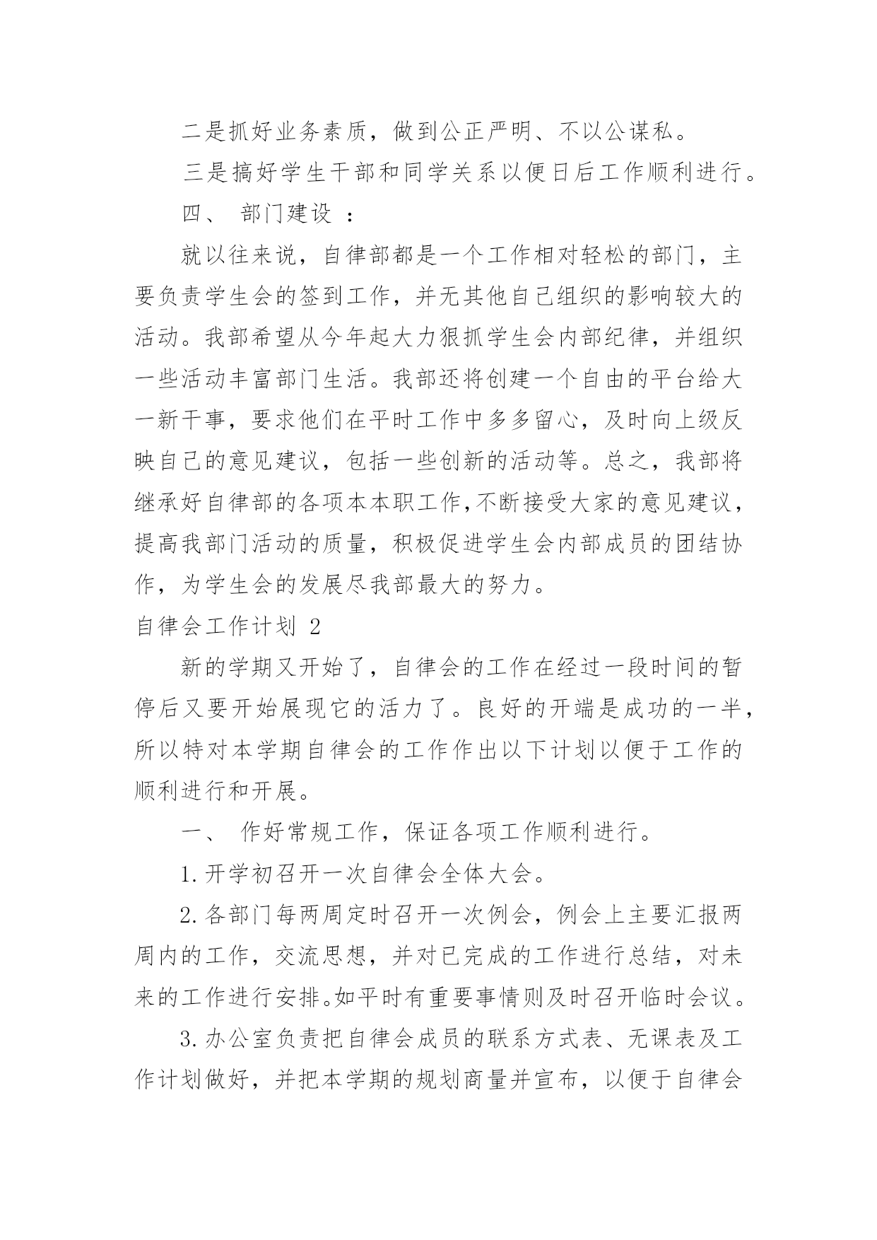 自律会工作计划自律会工作计划时间过得太快,让人猝不及防,我们又将接触新的知识,学习新的技能,积累新的经验,来为以后的工作做一份计划吧。相信大家又在为写计划犯愁了?下面是小编整理的自律会工作计划,欢迎大家借鉴与参考,希望对大家有所帮助。自律会工作计划1新学期开始,经济与管理学院自律部为配合学生会工作有序进行,将和院学生会其他部门建立密切关系,形成互相竞争互相帮助的良好氛围,提高部门办事效率,树立自律部良好形象。同时本部将充分调动各成员的积极性和主观能动性,深入了解和发展自律部成员的能力和特长,以共同维护学校的正常秩序,为同学们提供良好的学生环境。因此,自律部为切实贯彻院学生会的工作方针,实现我部设立的宗旨,特将本学期的工作安排如下:一、常规工作1、认真做好考勤,核查各班的出勤人数及缺勤情况,并做好详细记录。2、规范院风院纪,切实做到公平公正。3学院举行的各项活动,自律部都会配合其他各部门共同维护现场纪律,确保活动正常进行,并做好相关的工作记录。二、详细安排1、每周,院自律部将会不定期的去各班级进行抽查,并将相关的情况及时做好统计。2、每周周五各班级自律委员要将本班的出勤情况交由院自院部检查,由院部对本周情况做一个总结并及时上报辅导员处。3、每月月底自律部将会对本月内的缺勤人数及姓名做详细统计,并及时提醒经常缺勤的人员。4、每周缺勤两次以上的同学两取消本学期期末评优评先的资格,每周累计迟到三次的同学将视为旷课一天。三、其他工作1、本学期将于十月至十二月开展百日三无(无迟到,无早退,无旷课)的`学风建设活动,自律部将于十二月底公布表现优秀的班级。2、协助院学生会生活部的日常生活管理与监督工作,共同维护好院系纪律,为学生提供良好的生活学习氛围。3、配合校学生会的工作和学校同步前进。机电学院的学生会工作在各位老师的关注和各位学生干部的努力下,逐步成长为一个为老师分担工作、服务机电学院广大同学的不可或缺的组织。走过了“无规矩不成方圆”的各项制度的建立和完善阶段,又经过了“以稳定,求创新”的发展巩固时期,如今我院学生会的制度基本完善,学生会工作思路与广大同学之间的反复磨合,已被基本接纳,各部门干部思想素质和业务素质也得到了普遍提高,整个学生会发展逐步走向成熟。机电学院在我校在具有重要的地位,各方面工作正应该为各学院树立好榜样,站在这样一个角度看,也应该是我们鼓足干劲,力争上游,努力开创机电学院学生工作新局面的时候了。当我们学生会这样一个学生自治组织具备了较好的学生工作基础,再从高的起点出发,我们就一定能够实现自己的目标,树立起我们机电学院学生工作的一面旗帜,将学院学生工作引入一个更新、更广、更深的工作新环境和新局面。为此,我们更要做好各项工作的统筹安排计划,并在实际工作中不断开拓创新、弥补不足。一、经验总结:自律部在以往工作中表现出了不可或缺的重要性,在学生会签到、内部成员考察等工作中表现出了应有的作用。但是工作中仍然出现了一些瑕疵,如没有发挥好组织作用使学生会各个部门能够团结协作,自律部工作太空使得干事们没有发挥自己的能力,他们提的建议没有能良好的体现等。总的来说,功大于失。二、主要活动:1、负责每次活动学生会内部人员的考勤以及工作态度、工作情况等的考察。2、负责活动中各个班级等活动参加者的考察,并统计参加人员名单。3、辅助各个部门维持好各项活动的秩序,并帮助共同组织活动。4、负责运动会表演方队的训练。5、精神文化周组织我院学生收集文明和不文明的现象,包括照相,绘画形式展出,以提醒学生提高的综合素质。6、文明宿舍评比本学期我部依然会对院内进行文明宿舍的评比。对院内所有宿舍进行全面检查,包括卫生、内务等方面,所有宿舍计分评比,最后根据分数高低评出文明宿舍。7、安全检查安全之事无大小。本学期我部门将会对院内所有宿舍进行不定时的安全检查,主要检查宿舍内违章电器使用情况。一经发现有使用违章电器的情况,电器没收并处以惩罚。8、组织机电学院乒乓球赛(计划在开学前两个月内进行)。三、工作要求1、工作时要认真仔细,在速度的同时保质量完成工作。2、要讲文明礼貌,在工作中注意自己的言谈举止。3、在实践中积累经验,熟练业务,提高水平。(一)提高各种素质秘书处是一个工作比较繁琐的部门。接触其他部门的机会比较多。这就更能体现出高素质培养的急切性和重要性。(二)立良好的工作形象树立良好的工作形象是学生工作的一个有利条件,本学期重点抓好以下方面:一是抓好学生干部在日常生活中的言行举止问题。二是抓好业务素质,做到公正严明、不以公谋私。三是搞好学生干部和同学关系以便日后工作顺利进行。四、部门建设:就以往来说,自律部都是一个工作相对轻松的部门,主要负责学生会的签到工作,并无其他自己组织的影响较大的活动。我部希望从今年起大力狠抓学生会内部纪律,并组织一些活动丰富部门生活。
