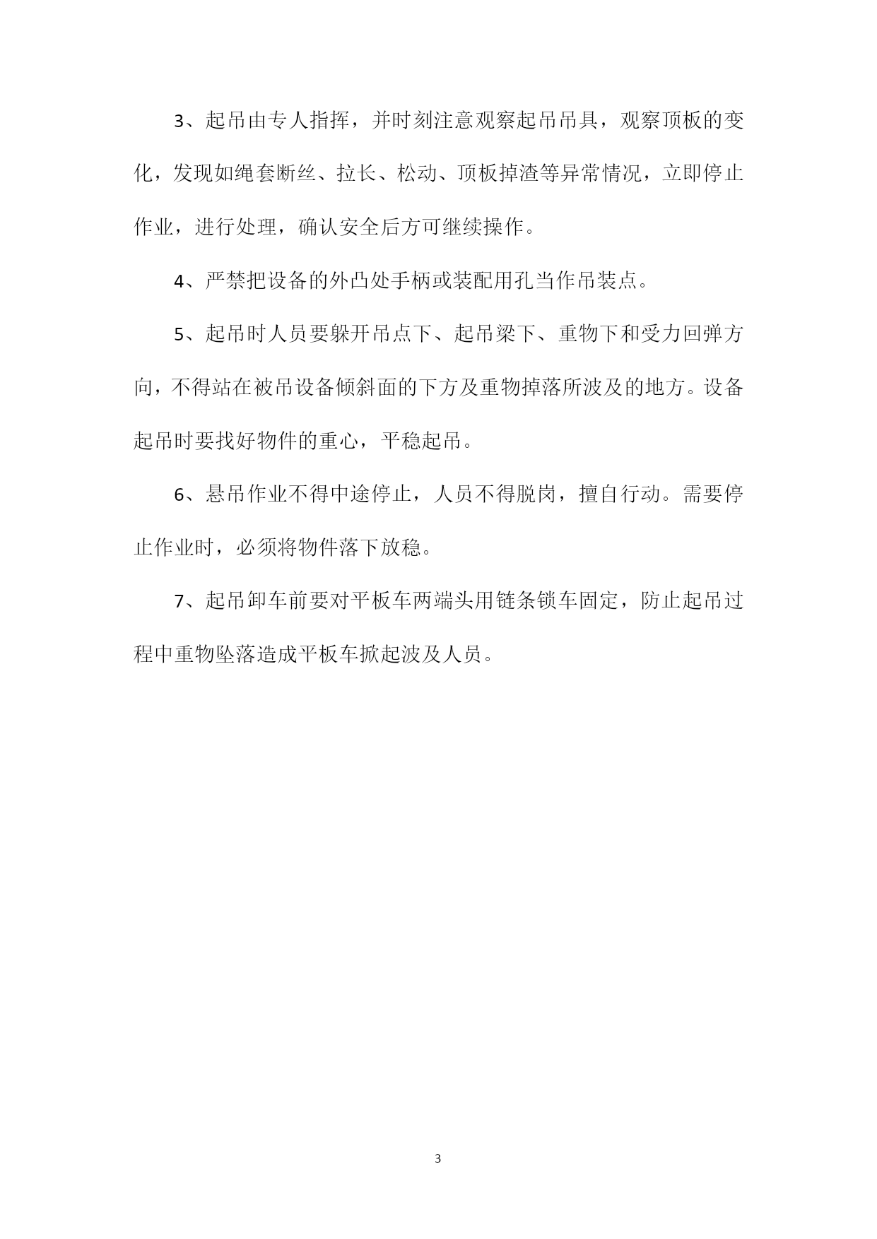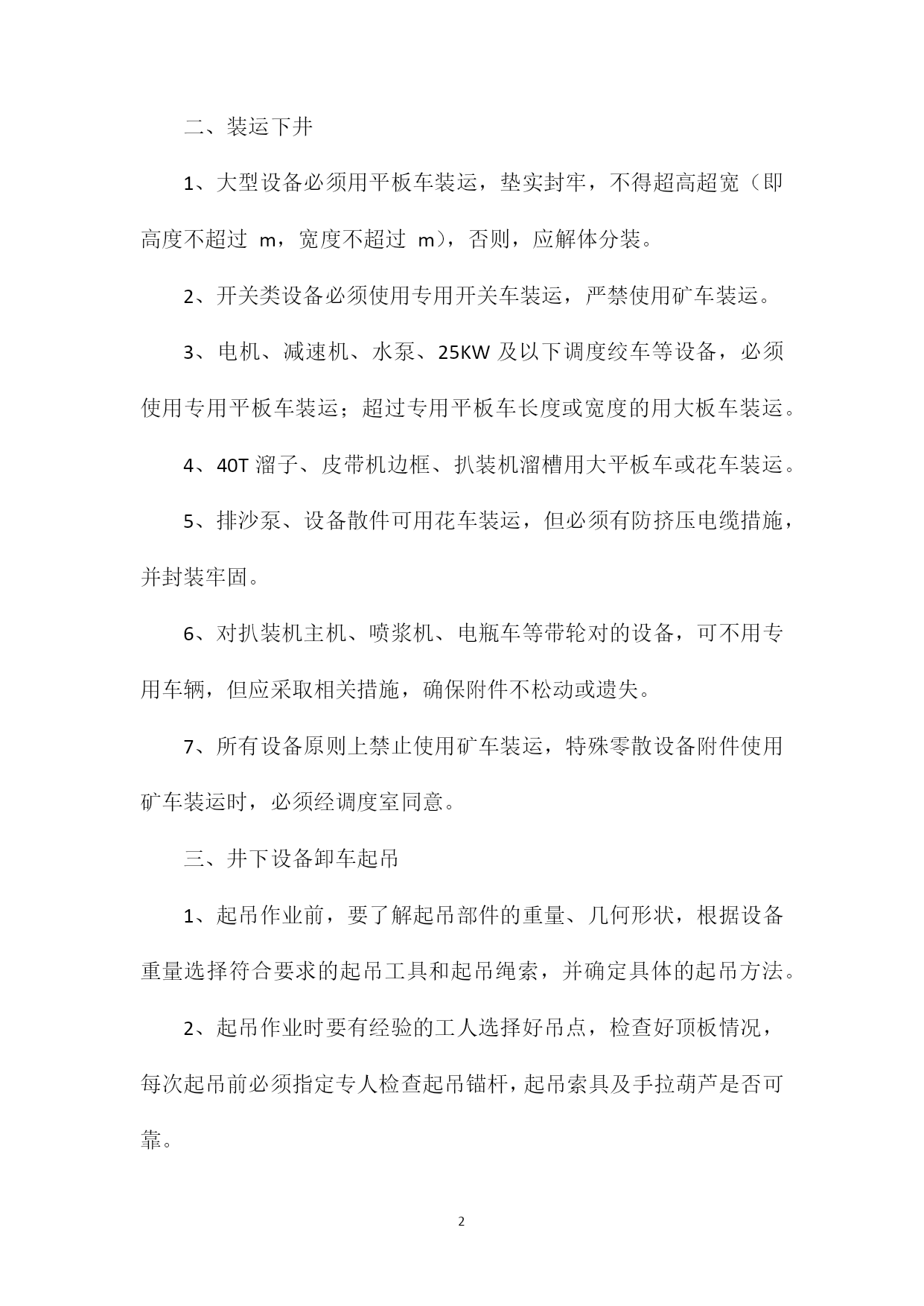 PAGEPAGE3煤矿机电设备装卸车安全技术措施为加强设备装运吊卸管理,确保各个环节安全操作,减少经济损失,确保安全生产,经研究,特制定本规定:一、设备地面卸车起吊说明:本次卸车起吊指利用综修车间行车起吊1、起吊作业前,要了解起吊部件的重量、几何形状,根据设备重量选择符合要求的起吊绳索,并确定具体的起吊方法。2、行车操作必须由专门经过培训合格的起重司机操作。3、起吊作业时要有经验的工人选择好吊点,检查好起吊索具是否可靠。4、起吊由专人指挥,并时刻注意观察起吊吊具,观察起吊绳索的变化,发现如绳索断丝、拉长、松动等异常情况,立即停止作业,进行处理,确认安全后方可继续操作。5、严禁把设备的外凸处手柄或装配用孔当作吊装点。6、起吊时人员要躲开吊点下、起吊梁下、重物下和受力回弹方向,不得站在被吊设备倾斜面的下方及重物掉落所波及的地方。设备起吊时要找好物件的重心,平稳起吊。7、悬吊作业不得中途停止,操作司机人员不得脱岗,擅自行动。需要停止作业时,必须将物件落下放稳。二、装运下井1、大型设备必须用平板车装运,垫实封牢,不得超高超宽(即高度不超过m,宽度不超过m),否则,应解体分装。2、开关类设备必须使用专用开关车装运,严禁使用矿车装运。3、电机、减速机、水泵、25KW及以下调度绞车等设备,必须使用专用平板车装运;超过专用平板车长度或宽度的用大板车装运。4、40T溜子、皮带机边框、扒装机溜槽用大平板车或花车装运。5、排沙泵、设备散件可用花车装运,但必须有防挤压电缆措施,并封装牢固。6、对扒装机主机、喷浆机、电瓶车等带轮对的设备,可不用专用车辆,但应采取相关措施,确保附件不松动或遗失。7、所有设备原则上禁止使用矿车装运,特殊零散设备附件使用矿车装运时,必须经调度室同意。三、井下设备卸车起吊1、起吊作业前,要了解起吊部件的重量、几何形状,根据设备重量选择符合要求的起吊工具和起吊绳索,并确定具体的起吊方法。2、起吊作业时要有经验的工人选择好吊点,检查好顶板情况,每次起吊前必须指定专人检查起吊锚杆,起吊索具及手拉葫芦是否可靠。3、起吊由专人指挥,并时刻注意观察起吊吊具,观察顶板的变化,发现如绳套断丝、拉长、松动、顶板掉渣等异常情况,立即停止作业,进行处理,确认安全后方可继续操作。4、严禁把设备的外凸处手柄或装配用孔当作吊装点。5、起吊时人员要躲开吊点下、起吊梁下、重物下和受力回弹方向,不得站在被吊设备倾斜面的下方及重物掉落所波及的地方。设备起吊时要找好物件的重心,平稳起吊。6、悬吊作业不得中途停止,人员不得脱岗,擅自行动。需要停止作业时,必须将物件落下放稳。7、起吊卸车前要对平板车两端头用链条锁车固定,防止起吊过程中重物坠落造成平板车掀起波及人员。