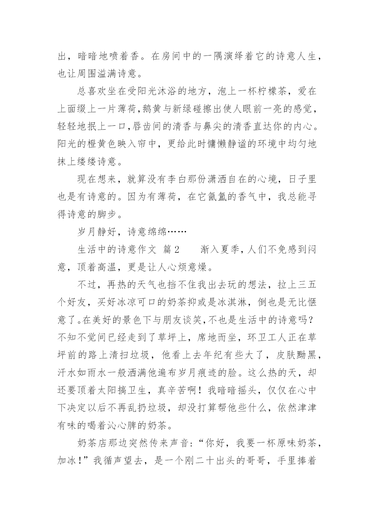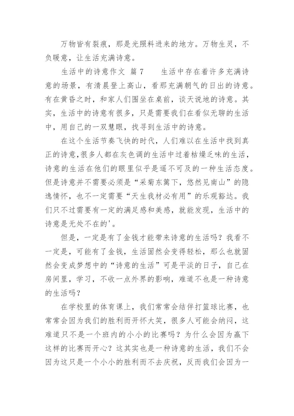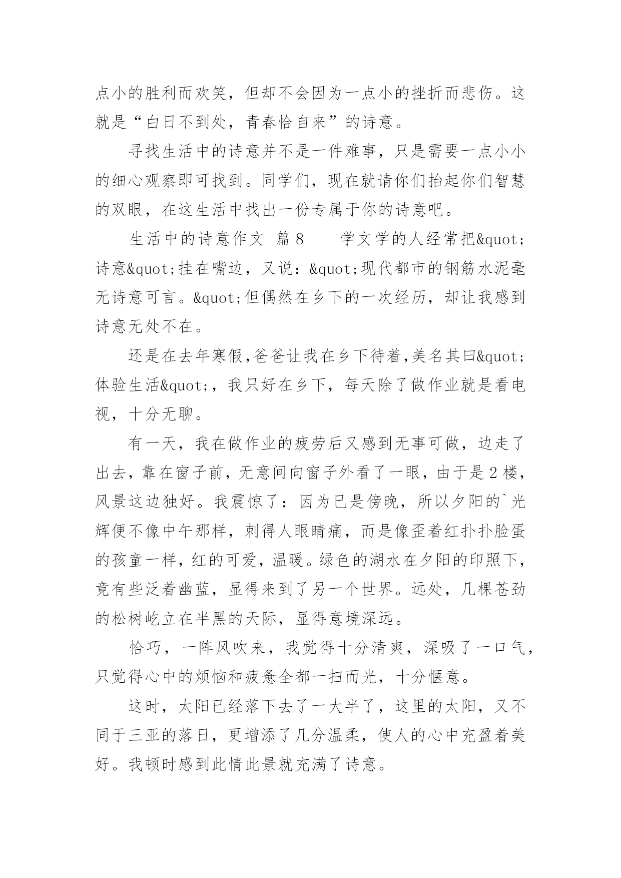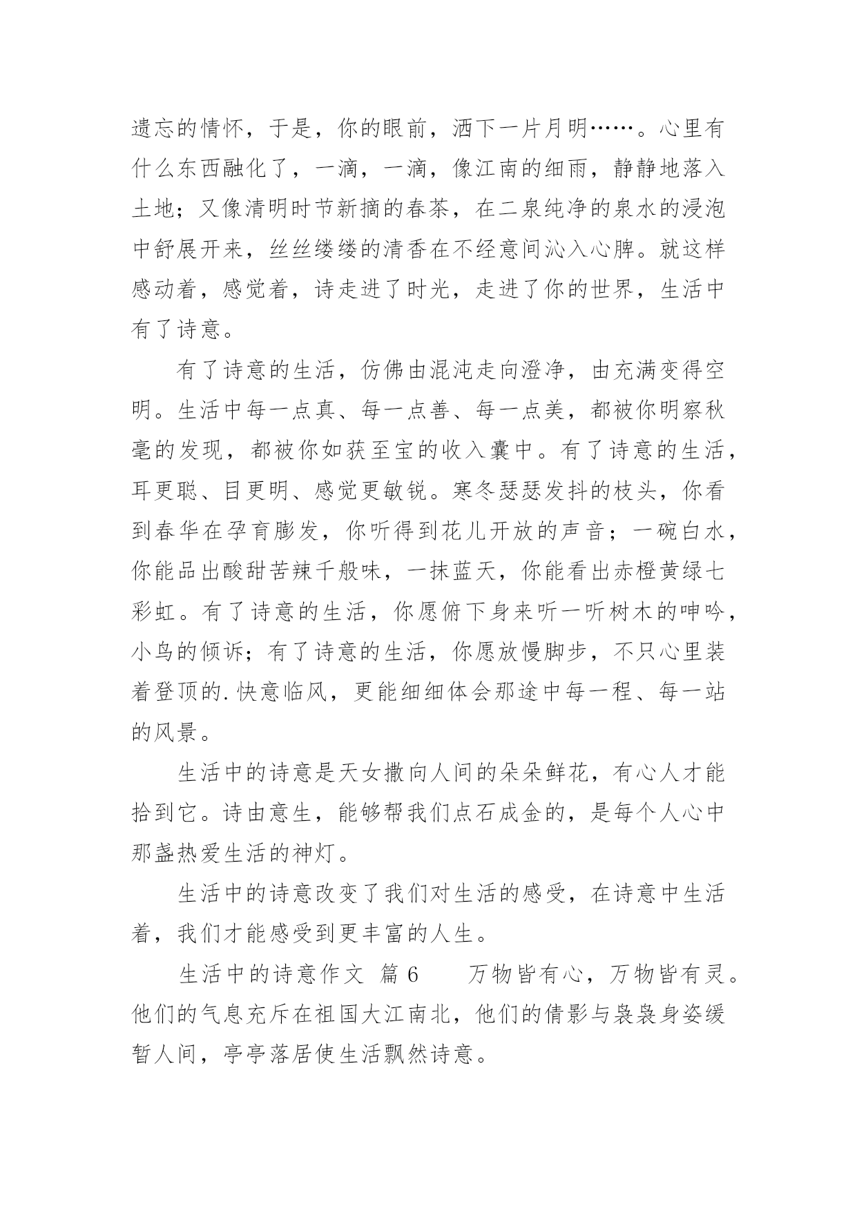 生活中的诗意作文生活中的诗意作文(通用39篇)在平平淡淡的日常中,大家都有写作文的经历,对作文很是熟悉吧,作文一定要做到主题集中,围绕同一主题作深入阐述,切忌东拉西扯,主题涣散甚至无主题。相信许多人会觉得作文很难写吧,下面是小编精心整理的生活中的诗意作文,仅供参考,大家一起来看看吧。生活中的诗意作文篇1“入夜渐微凉,繁花落地成霜。”我们的生活中也会有如此富有诗意的时候吗?夕阳散尽了它的最后一抹色彩,在刺目耀眼的灯光下,我俯仰着书海,“刷”着那似乎永远也写不完的作业,内心时而颠簸,时而疲倦。倏然间,脑海中浮现出李白的诗句:“人生在世不称意,明朝散发弄扁舟。”这样的意境,让我不禁慨叹自己生活中何时才有这放荡不羁、富有诗意的时候。悄然,一簇新绿夺入我的`眼眶,瞥去才知原是一株薄荷,是朋友给我的,放在此处好久了,照顾得甚是细致,也就是半天也没动静,却没想到它竟悄无声息地生长了。我想它有时也如同我一样吧。没日没夜地吸取水分,总想着破土而出,辟出一片自己的新天地。这么一想,到也就不那么孤独了。薄荷不比其他花,在别的花竞相开放、争妍斗艳的时候,不争不抢,静静地守护着自己的暗香,而在别的花感慨花落凋零时,不吵不闹,毫不声张,悄悄地冒出芽儿来,破土而出,暗暗地喷着香。在房间中的一隅演绎着它的诗意人生,也让周围溢满诗意。总喜欢坐在受阳光沐浴的地方,泡上一杯柠檬茶,爱在上面缀上一片薄荷,鹅黄与新绿碰擦出使人眼前一亮的感觉,轻轻地抿上一口,唇齿间的清香与鼻尖的清香直达你的内心。阳光的橙黄色映入帘中,更给此时慵懒静谧的环境中均匀地抹上缕缕诗意。现在想来,就算没有李白那份潇洒自在的心境,日子里也是有诗意的。因为有薄荷,在它氤氲的香气中,我总能寻得诗意的脚步。岁月静好,诗意绵绵……生活中的诗意作文篇2渐入夏季,人们不免感到闷意,顶着高温,更是让人心烦意燥。不过,再热的天气也挡不住我出去玩的想法,拉上三五个好友,买好冰凉可口的奶茶抑或是冰淇淋,倒也是无比惬意了。在美好的景色下与朋友谈笑,不也是生活中的诗意吗?不知不觉间已经走到了草坪上,席地而坐,环卫工人正在草坪前的路上清扫垃圾,他看上去年纪有些大了,皮肤黝黑,汗水如雨水一般洒满他遍布岁月痕迹的脸。这么热的天,却还要顶着太阳搞卫生,真辛苦啊!我暗暗摇头,仅仅在心中下决定以后不再乱扔垃圾,却没打算帮他些什么,依然津津有味的喝着沁心脾的奶茶。奶茶店那边突然传来声音:“你好,我要一杯原味奶茶,加冰!”我循声望去,是一个刚二十出头的哥哥,手里捧着店员递过去的奶茶,朝环卫工人走去,微笑道:“爷爷,喝杯奶茶吧。”爷爷憨厚的笑了,乐呵呵道:“谢谢小伙子,爷爷不喝,你喝吧。”“您每天打扫卫生多辛苦啊!这是我应该做的。”大哥哥说着,把奶茶塞到爷爷手里,转身走了,只留给我们一个高大挺拔的背影。我愣住了,脑海里回想着之前的`情景,再想想起之前自己的无动于衷。真是羞愧的想找条地缝钻进去!我飞速起身,不顾身旁的朋友,买了一瓶水塞到老爷爷手里,转身拉上朋友,舒心的笑了。现在想想,不禁脱口而出:“这些所作所为呐……”不就是生活中的诗意吗?生活中的诗意作文篇3生活处处皆语文,人生处处皆诗意。双眸是通往诗意的窗口,透过小窗望向窗外,沥沥小雨宛若羽毛飘然落下,谁都会不禁感叹一声:小楼一夜听春雨,深巷明朝卖杏花;双耳是聆听诗句的通道,观了那黄果瀑布,谁能不吟唱一句:水云生处龙翻腾,雷鼓嘈嘈震宇寰;双手提笔写诗,记录的是生活,记录的是美好。被余辉洒满的天空,总是落日熔金。夕阳在如棉被的云层的遮掩下,缓缓落入地平面之下。在那之前,天空仿佛仙女织成的丝帕,紫里透红,红里透黄,绚丽,又不失平凡。从远处欲归家的'飞鸟展开双翅,划过艳红的晚霞,飞翔在海的上空。远山连绵,伏在海岸,像那沉睡的野兽起伏的脊梁,在落日的照映下营造了“山气日夕佳,飞鸟相与还。”的静谧。海面上,一只只渔船悠然飘过,微风吹拂白帆,颇有点莫奈《海岸夕阳》的味道。置身于大山中,身旁不时传来鸟儿的鸣叫,巨人般的白桦矗立于山野,太阳的微光笼罩在全身,不禁暖意袭来。生命在这里变得有活力了,不时有小动物忙碌的身影出现在眼前。“蝉噪林逾静,鸟鸣山更幽。”夏蝉的嗡鸣声与林鸟的歌声奇妙的融于一体,称之为“天籁之声”似乎也并不为过。这大概便是人间仙境吧?立于山峰鸟瞰,终于知晓了“只为浮云遮望眼,自缘身在最高层”的快乐,此时仿佛处于天地间,脚下的山峦渺小了不少,我离天又近了些许,伸手可触。云雾缭绕,眼前模糊了。隐约瞧见登顶的登山人同我一样颔首俯视。语文是雨,滋润着小草;她是光,为我们指引前方的方向。生活处处皆语文,人生处处皆诗意。自古,诗便是人们对日常的感慨,它平凡,又不失平凡,几千年的涵养,诗早已成为瑰宝,成为骄傲。生活中的诗意作文篇4诗意是傍晚时分海面的一缕残阳,诗意是草原上红花与绿草的绝唱,诗意是天