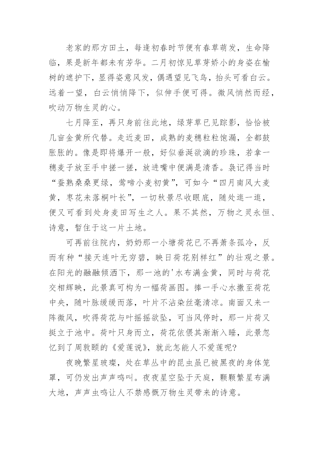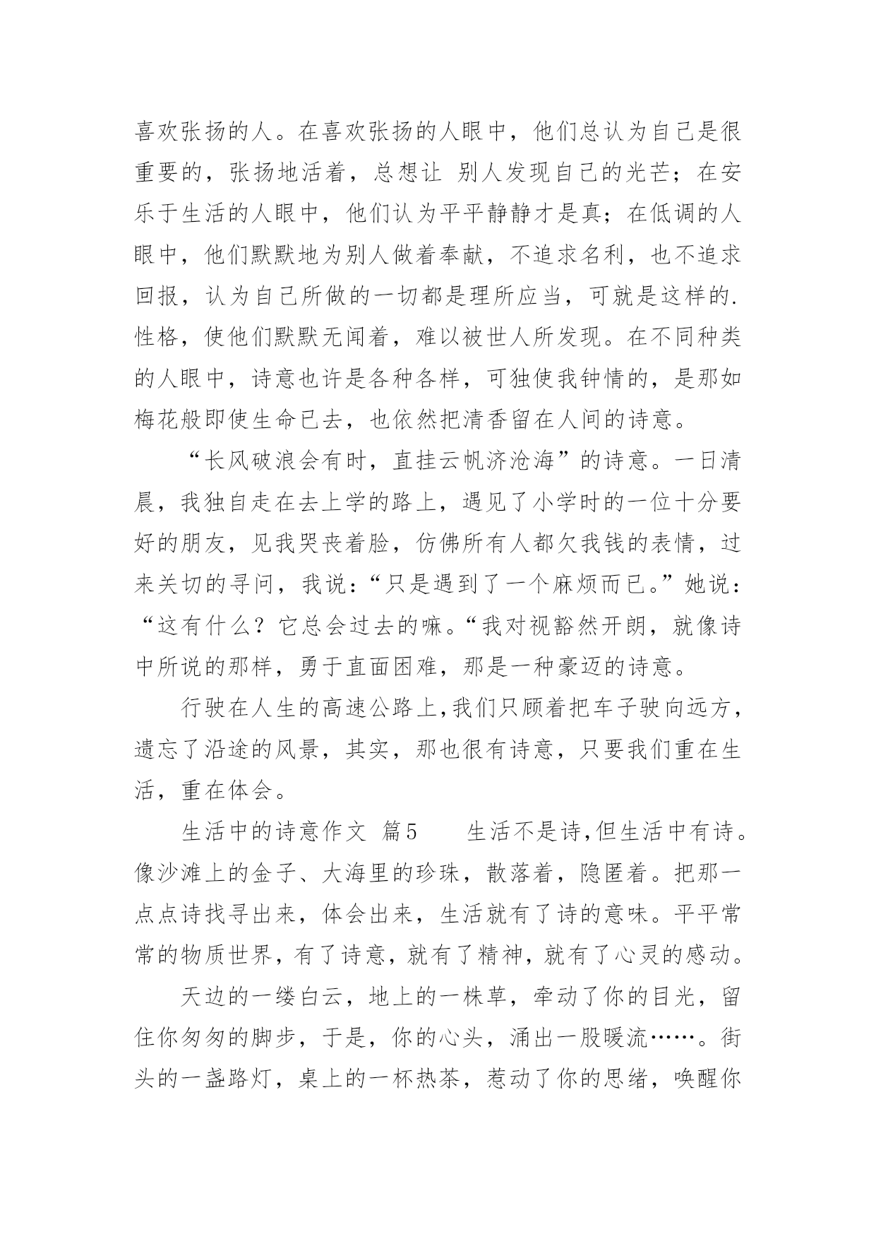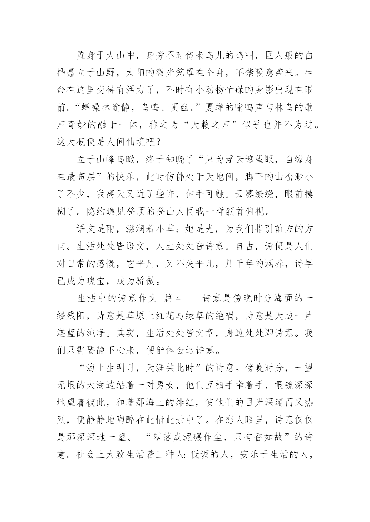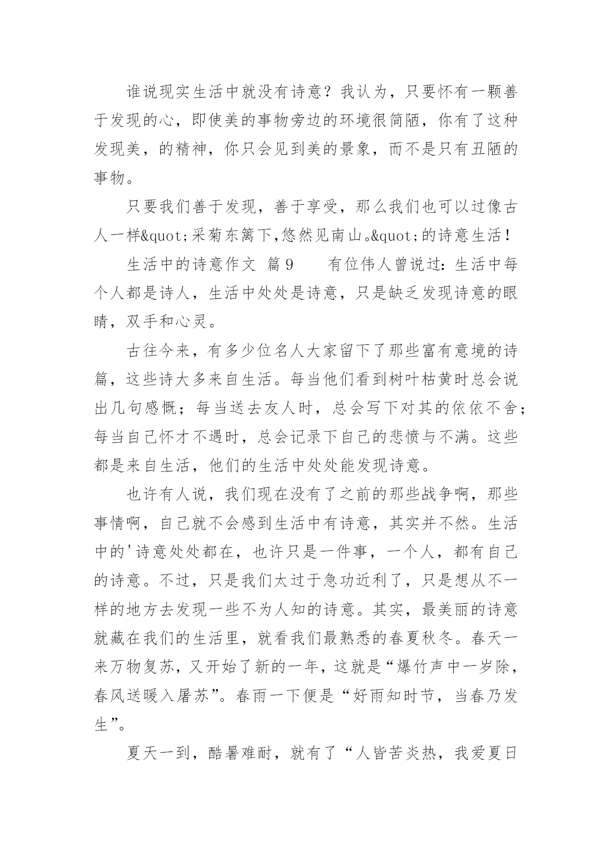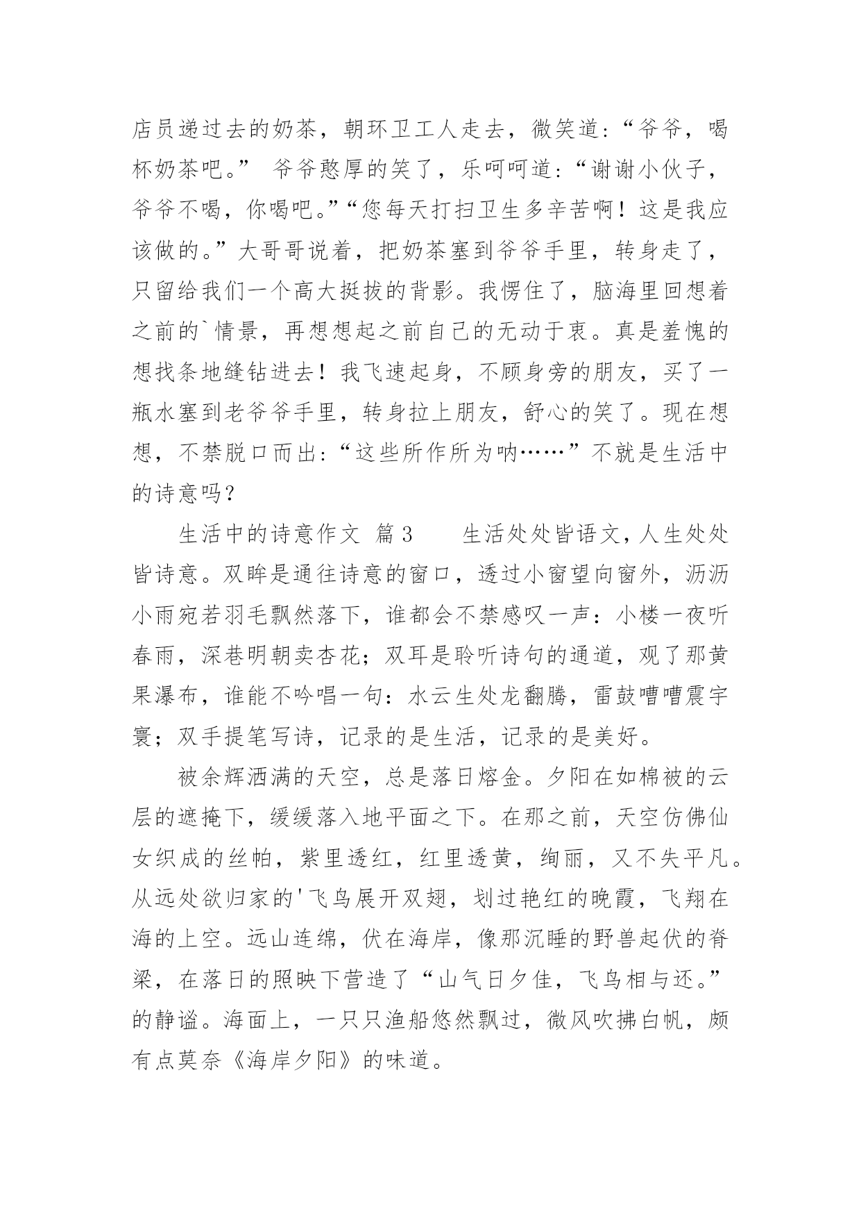 生活中的诗意作文生活中的诗意作文(通用39篇)在平平淡淡的日常中,大家都有写作文的经历,对作文很是熟悉吧,作文一定要做到主题集中,围绕同一主题作深入阐述,切忌东拉西扯,主题涣散甚至无主题。相信许多人会觉得作文很难写吧,下面是小编精心整理的生活中的诗意作文,仅供参考,大家一起来看看吧。生活中的诗意作文篇1“入夜渐微凉,繁花落地成霜。”我们的生活中也会有如此富有诗意的时候吗?夕阳散尽了它的最后一抹色彩,在刺目耀眼的灯光下,我俯仰着书海,“刷”着那似乎永远也写不完的作业,内心时而颠簸,时而疲倦。倏然间,脑海中浮现出李白的诗句:“人生在世不称意,明朝散发弄扁舟。”这样的意境,让我不禁慨叹自己生活中何时才有这放荡不羁、富有诗意的时候。悄然,一簇新绿夺入我的`眼眶,瞥去才知原是一株薄荷,是朋友给我的,放在此处好久了,照顾得甚是细致,也就是半天也没动静,却没想到它竟悄无声息地生长了。我想它有时也如同我一样吧。没日没夜地吸取水分,总想着破土而出,辟出一片自己的新天地。这么一想,到也就不那么孤独了。薄荷不比其他花,在别的花竞相开放、争妍斗艳的时候,不争不抢,静静地守护着自己的暗香,而在别的花感慨花落凋零时,不吵不闹,毫不声张,悄悄地冒出芽儿来,破土而出,暗暗地喷着香。在房间中的一隅演绎着它的诗意人生,也让周围溢满诗意。总喜欢坐在受阳光沐浴的地方,泡上一杯柠檬茶,爱在上面缀上一片薄荷,鹅黄与新绿碰擦出使人眼前一亮的感觉,轻轻地抿上一口,唇齿间的清香与鼻尖的清香直达你的内心。阳光的橙黄色映入帘中,更给此时慵懒静谧的环境中均匀地抹上缕缕诗意。现在想来,就算没有李白那份潇洒自在的心境,日子里也是有诗意的。因为有薄荷,在它氤氲的香气中,我总能寻得诗意的脚步。岁月静好,诗意绵绵……生活中的诗意作文篇2渐入夏季,人们不免感到闷意,顶着高温,更是让人心烦意燥。不过,再热的天气也挡不住我出去玩的想法,拉上三五个好友,买好冰凉可口的奶茶抑或是冰淇淋,倒也是无比惬意了。在美好的景色下与朋友谈笑,不也是生活中的诗意吗?不知不觉间已经走到了草坪上,席地而坐,环卫工人正在草坪前的路上清扫垃圾,他看上去年纪有些大了,皮肤黝黑,汗水如雨水一般洒满他遍布岁月痕迹的脸。这么热的天,却还要顶着太阳搞卫生,真辛苦啊!我暗暗摇头,仅仅在心中下决定以后不再乱扔垃圾,却没打算帮他些什么,依然津津有味的喝着沁心脾的奶茶。奶茶店那边突然传来声音:“你好,我要一杯原味奶茶,加冰!”我循声望去,是一个刚二十出头的哥哥,手里捧着店员递过去的奶茶,朝环卫工人走去,微笑道:“爷爷,喝杯奶茶吧。”爷爷憨厚的笑了,乐呵呵道:“谢谢小伙子,爷爷不喝,你喝吧。”“您每天打扫卫生多辛苦啊!这是我应该做的。”大哥哥说着,把奶茶塞到爷爷手里,转身走了,只留给我们一个高大挺拔的背影。我愣住了,脑海里回想着之前的`情景,再想想起之前自己的无动于衷。真是羞愧的想找条地缝钻进去!我飞速起身,不顾身旁的朋友,买了一瓶水塞到老爷爷手里,转身拉上朋友,舒心的笑了。现在想想,不禁脱口而出:“这些所作所为呐……”不就是生活中的诗意吗?生活中的诗意作文篇3生活处处皆语文,人生处处皆诗意。双眸是通往诗意的窗口,透过小窗望向窗外,沥沥小雨宛若羽毛飘然落下,谁都会不禁感叹一声:小楼一夜听春雨,深巷明朝卖杏花;双耳是聆听诗句的通道,观了那黄果瀑布,谁能不吟唱一句:水云生处龙翻腾,雷鼓嘈嘈震宇寰;双手提笔写诗,记录的是生活,记录的是美好。被余辉洒满的天空,总是落日熔金。夕阳在如棉被的云层的遮掩下,缓缓落入地平面之下。在那之前,天空仿佛仙女织成的丝帕,紫里透红,红里透黄,绚丽,又不失平凡。从远处欲归家的'飞鸟展开双翅,划过艳红的晚霞,飞翔在海的上空。远山连绵,伏在海岸,像那沉睡的野兽起伏的脊梁,在落日的照映下营造了“山气日夕佳,飞鸟相与还。”的静谧。海面上,一只只渔船悠然飘过,微风吹拂白帆,颇有点莫奈《海岸夕阳》的味道。置身于大山中,身旁不时传来鸟儿的鸣叫,巨人般的白桦矗立于山野,太阳的微光笼罩在全身,不禁暖意袭来。生命在这里变得有活力了,不时有小动物忙碌的身影出现在眼前。“蝉噪林逾静,鸟鸣山更幽。”夏蝉的嗡鸣声与林鸟的歌声奇妙的融于一体,称之为“天籁之声”似乎也并不为过。这大概便是人间仙境吧?立于山峰鸟瞰,终于知晓了“只为浮云遮望眼,自缘身在最高层”的快乐,此时仿佛处于天地间,脚下的山峦渺小了不少,我离天又近了些许,伸手可触。云雾缭绕,眼前模糊了。隐约瞧见登顶的登山人同我一样颔首俯视。语文是雨,滋润着小草;她是光,为我们指引前方的方向。生活处处皆语文,人生处处皆诗意。自古,诗便是人们对日常的感慨,它平凡,又不失平凡,几千年的涵养,诗早已成为瑰宝,成为骄傲。生活中的诗意作文篇4诗意是傍晚时分海面的一缕残阳,诗意是草原上红花与绿草的绝唱,诗意是天