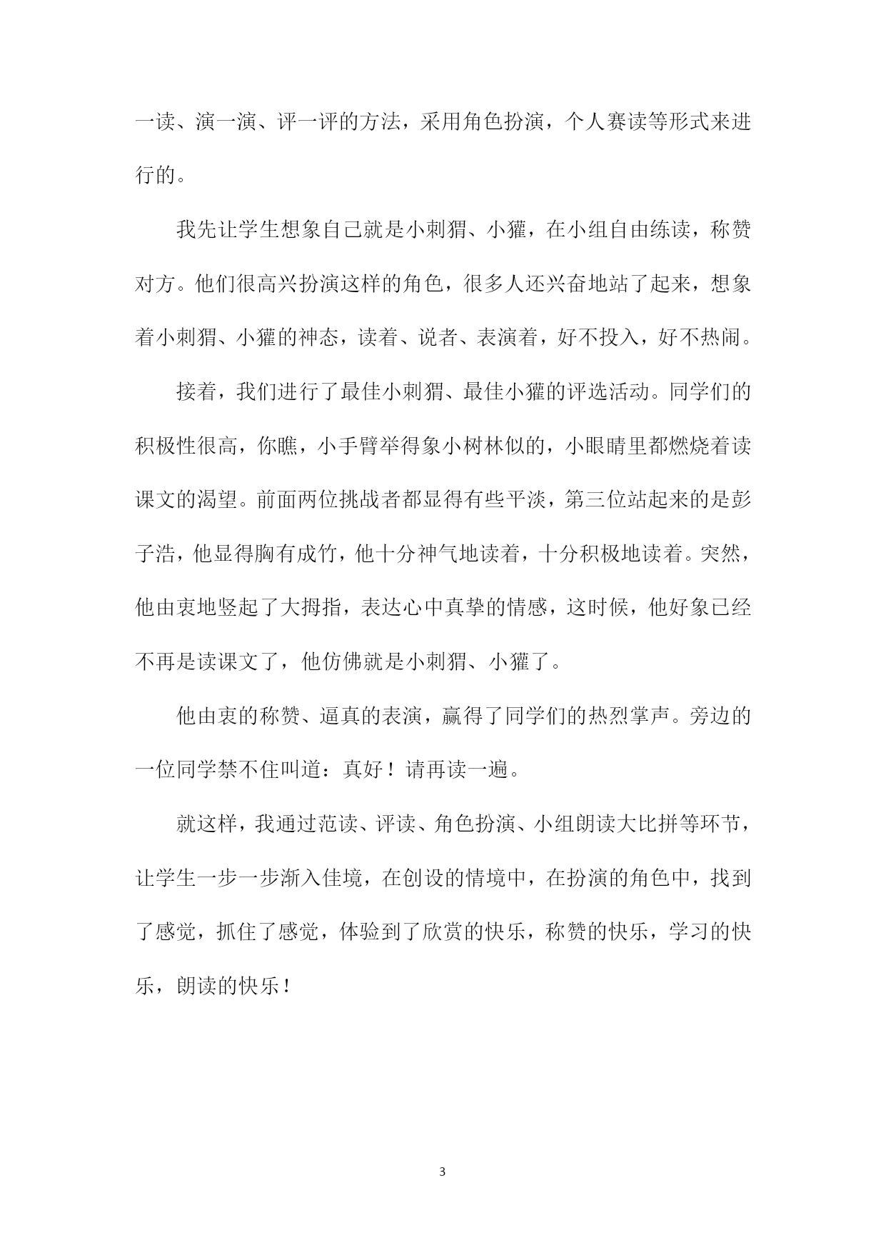 PAGEPAGE3《称赞》教学设计四[问题的提出]:新课标指出:阅读是学生的个性化行为,应让学生在主动积极的思维和情感活动中,加深理解和体验,有所感悟和思考。语文课堂教学是一个师生情感互动的过程。教师如能创设零距离的教学情境,将学生置于独特的情境之中,就能感染学生,引起他们心灵上的共鸣,实现于文本和作者的对话。从《称赞》一课的教学中,我体会到了这一点。[教材分析与处理]:《称赞》一课,是新入选人教版第三册的一篇童话,描写了小刺猬和小獾互相称赞,获得成功快乐的故事。书读百遍,其义自见。在教学中,我没有过多地分析、讲解,而是充分创设情境,以情感为纽带,以读为主线,让学生在初读中识字,在范读中激趣,在精读中感悟,在赛读中表演,在表演中体验。学生丛中学会了欣赏和称赞,体验到了称赞的快乐,成长的快乐![教学过程]:一、创设情境激发兴趣新课标指出:应让学生喜欢阅读。为了激发学生的学习兴趣,针对低年级学生的特点,一上课,我就创设了动物王国的情境,我兴致勃勃地说道:今天,老师特别高兴,昨天我去动物王国做客,和许多小动物做了有趣的游戏。临走时,国王听说我今天要见你们这些可爱的小朋友,可高兴啦!特意派来两位大使来我班做客,让我们用热烈的掌声欢迎它们的到来,好吗在学生热烈的掌声中,在一双双好奇、惊喜的眼神中,我把小刺猬、小獾请上了黑板,导出了课题《称赞》,成功地点燃了学生学习新课文,阅读新课文的欲望和热情。[二、以情激情───学生挡不住真情的魅力要调动学生的情感参与,教师首先必须投入自己的真情实感!有真情流露,才有心灵交汇。在处理初读课文这个环节时,我让学生一边欣赏生动有趣的画面,一边听老师范读。范读一结束,就有同学举手说:老师,听了您的朗读,我觉得自己好象就在大森林中,和小刺猬、小獾一起采果子、做板凳呢!我们可以读一下课文吗学生受到老师范读真情的感染,也跟着摇头晃脑、眉飞色舞、甚至手舞足蹈地读了起来。三、化物为我入情入境崔峦老师曾说过:看不到学生读书进步的课堂不是好课堂。在精读课文时,我重点引导学生动脑读好互相称赞的话。这个环节是按读一读、演一演、评一评的方法,采用角色扮演,个人赛读等形式来进行的。我先让学生想象自己就是小刺猬、小獾,在小组自由练读,称赞对方。他们很高兴扮演这样的角色,很多人还兴奋地站了起来,想象着小刺猬、小獾的神态,读着、说者、表演着,好不投入,好不热闹。接着,我们进行了最佳小刺猬、最佳小獾的评选活动。同学们的积极性很高,你瞧,小手臂举得象小树林似的,小眼睛里都燃烧着读课文的渴望。前面两位挑战者都显得有些平淡,第三位站起来的是彭子浩,他显得胸有成竹,他十分神气地读着,十分积极地读着。突然,他由衷地竖起了大拇指,表达心中真挚的情感,这时候,他好象已经不再是读课文了,他仿佛就是小刺猬、小獾了。他由衷的称赞、逼真的表演,赢得了同学们的热烈掌声。旁边的一位同学禁不住叫道:真好!请再读一遍。就这样,我通过范读、评读、角色扮演、小组朗读大比拼等环节,让学生一步一步渐入佳境,在创设的情境中,在扮演的角色中,找到了感觉,抓住了感觉,体验到了欣赏的快乐,称赞的快乐,学习的快乐,朗读的快乐!