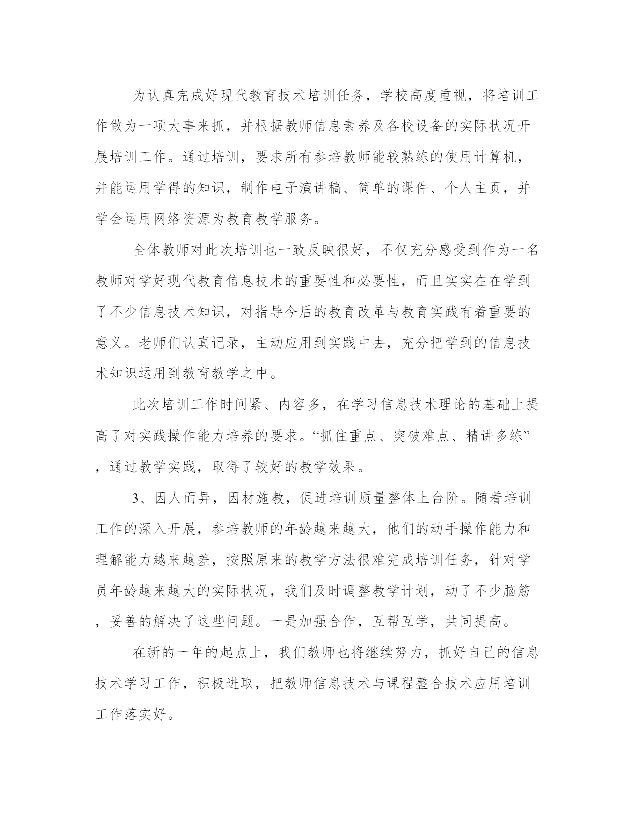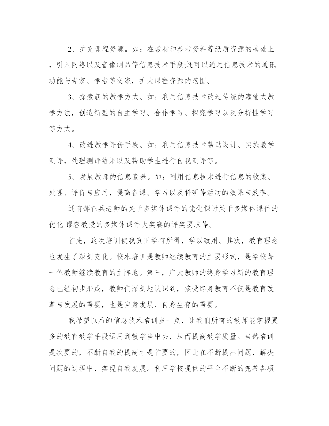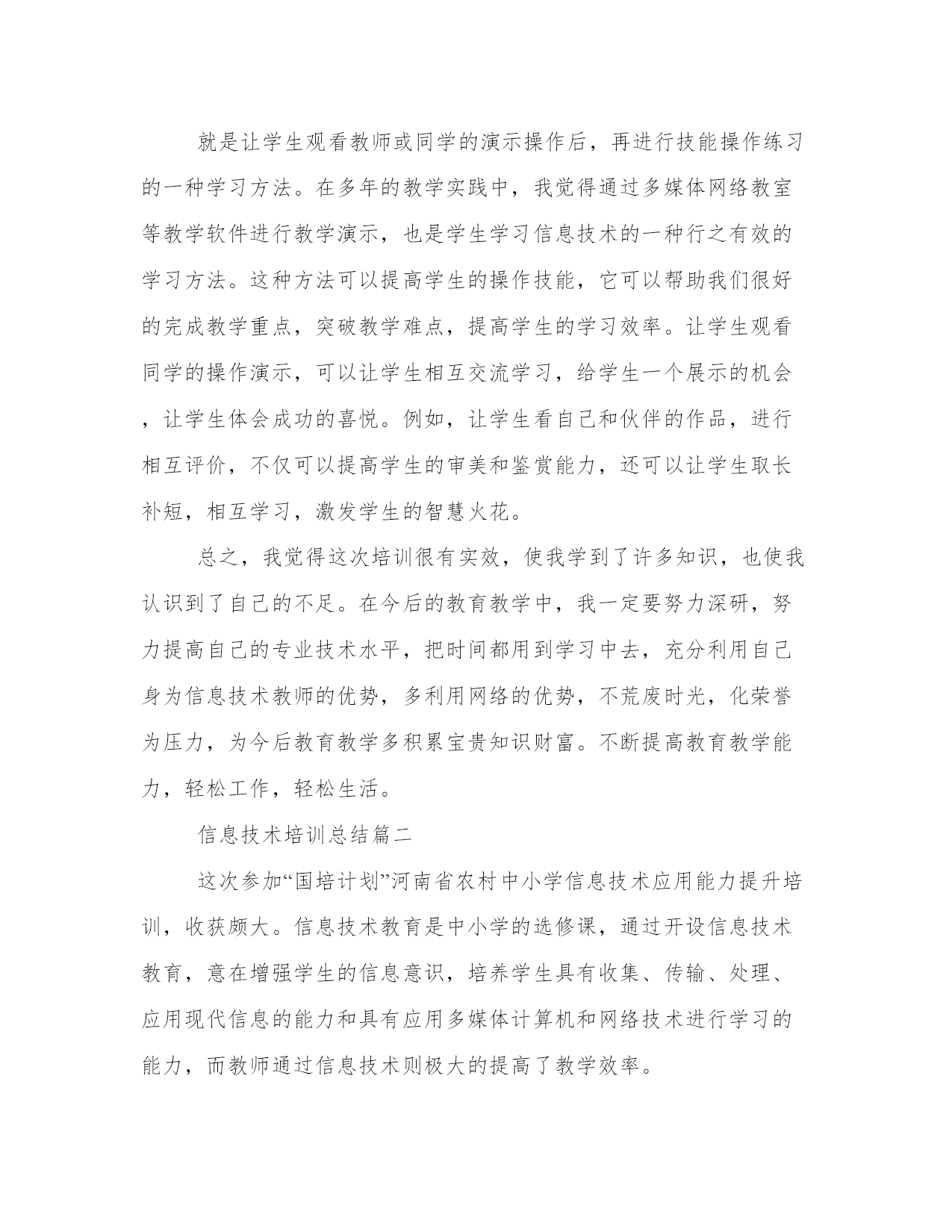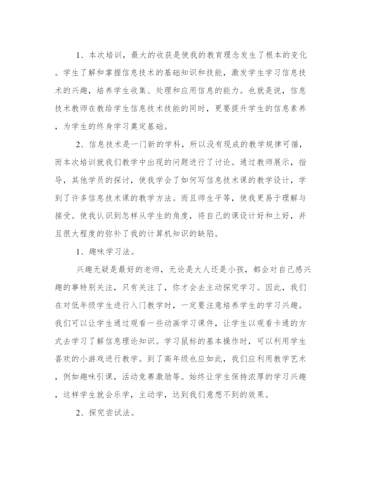 最新信息技术培训总结(模板19篇)总结可以帮助我们发现自己的潜力和不足,为个人发展提供指导。总结中要注重用词准确,避免模棱两可或含糊不清的表达方式。这些总结范文从不同的角度和层面出发,可以帮助我们更好地理解总结的重要性和作用。信息技术培训总结篇一这次暑假教育局对我们信息技术全体教师进行信息技术培训,使我受益匪浅,使我深刻的认识到,在二十一世纪的今天,以计算机和网络技术为核心的现代技术正飞速的发展,越来越深刻的改变我们的学习方式。信息的获取、分析、处理、应用的能力将作为现代人最基本的能力和素质的标志,随着素质教育的不断深化,对教师的要求也不断提高,只有教师的素质高,才能培养出高素质的学生,为了适应工作的需要,教师要不断的学习、不断的提高,以适应当今教育形势需要。从小培养学生掌握和应用现代信息技术,是信息社会对人才的基本要求,也是增强综合国力的一个重要组成部分,对于教师而言,运用现代教学技术进行多媒体教学是现代教育的一大趋势。信息技术教育培训给我带来了一次与现代技术接触的机会。一直认为信息技术就是教给学生计算机知识,通过这次培训才知道计算机技术只是信息技术的一部分,计算机只是我们获取信息最有效的工具。1、本次培训,最大的收获是使我的教育理念发生了根本的变化。学生了解和掌握信息技术的基础知识和技能,激发学生学习信息技术的兴趣,培养学生收集、处理和应用信息的能力。也就是说,信息技术教师在教给学生信息技术技能的同时,更要提升学生的信息素养,为学生的终身学习奠定基础。2、信息技术是一门新的学科,所以没有现成的教学规律可循,而本次培训就我们教学中出现的问题进行了讨论。通过教师展示,指导,其他学员的探讨,使我学会了如何写信息技术课的教学设计,学到了许多信息技术课的教学方法。而且师生平等,使我更易于理解与接受。使我认识到怎样从学生的角度,将自己的课设计好和上好,并且很大程度的弥补了我的计算机知识的缺陷。1、趣味学习法。兴趣无疑是最好的老师,无论是大人还是小孩,都会对自己感兴趣的事特别关注,只有关注了,你才会去主动探究学习。因此,我们在对低年级学生进行入门教学时,一定要注意培养学生的学习兴趣。我们可以让学生通过观看一些动画学习课件,让学生以观看卡通的方式去学习了解信息理论知识。学习鼠标的基本操作时,可以利用学生喜欢的小游戏进行教学。到了高年级也应如此,我们应利用教学艺术,例如趣味引课,活动竞赛激励等。始终让学生保持浓厚的学习兴趣,这样学生就会乐学,主动学,达到我们意想不到的效果。2、探究尝试法。信息技术是一门操作性较强的课程,课堂上讲半天,只看不练,不如让学生上机操作几分钟。相信对这一点,我们从事多年信息技术课教学的老师一定身有感触。对于操作系统和一些教学软件的操作小技巧和小常识,内容繁杂,达到同一种目的的方法往往不是唯一的,有多种方法,因此你不可能把每一种技巧和方法都教给学生。因此我主张,平时要教育学生,告诉他们,只要你上课时,除了不要用力敲击键盘、鼠标和不正常关机,不造成计算机硬件损坏外,在听清楚老师的讲解和要求后,你可以大胆探索、尝试操作。在实践教学的课堂中,我发现学生的这种学习方法,是最行之有效的。给同学们更多的自由空间,它可以让学生充分发挥自己的聪明才智,让学生自己学到很多课本中没有讲到的东西,甚至有些时候我们也会跟着学生学到意想不到的知识和技能。3、合作学习主题活动法。信息技术课不仅仅只是为了学习信息技术操作,往往是围绕着一个活动主题,在完成主题的过程中,去学习一定的信息知识与技能,提高学生的信息素养。合作学习主题活动法,不仅体现学科之间的整合,使学习活动生动有趣。学生在活动中不知不觉地完成了学习的内容,掌握了信息技能,还学会了与同学进行合作与交流,发展了学生的综合素质,提高了学生的多方面能力。4、观看演示讲练结合学习法。就是让学生观看教师或同学的演示操作后,再进行技能操作练习的一种学习方法。在多年的教学实践中,我觉得通过多媒体网络教室等教学软件进行教学演示,也是学生学习信息技术的一种行之有效的学习方法。这种方法可以提高学生的操作技能,它可以帮助我们很好的完成教学重点,突破教学难点,提高学生的学习效率。让学生观看同学的操作演示,可以让学生相互交流学习,给学生一个展示的机会,让学生体会成功的喜悦。例如,让学生看自己和伙伴的作品,进行相互评价,不仅可以提高学生的审美和鉴赏能力,还可以让学生取长补短,相互学习,激发学生的智慧火花。总之,我觉得这次培训很有实效,使我学到了许多知识,也使我认识到了自己的不足。在今后的教育教学中,我一定要努力深研,努力提高自己的专业技术水平,把时间都用到学习中去,充分利用自己身为信息技术教师的优势,多利用网络的优势,不荒废时光,化荣誉为压力,为今后教育教学多积累宝贵知识财富。不断提