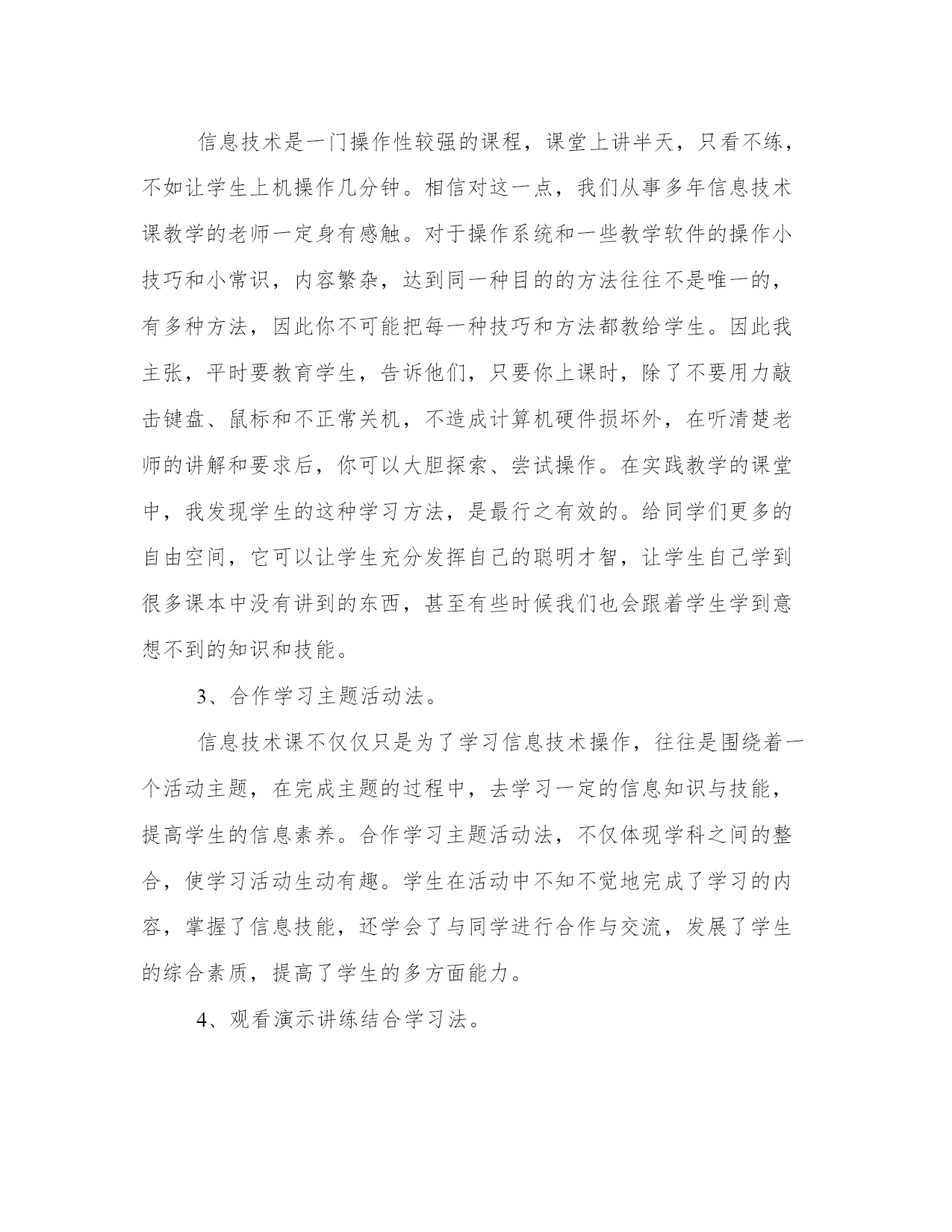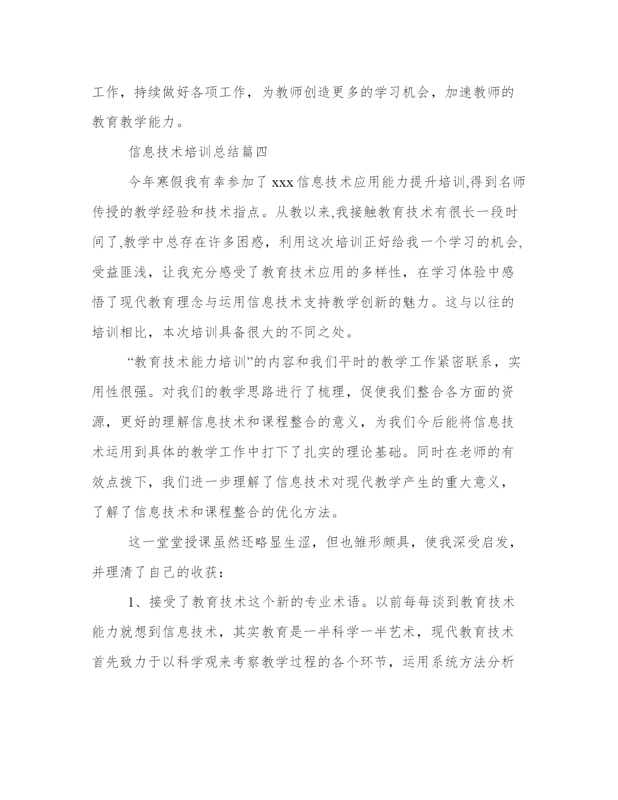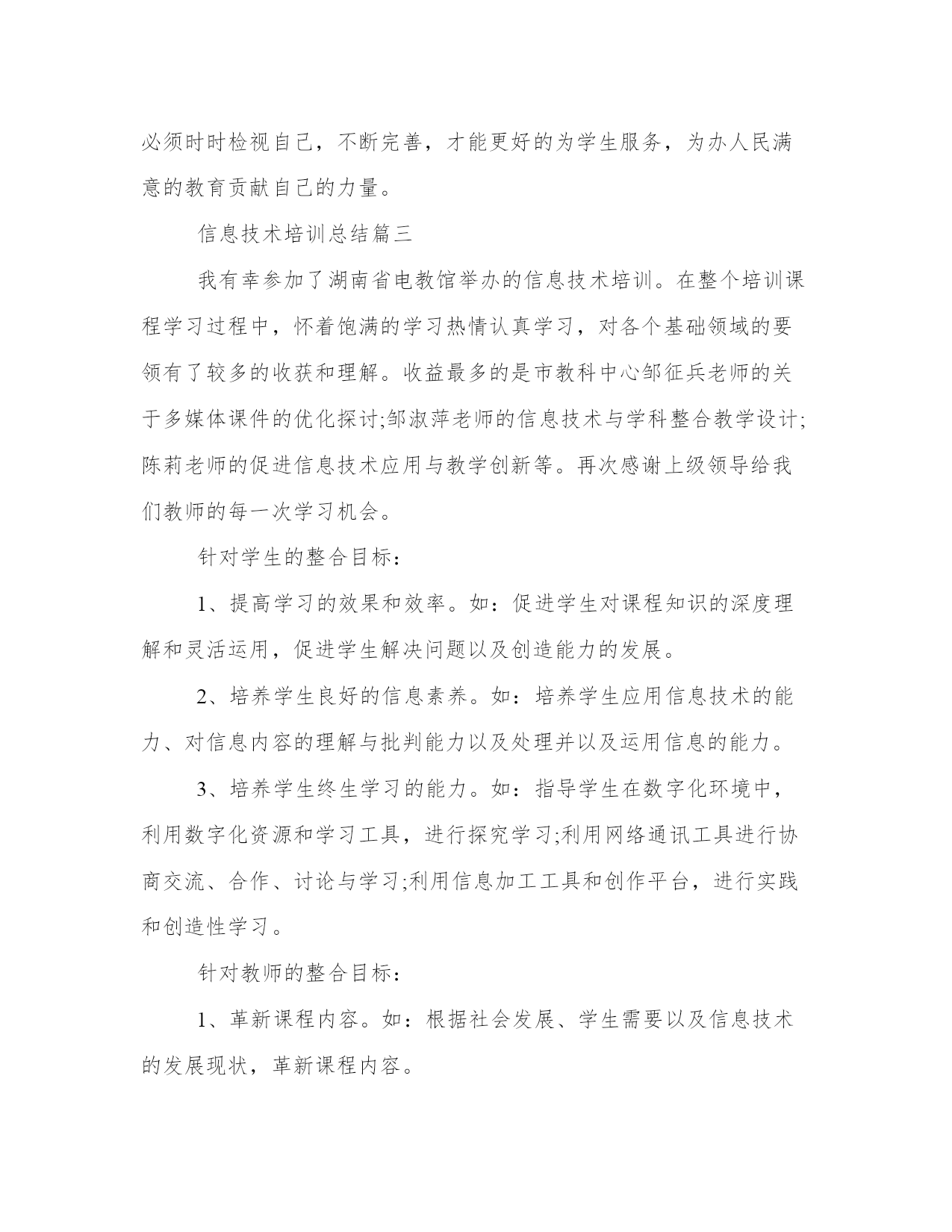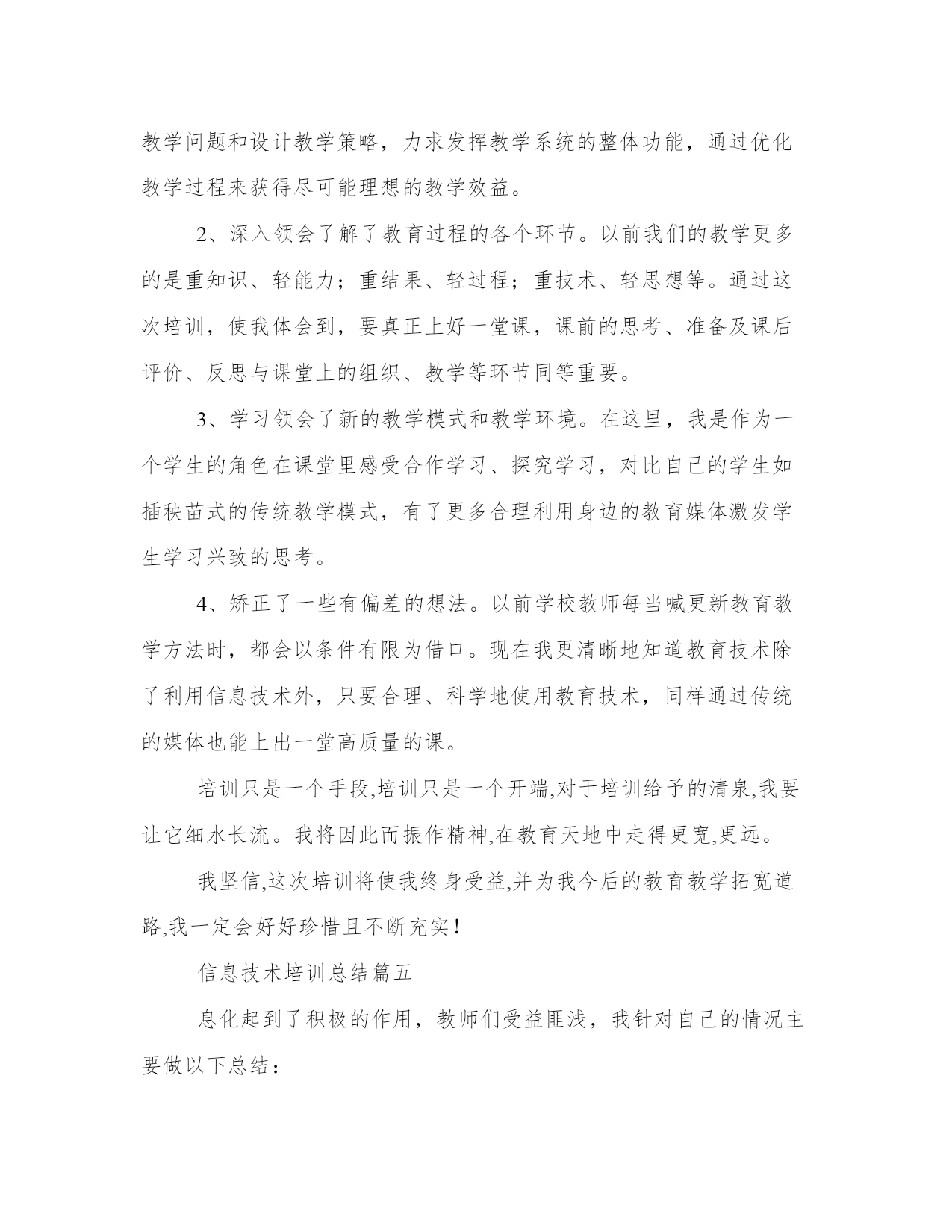 最新信息技术培训总结(模板19篇)总结可以帮助我们发现自己的潜力和不足,为个人发展提供指导。总结中要注重用词准确,避免模棱两可或含糊不清的表达方式。这些总结范文从不同的角度和层面出发,可以帮助我们更好地理解总结的重要性和作用。信息技术培训总结篇一这次暑假教育局对我们信息技术全体教师进行信息技术培训,使我受益匪浅,使我深刻的认识到,在二十一世纪的今天,以计算机和网络技术为核心的现代技术正飞速的发展,越来越深刻的改变我们的学习方式。信息的获取、分析、处理、应用的能力将作为现代人最基本的能力和素质的标志,随着素质教育的不断深化,对教师的要求也不断提高,只有教师的素质高,才能培养出高素质的学生,为了适应工作的需要,教师要不断的学习、不断的提高,以适应当今教育形势需要。从小培养学生掌握和应用现代信息技术,是信息社会对人才的基本要求,也是增强综合国力的一个重要组成部分,对于教师而言,运用现代教学技术进行多媒体教学是现代教育的一大趋势。信息技术教育培训给我带来了一次与现代技术接触的机会。一直认为信息技术就是教给学生计算机知识,通过这次培训才知道计算机技术只是信息技术的一部分,计算机只是我们获取信息最有效的工具。1、本次培训,最大的收获是使我的教育理念发生了根本的变化。学生了解和掌握信息技术的基础知识和技能,激发学生学习信息技术的兴趣,培养学生收集、处理和应用信息的能力。也就是说,信息技术教师在教给学生信息技术技能的同时,更要提升学生的信息素养,为学生的终身学习奠定基础。2、信息技术是一门新的学科,所以没有现成的教学规律可循,而本次培训就我们教学中出现的问题进行了讨论。通过教师展示,指导,其他学员的探讨,使我学会了如何写信息技术课的教学设计,学到了许多信息技术课的教学方法。而且师生平等,使我更易于理解与接受。使我认识到怎样从学生的角度,将自己的课设计好和上好,并且很大程度的弥补了我的计算机知识的缺陷。1、趣味学习法。兴趣无疑是最好的老师,无论是大人还是小孩,都会对自己感兴趣的事特别关注,只有关注了,你才会去主动探究学习。因此,我们在对低年级学生进行入门教学时,一定要注意培养学生的学习兴趣。我们可以让学生通过观看一些动画学习课件,让学生以观看卡通的方式去学习了解信息理论知识。学习鼠标的基本操作时,可以利用学生喜欢的小游戏进行教学。到了高年级也应如此,我们应利用教学艺术,例如趣味引课,活动竞赛激励等。始终让学生保持浓厚的学习兴趣,这样学生就会乐学,主动学,达到我们意想不到的效果。2、探究尝试法。信息技术是一门操作性较强的课程,课堂上讲半天,只看不练,不如让学生上机操作几分钟。相信对这一点,我们从事多年信息技术课教学的老师一定身有感触。对于操作系统和一些教学软件的操作小技巧和小常识,内容繁杂,达到同一种目的的方法往往不是唯一的,有多种方法,因此你不可能把每一种技巧和方法都教给学生。因此我主张,平时要教育学生,告诉他们,只要你上课时,除了不要用力敲击键盘、鼠标和不正常关机,不造成计算机硬件损坏外,在听清楚老师的讲解和要求后,你可以大胆探索、尝试操作。在实践教学的课堂中,我发现学生的这种学习方法,是最行之有效的。给同学们更多的自由空间,它可以让学生充分发挥自己的聪明才智,让学生自己学到很多课本中没有讲到的东西,甚至有些时候我们也会跟着学生学到意想不到的知识和技能。3、合作学习主题活动法。信息技术课不仅仅只是为了学习信息技术操作,往往是围绕着一个活动主题,在完成主题的过程中,去学习一定的信息知识与技能,提高学生的信息素养。合作学习主题活动法,不仅体现学科之间的整合,使学习活动生动有趣。学生在活动中不知不觉地完成了学习的内容,掌握了信息技能,还学会了与同学进行合作与交流,发展了学生的综合素质,提高了学生的多方面能力。4、观看演示讲练结合学习法。就是让学生观看教师或同学的演示操作后,再进行技能操作练习的一种学习方法。在多年的教学实践中,我觉得通过多媒体网络教室等教学软件进行教学演示,也是学生学习信息技术的一种行之有效的学习方法。这种方法可以提高学生的操作技能,它可以帮助我们很好的完成教学重点,突破教学难点,提高学生的学习效率。让学生观看同学的操作演示,可以让学生相互交流学习,给学生一个展示的机会,让学生体会成功的喜悦。例如,让学生看自己和伙伴的作品,进行相互评价,不仅可以提高学生的审美和鉴赏能力,还可以让学生取长补短,相互学习,激发学生的智慧火花。总之,我觉得这次培训很有实效,使我学到了许多知识,也使我认识到了自己的不足。在今后的教育教学中,我一定要努力深研,努力提高自己的专业技术水平,把时间都用到学习中去,充分利用自己身为信息技术教师的优势,多利用网络的优势,不荒废时光,化荣誉为压力,为今后教育教学多积累宝贵知识财富。不断提