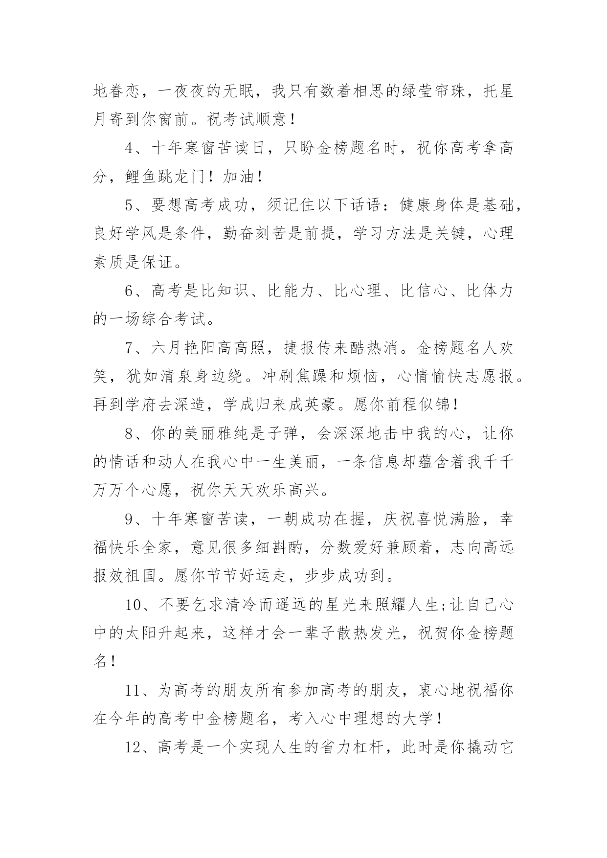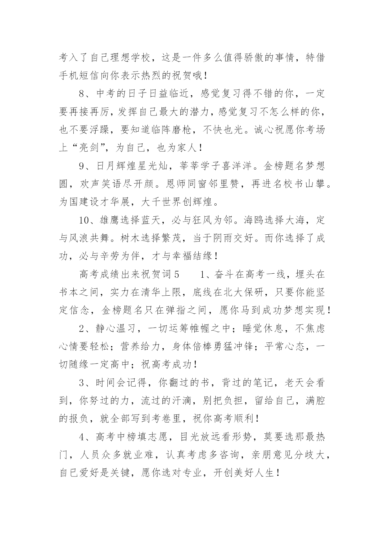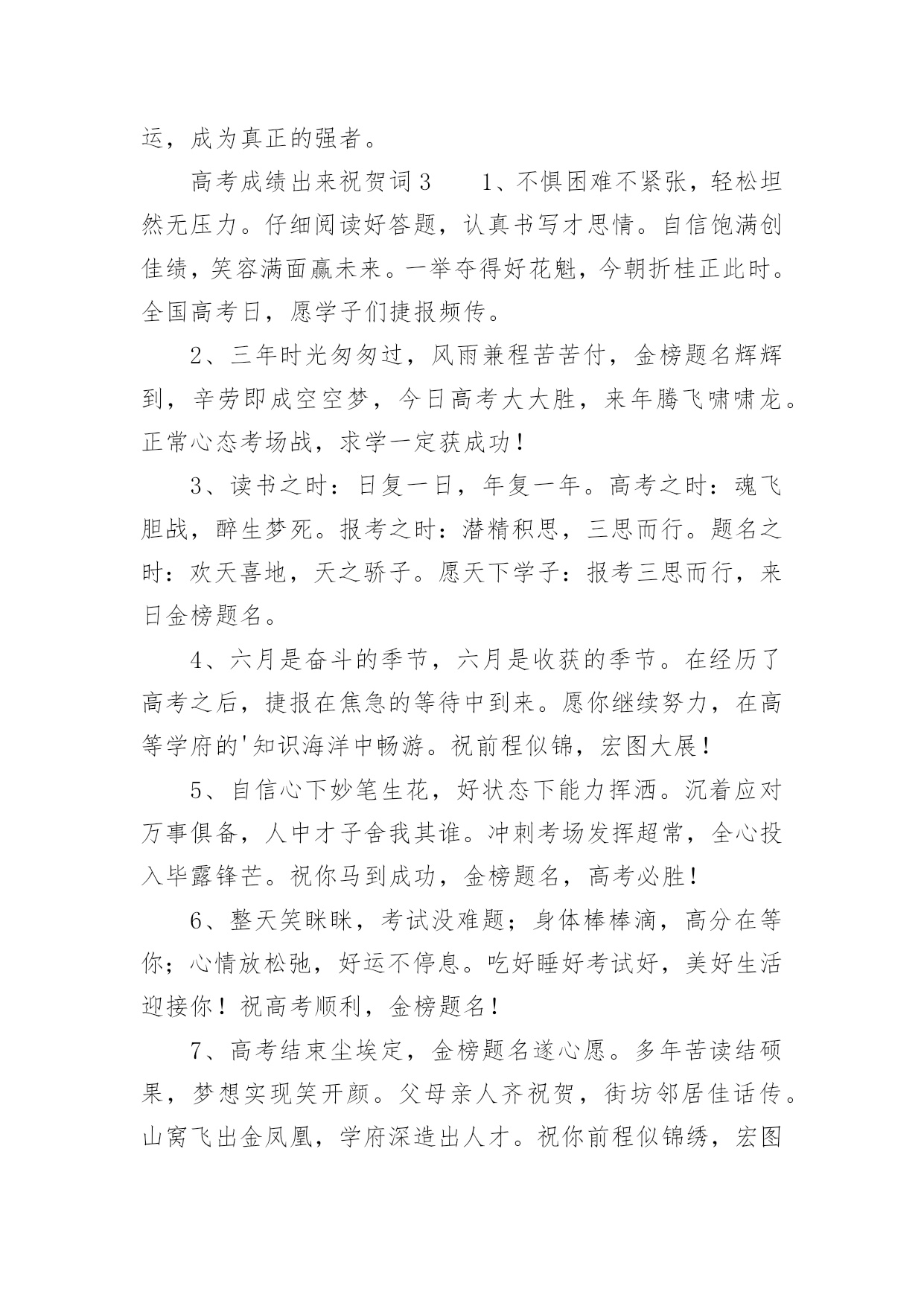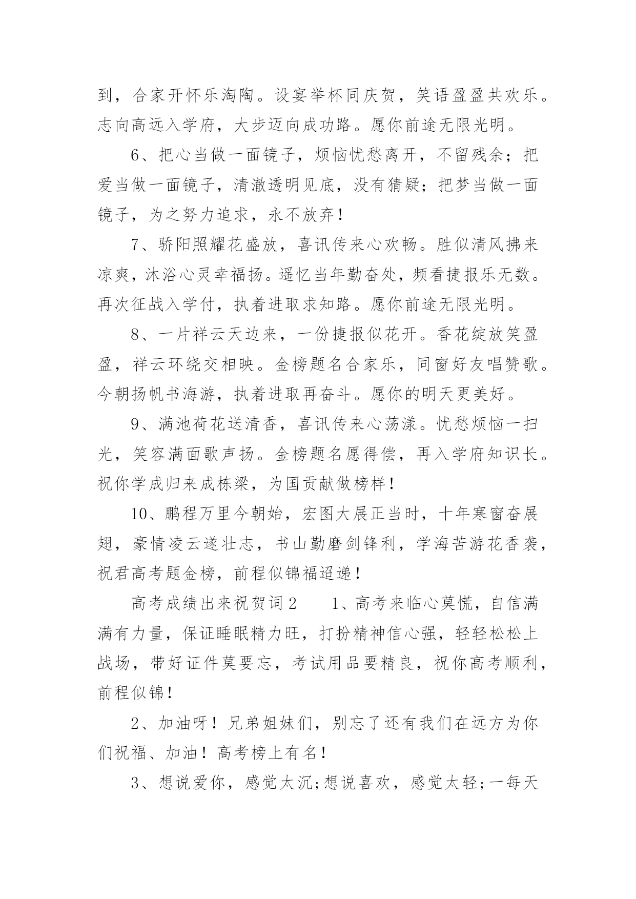 高考成绩出来祝贺词高考成绩出来祝贺词(精选70句)在学习、工作或生活中,大家都不可避免地会接触到贺词吧,贺词的篇幅可长可短,少则几个字,多则几百字甚至上千字。怎样才能写出有新意的贺词呢?以下是小编整理的高考成绩出来祝贺词(精选70句),欢迎阅读与收藏。高考成绩出来祝贺词11、天道酬勤,曾经的每一分付出,必将收到百倍回报。不管揭晓的`答案是什么,只要努力过奋斗过,就不要后悔。祝高考顺利,心想事成。高考志愿填报技巧。2、十年寒窗苦功练,十年春秋含心酸。十年梦想今实现,静心细阅挥笔杆。笔落凤飞速成章,轻松愉悦答卷完。胸有成竹上金榜,志愿清华最理想。祝你佳成绩。3、十二年苦读,十二年付出,十二年挥洒自如,十二年寒窗无数。睡个好觉,做个好梦,让信心更加充足,你一定会取得锦绣前途。高考顺利。4、生活中,我们每天都在尝试中,我们走向成功,品味失败,走过心灵的阴雨晴空。运动员们,不要放弃尝试,无论失败与否,重要的是你勇于参与的精神,付出的背后是胜利。无论是否成功,我们永远赞美你,你们永远是我们的骄傲。5、芬芳满园花枝俏,捷报传来心欢笑。如风似雨清凉到,合家开怀乐淘陶。设宴举杯同庆贺,笑语盈盈共欢乐。志向高远入学府,大步迈向成功路。愿你前途无限光明。6、把心当做一面镜子,烦恼忧愁离开,不留残余;把爱当做一面镜子,清澈透明见底,没有猜疑;把梦当做一面镜子,为之努力追求,永不放弃!7、骄阳照耀花盛放,喜讯传来心欢畅。胜似清风拂来凉爽,沐浴心灵幸福扬。遥忆当年勤奋处,频看捷报乐无数。再次征战入学付,执着进取求知路。愿你前途无限光明。8、一片祥云天边来,一份捷报似花开。香花绽放笑盈盈,祥云环绕交相映。金榜题名合家乐,同窗好友唱赞歌。今朝扬帆书海游,执着进取再奋斗。愿你的明天更美好。9、满池荷花送清香,喜讯传来心荡漾。忧愁烦恼一扫光,笑容满面歌声扬。金榜题名愿得偿,再入学府知识长。祝你学成归来成栋梁,为国贡献做榜样!10、鹏程万里今朝始,宏图大展正当时,十年寒窗奋展翅,豪情凌云遂壮志,书山勤磨剑锋利,学海苦游花香袭,祝君高考题金榜,前程似锦福迢递!高考成绩出来祝贺词21、高考来临心莫慌,自信满满有力量,保证睡眠精力旺,打扮精神信心强,轻轻松松上战场,带好证件莫要忘,考试用品要精良,祝你高考顺利,前程似锦!2、加油呀!兄弟姐妹们,别忘了还有我们在远方为你们祝福、加油!高考榜上有名!3、想说爱你,感觉太沉;想说喜欢,感觉太轻;一每天地眷恋,一夜夜的无眠,我只有数着相思的绿莹帘珠,托星月寄到你窗前。祝考试顺意!4、十年寒窗苦读日,只盼金榜题名时,祝你高考拿高分,鲤鱼跳龙门!加油!5、要想高考成功,须记住以下话语:健康身体是基础,良好学风是条件,勤奋刻苦是前提,学习方法是关键,心理素质是保证。6、高考是比知识、比能力、比心理、比信心、比体力的一场综合考试。7、六月艳阳高高照,捷报传来酷热消。金榜题名人欢笑,犹如清泉身边绕。冲刷焦躁和烦恼,心情愉快志愿报。再到学府去深造,学成归来成英豪。愿你前程似锦!8、你的美丽雅纯是子弹,会深深地击中我的心,让你的情话和动人在我心中一生美丽,一条信息却蕴含着我千千万万个心愿,祝你天天欢乐高兴。9、十年寒窗苦读,一朝成功在握,庆祝喜悦满脸,幸福快乐全家,意见很多细斟酌,分数爱好兼顾着,志向高远报效祖国。愿你节节好运走,步步成功到。10、不要乞求清冷而遥远的星光来照耀人生;让自己心中的太阳升起来,这样才会一辈子散热发光,祝贺你金榜题名!11、为高考的朋友所有参加高考的朋友,衷心地祝福你在今年的高考中金榜题名,考入心中理想的大学!12、高考是一个实现人生的省力杠杆,此时是你撬动它的最佳时机,并且以后你的人生会呈弧线上升。13、眼看高考就要来了,向前看,相信自己,付出就会有收获的!放松心情,去迎接挑战,我相信你,你一定是最出色的!祝福你高考中正常发挥,金榜题名,顺利考上自己理想的大学!加油!14、鲜花纷纷绽笑颜,捷报翩翩最灿烂。绽在心头芬芳绕,合家共同甜蜜笑。金榜题名无限好,不负十年多辛劳。继续扬帆勤钻研,书写明天新诗篇。15、一年一考年年考,高考并非华容道。人生大考多在后,全力拼搏有精彩!16、你一定想不到当我得知你考上大学的那一刻是多么的兴奋,你的刻苦努力得到了回报,你是你们全家人的骄傲和自豪,真诚地祝贺你!17、爸爸妈妈祝你高考一切顺利!超常发挥,金榜题名!一定能考上理想的大学!18、同窗几年,一直都很佩服你的`毅力,学习中,你总是那么优秀出色,想必只有你最了解自己的付出,否则也不会有今天学业上的成功,真诚地祝贺你!19、眼看高考就要来了,向前看,相信自我,付出就会有收获的!放松心境,去迎接挑战,我相信你,你必须是最出色的!祝福你高考中正常发挥,金榜题名,顺利考上自我梦想的大学!加油!20、既然选择了要走的路,就一往无前地坚持