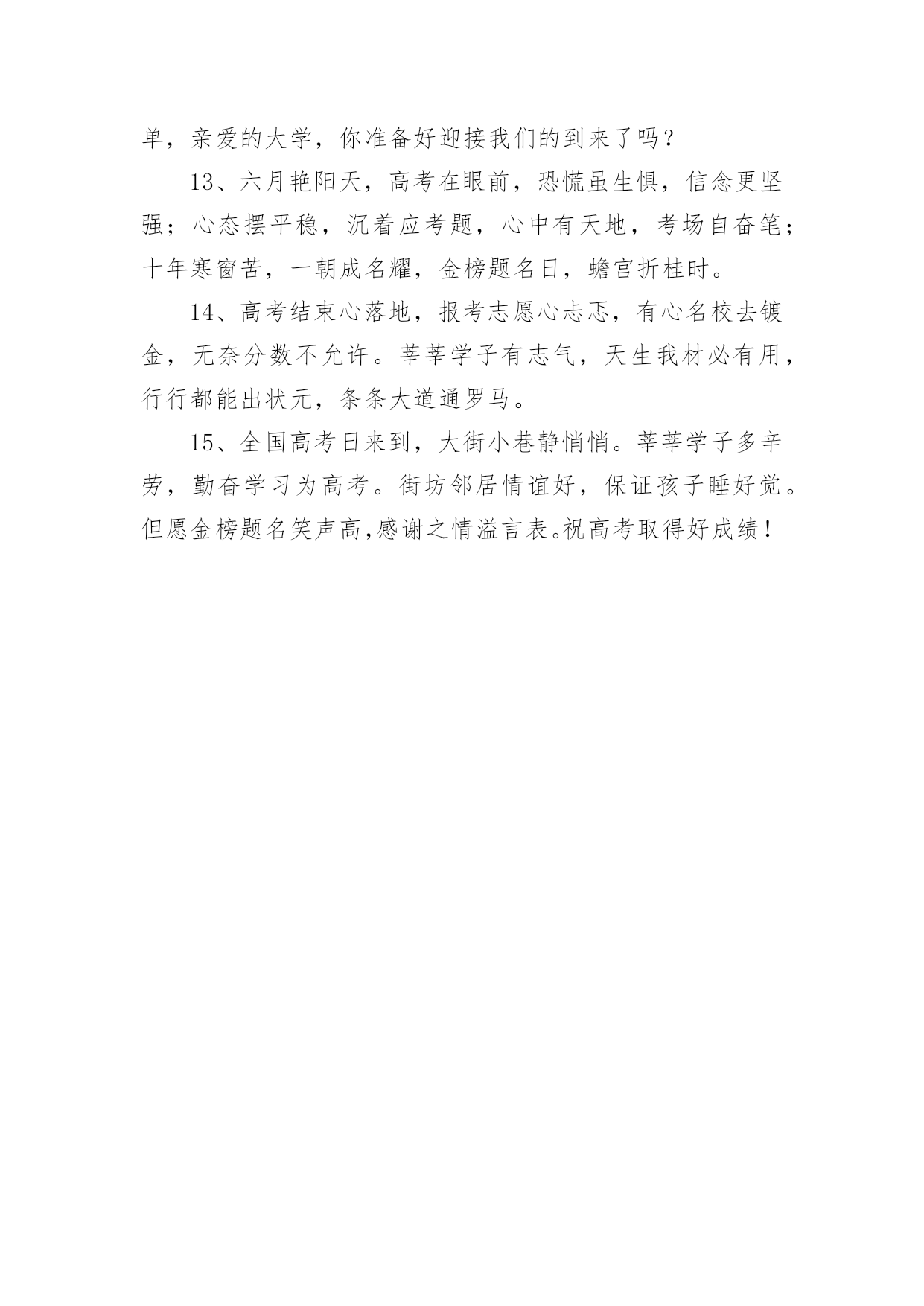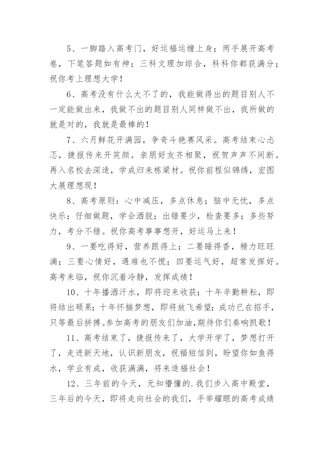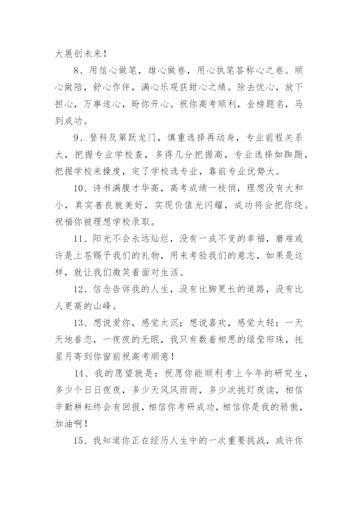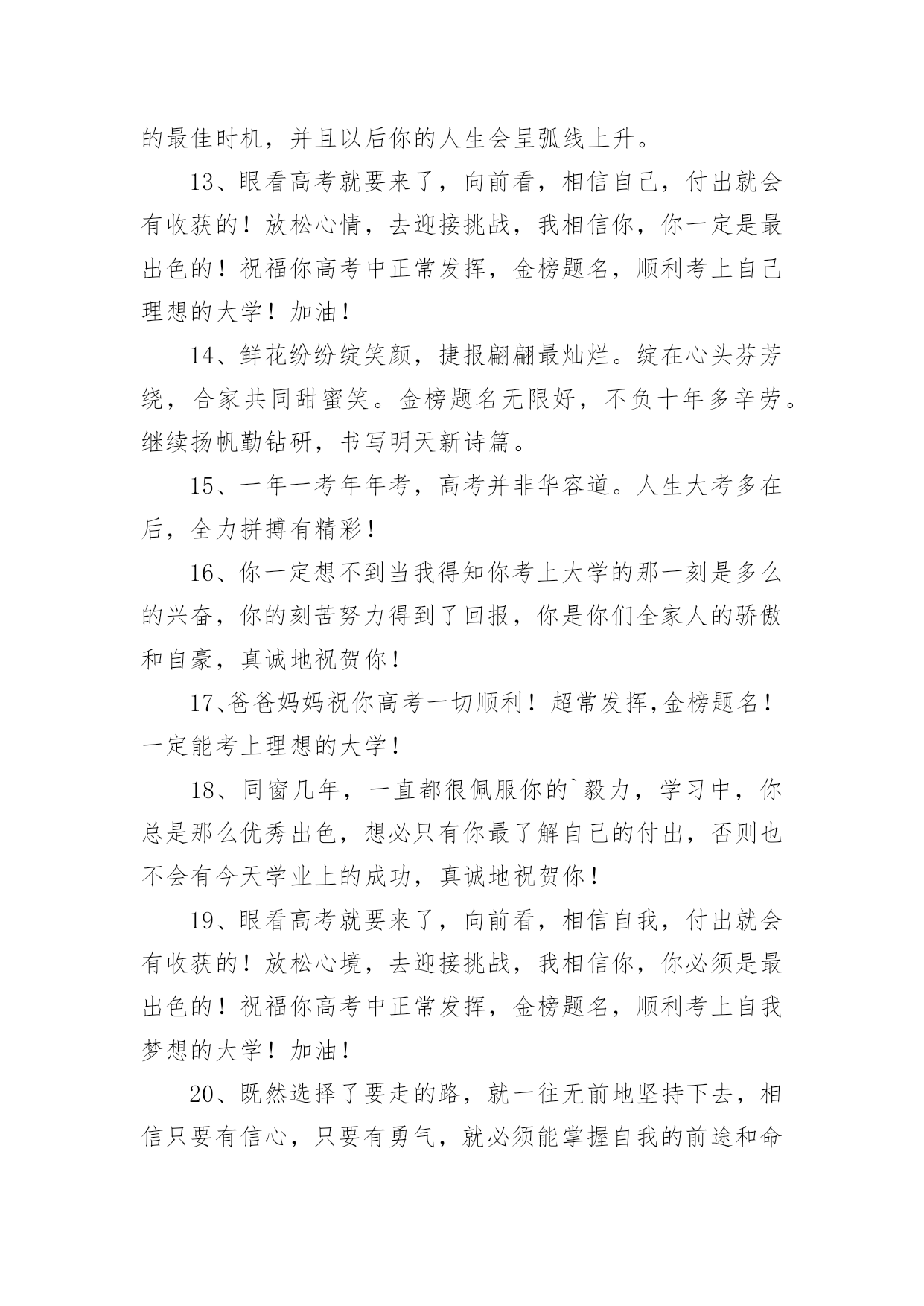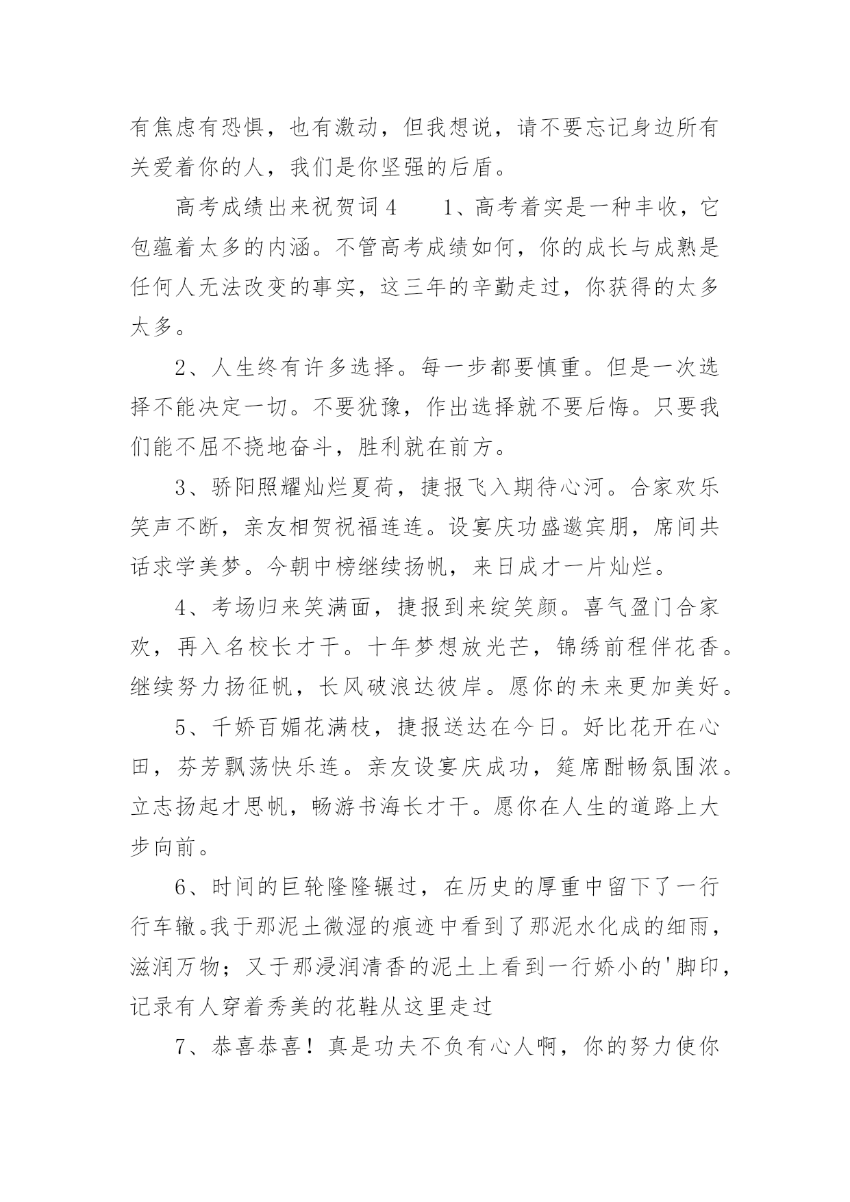 高考成绩出来祝贺词高考成绩出来祝贺词(精选70句)在学习、工作或生活中,大家都不可避免地会接触到贺词吧,贺词的篇幅可长可短,少则几个字,多则几百字甚至上千字。怎样才能写出有新意的贺词呢?以下是小编整理的高考成绩出来祝贺词(精选70句),欢迎阅读与收藏。高考成绩出来祝贺词11、天道酬勤,曾经的每一分付出,必将收到百倍回报。不管揭晓的`答案是什么,只要努力过奋斗过,就不要后悔。祝高考顺利,心想事成。高考志愿填报技巧。2、十年寒窗苦功练,十年春秋含心酸。十年梦想今实现,静心细阅挥笔杆。笔落凤飞速成章,轻松愉悦答卷完。胸有成竹上金榜,志愿清华最理想。祝你佳成绩。3、十二年苦读,十二年付出,十二年挥洒自如,十二年寒窗无数。睡个好觉,做个好梦,让信心更加充足,你一定会取得锦绣前途。高考顺利。4、生活中,我们每天都在尝试中,我们走向成功,品味失败,走过心灵的阴雨晴空。运动员们,不要放弃尝试,无论失败与否,重要的是你勇于参与的精神,付出的背后是胜利。无论是否成功,我们永远赞美你,你们永远是我们的骄傲。5、芬芳满园花枝俏,捷报传来心欢笑。如风似雨清凉到,合家开怀乐淘陶。设宴举杯同庆贺,笑语盈盈共欢乐。志向高远入学府,大步迈向成功路。愿你前途无限光明。6、把心当做一面镜子,烦恼忧愁离开,不留残余;把爱当做一面镜子,清澈透明见底,没有猜疑;把梦当做一面镜子,为之努力追求,永不放弃!7、骄阳照耀花盛放,喜讯传来心欢畅。胜似清风拂来凉爽,沐浴心灵幸福扬。遥忆当年勤奋处,频看捷报乐无数。再次征战入学付,执着进取求知路。愿你前途无限光明。8、一片祥云天边来,一份捷报似花开。香花绽放笑盈盈,祥云环绕交相映。金榜题名合家乐,同窗好友唱赞歌。今朝扬帆书海游,执着进取再奋斗。愿你的明天更美好。9、满池荷花送清香,喜讯传来心荡漾。忧愁烦恼一扫光,笑容满面歌声扬。金榜题名愿得偿,再入学府知识长。祝你学成归来成栋梁,为国贡献做榜样!10、鹏程万里今朝始,宏图大展正当时,十年寒窗奋展翅,豪情凌云遂壮志,书山勤磨剑锋利,学海苦游花香袭,祝君高考题金榜,前程似锦福迢递!高考成绩出来祝贺词21、高考来临心莫慌,自信满满有力量,保证睡眠精力旺,打扮精神信心强,轻轻松松上战场,带好证件莫要忘,考试用品要精良,祝你高考顺利,前程似锦!2、加油呀!兄弟姐妹们,别忘了还有我们在远方为你们祝福、加油!高考榜上有名!3、想说爱你,感觉太沉;想说喜欢,感觉太轻;一每天地眷恋,一夜夜的无眠,我只有数着相思的绿莹帘珠,托星月寄到你窗前。祝考试顺意!4、十年寒窗苦读日,只盼金榜题名时,祝你高考拿高分,鲤鱼跳龙门!加油!5、要想高考成功,须记住以下话语:健康身体是基础,良好学风是条件,勤奋刻苦是前提,学习方法是关键,心理素质是保证。6、高考是比知识、比能力、比心理、比信心、比体力的一场综合考试。7、六月艳阳高高照,捷报传来酷热消。金榜题名人欢笑,犹如清泉身边绕。冲刷焦躁和烦恼,心情愉快志愿报。再到学府去深造,学成归来成英豪。愿你前程似锦!8、你的美丽雅纯是子弹,会深深地击中我的心,让你的情话和动人在我心中一生美丽,一条信息却蕴含着我千千万万个心愿,祝你天天欢乐高兴。9、十年寒窗苦读,一朝成功在握,庆祝喜悦满脸,幸福快乐全家,意见很多细斟酌,分数爱好兼顾着,志向高远报效祖国。愿你节节好运走,步步成功到。10、不要乞求清冷而遥远的星光来照耀人生;让自己心中的太阳升起来,这样才会一辈子散热发光,祝贺你金榜题名!11、为高考的朋友所有参加高考的朋友,衷心地祝福你在今年的高考中金榜题名,考入心中理想的大学!12、高考是一个实现人生的省力杠杆,此时是你撬动它的最佳时机,并且以后你的人生会呈弧线上升。13、眼看高考就要来了,向前看,相信自己,付出就会有收获的!放松心情,去迎接挑战,我相信你,你一定是最出色的!祝福你高考中正常发挥,金榜题名,顺利考上自己理想的大学!加油!14、鲜花纷纷绽笑颜,捷报翩翩最灿烂。绽在心头芬芳绕,合家共同甜蜜笑。金榜题名无限好,不负十年多辛劳。继续扬帆勤钻研,书写明天新诗篇。15、一年一考年年考,高考并非华容道。人生大考多在后,全力拼搏有精彩!16、你一定想不到当我得知你考上大学的那一刻是多么的兴奋,你的刻苦努力得到了回报,你是你们全家人的骄傲和自豪,真诚地祝贺你!17、爸爸妈妈祝你高考一切顺利!超常发挥,金榜题名!一定能考上理想的大学!18、同窗几年,一直都很佩服你的`毅力,学习中,你总是那么优秀出色,想必只有你最了解自己的付出,否则也不会有今天学业上的成功,真诚地祝贺你!19、眼看高考就要来了,向前看,相信自我,付出就会有收获的!放松心境,去迎接挑战,我相信你,你必须是最出色的!祝福你高考中正常发挥,金榜题名,顺利考上自我梦想的大学!加油!20、既然选择了要走的路,就一往无前地坚持
