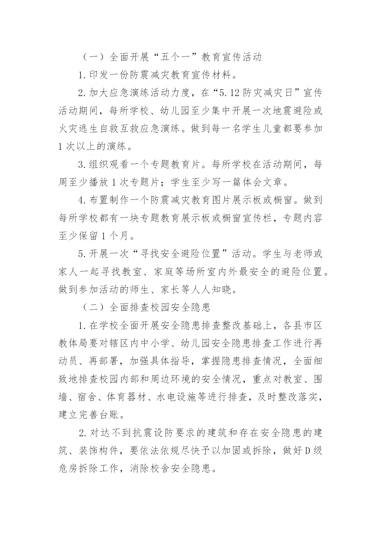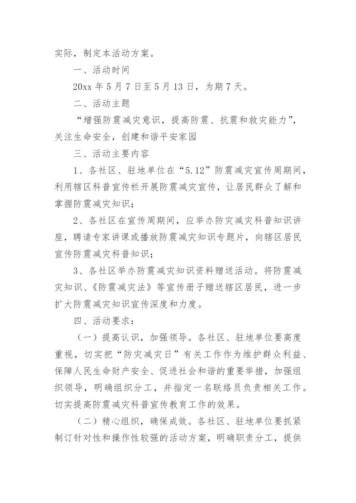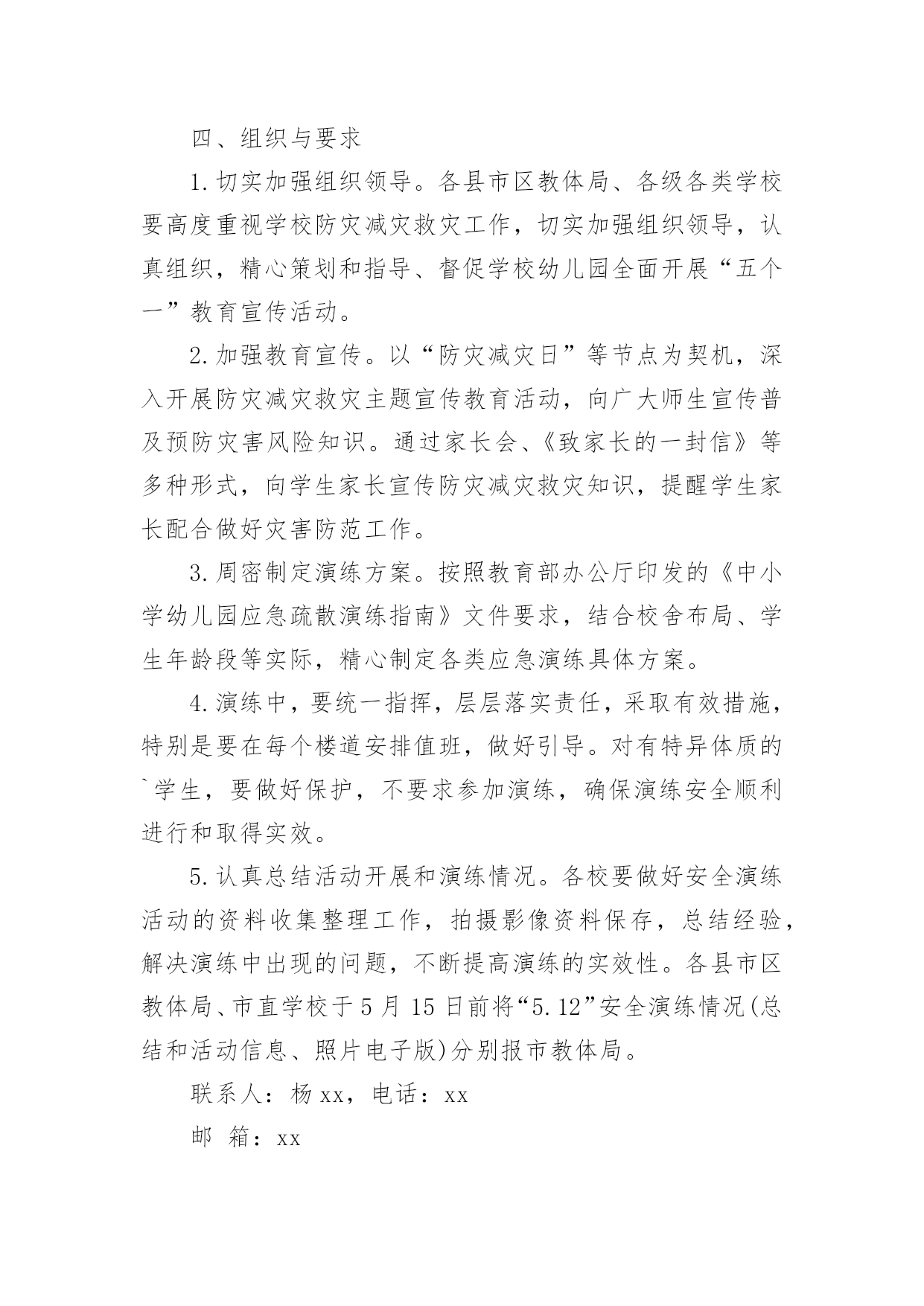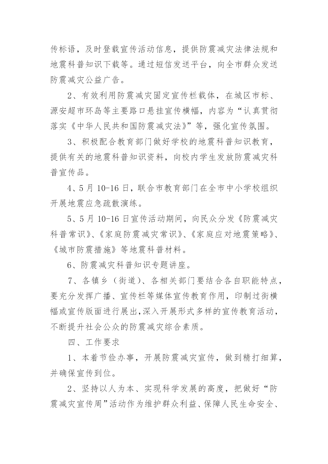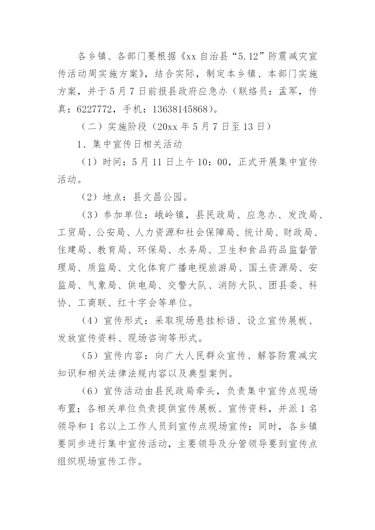 防震减灾宣传的活动方案防震减灾宣传的活动方案为了确保事情或工作有序有力开展,常常需要提前制定一份优秀的方案,方案是从目的、要求、方式、方法、进度等方面进行安排的书面计划。方案要怎么制定呢?下面是小编精心整理的防震减灾宣传的活动方案,仅供参考,希望能够帮助到大家。防震减灾宣传的活动方案1各县、市区教体局、市直学校:今年5月12日是我国第9个“防灾减灾日”。为进一步深入宣传地震科普知识,增强广大师生的防震减灾意识,提高自救互救能力,按照省、市有关要求和年初工作安排,决定在全市中小学幼儿园继续组织开展以地震、防火等为内容的“防震减灾”专题教育宣传月暨“5.12”安全演练活动。现将有关事项通知如下:一、活动时间20xx年5月12日前后,具体时间由各校自定。二、参与对象全市中小学幼儿园全体师生。寄宿制学校以消防演练为主,非寄宿制学校以地震演练为主。三、内容和形式(一)全面开展“五个一”教育宣传活动1.印发一份防震减灾教育宣传材料。2.加大应急演练活动力度,在“5.12防灾减灾日”宣传活动期间,每所学校、幼儿园至少集中开展一次地震避险或火灾逃生自救互救应急演练。做到每一名学生儿童都要参加1次以上的演练。3.组织观看一个专题教育片。每所学校在活动期间,每周至少播放1次专题片;学生至少写一篇体会文章。4.布置制作一个防震减灾教育图片展示板或橱窗。做到每所学校都有一块专题教育展示板或橱窗宣传栏,专题内容至少保留1个月。5.开展一次“寻找安全避险位置”活动。学生与老师或家人一起寻找教室、家庭等场所室内外最安全的避险位置。做到参加活动的师生、家长等人人知晓。(二)全面排查校园安全隐患1.在学校全面开展安全隐患排查整改基础上,各县市区教体局要对辖区内中小学、幼儿园安全隐患排查工作进行再动员、再部署,加强具体指导,掌握隐患排查情况,全面细致地排查校园内部和周边环境的安全情况,重点对教室、围墙、宿舍、体育器材、水电设施等进行排查,及时整改落实,建立完善台账。2.对达不到抗震设防要求的建筑和存在安全隐患的建筑、装饰构件,要依法依规尽快予以加固或拆除,做好D级危房拆除工作,消除校舍安全隐患。四、组织与要求1.切实加强组织领导。各县市区教体局、各级各类学校要高度重视学校防灾减灾救灾工作,切实加强组织领导,认真组织,精心策划和指导、督促学校幼儿园全面开展“五个一”教育宣传活动。2.加强教育宣传。以“防灾减灾日”等节点为契机,深入开展防灾减灾救灾主题宣传教育活动,向广大师生宣传普及预防灾害风险知识。通过家长会、《致家长的一封信》等多种形式,向学生家长宣传防灾减灾救灾知识,提醒学生家长配合做好灾害防范工作。3.周密制定演练方案。按照教育部办公厅印发的《中小学幼儿园应急疏散演练指南》文件要求,结合校舍布局、学生年龄段等实际,精心制定各类应急演练具体方案。4.演练中,要统一指挥,层层落实责任,采取有效措施,特别是要在每个楼道安排值班,做好引导。对有特异体质的`学生,要做好保护,不要求参加演练,确保演练安全顺利进行和取得实效。5.认真总结活动开展和演练情况。各校要做好安全演练活动的资料收集整理工作,拍摄影像资料保存,总结经验,解决演练中出现的问题,不断提高演练的实效性。各县市区教体局、市直学校于5月15日前将“5.12”安全演练情况(总结和活动信息、照片电子版)分别报市教体局。联系人:杨xx,电话:xx邮箱:xx防震减灾宣传的活动方案2今年5月12日是我国第xx个“防灾减灾日”,按照《贵州省防震减灾条例》相关要求,结合《铜仁市防震减灾宣传活动周实施方案》和我县防震减灾工作实际,制定本实施方案。一、指导思想以邓小平理论和“三个代表”重要思想为指导,以科学发展观为统领,以普及防震减灾知识为主要内容,积极组织开展形式多样、内容丰富的防震减灾宣传活动,普及推广全民防震减灾知识和避灾自救技能,进一步增强全社会防震减灾意识,提高全县综合减灾能力,最大限度地减轻自然灾害造成的损失,营造全社会共同关心和参与防震减灾工作的良好氛围。二、活动时间20xx年5月7日至13日。三、活动主题防震减灾,有备无患。xx、宣传内容(一)宣传《中华人民共和国防震减灾法》、《贵州省防震减灾条例》等法律法规;(二)宣传防震减灾的基本知识和自救互救技能;(三)宣传应对地震突发事件处置方法、措施等。五、活动安排(一)准备阶段(20xx年5月7日前)各乡镇、各部门要根据《xx自治县“5.12”防震减灾宣传活动周实施方案》,结合实际,制定本乡镇、本部门实施方案,并于5月7日前报县政府应急办(联络员:孟军,传真:6227772,手机:13638145868)。(二)实施阶段(20xx年5月7日至13日)1、集中宣传日相关活动(1)时间:5月11日上午10:00,正式开展集中宣传活动。(2)地点:县文昌公园。(3)参