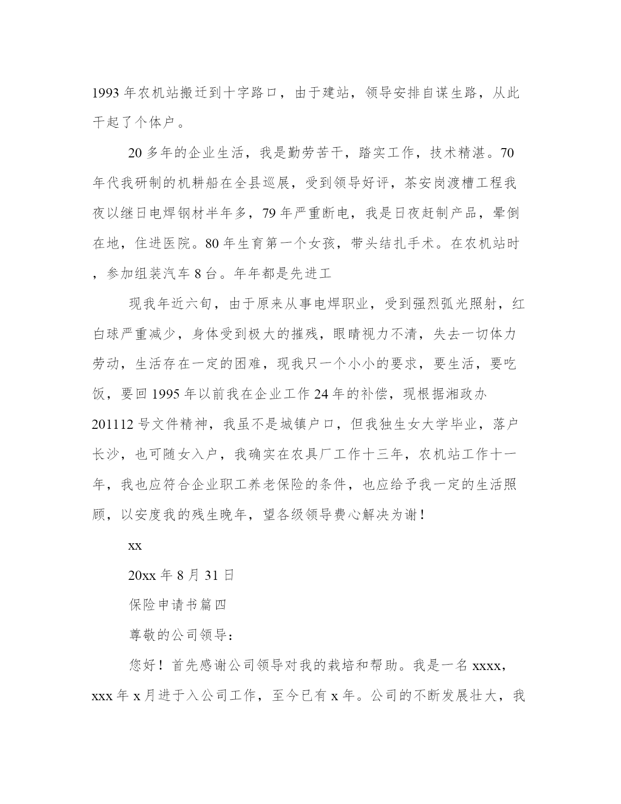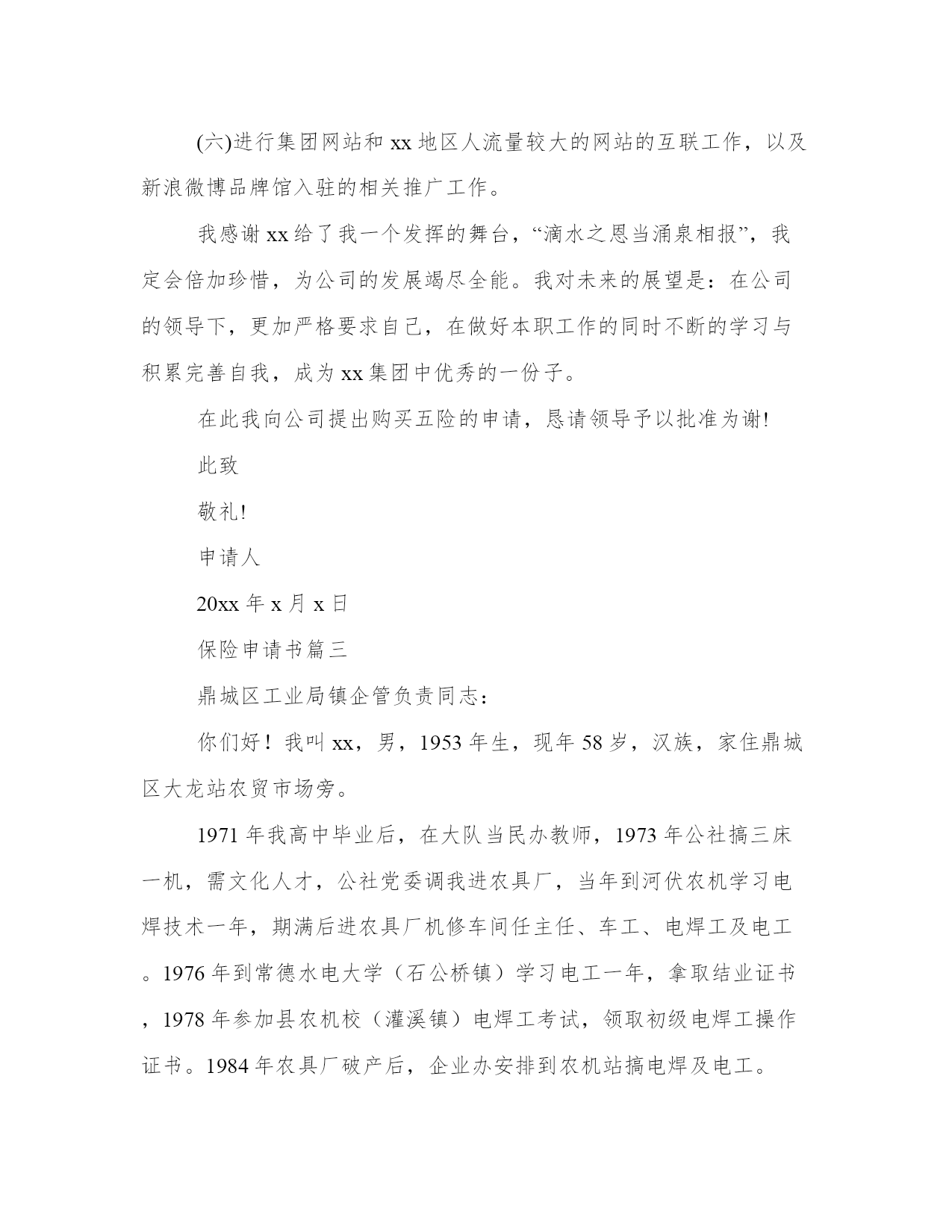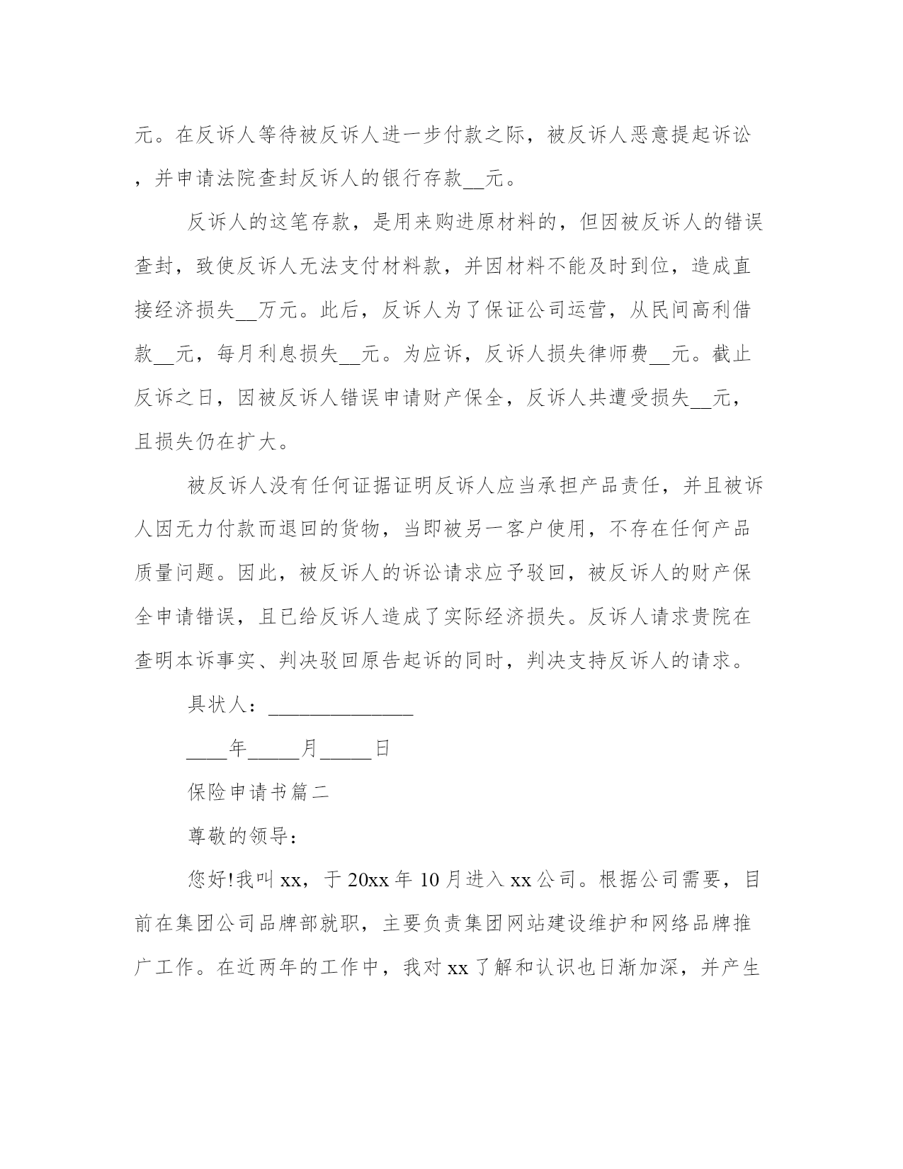 保险申请书(模板9篇)无论是身处学校还是步入社会,大家都尝试过写作吧,借助写作也可以提高我们的语言组织能力。写范文的时候需要注意什么呢?有哪些格式需要注意呢?这里我整理了一些优秀的范文,希望对大家有所帮助,下面我们就来了解一下吧。保险申请书篇一地址:______________法定代表人:______________委托代理人:______________被反诉人(本诉原告):______________地址:______________法定代表人:______________反诉请求:______________1、判令被反诉人赔偿损失元(暂计至起诉之日,后续损失将按实际追加请求);2、反诉诉讼费用由被告承担。事实和理由:反诉人向被反诉人出售__产品,被反诉人陆续收货付款。后因被反诉人无力付款,将未用完的产品退回反诉人,并承诺尽快付清欠付货款。此后,被反诉人于20__年月日付款__元,于20__年月日付款__元。在反诉人等待被反诉人进一步付款之际,被反诉人恶意提起诉讼,并申请法院查封反诉人的银行存款__元。反诉人的这笔存款,是用来购进原材料的,但因被反诉人的错误查封,致使反诉人无法支付材料款,并因材料不能及时到位,造成直接经济损失__万元。此后,反诉人为了保证公司运营,从民间高利借款__元,每月利息损失__元。为应诉,反诉人损失律师费__元。截止反诉之日,因被反诉人错误申请财产保全,反诉人共遭受损失__元,且损失仍在扩大。被反诉人没有任何证据证明反诉人应当承担产品责任,并且被诉人因无力付款而退回的货物,当即被另一客户使用,不存在任何产品质量问题。因此,被反诉人的诉讼请求应予驳回,被反诉人的财产保全申请错误,且已给反诉人造成了实际经济损失。反诉人请求贵院在查明本诉事实、判决驳回原告起诉的同时,判决支持反诉人的请求。具状人:__________________年_____月_____日保险申请书篇二尊敬的领导:您好!我叫xx,于20xx年10月进入xx公司。根据公司需要,目前在集团公司品牌部就职,主要负责集团网站建设维护和网络品牌推广工作。在近两年的工作中,我对xx了解和认识也日渐加深,并产生了很深的情感,决定长期与xx共同成长、共同进步、共创辉煌。入职xx后我主要完成的工作简要总结如下:(一)优化集团公司网络系统。一年前,集团公司网络由于资源和管理问题,造成网络使用率底下并且严重影响工作的网络安全隐患,并多次受到网络黑客攻击。在上报领导后对部分硬件升级、上网功能流量的限制和集团计算机ip归档等进行处理,解决了此问题,最大程度保证了集团公司现有网络资源的利用率和安全性。(二)建立企业内网平台。信息化办公是现代化企业实现高效、无纸办公的基础,也是企业资源高效利用的平台。在集团领导的支持下,组建了企业内部信息交流、资料收集、图片视频统一展示、满足办事功能的企业内部资源平台。至今已经收集了大量的集团各类图片、视频、音频信息7千余条;收集集团业务所需的软件程序收集近50个;收集相关文字资讯300余条。对企业文化建设和资源有效利用和集中展示都起到一定作用。(三)制作了大理xx期刊电子版本。将实物书刊转换成网络电子文本,可以让更多的人阅读到xx,了解和认识xx,也是企业进行网络品牌推广的一部分。(五)集团网站的更新重建。对网站进行风格修改和提升,从页面上大方直观的展示企业,使其成为企业品牌的一张漂亮的网络名片。拓宽与目标客户进行有效沟通的渠道,跟踪客户对品牌的认知。(六)进行集团网站和xx地区人流量较大的网站的互联工作,以及新浪微博品牌馆入驻的相关推广工作。我感谢xx给了我一个发挥的舞台,“滴水之恩当涌泉相报”,我定会倍加珍惜,为公司的发展竭尽全能。我对未来的展望是:在公司的领导下,更加严格要求自己,在做好本职工作的同时不断的学习与积累完善自我,成为xx集团中优秀的一份子。在此我向公司提出购买五险的申请,恳请领导予以批准为谢!此致敬礼!申请人20xx年x月x日保险申请书篇三鼎城区工业局镇企管负责同志:你们好!我叫xx,男,1953年生,现年58岁,汉族,家住鼎城区大龙站农贸市场旁。1971年我高中毕业后,在大队当民办教师,1973年公社搞三床一机,需文化人才,公社党委调我进农具厂,当年到河伏农机学习电焊技术一年,期满后进农具厂机修车间任主任、车工、电焊工及电工。1976年到常德水电大学(石公桥镇)学习电工一年,拿取结业证书,1978年参加县农机校(灌溪镇)电焊工考试,领取初级电焊工操作证书。1984年农具厂破产后,企业办安排到农机站搞电焊及电工。1993年农机站搬迁到十字路口,由于建站,领导安排自谋生路,从此干起了个体户。20多年的企业生活,我是勤劳苦干,踏实工作,技
