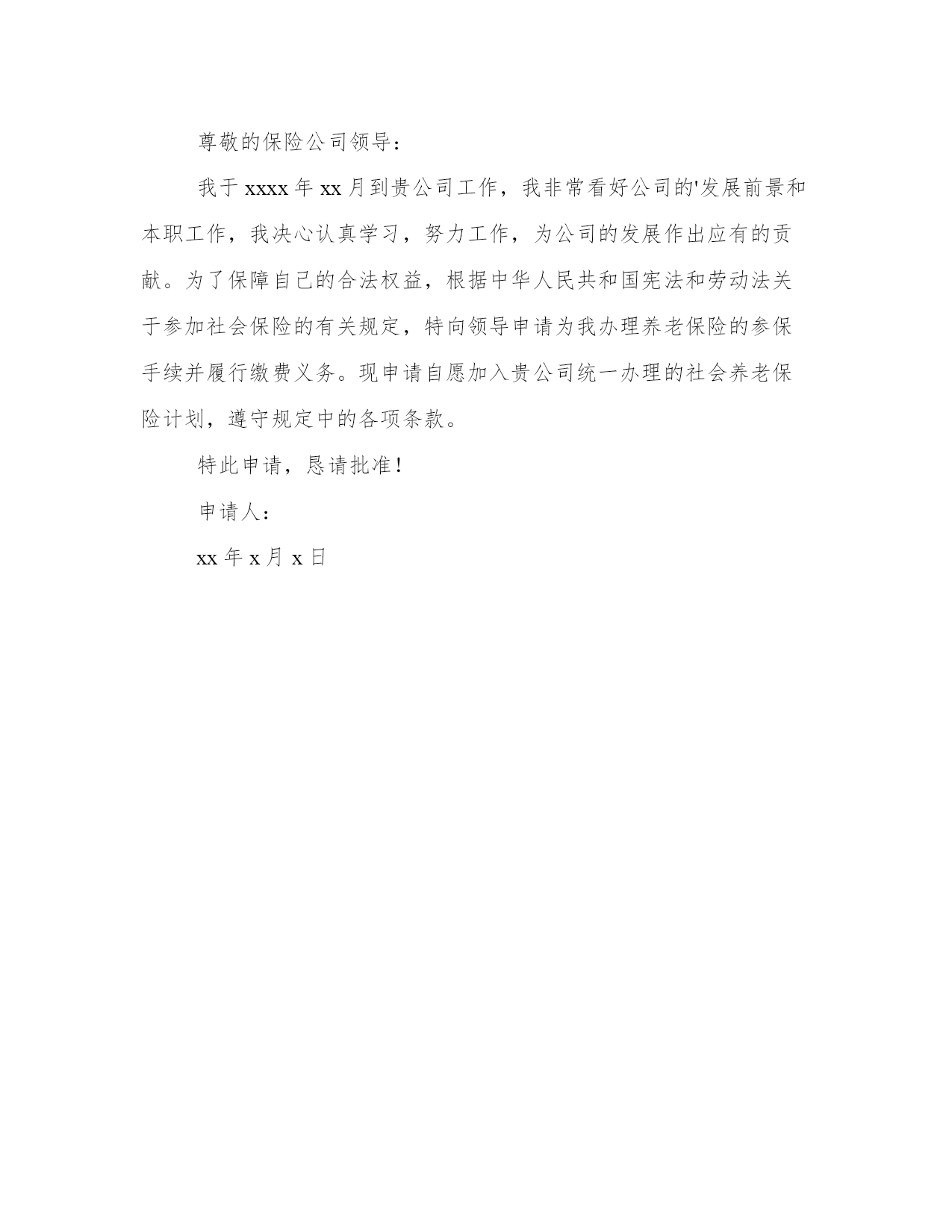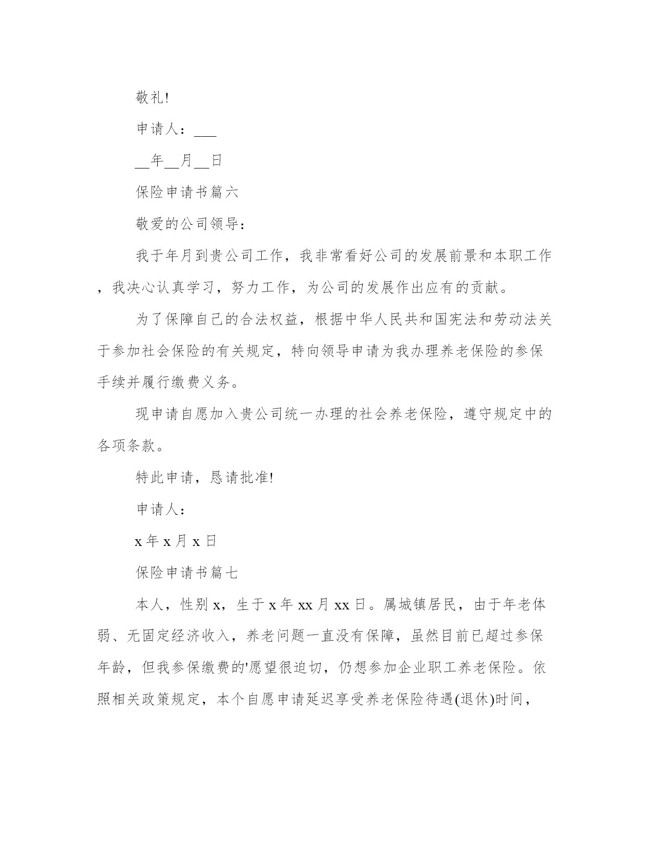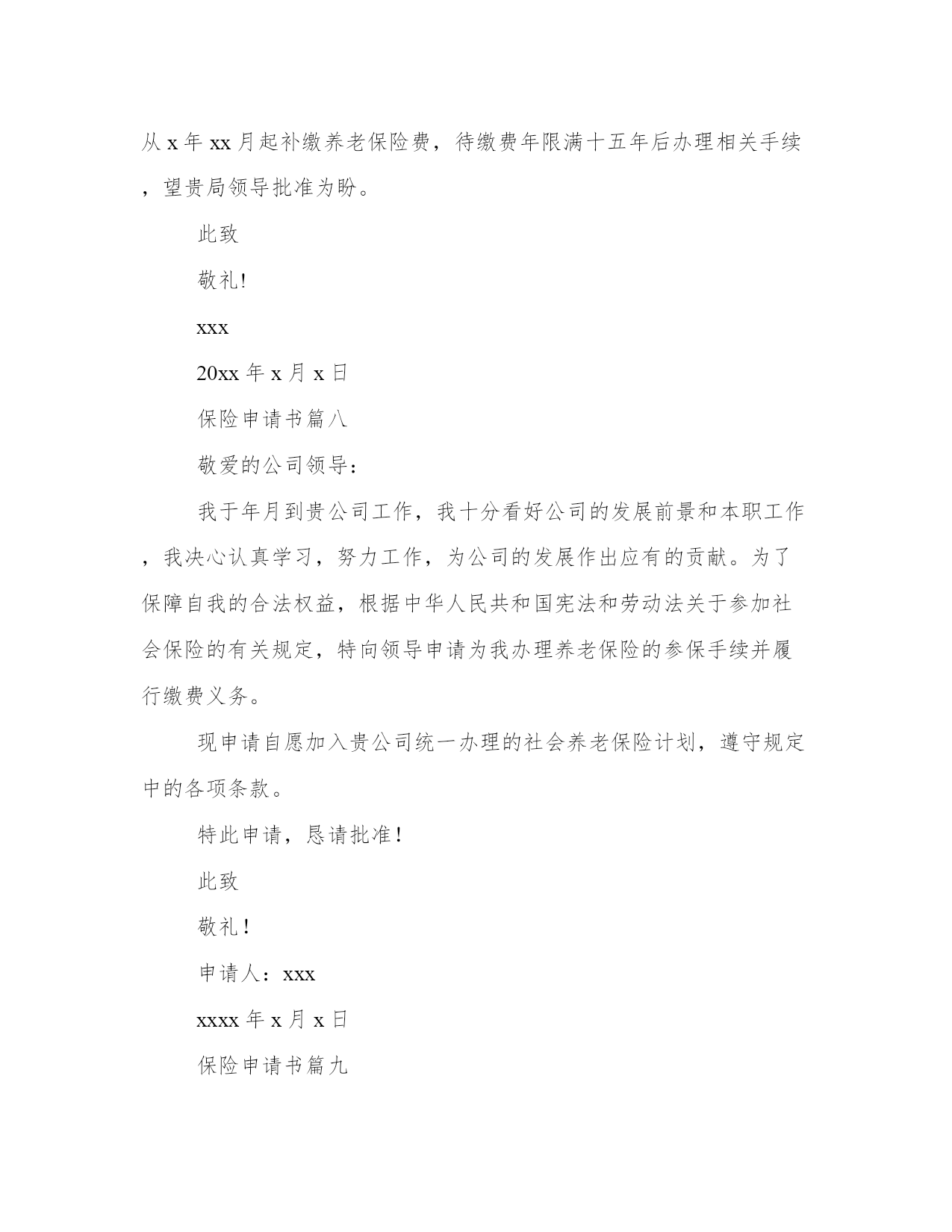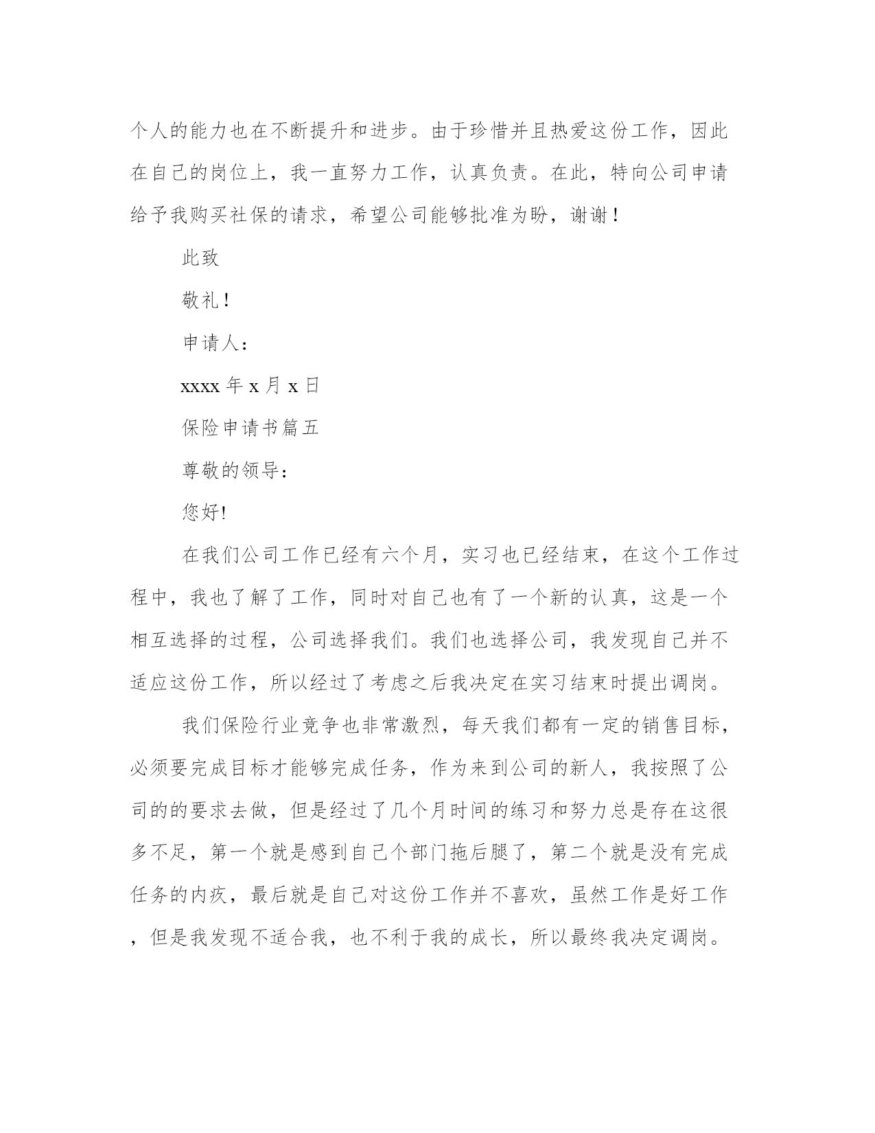 保险申请书(模板9篇)无论是身处学校还是步入社会,大家都尝试过写作吧,借助写作也可以提高我们的语言组织能力。写范文的时候需要注意什么呢?有哪些格式需要注意呢?这里我整理了一些优秀的范文,希望对大家有所帮助,下面我们就来了解一下吧。保险申请书篇一地址:______________法定代表人:______________委托代理人:______________被反诉人(本诉原告):______________地址:______________法定代表人:______________反诉请求:______________1、判令被反诉人赔偿损失元(暂计至起诉之日,后续损失将按实际追加请求);2、反诉诉讼费用由被告承担。事实和理由:反诉人向被反诉人出售__产品,被反诉人陆续收货付款。后因被反诉人无力付款,将未用完的产品退回反诉人,并承诺尽快付清欠付货款。此后,被反诉人于20__年月日付款__元,于20__年月日付款__元。在反诉人等待被反诉人进一步付款之际,被反诉人恶意提起诉讼,并申请法院查封反诉人的银行存款__元。反诉人的这笔存款,是用来购进原材料的,但因被反诉人的错误查封,致使反诉人无法支付材料款,并因材料不能及时到位,造成直接经济损失__万元。此后,反诉人为了保证公司运营,从民间高利借款__元,每月利息损失__元。为应诉,反诉人损失律师费__元。截止反诉之日,因被反诉人错误申请财产保全,反诉人共遭受损失__元,且损失仍在扩大。被反诉人没有任何证据证明反诉人应当承担产品责任,并且被诉人因无力付款而退回的货物,当即被另一客户使用,不存在任何产品质量问题。因此,被反诉人的诉讼请求应予驳回,被反诉人的财产保全申请错误,且已给反诉人造成了实际经济损失。反诉人请求贵院在查明本诉事实、判决驳回原告起诉的同时,判决支持反诉人的请求。具状人:__________________年_____月_____日保险申请书篇二尊敬的领导:您好!我叫xx,于20xx年10月进入xx公司。根据公司需要,目前在集团公司品牌部就职,主要负责集团网站建设维护和网络品牌推广工作。在近两年的工作中,我对xx了解和认识也日渐加深,并产生了很深的情感,决定长期与xx共同成长、共同进步、共创辉煌。入职xx后我主要完成的工作简要总结如下:(一)优化集团公司网络系统。一年前,集团公司网络由于资源和管理问题,造成网络使用率底下并且严重影响工作的网络安全隐患,并多次受到网络黑客攻击。在上报领导后对部分硬件升级、上网功能流量的限制和集团计算机ip归档等进行处理,解决了此问题,最大程度保证了集团公司现有网络资源的利用率和安全性。(二)建立企业内网平台。信息化办公是现代化企业实现高效、无纸办公的基础,也是企业资源高效利用的平台。在集团领导的支持下,组建了企业内部信息交流、资料收集、图片视频统一展示、满足办事功能的企业内部资源平台。至今已经收集了大量的集团各类图片、视频、音频信息7千余条;收集集团业务所需的软件程序收集近50个;收集相关文字资讯300余条。对企业文化建设和资源有效利用和集中展示都起到一定作用。(三)制作了大理xx期刊电子版本。将实物书刊转换成网络电子文本,可以让更多的人阅读到xx,了解和认识xx,也是企业进行网络品牌推广的一部分。(五)集团网站的更新重建。对网站进行风格修改和提升,从页面上大方直观的展示企业,使其成为企业品牌的一张漂亮的网络名片。拓宽与目标客户进行有效沟通的渠道,跟踪客户对品牌的认知。(六)进行集团网站和xx地区人流量较大的网站的互联工作,以及新浪微博品牌馆入驻的相关推广工作。我感谢xx给了我一个发挥的舞台,“滴水之恩当涌泉相报”,我定会倍加珍惜,为公司的发展竭尽全能。我对未来的展望是:在公司的领导下,更加严格要求自己,在做好本职工作的同时不断的学习与积累完善自我,成为xx集团中优秀的一份子。在此我向公司提出购买五险的申请,恳请领导予以批准为谢!此致敬礼!申请人20xx年x月x日保险申请书篇三鼎城区工业局镇企管负责同志:你们好!我叫xx,男,1953年生,现年58岁,汉族,家住鼎城区大龙站农贸市场旁。1971年我高中毕业后,在大队当民办教师,1973年公社搞三床一机,需文化人才,公社党委调我进农具厂,当年到河伏农机学习电焊技术一年,期满后进农具厂机修车间任主任、车工、电焊工及电工。1976年到常德水电大学(石公桥镇)学习电工一年,拿取结业证书,1978年参加县农机校(灌溪镇)电焊工考试,领取初级电焊工操作证书。1984年农具厂破产后,企业办安排到农机站搞电焊及电工。1993年农机站搬迁到十字路口,由于建站,领导安排自谋生路,从此干起了个体户。20多年的企业生活,我是勤劳苦干,踏实工作,技