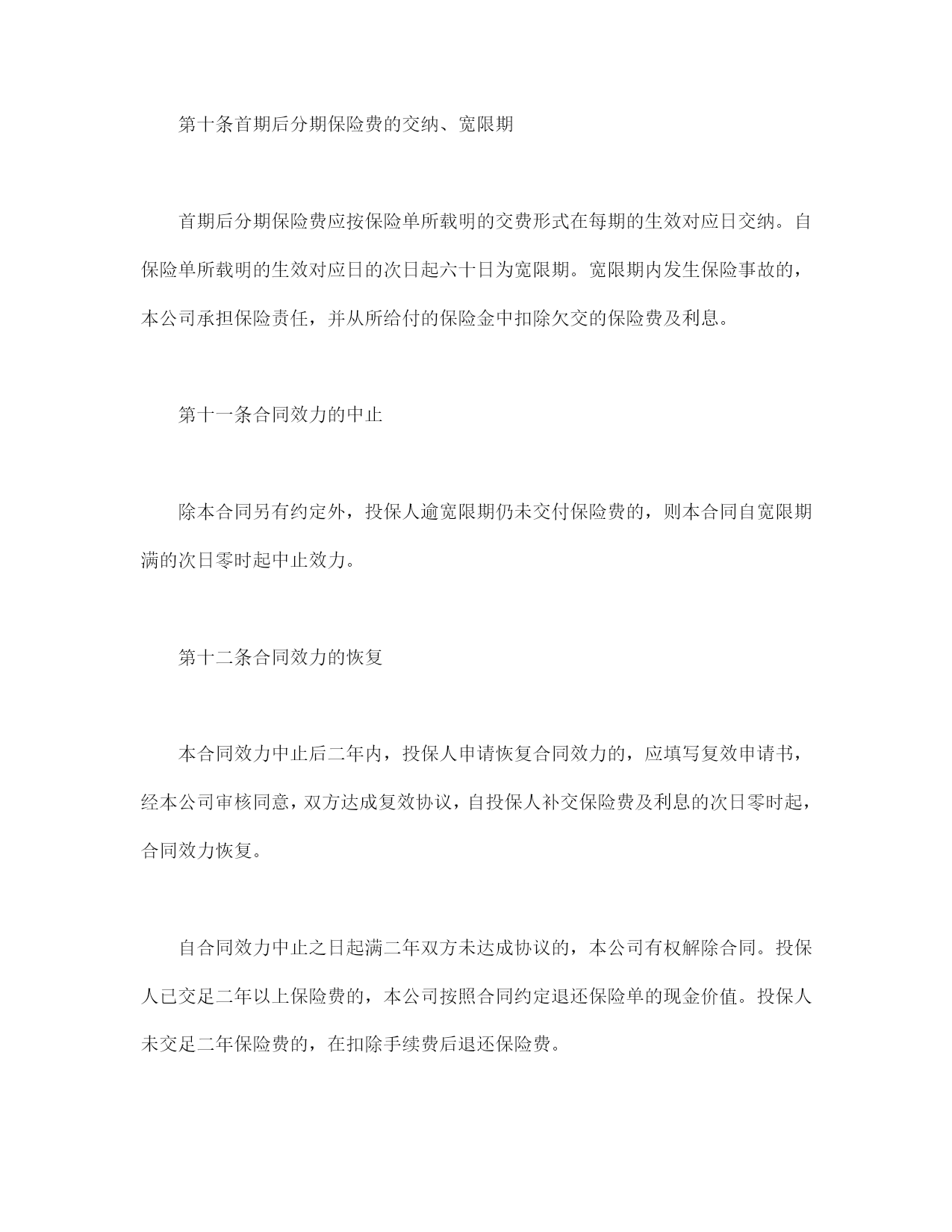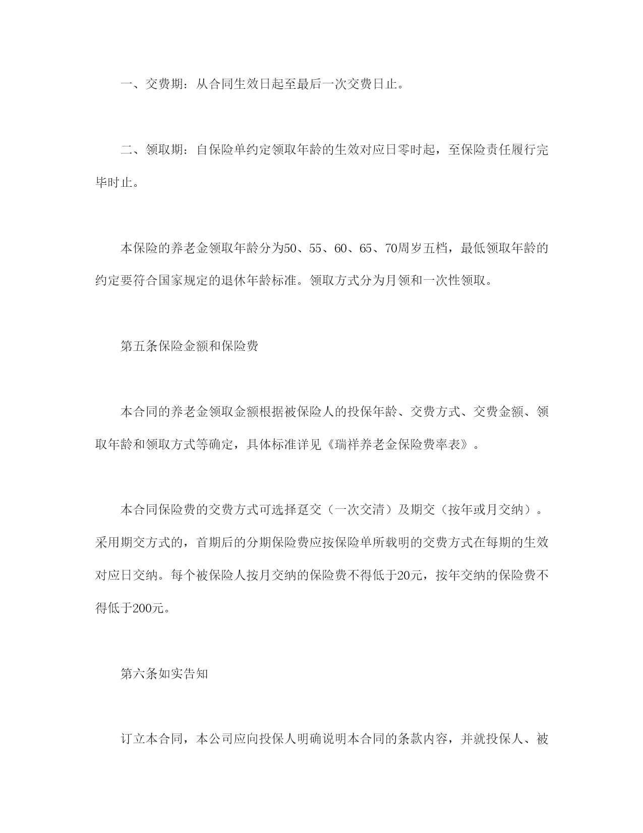 养老金保险条款第一条保险合同的构成本保险合同(以下简称“本合同”)由保险单或其它保险凭证及所附条款、投保单、与本合同有关的其它投保文件、声明、批注、复效申请书、变更申请书、附贴批单、其它书面协议构成。第二条投保范围一、被保险人范围:凡十六周岁以上、六十九周岁以下,身体健康,能正常工作或劳动的人,均可作为被保险人参加本保险。二、投保人范围:被保险人本人、对被保险人有保险利益或经被保险人书面同意的机关、企业、事业单位和社会团体均可作为投保人,向新华人寿保险股份有限公司(以下简称本公司)投保本保险。投保单位在职人数必须75%以上投保,且投保人数不低于8人。第三条保险责任在本合同有效期内,被保险人生存至约定领取年龄的合同生效对应日,本公司按下列方式之一给付养老金:一、一次性给付养老金,对该被保险人的保险责任终止;二、向被保险人给付十年固定年金,如被保险人在领取十年固定年金期内身故,其受益人可继续领取直至领满十年,对该被保险人的保险责任终止;被保险人领满十年固定年金后仍生存,可继续按原领取方式领取养老金,直至其身故,对该被保险人的保险责任终止。被保险人在领取期前身故,本公司对投保人退还该被保险人的保险单现金价值,但未交足二年保险费的,在扣除手续费后退还保险费。如投保人有欠交保费的情形,退还上述款项时应扣除欠交保费及利息。第四条保险责任开始本公司所承担的保险责任自本公司同意承保、收取首期保险费并签发保险单的次日零时开始生效,开始生效的日期为生效日,生效日每年、每月的对应日为生效对应日。一、交费期:从合同生效日起至最后一次交费日止。二、领取期:自保险单约定领取年龄的生效对应日零时起,至保险责任履行完毕时止。本保险的养老金领取年龄分为50、55、60、65、70周岁五档,最低领取年龄的约定要符合国家规定的退休年龄标准。领取方式分为月领和一次性领取。第五条保险金额和保险费本合同的养老金领取金额根据被保险人的投保年龄、交费方式、交费金额、领取年龄和领取方式等确定,具体标准详见《瑞祥养老金保险费率表》。本合同保险费的交费方式可选择趸交(一次交清)及期交(按年或月交纳)。采用期交方式的,首期后的分期保险费应按保险单所载明的交费方式在每期的生效对应日交纳。每个被保险人按月交纳的保险费不得低于20元,按年交纳的保险费不得低于200元。第六条如实告知订立本合同,本公司应向投保人明确说明本合同的条款内容,并就投保人、被保险人的有关情况提出书面询问,投保人、被保险人应当如实告知。投保人、被保险人故意未履行如实告知义务,本公司有权解除本合同,并对于本合同解除前发生的保险事故,不负给付保险金责任,不退还保险费。投保人、被保险人因过失未履行如实告知义务,足以影响本公司决定是否同意承保或提高保险费率的,本公司有权解除本合同;对保险事故的发生有严重影响的,本合同解除前发生的保险事故,本公司不负给付保险金的责任,在扣除手续费后退还保险费。第七条受益人的指定和变更被保险人或者投保人可指定一人或数人为受益人,受益人为数人时,应确定受益顺序和受益份额,未确定受益顺序和份额的,各受益人按照相等份额享有受益权。被保险人或者投保人可以变更受益人,但需书面通知本公司,由本公司在保险单上批注。投保人在指定和变更受益人时,须经被保险人书面同意。第八条保险金的申请一、申领养老金时,由被保险人或受益人作为申请人填写保险金给付申请书,并凭下列证明、资料向本公司申请给付年金:1、保险单及其它保险凭证;2、在首次领取时,提供最近一期保险费收据;3、被保险人或受益人户籍证明及身份证明;4、如为代理人申领,应提供委托人授权委托书及代理人身份证明。二、被保险人或受益人对本公司请求给付保险金的权利,自其知道或应当知道保险事故发生之日起五年内不行使而消灭。第九条被保险人身故通知被保险人在领取期内身故,投保人或受益人应于下一个领取日前通知本公司。如未通知,致使本公司多支付养老金的,本公司有权要求养老金领取人退还因此而多支付的养老金及利息。第十条首期后分期保险费的交纳、宽限期首期后分期保险费应按保险单所载明的交费形式在每期的生效对应日交纳。自保险单所载明的生效对应日的次日起六十日为宽限期。宽限期内发生保险事故的,本公司承担保险责任,并从所给付的保险金中扣除欠交的保险费及利息。第十一条合同效力的中止除本合同另有约定外,投保人逾宽限期仍未交付保险费的,则本合同自宽限期满的次日零时起中止效力。第十二条合同效力的恢复本合同效力中止后二年内,投保人申请恢复合同效力的,应填写复效申请书,经本公司审核同意,双方达成复效协议,自投保人补交保险费及利息的次日零时起,合