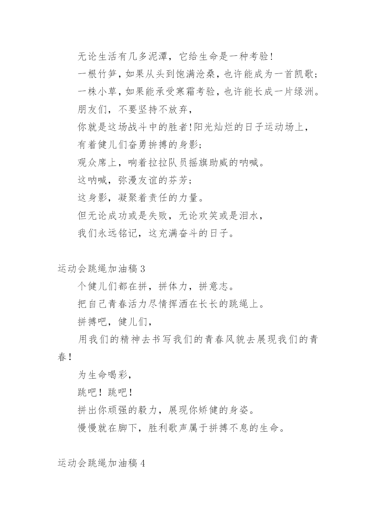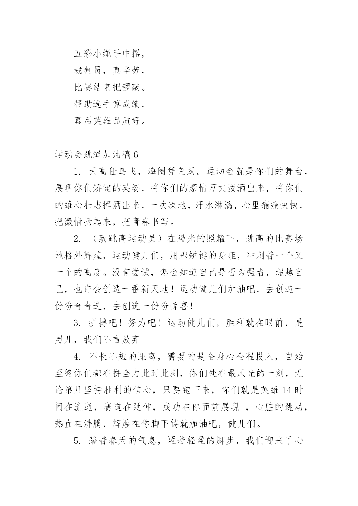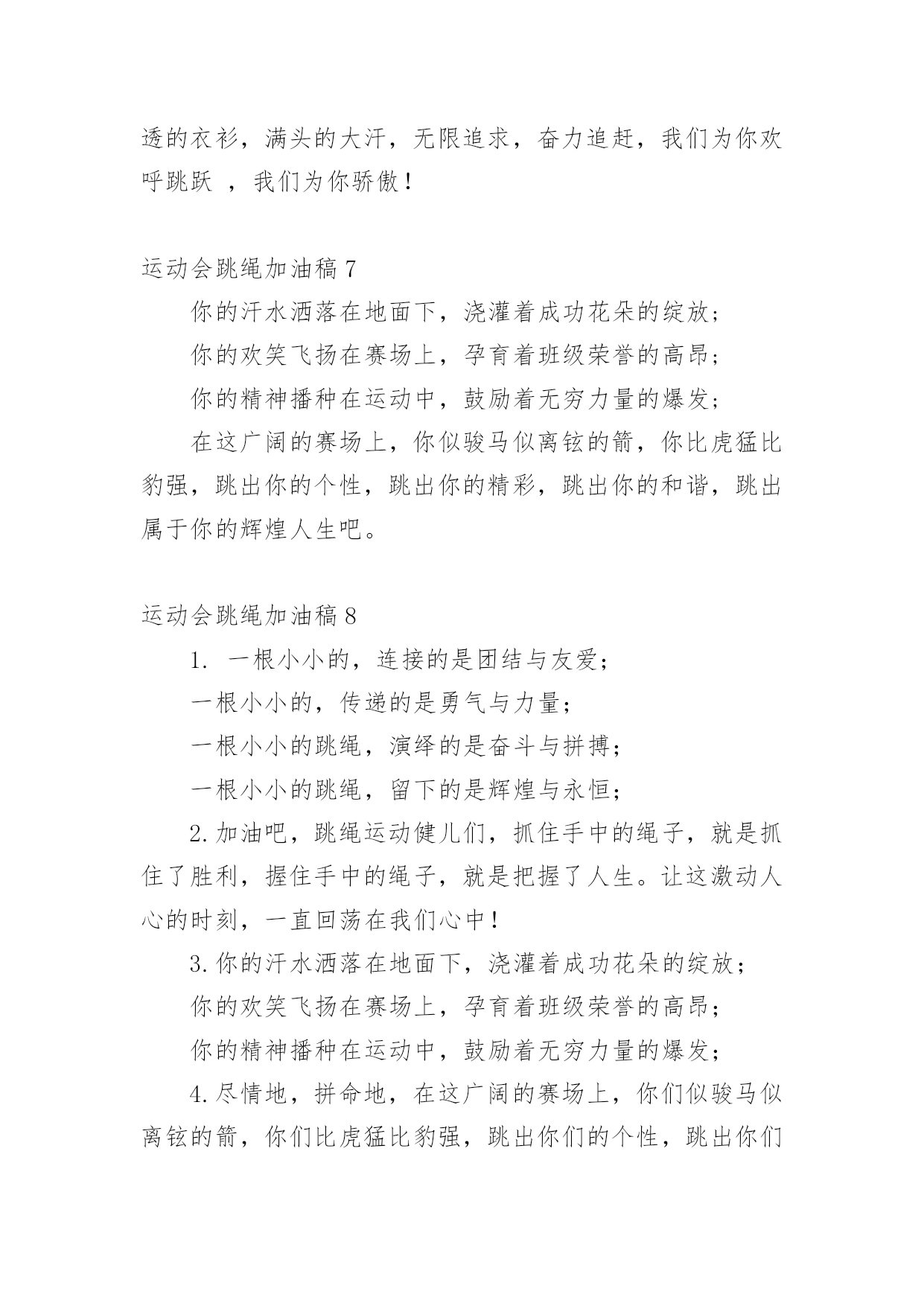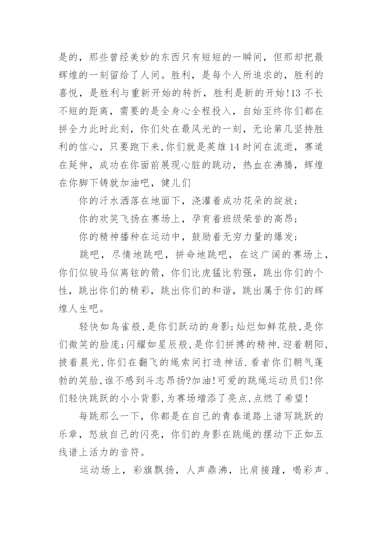 运动会跳绳加油稿运动会跳绳加油稿(合集15篇)在充满活力,日益开放的今天,我们越来越需要加油稿,借助加油稿可以激起人的希望,催人奋进。你知道加油稿怎样写才规范吗?下面是小编收集整理的运动会跳绳加油稿,欢迎阅读,希望大家能够喜欢。运动会跳绳加油稿1温暖的阳光洒在赛场上,男子乙组标枪的比赛即将开始。赛场上,一道道优美的弧线将轻盈地划过天空。健儿们用手中的标枪向距离的权限发起一轮又一轮的挑战。标枪在空中轻盈的姿态,是健儿们强健的力量和熟练的技巧的结合。谁能在这场激烈的竞争中获胜?让我们拭目以待,让我们为他们呐喊、助威吧!只有将力量与技巧合二为一的人,才能获得胜利的桂冠!今天天气格外好,运动健儿热情高,双飞竞速带人跳,样样齐全成绩高。比赛开始奋力跳,争夺冠军真热闹,长江后浪推前浪,运动员们意志高。摸爬滚打莫害怕,振作起来继续跳,努力锻炼争第一,比赛场上逞英豪。有多少次挥汗如雨,伤痛曾添满记忆,只因为始终相信,去拼搏才能胜利。总在鼓舞自己,要成功就得努力。热血在赛场沸腾,巨人在赛场升起。相信自己,你将赢得胜利,创造奇迹;相信自己,梦想在你手中,这是你的天地。当一切过去,你们将是第一。相信自己,你们将超越极限,超越自己!相信自己,加油吧,健儿们,相信你自己。年轻的我们自信飞扬,青春的气息如同出生的朝阳,蓬勃的力量如同阳光的挥洒。此时此刻,跑道便是我们精彩的舞台,声声加油便是我们最高的奖项!论何成功,谈何荣辱,心中的信念只有一个:拼搏!8萧瑟的秋风,挡不住你们破竹的锐气广阔的绿茵场,是为你们搭建的舞台。张扬吧,年轻的心,我们将为你永远喝彩!泰戈尔在诗中说,天空没有翅膀的影子,但我已飞过;艾青对朋友说,也许有人到达不了彼岸,但我们共同拥有大海。也许你们没有显赫的成绩,但运动场上留下了你们的足迹。也许你们没有奖品,但我们心中留下了你们拼搏的身影。所有的努力都是为了迎接这一刹那,所有的拼搏都是为了这一声令下。11就像花儿准备了春、秋、冬,就是为了红透整个盛夏。就像雪花经历了春、夏、秋就是为了洁白整个严冬。蹲下,昂首,出发……轻轻的一抬脚,便牵动了全场的目光潇洒的迫挥挥手,便满足了那一份无言的等待。迎着朝阳,你们踏歌而去,背着希望,我们等待你们的归来。12也许流星并不少见,但它燃烧的刹那,留给人间最美丽的回忆!也许笑脸并不少见,但胜利的喜悦,总会留给世界精彩的一瞬!是的,那些曾经美妙的东西只有短短的一瞬间,但那却把最辉煌的一刻留给了人间。胜利,是每个人所追求的,胜利的喜悦,是胜利与重新开始的转折,胜利是新的开始!13不长不短的距离,需要的是全身心全程投入,自始至终你们都在拼全力此时此刻,你们处在最风光的一刻,无论第几坚持胜利的信心,只要跑下来,你们就是英雄14时间在流逝,赛道在延伸,成功在你面前展现心脏的跳动,热血在沸腾,辉煌在你脚下铸就加油吧,健儿们你的汗水洒落在地面下,浇灌着成功花朵的绽放;你的欢笑飞扬在赛场上,孕育着班级荣誉的高昂;你的精神播种在运动中,鼓励着无穷力量的爆发;跳吧,尽情地跳吧,拼命地跳吧,在这广阔的赛场上,你们似骏马似离铉的箭,你们比虎猛比豹强,跳出你们的个性,跳出你们的精彩,跳出你们的和谐,跳出属于你们的辉煌人生吧。轻快如鸟雀般,是你们跃动的身影;灿烂如鲜花般,是你们微笑的脸庞;闪耀如星辰般,是你们拼搏的精神.迎着朝阳,披着晨光,你们在翻飞的绳索间打造神话.看者你们朝气蓬勃的笑脸,谁不感到斗志昂扬?加油!可爱的跳绳运动员们!你们轻快跳跃的小小背影,为赛场增添了亮点,点燃了希望!每跳那么一下,你都是在自己的青春道路上谱写跳跃的乐章,怒放自己的闪亮,你们的身影在跳绳的摆动下正如五线谱上活力的音符。运动场上,彩旗飘扬,人声鼎沸,比肩接踵,喝彩声、加油声此起彼伏,形成了一首美妙美奂的交响曲,余音绕梁,三日不绝。哨声终于响起了,运动员们抖擞精神,全神贯注,双手紧握跳绳,自信地站在属于自己的一片土地上。“啪!”的一声枪响,在这千钧一发之际,运动员们几乎不约而同地飞了起来,轻盈的身体在小绳两边来回飞舞,小绳亦有节奏地上下翻飞,抑扬顿挫,人绳合一,化作了一条条美丽的彩虹,形成了一道道亮丽的风景线,围绕在脚下生风的运动员周围那一刹那,似流星、似闪电,如骏马奔腾,如蛟龙腾空,如猛虎出洞,不在乎名次高低,不在乎成绩高下。一根小小的跳绳,连接的是团结与友爱;一根小小的跳绳,传递的是勇气与力量;一根小小的跳绳,演绎的是奋斗与拼搏;一根小小的跳绳,留下的是辉煌与永恒;虽然胳膊酥了,腿也软了,手也绵了,力气没了,但你们仍然握着哑铃似的跳绳在那里一如既往,坚持不懈地跳着,即使落后,也顽强不屈,努力拚搏,永不退缩!加油吧,跳绳运动健儿们,抓住手中的绳子,就是抓住了胜利,握住手中的绳子,就是把握了人生。让这激动人心的时刻,一直回荡在我们心中!运动会跳绳加油