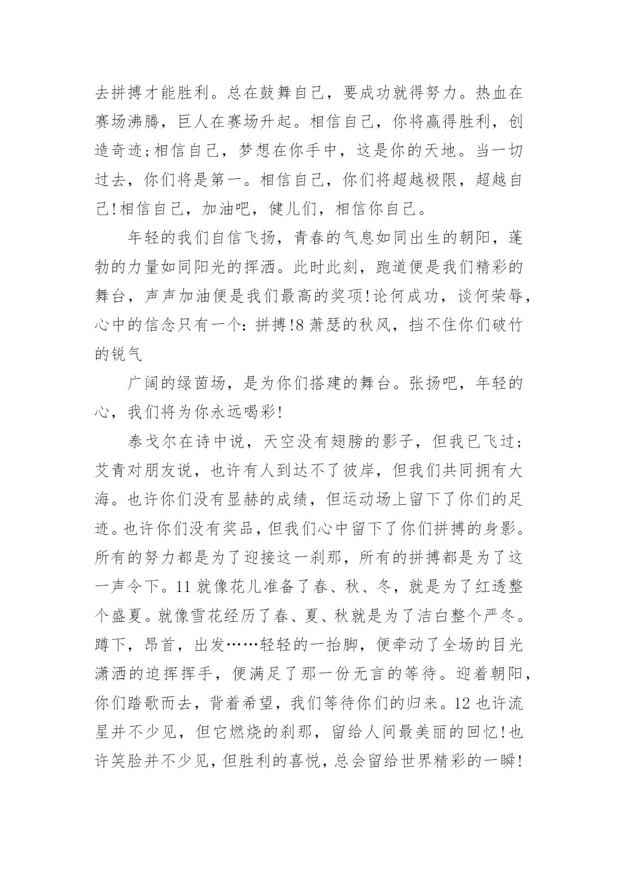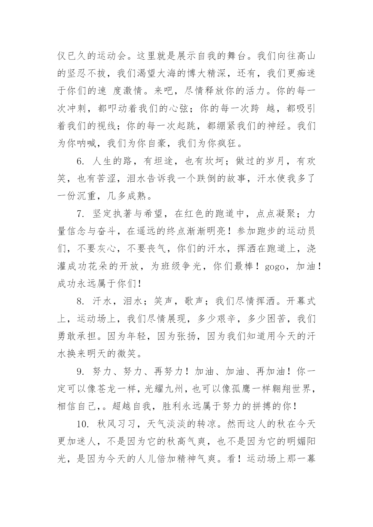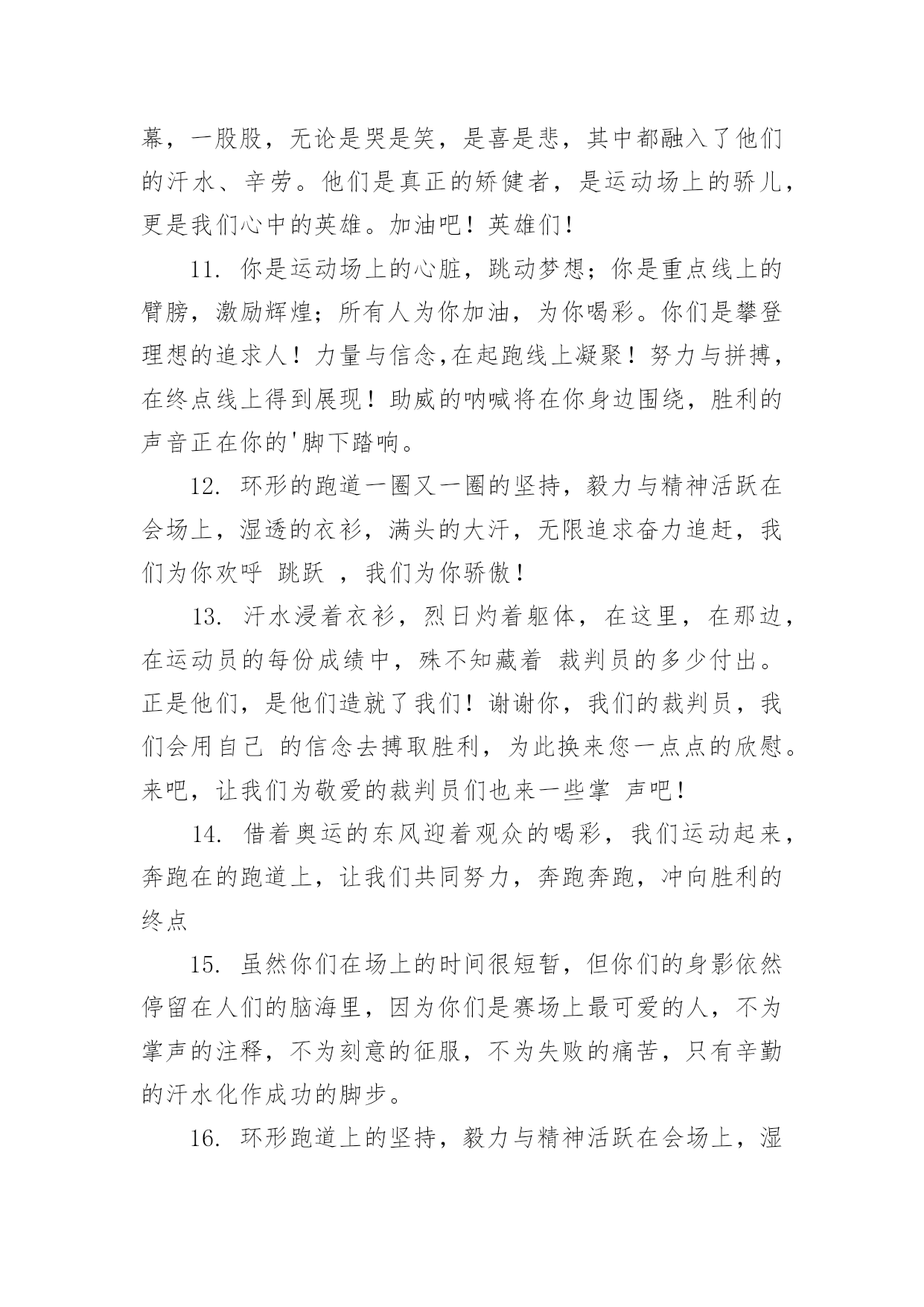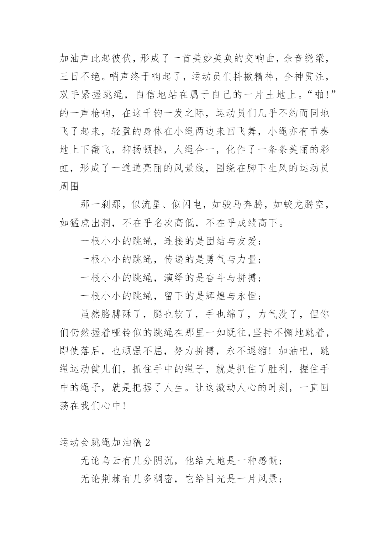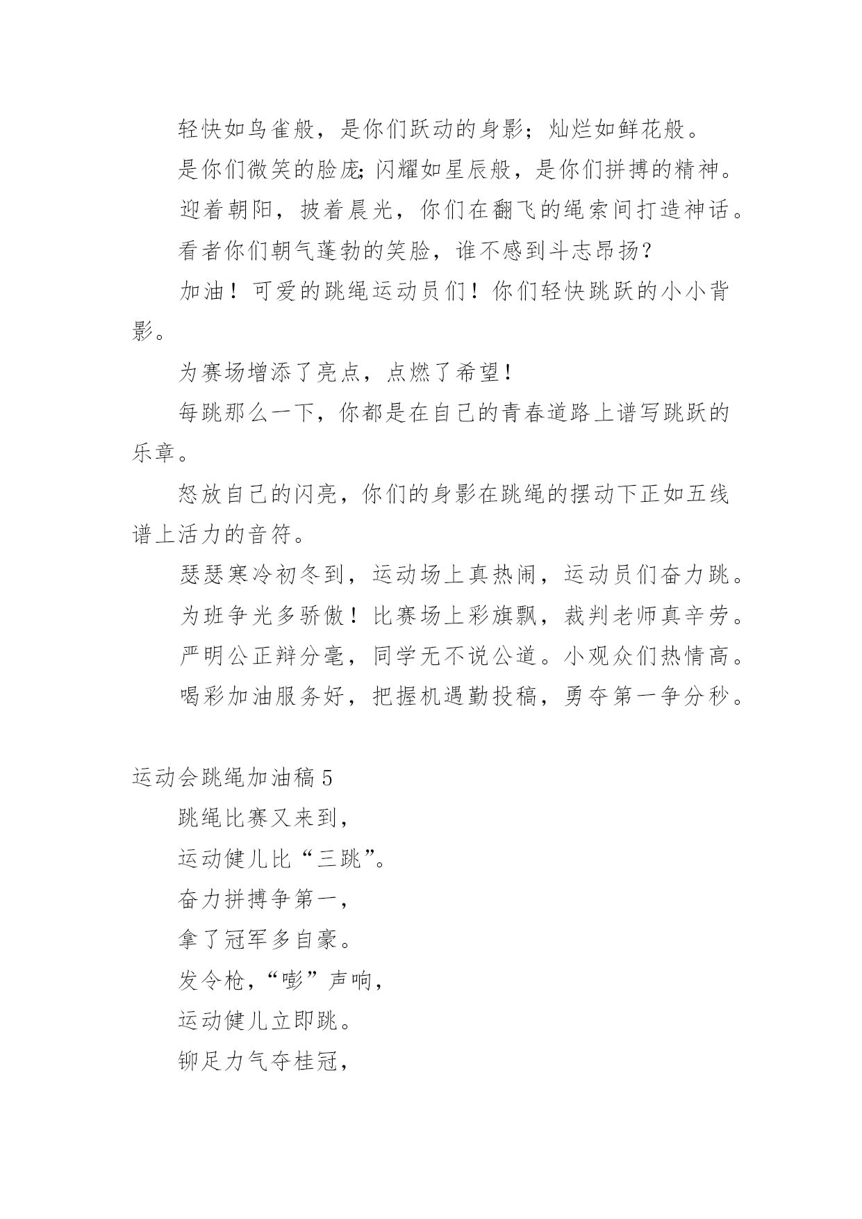 运动会跳绳加油稿运动会跳绳加油稿(合集15篇)在充满活力,日益开放的今天,我们越来越需要加油稿,借助加油稿可以激起人的希望,催人奋进。你知道加油稿怎样写才规范吗?下面是小编收集整理的运动会跳绳加油稿,欢迎阅读,希望大家能够喜欢。运动会跳绳加油稿1温暖的阳光洒在赛场上,男子乙组标枪的比赛即将开始。赛场上,一道道优美的弧线将轻盈地划过天空。健儿们用手中的标枪向距离的权限发起一轮又一轮的挑战。标枪在空中轻盈的姿态,是健儿们强健的力量和熟练的技巧的结合。谁能在这场激烈的竞争中获胜?让我们拭目以待,让我们为他们呐喊、助威吧!只有将力量与技巧合二为一的人,才能获得胜利的桂冠!今天天气格外好,运动健儿热情高,双飞竞速带人跳,样样齐全成绩高。比赛开始奋力跳,争夺冠军真热闹,长江后浪推前浪,运动员们意志高。摸爬滚打莫害怕,振作起来继续跳,努力锻炼争第一,比赛场上逞英豪。有多少次挥汗如雨,伤痛曾添满记忆,只因为始终相信,去拼搏才能胜利。总在鼓舞自己,要成功就得努力。热血在赛场沸腾,巨人在赛场升起。相信自己,你将赢得胜利,创造奇迹;相信自己,梦想在你手中,这是你的天地。当一切过去,你们将是第一。相信自己,你们将超越极限,超越自己!相信自己,加油吧,健儿们,相信你自己。年轻的我们自信飞扬,青春的气息如同出生的朝阳,蓬勃的力量如同阳光的挥洒。此时此刻,跑道便是我们精彩的舞台,声声加油便是我们最高的奖项!论何成功,谈何荣辱,心中的信念只有一个:拼搏!8萧瑟的秋风,挡不住你们破竹的锐气广阔的绿茵场,是为你们搭建的舞台。张扬吧,年轻的心,我们将为你永远喝彩!泰戈尔在诗中说,天空没有翅膀的影子,但我已飞过;艾青对朋友说,也许有人到达不了彼岸,但我们共同拥有大海。也许你们没有显赫的成绩,但运动场上留下了你们的足迹。也许你们没有奖品,但我们心中留下了你们拼搏的身影。所有的努力都是为了迎接这一刹那,所有的拼搏都是为了这一声令下。11就像花儿准备了春、秋、冬,就是为了红透整个盛夏。就像雪花经历了春、夏、秋就是为了洁白整个严冬。蹲下,昂首,出发……轻轻的一抬脚,便牵动了全场的目光潇洒的迫挥挥手,便满足了那一份无言的等待。迎着朝阳,你们踏歌而去,背着希望,我们等待你们的归来。12也许流星并不少见,但它燃烧的刹那,留给人间最美丽的回忆!也许笑脸并不少见,但胜利的喜悦,总会留给世界精彩的一瞬!是的,那些曾经美妙的东西只有短短的一瞬间,但那却把最辉煌的一刻留给了人间。胜利,是每个人所追求的,胜利的喜悦,是胜利与重新开始的转折,胜利是新的开始!13不长不短的距离,需要的是全身心全程投入,自始至终你们都在拼全力此时此刻,你们处在最风光的一刻,无论第几坚持胜利的信心,只要跑下来,你们就是英雄14时间在流逝,赛道在延伸,成功在你面前展现心脏的跳动,热血在沸腾,辉煌在你脚下铸就加油吧,健儿们你的汗水洒落在地面下,浇灌着成功花朵的绽放;你的欢笑飞扬在赛场上,孕育着班级荣誉的高昂;你的精神播种在运动中,鼓励着无穷力量的爆发;跳吧,尽情地跳吧,拼命地跳吧,在这广阔的赛场上,你们似骏马似离铉的箭,你们比虎猛比豹强,跳出你们的个性,跳出你们的精彩,跳出你们的和谐,跳出属于你们的辉煌人生吧。轻快如鸟雀般,是你们跃动的身影;灿烂如鲜花般,是你们微笑的脸庞;闪耀如星辰般,是你们拼搏的精神.迎着朝阳,披着晨光,你们在翻飞的绳索间打造神话.看者你们朝气蓬勃的笑脸,谁不感到斗志昂扬?加油!可爱的跳绳运动员们!你们轻快跳跃的小小背影,为赛场增添了亮点,点燃了希望!每跳那么一下,你都是在自己的青春道路上谱写跳跃的乐章,怒放自己的闪亮,你们的身影在跳绳的摆动下正如五线谱上活力的音符。运动场上,彩旗飘扬,人声鼎沸,比肩接踵,喝彩声、加油声此起彼伏,形成了一首美妙美奂的交响曲,余音绕梁,三日不绝。哨声终于响起了,运动员们抖擞精神,全神贯注,双手紧握跳绳,自信地站在属于自己的一片土地上。“啪!”的一声枪响,在这千钧一发之际,运动员们几乎不约而同地飞了起来,轻盈的身体在小绳两边来回飞舞,小绳亦有节奏地上下翻飞,抑扬顿挫,人绳合一,化作了一条条美丽的彩虹,形成了一道道亮丽的风景线,围绕在脚下生风的运动员周围那一刹那,似流星、似闪电,如骏马奔腾,如蛟龙腾空,如猛虎出洞,不在乎名次高低,不在乎成绩高下。一根小小的跳绳,连接的是团结与友爱;一根小小的跳绳,传递的是勇气与力量;一根小小的跳绳,演绎的是奋斗与拼搏;一根小小的跳绳,留下的是辉煌与永恒;虽然胳膊酥了,腿也软了,手也绵了,力气没了,但你们仍然握着哑铃似的跳绳在那里一如既往,坚持不懈地跳着,即使落后,也顽强不屈,努力拚搏,永不退缩!加油吧,跳绳运动健儿们,抓住手中的绳子,就是抓住了胜利,握住手中的绳子,就是把握了人生。让这激动人心的时刻,一直回荡在我们心中!运动会跳绳加油
