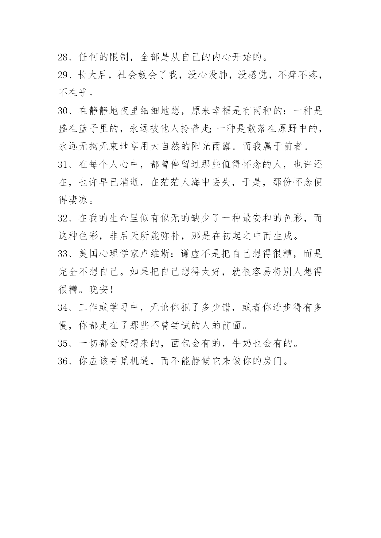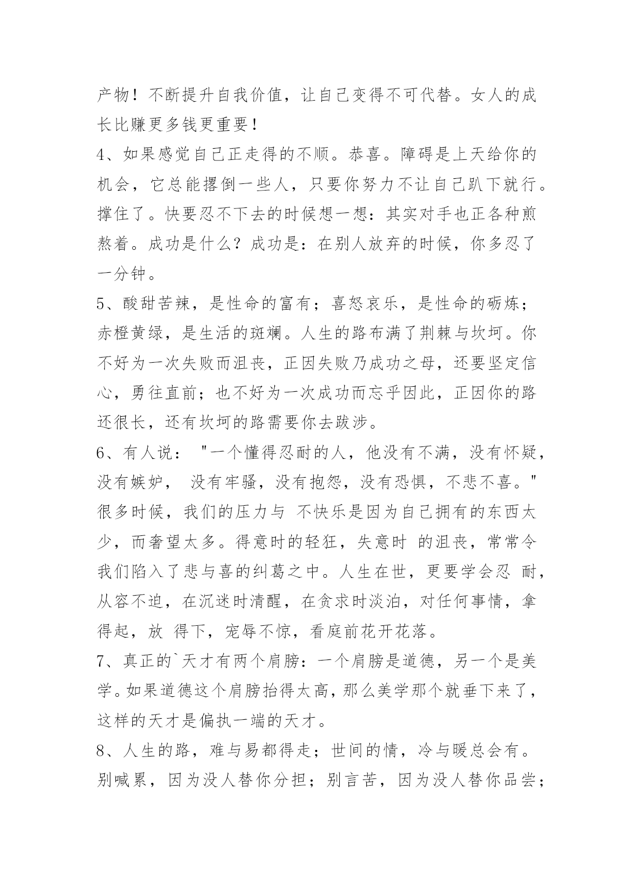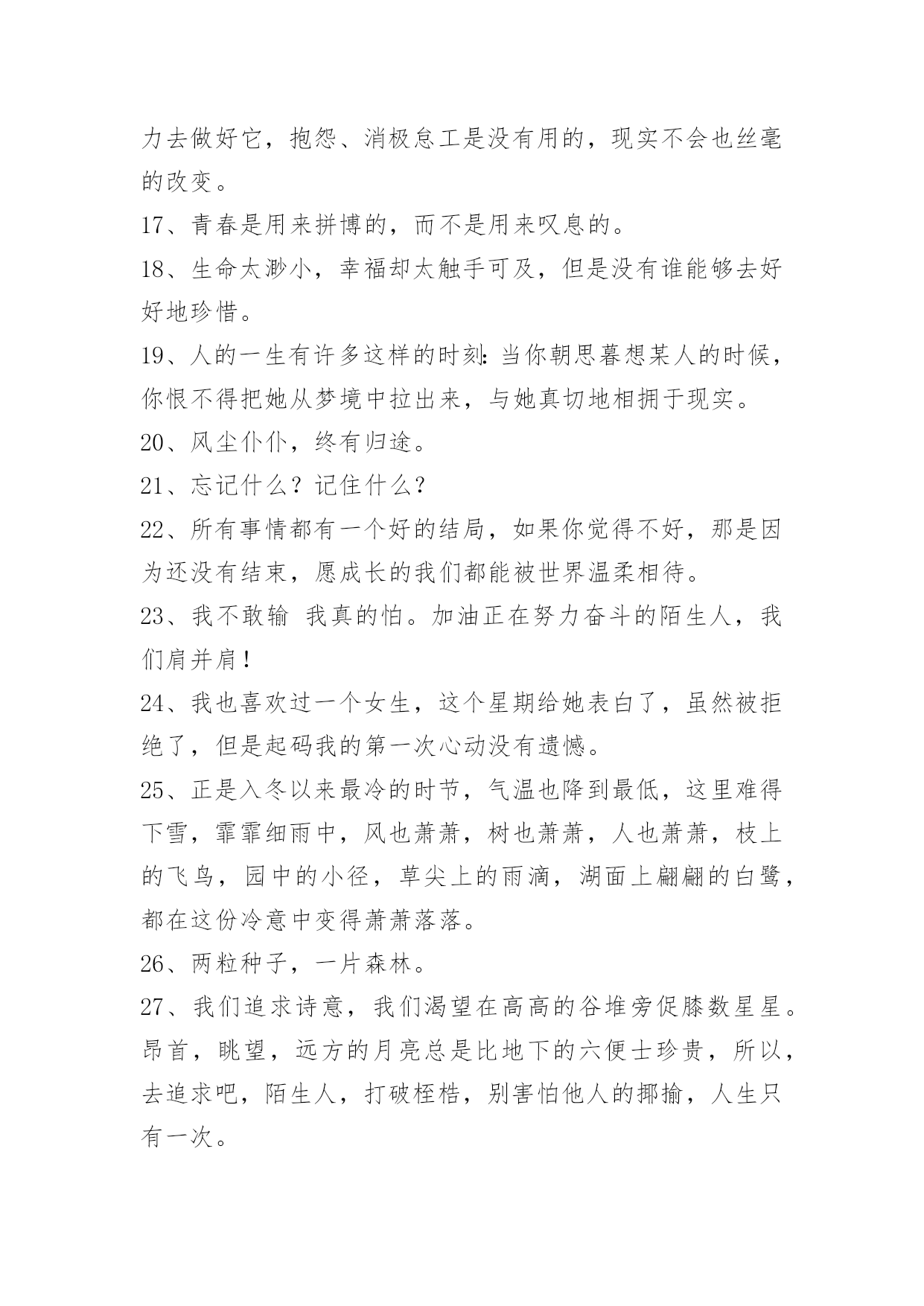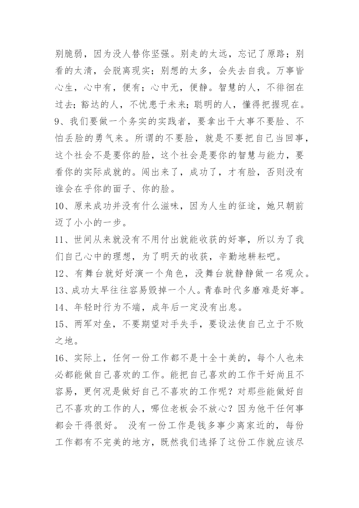 工作励志语录36条2022年工作励志语录锦集36条真观念必定符合它的对象。[荷兰]斯宾诺莎引自《十六——十八世纪西欧各国哲学》。真理的唯一可靠的标准就是永远自相符合。不论从哪个角度来看,也不论怎样比较,真理总是始终如一的,谬误就经不起这种考察和比较,因为它总是导致荒谬的结论的。[英]欧文《新社会观,或论人类性格的形成》,《欧文选集》第54—55页。以下是小编为大家推荐的工作励志语录36条,欢迎阅读,希望能够对大家有所帮助。1、只要稍稍留意,就会发现,每一朵花的花瓣之间,都不是平直的,都是有"褶子"的。正是这些高低不平的"褶子",使花朵美丽起来。2、在成功的道路上,没有耐心去等待成功的到来,那么,只好用一生的耐心去面对。都说成功难,不成功才是真的难。实际上,那些生活在贫困线上的是真的有耐心,有吃苦耐劳的品质,他们正是以这种惊人的耐心忍受着不成功的现实与生活。3、女人干事业,并不是要赚多少钱,而是让自己的人生变得独立而精彩。很多女人都在追求物质财富,而有一部分女人却在追求自我成长,走过一段历程后,我们会发现,其实当一个人修养足够时,赚钱只是顺带的事,成功是优秀的附产物!不断提升自我价值,让自己变得不可代替。女人的成长比赚更多钱更重要!4、如果感觉自己正走得的不顺。恭喜。障碍是上天给你的机会,它总能撂倒一些人,只要你努力不让自己趴下就行。撑住了。快要忍不下去的时候想一想:其实对手也正各种煎熬着。成功是什么?成功是:在别人放弃的时候,你多忍了一分钟。5、酸甜苦辣,是性命的富有;喜怒哀乐,是性命的砺炼;赤橙黄绿,是生活的斑斓。人生的路布满了荆棘与坎坷。你不好为一次失败而沮丧,正因失败乃成功之母,还要坚定信心,勇往直前;也不好为一次成功而忘乎因此,正因你的路还很长,还有坎坷的路需要你去跋涉。6、有人说:"一个懂得忍耐的人,他没有不满,没有怀疑,没有嫉妒,没有牢骚,没有抱怨,没有恐惧,不悲不喜。"很多时候,我们的压力与不快乐是因为自己拥有的东西太少,而奢望太多。得意时的轻狂,失意时的沮丧,常常令我们陷入了悲与喜的纠葛之中。人生在世,更要学会忍耐,从容不迫,在沉迷时清醒,在贪求时淡泊,对任何事情,拿得起,放得下,宠辱不惊,看庭前花开花落。7、真正的`天才有两个肩膀:一个肩膀是道德,另一个是美学。如果道德这个肩膀抬得太高,那么美学那个就垂下来了,这样的天才是偏执一端的天才。8、人生的路,难与易都得走;世间的情,冷与暖总会有。别喊累,因为没人替你分担;别言苦,因为没人替你品尝;别脆弱,因为没人替你坚强。别走的太远,忘记了原路;别看的太清,会脱离现实;别想的太多,会失去自我。万事皆心生,心中有,便有;心中无,便静。智慧的人,不徘徊在过去;豁达的人,不忧患于未来;聪明的人,懂得把握现在。9、我们要做一个务实的实践者,要拿出干大事不要脸、不怕丢脸的勇气来。所谓的不要脸,就是不要把自己当回事,这个社会不是要你的脸,这个社会是要你的智慧与能力,要看你的实际成就的。闯出来了,成功了,才有脸,否则没有谁会在乎你的面子、你的脸。10、原来成功并没有什么滋味,因为人生的征途,她只朝前迈了小小的一步。11、世间从来就没有不用付出就能收获的好事,所以为了我们自己心中的理想,为了明天的收获,辛勤地耕耘吧。12、有舞台就好好演一个角色,没舞台就静静做一名观众。13、成功太早往往容易毁掉一个人。青春时代多磨难是好事。14、年轻时行为不端,成年后一定没有出息。15、两军对垒,不要期望对手失手,要设法使自己立于不败之地。16、实际上,任何一份工作都不是十全十美的,每个人也未必都能做自己喜欢的工作。能把自己喜欢的工作干好尚且不容易,更何况是做好自己不喜欢的工作呢?对那些能做好自己不喜欢的工作的人,哪位老板会不放心?因为他干任何事都会干得很好。没有一份工作是钱多事少离家近的,每份工作都有不完美的地方,既然我们选择了这份工作就应该尽力去做好它,抱怨、消极怠工是没有用的,现实不会也丝毫的改变。17、青春是用来拼博的,而不是用来叹息的。18、生命太渺小,幸福却太触手可及,但是没有谁能够去好好地珍惜。19、人的一生有许多这样的时刻:当你朝思暮想某人的时候,你恨不得把她从梦境中拉出来,与她真切地相拥于现实。20、风尘仆仆,终有归途。21、忘记什么?记住什么?22、所有事情都有一个好的结局,如果你觉得不好,那是因为还没有结束,愿成长的我们都能被世界温柔相待。23、我不敢输我真的怕。加油正在努力奋斗的陌生人,我们肩并肩!24、我也喜欢过一个女生,这个星期给她表白了,虽然被拒绝了,但是起码我的第一次心动没有遗憾。25、正是入冬以来最冷的时节,气温也降到最低,这里难得下雪,霏霏细雨中,风也萧萧,树也萧萧,人也萧萧,枝上的飞鸟,园中的小径,草尖上的雨滴,湖面上翩翩的白鹭,都在这份冷意中变得萧萧落落