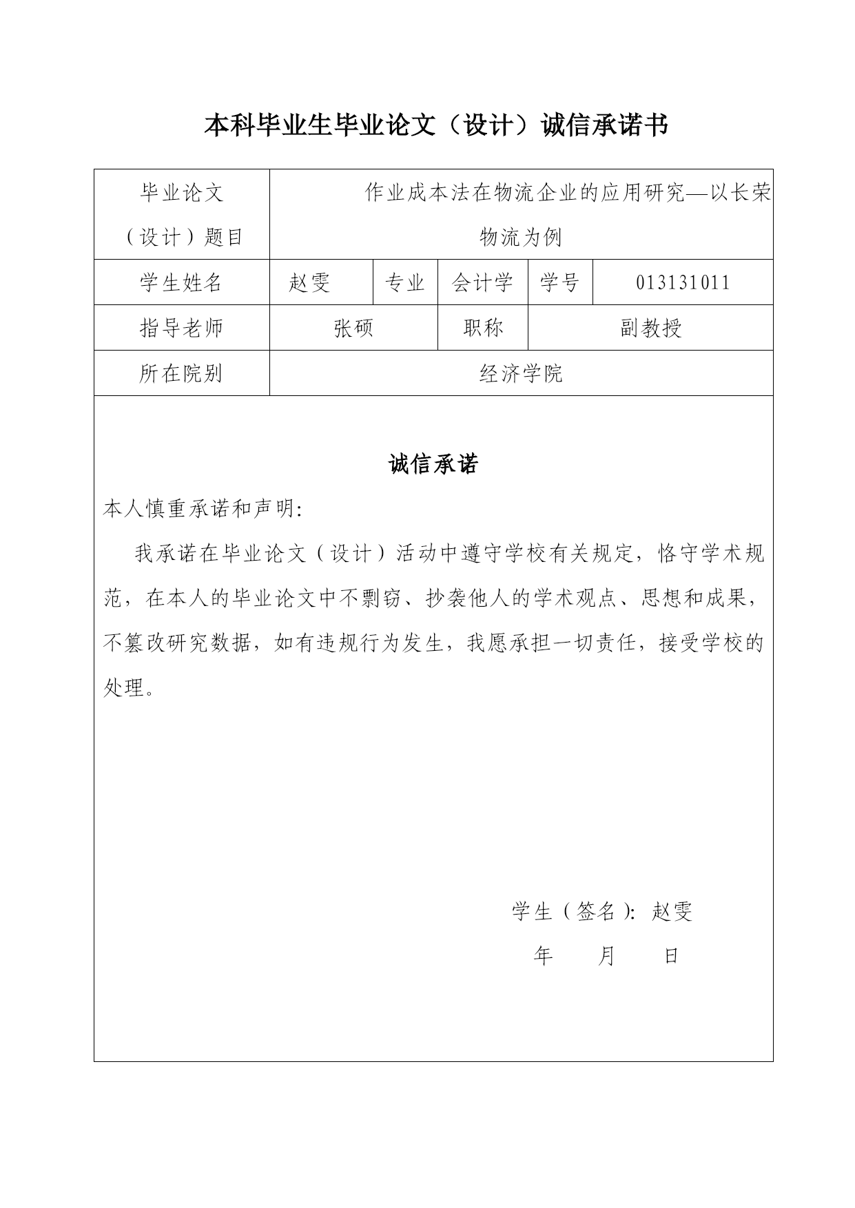 中国地质大学长城学院2014届毕业论文13中国地质大学长城学院本科毕业论文题目作业成本法在物流企业的应用研究—以长荣物流为例院别经济学院专业会计学学生姓名赵雯学号013131011指导教师张硕职称副教授2017年4月30日本科毕业生毕业论文(设计)诚信承诺书毕业论文(设计)题目作业成本法在物流企业的应用研究—以长荣物流为例学生姓名赵雯专业会计学学号013131011指导老师张硕职称副教授所在院别经济学院诚信承诺本人慎重承诺和声明:我承诺在毕业论文(设计)活动中遵守学校有关规定,恪守学术规范,在本人的毕业论文中不剽窃、抄袭他人的学术观点、思想和成果,不篡改研究数据,如有违规行为发生,我愿承担一切责任,接受学校的处理。学生(签名):赵雯年月日中国地质大学长城学院毕业论文任务书学生姓名赵雯学号013131011专业班级会计学十班指导教师张硕职称副教授单位中国地质大学长城学院毕业论文题目作业成本法在物流企业中的应用研究----以长荣物流为例毕业论文主要内容和要求:主要内容:本文运用调查法、理论研究法等方法和作用成本法相关理论,运用理论与案例相结合的分析方法,从作业成本法的背景、意义、基本原理与传统成本法相比较的优势来探究作业成本法在我国企业中的应用。总结出作业成本法在我国企业存在的问题以及解决的办法,能够让作业成本法在我国企业的运用中得到更好、更快的发展,以便带动我国经济的发展。要求:论文撰写要求思路清晰、内容充实、论点明确,论据充分,论证严密,语言通顺。撰写论文前应首先阅读相关的研究资料,掌握学术前沿动态,对相关理论著作要很好的把握,提高理论水平及思想深度。根据开题报告和老师提出的意见对论文提纲进行修改,确定大纲后认真撰写毕业论文。撰写论文结束后要根据老师的修改意见,认真反复的修改论文,并按照要求参加毕业论文的答辩,严格按照论文进度安排进行论文的写作。论文的格式、字数等撰写方面的要求参照《中国地质大学长城学院毕业论文(设计)撰写规范》。毕业论文主要参考资料:[1]靳晓羽.作业成本法及其应用研究[J].北京林业大学,2010(5)[2]叶琼.作业成本法在我国的应用探讨[J].现代商贸工业,2011,24(21):145—146.[3]曹文平,马晓梦,任晓珠,李源.浅谈作业成本法在中国企业的应用[J].经营管理者,2012(16)[4]王平心.作业成本与应用研究[M].大连:东北财大出版社,2011.[5]张颖丽.作业成本法与传统成本法的比较及应用分析[J].辽宁工业大学学报,2011.4[6]甘永生,闰德志.成本管理会计.华中科技大学出版社[M].2011[7]马清元.作业成本法在企业成本管理中的应用研究[J].商业经济,2012,(05).[8]孟焰.西方现代管理会计的发展及对我国的启示[M].北京:经济科学出版社.2010[9]牛彦秀.应用成本核算会计[M].大连:东北财经大学出版社,2012[10]王福胜.管理会计学[M].哈尔滨:哈尔滨工业大学出版社.2011[11]蔡剑辉,刘秋生.作业成本会计的应用探讨[J].江苏理工大学学报(社会科学版),2010年04期[12]宁亚平,论作业成本法的适用条件[M].上海:外研社2012:120-140[13]赵息,许琳红.完善作业成本法,提高其可应用性[J].西南交通大学学报.2013年04期[14]HaroldRoth《Thepresentresearchstatus》[D]nnesseeResearchandCreative.2011(5)[15]J.KandV.Govindarajan.《Harvardbusinessreview》August.pp.1995:112-135.毕业论文应完成的主要工作:利用中国知网、维普、万方等数据库完成与毕业论文相关内容的论文的检索;利用图书馆的图书资源查阅相关的理论内容;充分的利用互联网进行资料的检索收集。与实习相关的选题要注意在实习过程中观察收集相关的数据;要做实证方面的论文要多方面搜集相关的地区及国家发布的统计数据。认真撰写开题报告,并对开题报告中指导教师所提出的意见进行修改。认真撰写论文,并根据指导教师的意见进行修改。论文定稿之后,按照要求进行毕业论文的答辩。毕业论文进度安排:序号毕业论文各阶段内容时间安排备注1确定毕业论文的选题,收集资料,整理资料,完成论文的任务书2016-10-15至2016-10-312编写论文提纲,撰写开题报告,进行开题。2016-11-1至2016-11-203实习期间进行一步查找资料,作社会调查。2016-11-21至2016-11-304撰写论文,完成第一