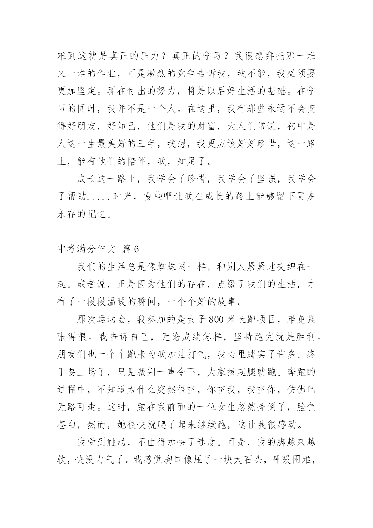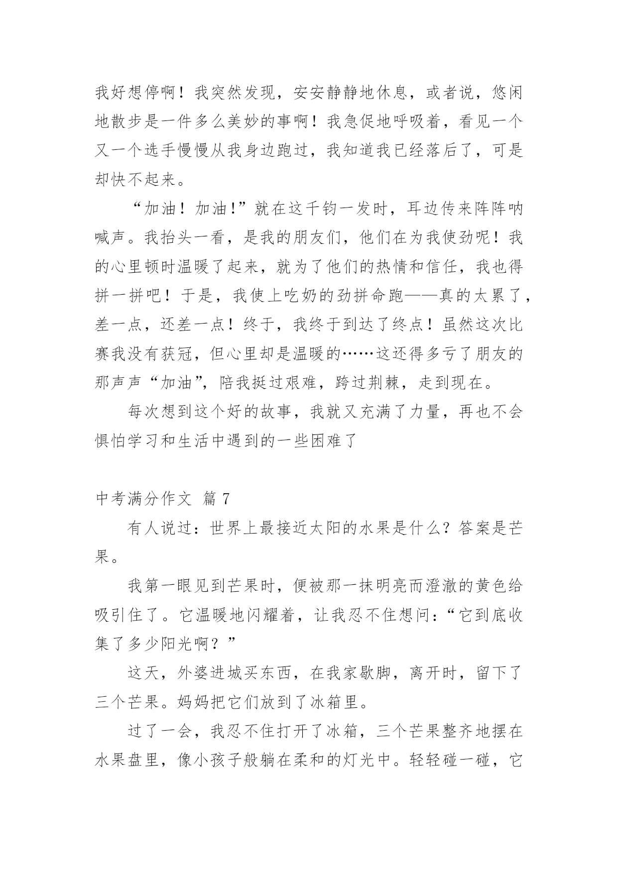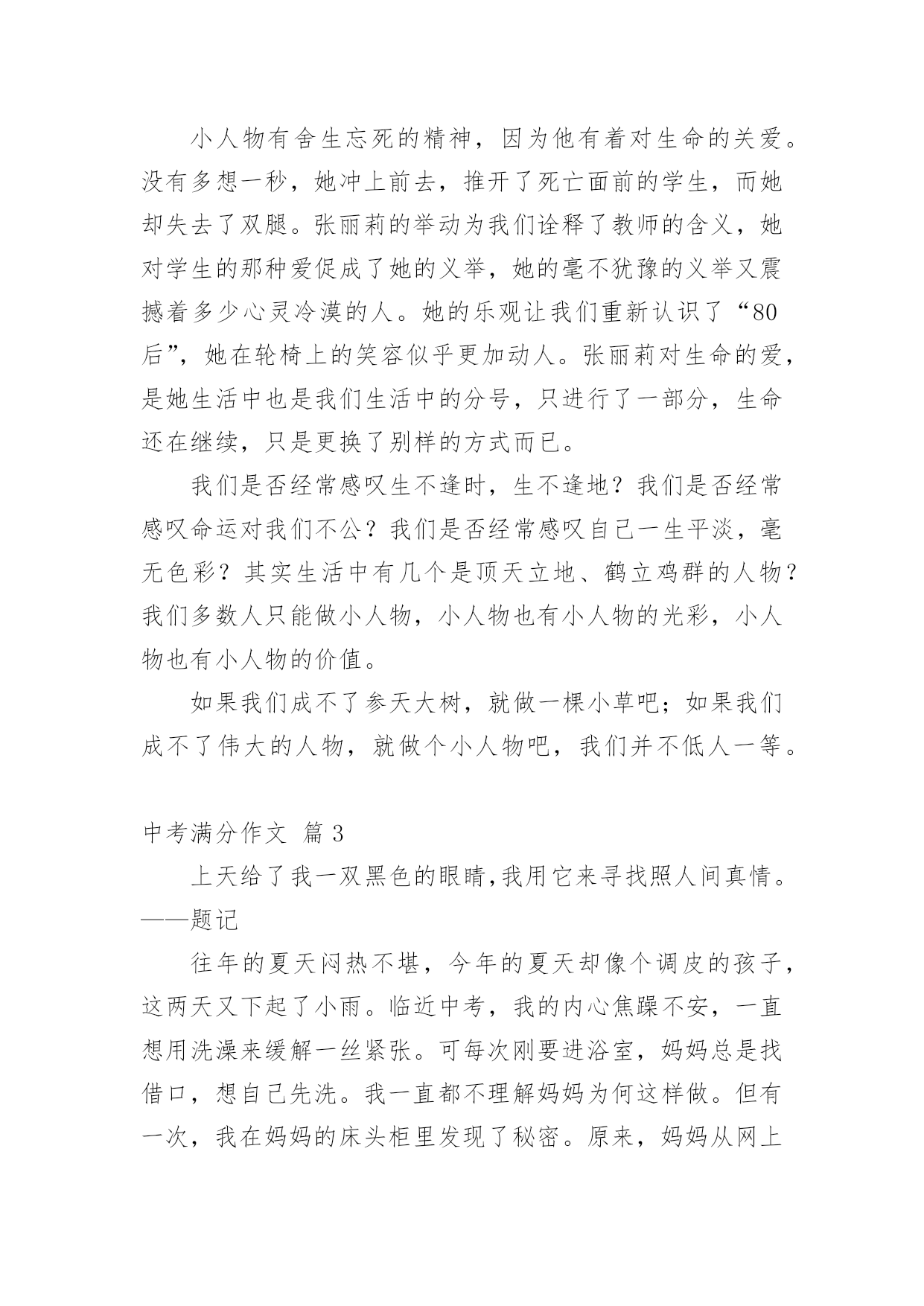 中考满分作文精选中考满分作文锦集9篇在平平淡淡的日常中,大家都经常接触到作文吧,作文一定要做到主题集中,围绕同一主题作深入阐述,切忌东拉西扯,主题涣散甚至无主题。作文的注意事项有许多,你确定会写吗?下面是小编帮大家整理的中考满分作文9篇,欢迎阅读与收藏。中考满分作文篇1人生的旅程中,有的旅程虽时间不多,却令我们永生难忘。前不久的射阳两天之旅,就让我留下了深刻的印象。我们乘车去中小学生素质教育中心,一路上,兴奋的我们差一点一路高歌,每个人都有抑制不住的喜悦。车刚一停下,我们就迫不及待地下车。啊!好一个蓝天白云下诗情画意的地方。在这儿,天仿佛更蓝,草仿佛更绿,整个人都沉醉了。不过接下来的体能训练很快让饿哦们头脑清醒过来,别忘了,我们可是来磨砺意志的!第一节课叫做“自保自极”。在这儿,我们知道了生命的意义,也学会了如何保护生命之安全,还学到了课本上学不到的一些抵抗灾害的知识。保护自己的生命后,当然还是要维护国家安全的。在“国防”课程中,我们学到了一些国家安全保卫方面的知识,还亲自学习射击,体验射击的乐趣。最令人兴奋的恐怕要是“军事训练”了。俗话说:“养兵千日,用兵一时”,学了这么多保护生命安全的知识,不实践一下怎么行?梅花桩,三米跳台,五米跳墙……一个个有趣而危险的活动,无不吸引着我们,大家跃跃欲试,都想尝个鲜。不过,嘴上逞能不算真本事,真到那儿,别说当英雄了,看都不敢看,教官不住的鼓励我,再加上老师的帮助,终于通过了考验,可是现在想来还心有余悸。如果你认为已够刺激了,那你可就错了,更惊险的还在后面,8米高的跳板,让人看了就害怕。可没有办法,只得一步一步爬上去。每上一步,都有种晕眩的感觉,内心的紧张化成了掌心的汗珠,我觉得自己都快不能呼吸了。终于到了顶峰,腿越来越哆嗦了。教官不住地喊:“蹲下,双手抱胸,跳下来!”我却慌了神,后来好不容易在大家的鼓励下条下来,我慢慢睁开眼睛。那一瞬,蓝天仿佛更蓝,云朵似乎更白,我也成了小鸟,无拘无束地飞翔着。回到地面,我长舒一口气,啊!我终于战胜自己了。美妙的旅程很快接近尾声。在这里,我要感谢所有的教官,他们让我更加坚强,不仅战胜了恐惧,也对未来,对梦想充满信心。它将化做一颗宝石,永远珍藏在我的记忆宝盒里中考满分作文篇2蝴蝶虽小,但它让百花齐放,让世界变得万紫千红;水汽虽小,但它汇集成了蓝天中自在的云朵,让天空不再单调;麻雀虽小,但同样给我们的世界添彩,因为它平庸而不自卑,因为它心中有着对生命价值的信念。小人物可以有不一样的精彩,就像小麻雀可以成为点缀人类生活过程当中的活标点一样。小人物有感天动地的孝心,因为他有着感恩的心灵。一条布袋可以带带相传,陈斌强从妈妈手中接过布袋,像妈妈背起自己一样背起妈妈,坚持不懈,是妈妈对他的爱教会了他如何爱,是妈妈的一句“我要和儿子在一起”教会了他如何爱,是妈妈脸上洋溢出的天真的笑教会了他如何爱。他一定没有想到自己这样的做法所带给自己的是“感动中国人物”,他的孝足以感动我们,感动中国。“孝更绝伦足可矜”,他是感叹号,让我们感叹,让我们敬佩。小人物有甜甜蜜蜜的爱情,因为他有着对生活的热情。一根拐杖,一个用旧了的药箱,一件穿了很久的白大褂,一抹暖人心的笑,这就是热爱生活的周月华。当她的生命开始有艾起的身影时,她有了左腿,她的行医路上不再只有沉默,她不再寂寞。艾起承诺背她一辈子,多么简单的一句话,艾起真的就做到了,只要有人要看病,艾起就背起月华,年复一年。月华的心中不只有艾起,还有村中的病号,而艾起的心中只有月华。月华皎洁,爱正慢慢地升起,他们的爱情是省略号,他们脸上洋溢的幸福的笑容告诉中国:我们的爱情未完待续。小人物有舍生忘死的精神,因为他有着对生命的关爱。没有多想一秒,她冲上前去,推开了死亡面前的学生,而她却失去了双腿。张丽莉的举动为我们诠释了教师的含义,她对学生的那种爱促成了她的义举,她的毫不犹豫的义举又震撼着多少心灵冷漠的人。她的乐观让我们重新认识了“80后”,她在轮椅上的笑容似乎更加动人。张丽莉对生命的爱,是她生活中也是我们生活中的分号,只进行了一部分,生命还在继续,只是更换了别样的方式而已。我们是否经常感叹生不逢时,生不逢地?我们是否经常感叹命运对我们不公?我们是否经常感叹自己一生平淡,毫无色彩?其实生活中有几个是顶天立地、鹤立鸡群的人物?我们多数人只能做小人物,小人物也有小人物的光彩,小人物也有小人物的价值。如果我们成不了参天大树,就做一棵小草吧;如果我们成不了伟大的人物,就做个小人物吧,我们并不低人一等。中考满分作文篇3上天给了我一双黑色的眼睛,我用它来寻找照人间真情。——题记往年的夏天闷热不堪,今年的夏天却像个调皮的孩子,这两天又下起了小雨。临近中考,我的内心焦躁不安,一直想用洗澡来缓解一丝紧张。可每次刚要进浴室,妈妈总是找借口,想自己先洗。我一直都不理