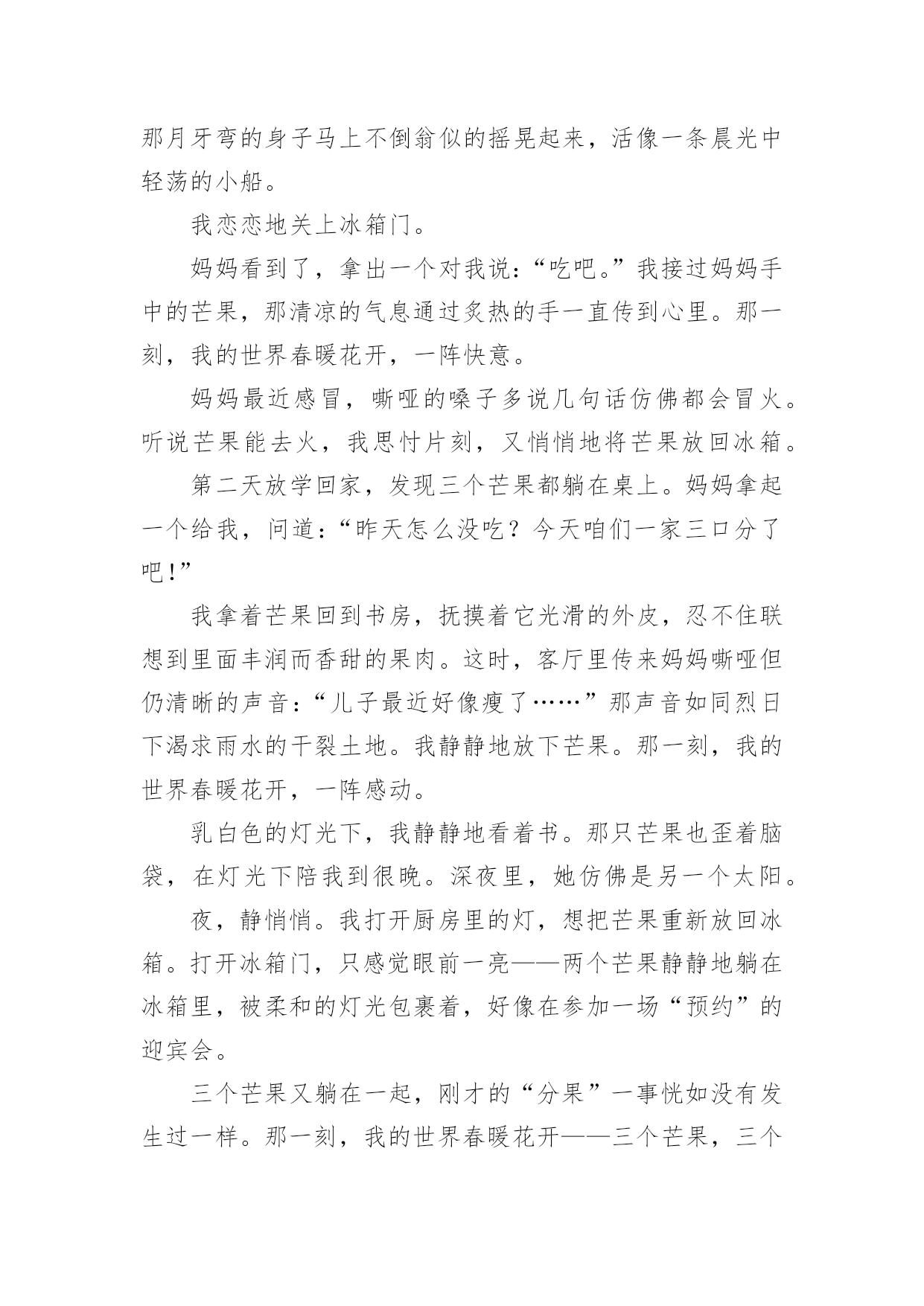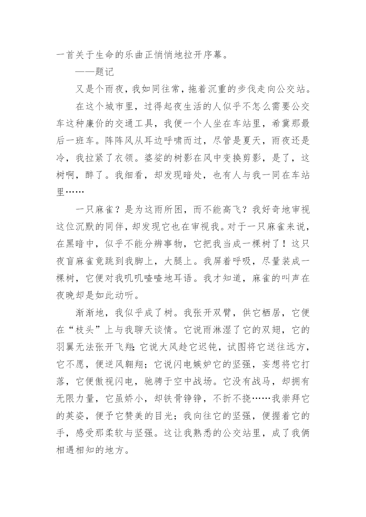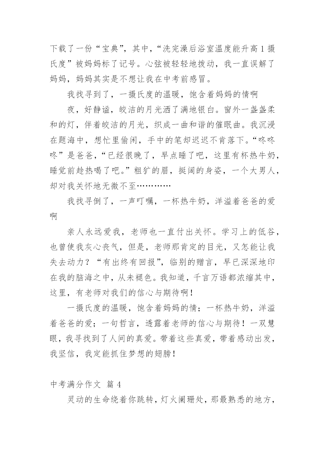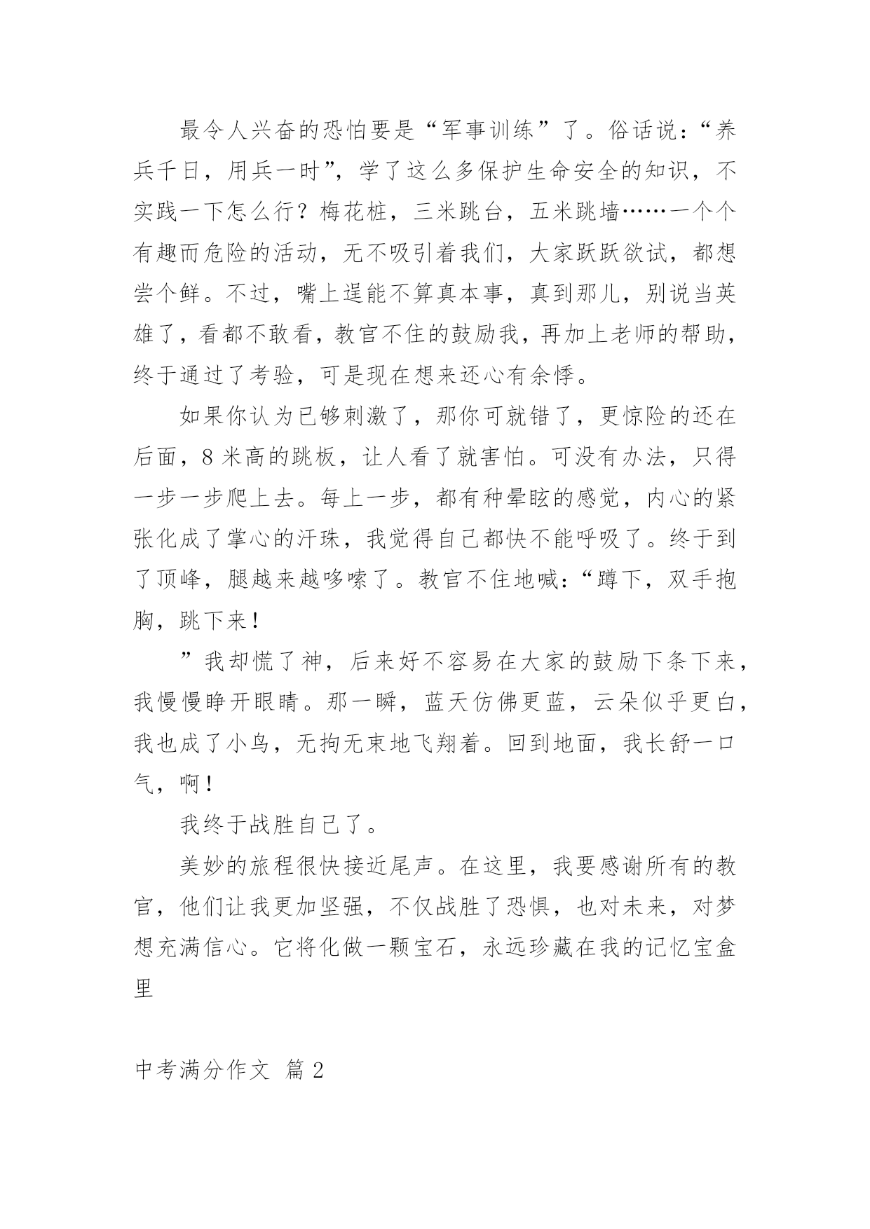 中考满分作文精选中考满分作文锦集9篇在平平淡淡的日常中,大家都经常接触到作文吧,作文一定要做到主题集中,围绕同一主题作深入阐述,切忌东拉西扯,主题涣散甚至无主题。作文的注意事项有许多,你确定会写吗?下面是小编帮大家整理的中考满分作文9篇,欢迎阅读与收藏。中考满分作文篇1人生的旅程中,有的旅程虽时间不多,却令我们永生难忘。前不久的射阳两天之旅,就让我留下了深刻的印象。我们乘车去中小学生素质教育中心,一路上,兴奋的我们差一点一路高歌,每个人都有抑制不住的喜悦。车刚一停下,我们就迫不及待地下车。啊!好一个蓝天白云下诗情画意的地方。在这儿,天仿佛更蓝,草仿佛更绿,整个人都沉醉了。不过接下来的体能训练很快让饿哦们头脑清醒过来,别忘了,我们可是来磨砺意志的!第一节课叫做“自保自极”。在这儿,我们知道了生命的意义,也学会了如何保护生命之安全,还学到了课本上学不到的一些抵抗灾害的知识。保护自己的生命后,当然还是要维护国家安全的。在“国防”课程中,我们学到了一些国家安全保卫方面的知识,还亲自学习射击,体验射击的乐趣。最令人兴奋的恐怕要是“军事训练”了。俗话说:“养兵千日,用兵一时”,学了这么多保护生命安全的知识,不实践一下怎么行?梅花桩,三米跳台,五米跳墙……一个个有趣而危险的活动,无不吸引着我们,大家跃跃欲试,都想尝个鲜。不过,嘴上逞能不算真本事,真到那儿,别说当英雄了,看都不敢看,教官不住的鼓励我,再加上老师的帮助,终于通过了考验,可是现在想来还心有余悸。如果你认为已够刺激了,那你可就错了,更惊险的还在后面,8米高的跳板,让人看了就害怕。可没有办法,只得一步一步爬上去。每上一步,都有种晕眩的感觉,内心的紧张化成了掌心的汗珠,我觉得自己都快不能呼吸了。终于到了顶峰,腿越来越哆嗦了。教官不住地喊:“蹲下,双手抱胸,跳下来!”我却慌了神,后来好不容易在大家的鼓励下条下来,我慢慢睁开眼睛。那一瞬,蓝天仿佛更蓝,云朵似乎更白,我也成了小鸟,无拘无束地飞翔着。回到地面,我长舒一口气,啊!我终于战胜自己了。美妙的旅程很快接近尾声。在这里,我要感谢所有的教官,他们让我更加坚强,不仅战胜了恐惧,也对未来,对梦想充满信心。它将化做一颗宝石,永远珍藏在我的记忆宝盒里中考满分作文篇2蝴蝶虽小,但它让百花齐放,让世界变得万紫千红;水汽虽小,但它汇集成了蓝天中自在的云朵,让天空不再单调;麻雀虽小,但同样给我们的世界添彩,因为它平庸而不自卑,因为它心中有着对生命价值的信念。小人物可以有不一样的精彩,就像小麻雀可以成为点缀人类生活过程当中的活标点一样。小人物有感天动地的孝心,因为他有着感恩的心灵。一条布袋可以带带相传,陈斌强从妈妈手中接过布袋,像妈妈背起自己一样背起妈妈,坚持不懈,是妈妈对他的爱教会了他如何爱,是妈妈的一句“我要和儿子在一起”教会了他如何爱,是妈妈脸上洋溢出的天真的笑教会了他如何爱。他一定没有想到自己这样的做法所带给自己的是“感动中国人物”,他的孝足以感动我们,感动中国。“孝更绝伦足可矜”,他是感叹号,让我们感叹,让我们敬佩。小人物有甜甜蜜蜜的爱情,因为他有着对生活的热情。一根拐杖,一个用旧了的药箱,一件穿了很久的白大褂,一抹暖人心的笑,这就是热爱生活的周月华。当她的生命开始有艾起的身影时,她有了左腿,她的行医路上不再只有沉默,她不再寂寞。艾起承诺背她一辈子,多么简单的一句话,艾起真的就做到了,只要有人要看病,艾起就背起月华,年复一年。月华的心中不只有艾起,还有村中的病号,而艾起的心中只有月华。月华皎洁,爱正慢慢地升起,他们的爱情是省略号,他们脸上洋溢的幸福的笑容告诉中国:我们的爱情未完待续。小人物有舍生忘死的精神,因为他有着对生命的关爱。没有多想一秒,她冲上前去,推开了死亡面前的学生,而她却失去了双腿。张丽莉的举动为我们诠释了教师的含义,她对学生的那种爱促成了她的义举,她的毫不犹豫的义举又震撼着多少心灵冷漠的人。她的乐观让我们重新认识了“80后”,她在轮椅上的笑容似乎更加动人。张丽莉对生命的爱,是她生活中也是我们生活中的分号,只进行了一部分,生命还在继续,只是更换了别样的方式而已。我们是否经常感叹生不逢时,生不逢地?我们是否经常感叹命运对我们不公?我们是否经常感叹自己一生平淡,毫无色彩?其实生活中有几个是顶天立地、鹤立鸡群的人物?我们多数人只能做小人物,小人物也有小人物的光彩,小人物也有小人物的价值。如果我们成不了参天大树,就做一棵小草吧;如果我们成不了伟大的人物,就做个小人物吧,我们并不低人一等。中考满分作文篇3上天给了我一双黑色的眼睛,我用它来寻找照人间真情。——题记往年的夏天闷热不堪,今年的夏天却像个调皮的孩子,这两天又下起了小雨。临近中考,我的内心焦躁不安,一直想用洗澡来缓解一丝紧张。可每次刚要进浴室,妈妈总是找借口,想自己先洗。我一直都不理