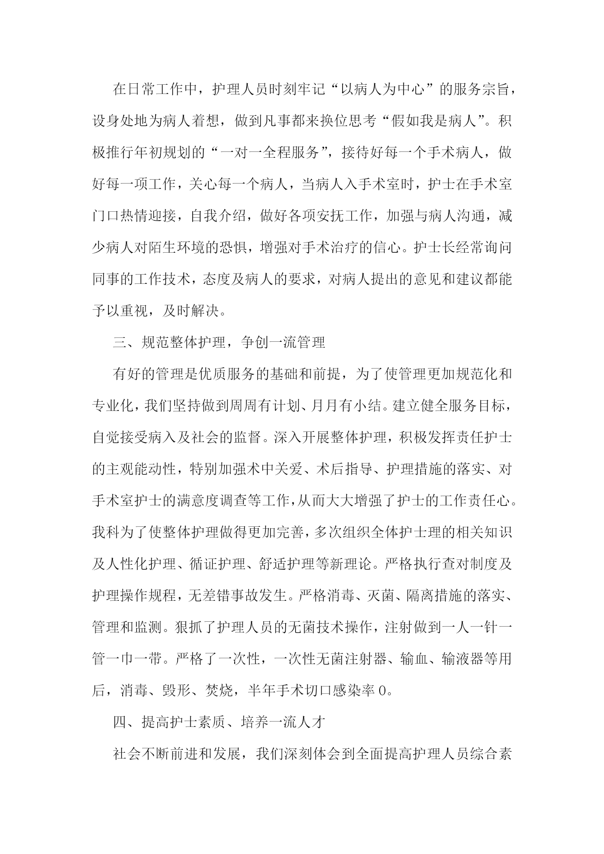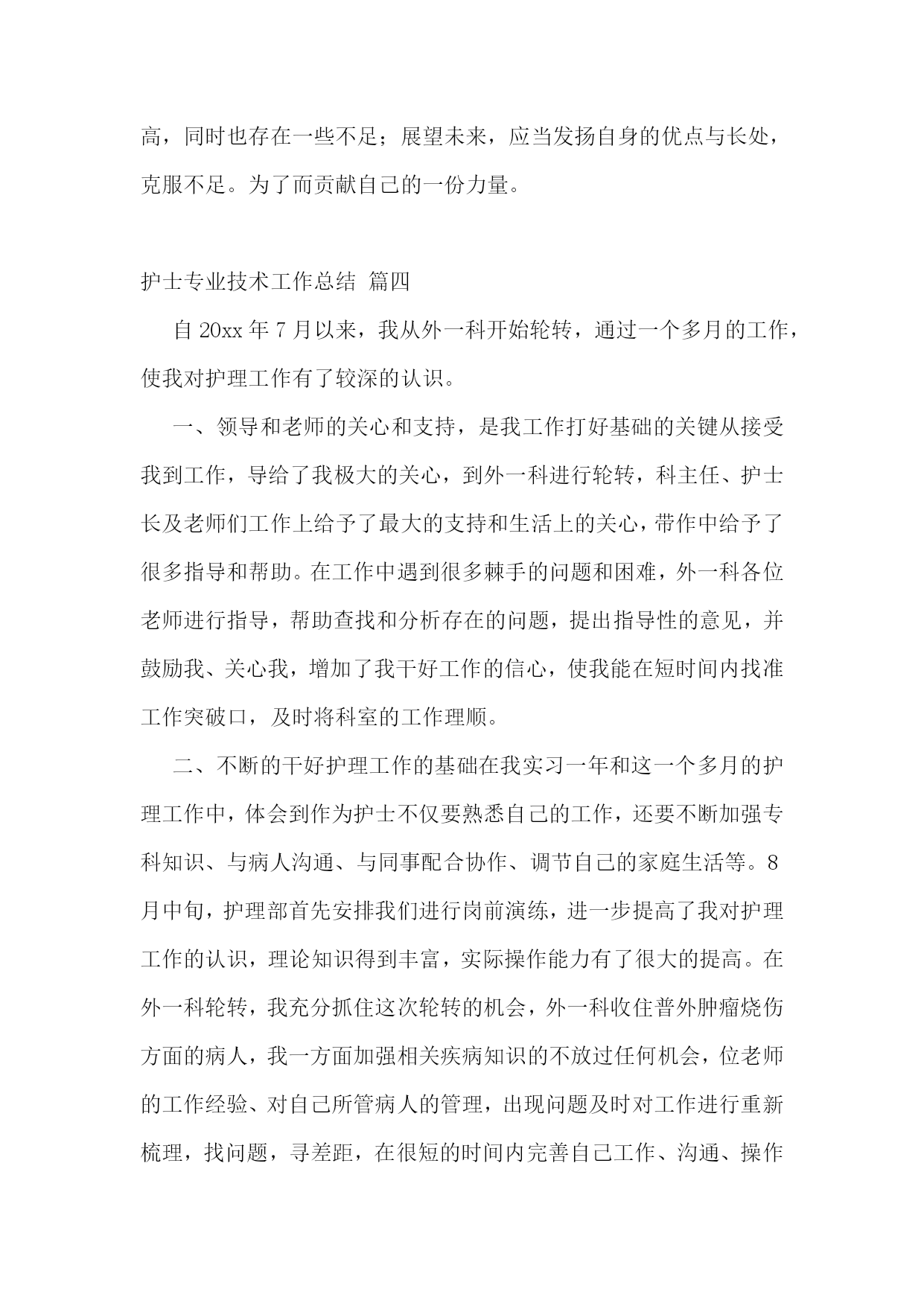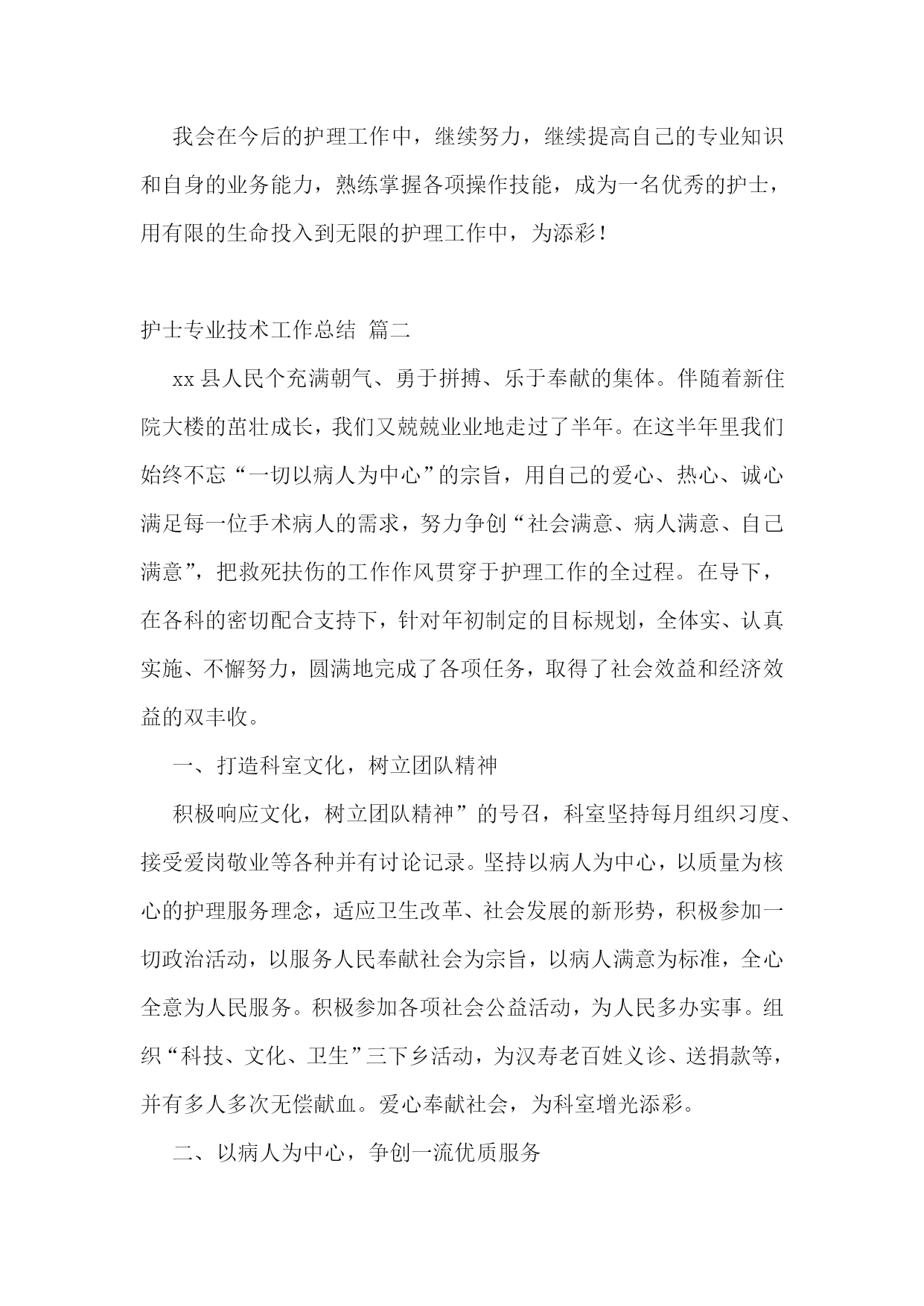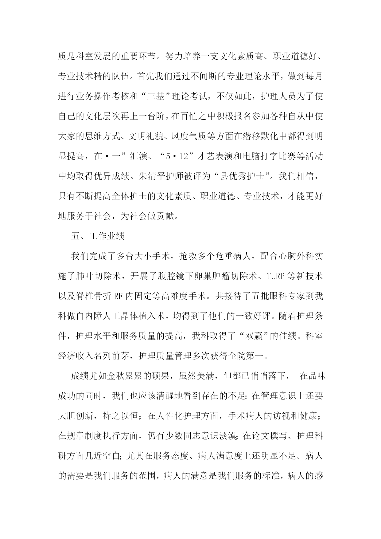 护士专业技术工作总结【优秀4篇】护士专业技术工作总结篇一20xx年度是我成为一名护理工作者的第四年,,我时刻不忘自己的职责,自觉履行护理工作者应尽的义务,遵守,积极完成科里和,积极参加活动和培训,通过不断的力提高自己的工作能力和个人素质。作为xxx我热爱的工作岗位,坚持以全心全意为病人服务为宗旨,以严谨的工作态度,娴熟的操作技术,兢兢业业,勤勤恳恳的工作。每次进行护理操作前,我都严格要求自己,认真执行各项操作规程,三查八对制度,以充分的爱心、耐心和责任心、对待每一位患者,让患者在积极面对疾病的同时,能感受到我们护理人员对他们的关心,以及为促进他们康复做出的努力。在工作态度上,我同样严格要求自己,遵守迟到,不早退,积极向上,要求进步,团结同事,互相帮助,共同协作。对于工作经验丰富的老师,虚心向他们请,对待年轻的同事,能做到有问必答,帮助她们熟悉护理工作,传授自己的经验。业余时间我也继续保持端正的进修、参加成人继续新的护理技术及护理经验。在加强自己专业素质的同时,我还很注重护士的职业形象,在平时工作中注意文明礼貌服务,坚持使用文明用语,使用尊称,总是面带微笑地对待每一位病人。工作时仪表端庄,着装整洁,不浓妆艳抹,不带首饰,符合临床着装的要求,体现白衣天使的精神。在工作期间还认真故处理条例》及其法律法规,积极参加事故处理条例了自己的法律知识,也增强了自己的安全保护意识,避免了为科室为影响。我会在今后的护理工作中,继续努力,继续提高自己的专业知识和自身的业务能力,熟练掌握各项操作技能,成为一名优秀的护士,用有限的生命投入到无限的护理工作中,为添彩!护士专业技术工作总结篇二xx县人民个充满朝气、勇于拼搏、乐于奉献的集体。伴随着新住院大楼的茁壮成长,我们又兢兢业业地走过了半年。在这半年里我们始终不忘“一切以病人为中心”的宗旨,用自己的爱心、热心、诚心满足每一位手术病人的需求,努力争创“社会满意、病人满意、自己满意”,把救死扶伤的工作作风贯穿于护理工作的全过程。在导下,在各科的密切配合支持下,针对年初制定的目标规划,全体实、认真实施、不懈努力,圆满地完成了各项任务,取得了社会效益和经济效益的双丰收。一、打造科室文化,树立团队精神积极响应文化,树立团队精神”的号召,科室坚持每月组织习度、接受爱岗敬业等各种并有讨论记录。坚持以病人为中心,以质量为核心的护理服务理念,适应卫生改革、社会发展的新形势,积极参加一切政治活动,以服务人民奉献社会为宗旨,以病人满意为标准,全心全意为人民服务。积极参加各项社会公益活动,为人民多办实事。组织“科技、文化、卫生”三下乡活动,为汉寿老百姓义诊、送捐款等,并有多人多次无偿献血。爱心奉献社会,为科室增光添彩。二、以病人为中心,争创一流优质服务在日常工作中,护理人员时刻牢记“以病人为中心”的服务宗旨,设身处地为病人着想,做到凡事都来换位思考“假如我是病人”。积极推行年初规划的“一对一全程服务”,接待好每一个手术病人,做好每一项工作,关心每一个病人,当病人入手术室时,护士在手术室门口热情迎接,自我介绍,做好各项安抚工作,加强与病人沟通,减少病人对陌生环境的恐惧,增强对手术治疗的信心。护士长经常询问同事的工作技术,态度及病人的要求,对病人提出的意见和建议都能予以重视,及时解决。三、规范整体护理,争创一流管理有好的管理是优质服务的基础和前提,为了使管理更加规范化和专业化,我们坚持做到周周有计划、月月有小结。建立健全服务目标,自觉接受病入及社会的监督。深入开展整体护理,积极发挥责任护士的主观能动性,特别加强术中关爱、术后指导、护理措施的落实、对手术室护士的满意度调查等工作,从而大大增强了护士的工作责任心。我科为了使整体护理做得更加完善,多次组织全体护士理的相关知识及人性化护理、循证护理、舒适护理等新理论。严格执行查对制度及护理操作规程,无差错事故发生。严格消毒、灭菌、隔离措施的落实、管理和监测。狠抓了护理人员的无菌技术操作,注射做到一人一针一管一巾一带。严格了一次性,一次性无菌注射器、输血、输液器等用后,消毒、毁形、焚烧,半年手术切口感染率0。四、提高护士素质、培养一流人才社会不断前进和发展,我们深刻体会到全面提高护理人员综合素质是科室发展的重要环节。努力培养一支文化素质高、职业道德好、专业技术精的队伍。首先我们通过不间断的专业理论水平,做到每月进行业务操作考核和“三基”理论考试,不仅如此,护理人员为了使自己的文化层次再上一台阶,在百忙之中积极报名参加各种自从中使大家的思维方式、文明礼貌、风度气质等方面在潜移默化中都得到明显提高,在·一”汇演、“5·12”才艺表演和电脑打字比赛等活动中均取得优异成绩。朱清平护师被评为“县优秀护士”。我们相信,只有不断提高全体护士的文化素质、职业道德、专业技术,