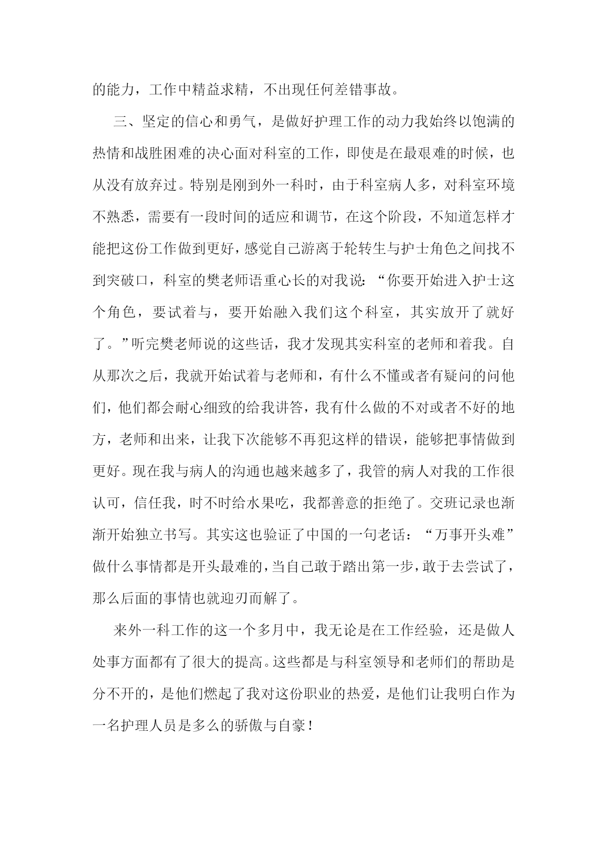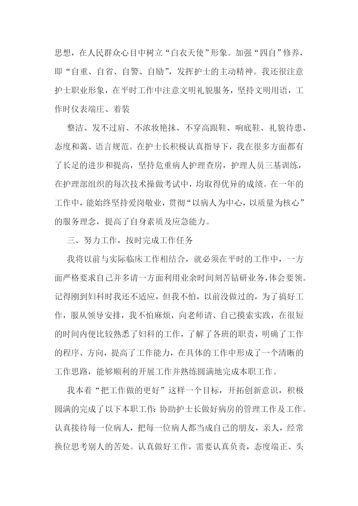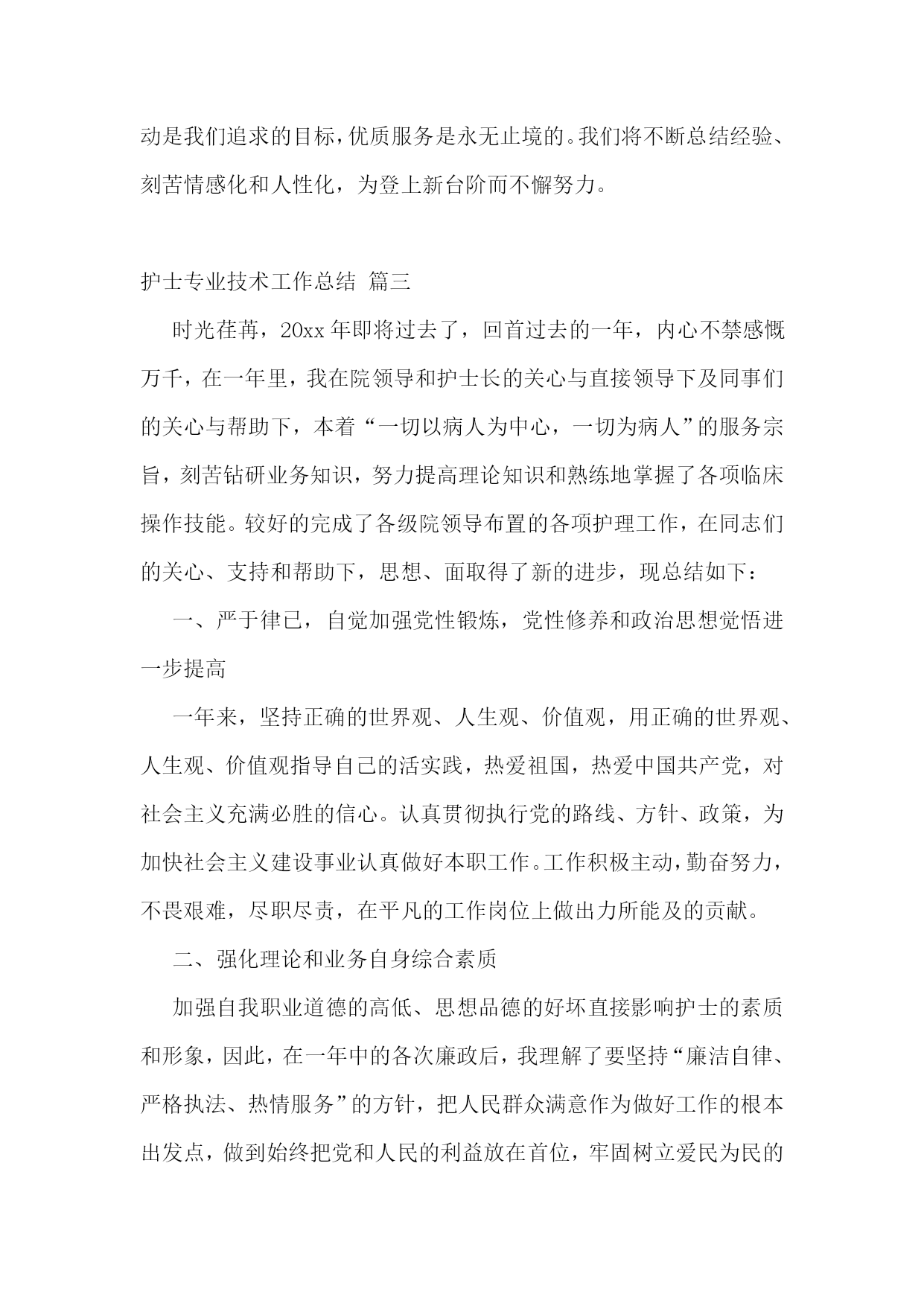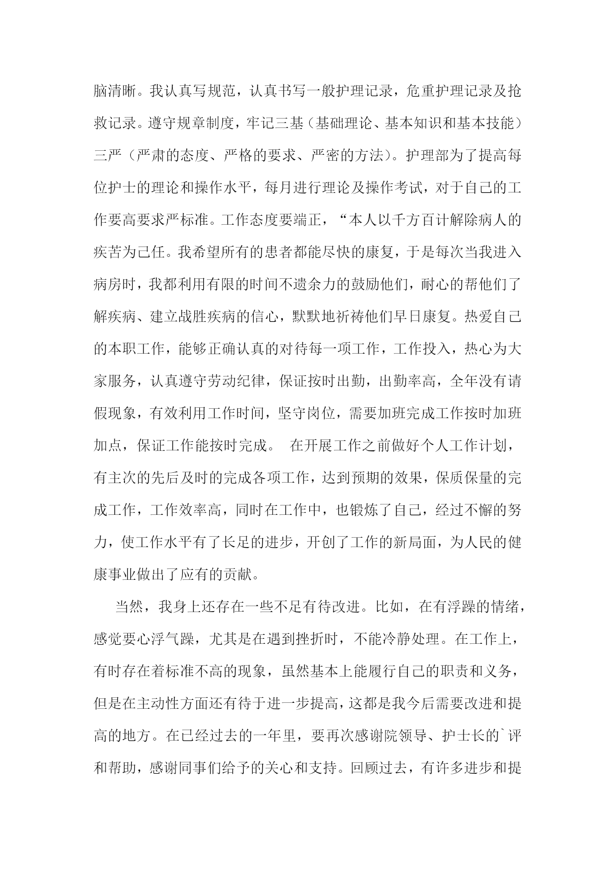 护士专业技术工作总结【优秀4篇】护士专业技术工作总结篇一20xx年度是我成为一名护理工作者的第四年,,我时刻不忘自己的职责,自觉履行护理工作者应尽的义务,遵守,积极完成科里和,积极参加活动和培训,通过不断的力提高自己的工作能力和个人素质。作为xxx我热爱的工作岗位,坚持以全心全意为病人服务为宗旨,以严谨的工作态度,娴熟的操作技术,兢兢业业,勤勤恳恳的工作。每次进行护理操作前,我都严格要求自己,认真执行各项操作规程,三查八对制度,以充分的爱心、耐心和责任心、对待每一位患者,让患者在积极面对疾病的同时,能感受到我们护理人员对他们的关心,以及为促进他们康复做出的努力。在工作态度上,我同样严格要求自己,遵守迟到,不早退,积极向上,要求进步,团结同事,互相帮助,共同协作。对于工作经验丰富的老师,虚心向他们请,对待年轻的同事,能做到有问必答,帮助她们熟悉护理工作,传授自己的经验。业余时间我也继续保持端正的进修、参加成人继续新的护理技术及护理经验。在加强自己专业素质的同时,我还很注重护士的职业形象,在平时工作中注意文明礼貌服务,坚持使用文明用语,使用尊称,总是面带微笑地对待每一位病人。工作时仪表端庄,着装整洁,不浓妆艳抹,不带首饰,符合临床着装的要求,体现白衣天使的精神。在工作期间还认真故处理条例》及其法律法规,积极参加事故处理条例了自己的法律知识,也增强了自己的安全保护意识,避免了为科室为影响。我会在今后的护理工作中,继续努力,继续提高自己的专业知识和自身的业务能力,熟练掌握各项操作技能,成为一名优秀的护士,用有限的生命投入到无限的护理工作中,为添彩!护士专业技术工作总结篇二xx县人民个充满朝气、勇于拼搏、乐于奉献的集体。伴随着新住院大楼的茁壮成长,我们又兢兢业业地走过了半年。在这半年里我们始终不忘“一切以病人为中心”的宗旨,用自己的爱心、热心、诚心满足每一位手术病人的需求,努力争创“社会满意、病人满意、自己满意”,把救死扶伤的工作作风贯穿于护理工作的全过程。在导下,在各科的密切配合支持下,针对年初制定的目标规划,全体实、认真实施、不懈努力,圆满地完成了各项任务,取得了社会效益和经济效益的双丰收。一、打造科室文化,树立团队精神积极响应文化,树立团队精神”的号召,科室坚持每月组织习度、接受爱岗敬业等各种并有讨论记录。坚持以病人为中心,以质量为核心的护理服务理念,适应卫生改革、社会发展的新形势,积极参加一切政治活动,以服务人民奉献社会为宗旨,以病人满意为标准,全心全意为人民服务。积极参加各项社会公益活动,为人民多办实事。组织“科技、文化、卫生”三下乡活动,为汉寿老百姓义诊、送捐款等,并有多人多次无偿献血。爱心奉献社会,为科室增光添彩。二、以病人为中心,争创一流优质服务在日常工作中,护理人员时刻牢记“以病人为中心”的服务宗旨,设身处地为病人着想,做到凡事都来换位思考“假如我是病人”。积极推行年初规划的“一对一全程服务”,接待好每一个手术病人,做好每一项工作,关心每一个病人,当病人入手术室时,护士在手术室门口热情迎接,自我介绍,做好各项安抚工作,加强与病人沟通,减少病人对陌生环境的恐惧,增强对手术治疗的信心。护士长经常询问同事的工作技术,态度及病人的要求,对病人提出的意见和建议都能予以重视,及时解决。三、规范整体护理,争创一流管理有好的管理是优质服务的基础和前提,为了使管理更加规范化和专业化,我们坚持做到周周有计划、月月有小结。建立健全服务目标,自觉接受病入及社会的监督。深入开展整体护理,积极发挥责任护士的主观能动性,特别加强术中关爱、术后指导、护理措施的落实、对手术室护士的满意度调查等工作,从而大大增强了护士的工作责任心。我科为了使整体护理做得更加完善,多次组织全体护士理的相关知识及人性化护理、循证护理、舒适护理等新理论。严格执行查对制度及护理操作规程,无差错事故发生。严格消毒、灭菌、隔离措施的落实、管理和监测。狠抓了护理人员的无菌技术操作,注射做到一人一针一管一巾一带。严格了一次性,一次性无菌注射器、输血、输液器等用后,消毒、毁形、焚烧,半年手术切口感染率0。四、提高护士素质、培养一流人才社会不断前进和发展,我们深刻体会到全面提高护理人员综合素质是科室发展的重要环节。努力培养一支文化素质高、职业道德好、专业技术精的队伍。首先我们通过不间断的专业理论水平,做到每月进行业务操作考核和“三基”理论考试,不仅如此,护理人员为了使自己的文化层次再上一台阶,在百忙之中积极报名参加各种自从中使大家的思维方式、文明礼貌、风度气质等方面在潜移默化中都得到明显提高,在·一”汇演、“5·12”才艺表演和电脑打字比赛等活动中均取得优异成绩。朱清平护师被评为“县优秀护士”。我们相信,只有不断提高全体护士的文化素质、职业道德、专业技术,