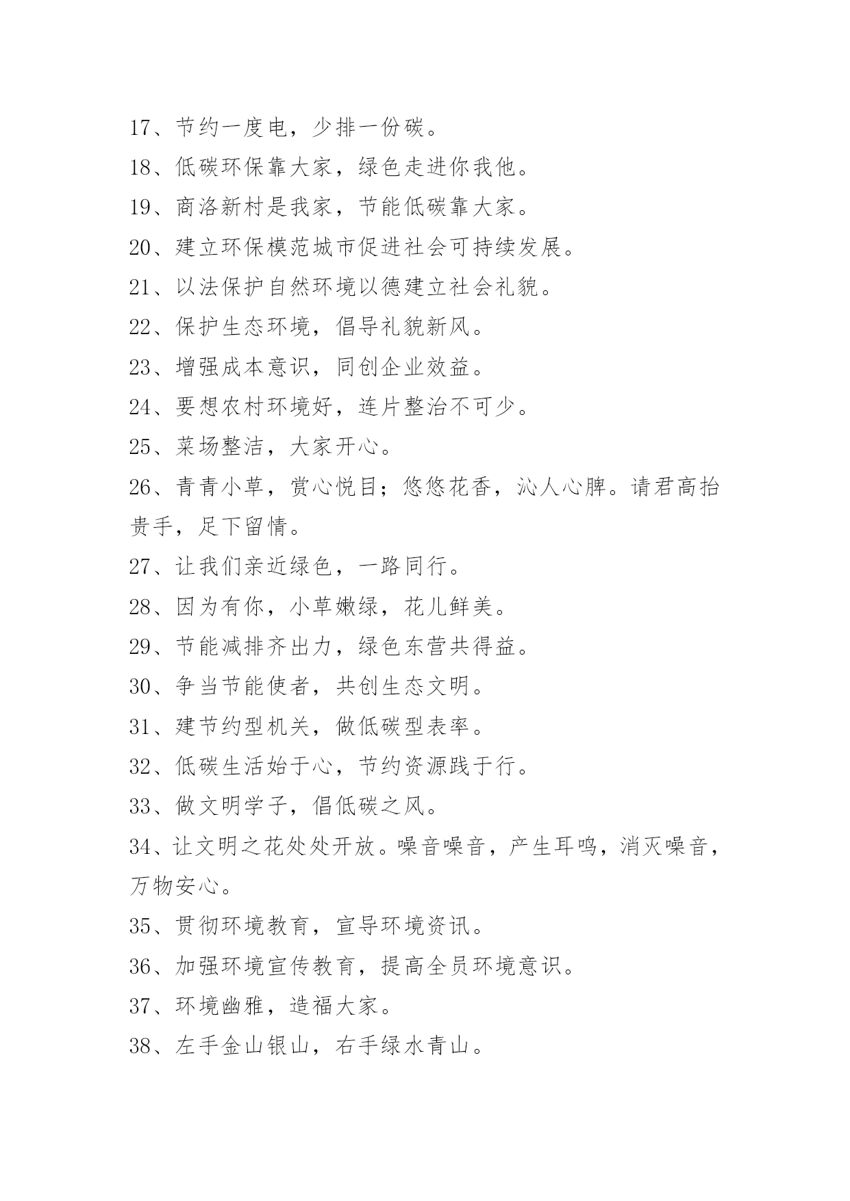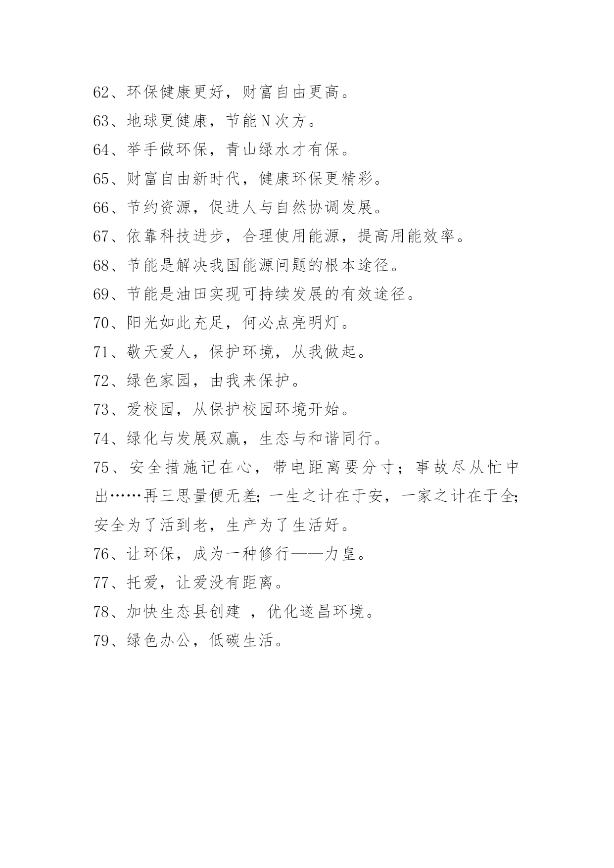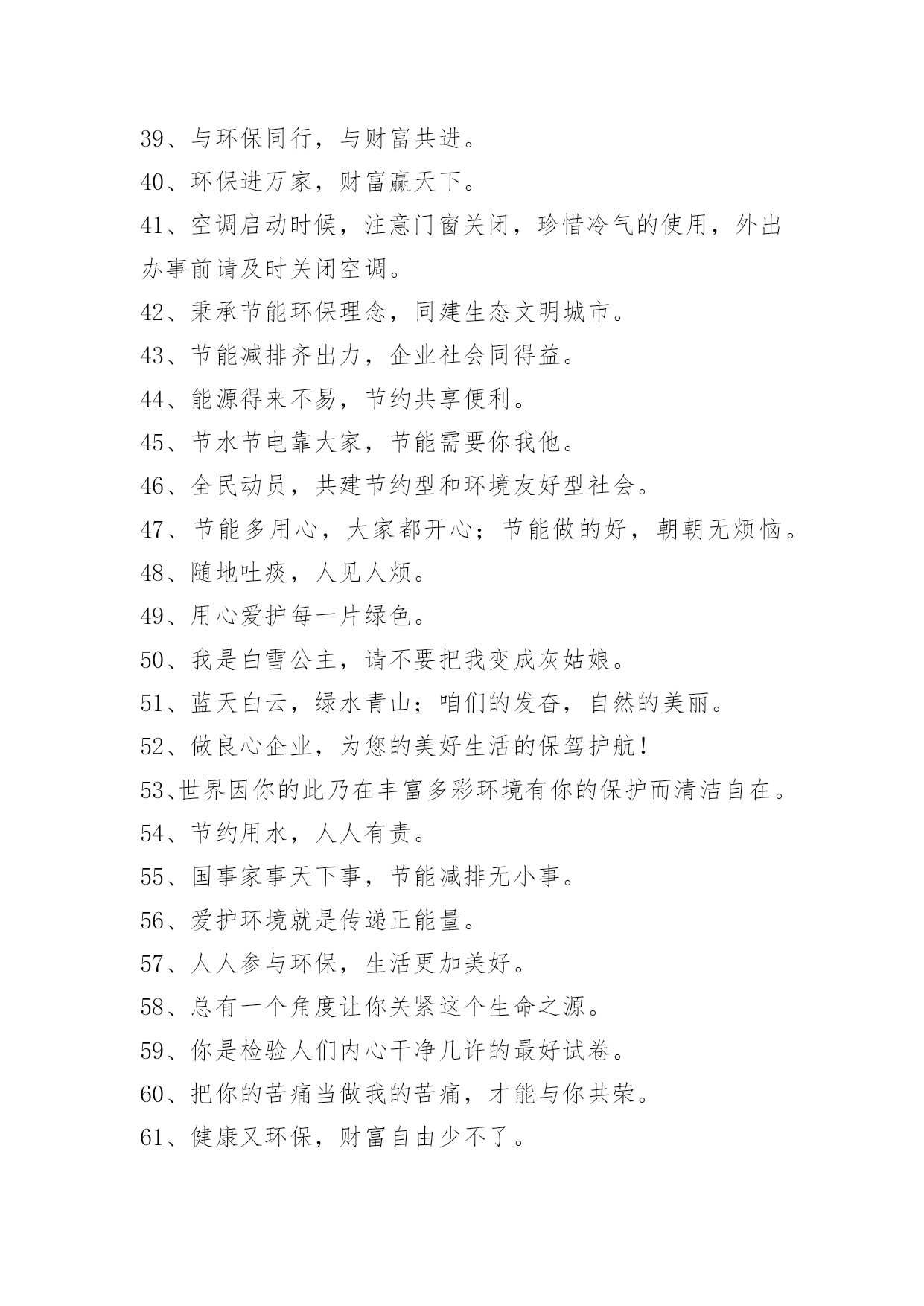 有个性的环保口号有个性的环保口号集合79句这个世界真美好,到处都是树和草。保护环境很重要,我们大家要环保。以下是小编为大家整理的有个性的环保口号79句,欢迎大家分享。1、莫吐痰于地,常扔纸于篓。2、你在我心中最美,请不要将我摧毁。3、能源有限,节约无限。4、心随环境而变,为你打造心的空间。5、丢掉的是品质,捡起的'是美德!6、节约能源有诀窍,建筑节能很重要。7、源于执着奔放,释放美的根基。8、居住改变中国,科屹改变生活。9、绿色的山,绿色的水和蓝天创造了一个更美好的世界。10、碧水蓝天,力皇行先。11、保护人居环境,享受美好人生。12、提高环保意识,争做环保公民。13、保护环境是每个公民应尽的责任。14、小草有生命,请君足留情。15、爱护碧水蓝天,拥抱完美明天。16、同享一片蓝天,共创无限和谐。打造一方净土,共享一片蓝天。17、节约一度电,少排一份碳。18、低碳环保靠大家,绿色走进你我他。19、商洛新村是我家,节能低碳靠大家。20、建立环保模范城市促进社会可持续发展。21、以法保护自然环境以德建立社会礼貌。22、保护生态环境,倡导礼貌新风。23、增强成本意识,同创企业效益。24、要想农村环境好,连片整治不可少。25、菜场整洁,大家开心。26、青青小草,赏心悦目;悠悠花香,沁人心脾。请君高抬贵手,足下留情。27、让我们亲近绿色,一路同行。28、因为有你,小草嫩绿,花儿鲜美。29、节能减排齐出力,绿色东营共得益。30、争当节能使者,共创生态文明。31、建节约型机关,做低碳型表率。32、低碳生活始于心,节约资源践于行。33、做文明学子,倡低碳之风。34、让文明之花处处开放。噪音噪音,产生耳鸣,消灭噪音,万物安心。35、贯彻环境教育,宣导环境资讯。36、加强环境宣传教育,提高全员环境意识。37、环境幽雅,造福大家。38、左手金山银山,右手绿水青山。39、与环保同行,与财富共进。40、环保进万家,财富赢天下。41、空调启动时候,注意门窗关闭,珍惜冷气的使用,外出办事前请及时关闭空调。42、秉承节能环保理念,同建生态文明城市。43、节能减排齐出力,企业社会同得益。44、能源得来不易,节约共享便利。45、节水节电靠大家,节能需要你我他。46、全民动员,共建节约型和环境友好型社会。47、节能多用心,大家都开心;节能做的好,朝朝无烦恼。48、随地吐痰,人见人烦。49、用心爱护每一片绿色。50、我是白雪公主,请不要把我变成灰姑娘。51、蓝天白云,绿水青山;咱们的发奋,自然的美丽。52、做良心企业,为您的美好生活的保驾护航!53、世界因你的此乃在丰富多彩环境有你的保护而清洁自在。54、节约用水,人人有责。55、国事家事天下事,节能减排无小事。56、爱护环境就是传递正能量。57、人人参与环保,生活更加美好。58、总有一个角度让你关紧这个生命之源。59、你是检验人们内心干净几许的最好试卷。60、把你的苦痛当做我的苦痛,才能与你共荣。61、健康又环保,财富自由少不了。62、环保健康更好,财富自由更高。63、地球更健康,节能N次方。64、举手做环保,青山绿水才有保。65、财富自由新时代,健康环保更精彩。66、节约资源,促进人与自然协调发展。67、依靠科技进步,合理使用能源,提高用能效率。68、节能是解决我国能源问题的根本途径。69、节能是油田实现可持续发展的有效途径。70、阳光如此充足,何必点亮明灯。71、敬天爱人,保护环境,从我做起。72、绿色家园,由我来保护。73、爱校园,从保护校园环境开始。74、绿化与发展双赢,生态与和谐同行。75、安全措施记在心,带电距离要分寸;事故尽从忙中出……再三思量便无差;一生之计在于安,一家之计在于全;安全为了活到老,生产为了生活好。76、让环保,成为一种修行——力皇。77、托爱,让爱没有距离。78、加快生态县创建,优化遂昌环境。79、绿色办公,低碳生活。