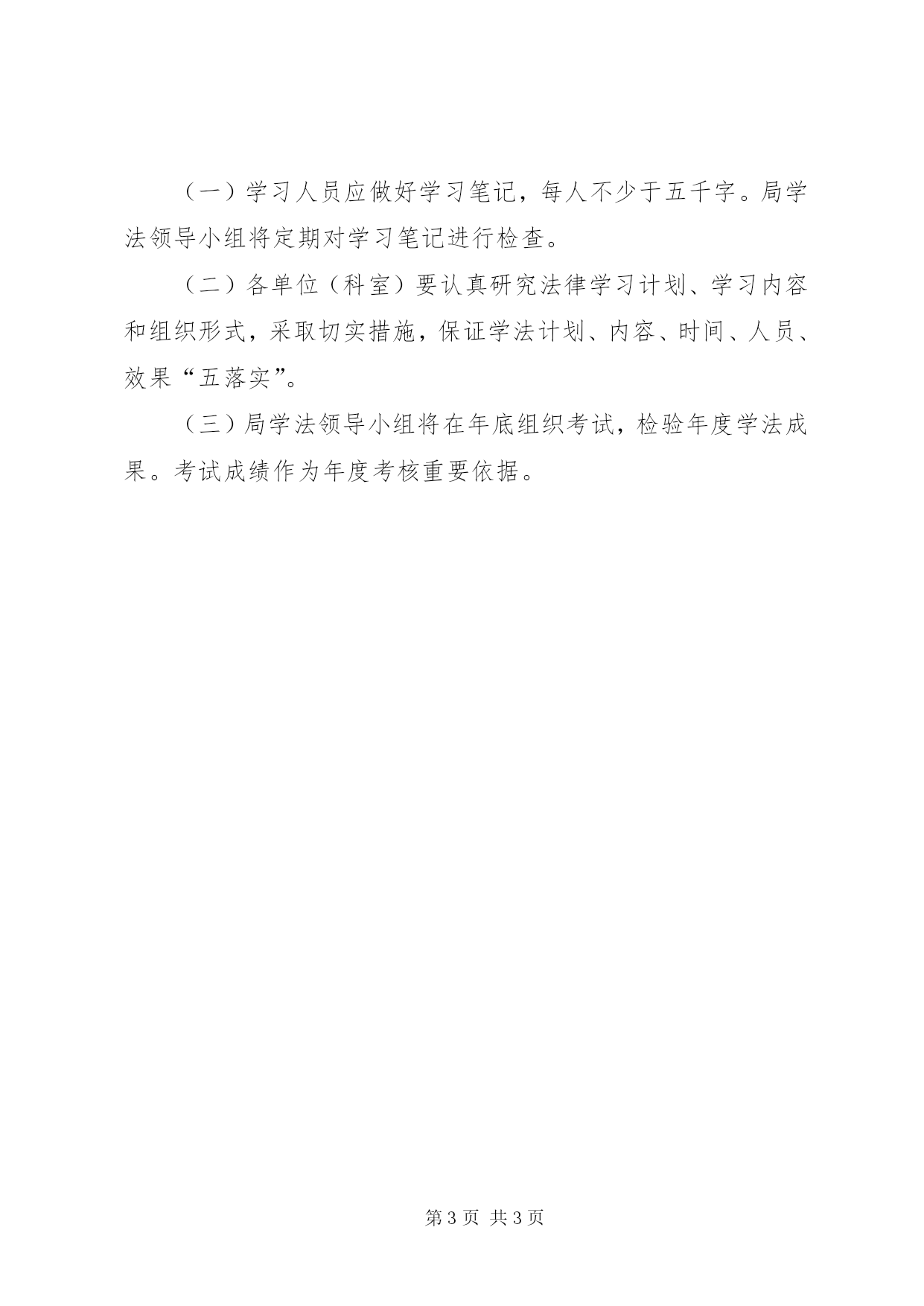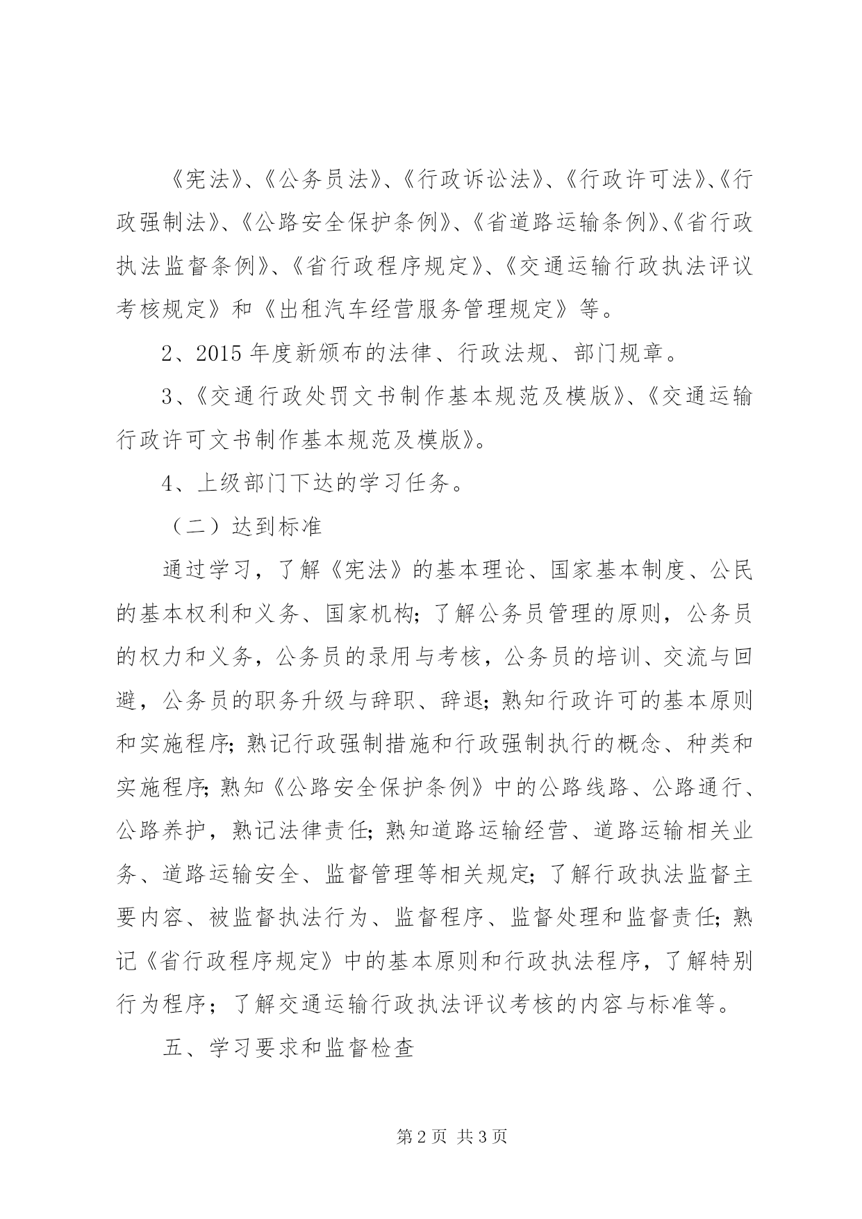 第PAGE\*Arabic\*MERGEFORMAT3页共NUMPAGES\*MERGEFORMAT3页交通局学法工作方案为保证二○一五年度学法计划、内容、时间、人员、效果“五落实”,通过学法进一步提高领导干部依法行政和依法决策的能力,增进交通运输系统工作人员的社会主义法治理念,提高交通运输行政执法人员行业管理水平,确保交通运输法律法规的正确实施,制定本方案。一、组织领导成立二○一五年度学法领导小组,局主要领导为组长,各分管领导为副组长,局直各单位、科室负责人为小组成员。二、参加学习人员范围领导干部、一般工作人员、行政执法人员。三、学习时间(一)自学时间1、领导干部全年自学时间不少于50学时。2、一般工作人员全年自学时间不少于70学时。3、行政执法人员全年自学时间不少于100学时。(二)集体学习时间不少于40学时集体学习由局法制科统一组织。四、学习内容和达到标准(一)学习内容1、法律、行政法规、规章《宪法》、《公务员法》、《行政诉讼法》、《行政许可法》、《行政强制法》、《公路安全保护条例》、《省道路运输条例》、《省行政执法监督条例》、《省行政程序规定》、《交通运输行政执法评议考核规定》和《出租汽车经营服务管理规定》等。2、2015年度新颁布的法律、行政法规、部门规章。3、《交通行政处罚文书制作基本规范及模版》、《交通运输行政许可文书制作基本规范及模版》。4、上级部门下达的学习任务。(二)达到标准通过学习,了解《宪法》的基本理论、国家基本制度、公民的基本权利和义务、国家机构;了解公务员管理的原则,公务员的权力和义务,公务员的录用与考核,公务员的培训、交流与回避,公务员的职务升级与辞职、辞退;熟知行政许可的基本原则和实施程序;熟记行政强制措施和行政强制执行的概念、种类和实施程序;熟知《公路安全保护条例》中的公路线路、公路通行、公路养护,熟记法律责任;熟知道路运输经营、道路运输相关业务、道路运输安全、监督管理等相关规定;了解行政执法监督主要内容、被监督执法行为、监督程序、监督处理和监督责任;熟记《省行政程序规定》中的基本原则和行政执法程序,了解特别行为程序;了解交通运输行政执法评议考核的内容与标准等。五、学习要求和监督检查(一)学习人员应做好学习笔记,每人不少于五千字。局学法领导小组将定期对学习笔记进行检查。(二)各单位(科室)要认真研究法律学习计划、学习内容和组织形式,采取切实措施,保证学法计划、内容、时间、人员、效果“五落实”。(三)局学法领导小组将在年底组织考试,检验年度学法成果。考试成绩作为年度考核重要依据。