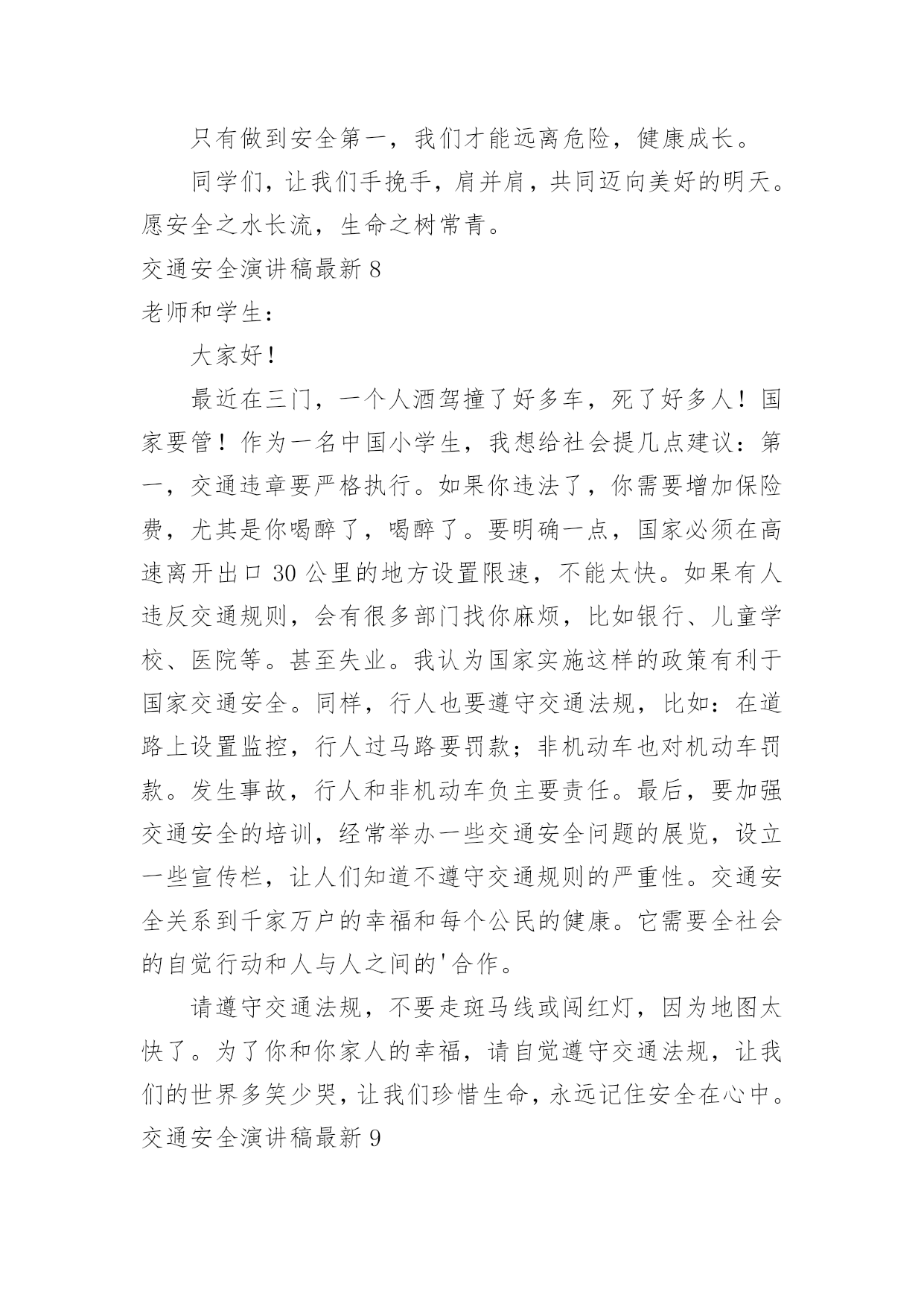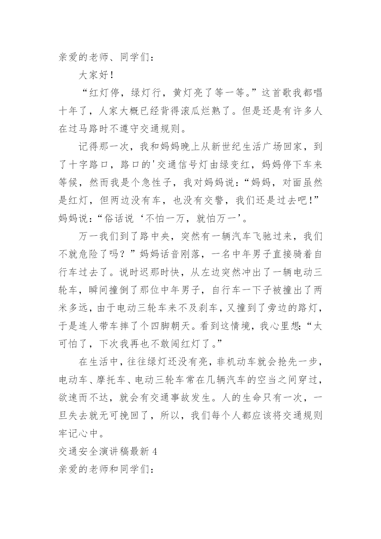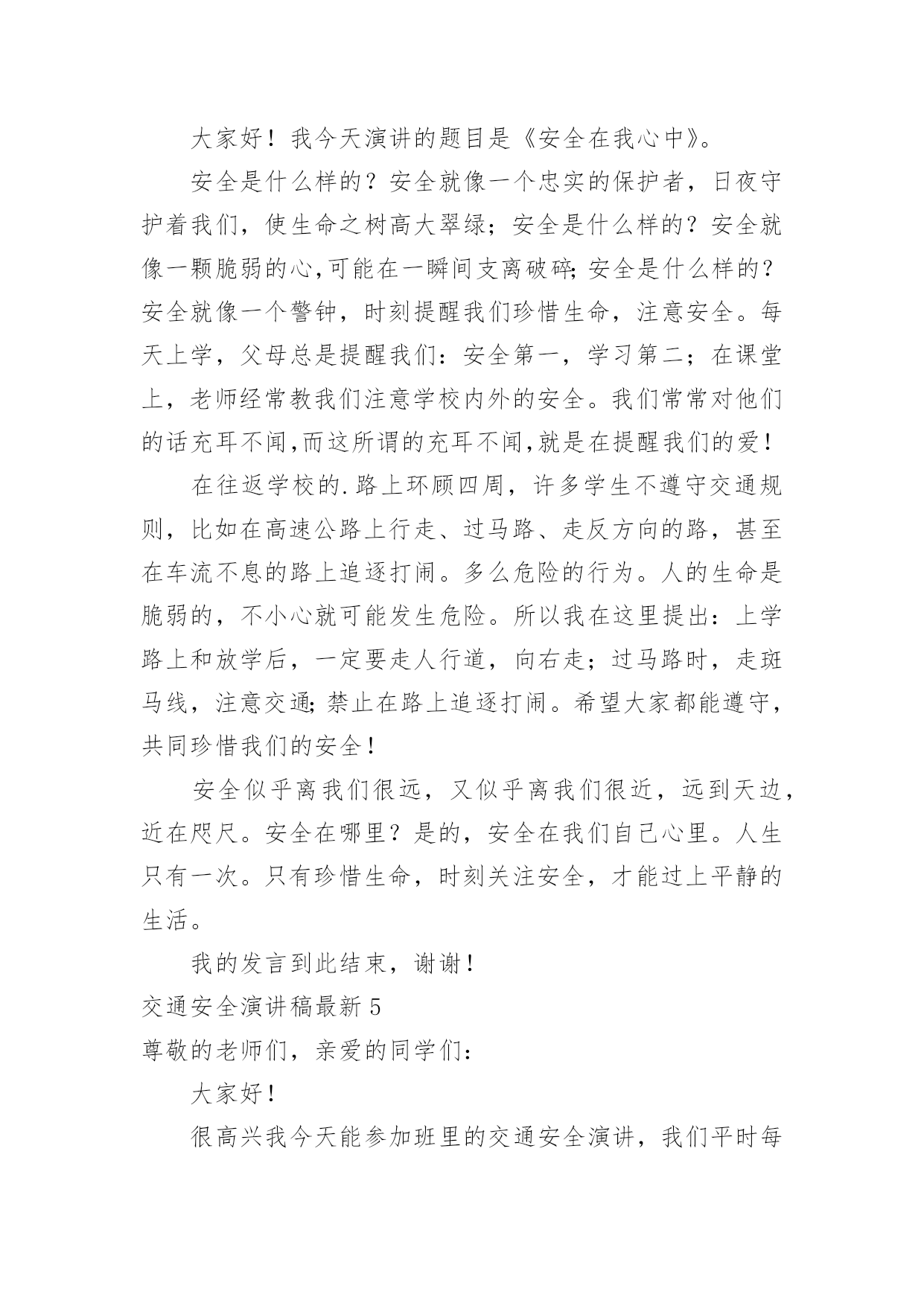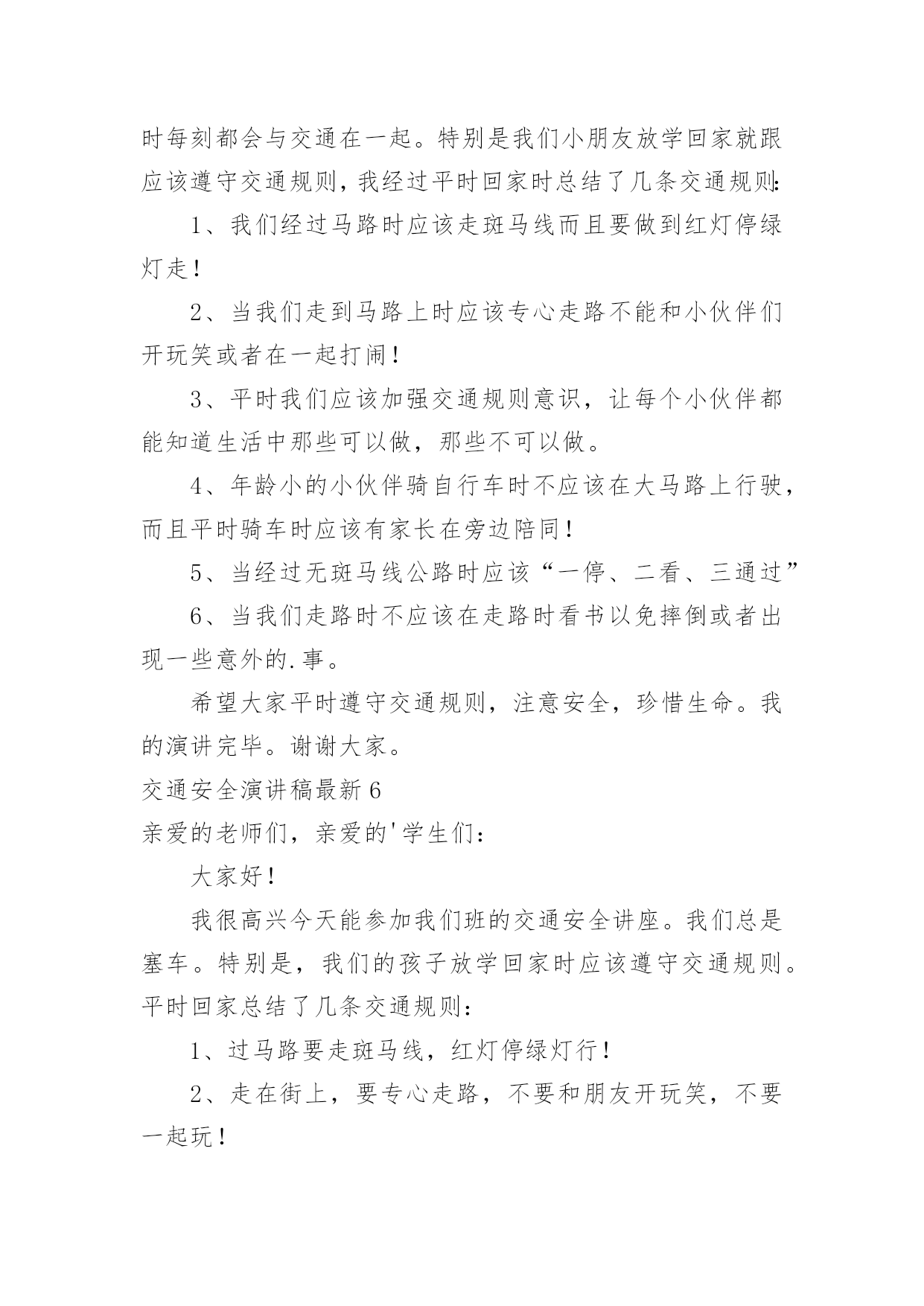 交通安全演讲稿最新交通安全演讲稿最新演讲稿要求内容充实,条理清楚,重点突出。在我们平凡的日常里,我们都可能会用到演讲稿,你所见过的演讲稿是什么样的呢?以下是小编精心整理的交通安全演讲稿最新,仅供参考,希望能够帮助到大家。交通安全演讲稿最新1尊敬的老师、亲爱的同学们:大家好!在现代社会,我们的生活离不开交通,交通安全也是一个不容忽视的问题,必须言出必行,从我做起。然而,有些人不注意交通安全。你有没有想过,一点点的疏忽,可能会让你后悔一辈子?记得有一次,我从学校走回家的路上,突然听到不远处有“嘘——”的`紧急刹车声和撞车声。听说一辆校车和一辆转弯的车相撞,车头撞上了校车尾部,校车的油漆被撞掉了,有的变形了,车的大灯也下来了。当时我的心猛地一抖,心想:校车上那么多学生有多危险!如果司机反应稍微慢一点,含苞待放的小花车可能还没开就被车祸撞死了。一想到这我就吓出一身冷汗。这时候双方业主吵起来了,我也靠近了一点。听说车主身上有股难闻的酒味,显然喝了不少酒。这时,交警也赶到现场处理交通事故。那些酒驾的人,不要让自己的生命徘徊在生死线上;不遵守交通规则的,请遵守交通规则!作为一名小学生,我必须以身作则,严格遵守交通规则。交通安全,从我做起。这是一个迫切的问题。让我们珍惜生命,关注交通安全。交通安全演讲稿最新2敬爱的老师们,亲爱的同学们:大家好!相信大家都听到过“平安是福,平安是金”的话语,今天我演讲的题目就是《文明交通,与安全手拉手》。“红灯停,绿灯行”,“过马路,一停,二看,三通过”,这些交通知识,每一位同学都应牢记于心。车祸猛如虎,滚滚的车轮不知夺去了多少人的生命。因此,在马路上行走,一定要注意安全,千万不要在马路上玩游戏,也不能在马路上踢足球。在乘车时,不要把头伸出窗外。过马路时,应走斑马线。“文明交通,从我做起”,我们小学生也向所有关心我们成长的'大人们郑重承诺:一定学好交通安全知识,自觉遵守交通法规,并用我们的小手去拉爸爸、妈妈的大手,文明交通一起走。决不随意穿马路、闯红灯,决不在公路上追逐玩耍并排走,时时处处做一个遵守交通法规,关心他人的文明好少年。交通安全演讲稿最新3亲爱的老师、同学们:大家好!“红灯停,绿灯行,黄灯亮了等一等。”这首歌我都唱十年了,人家大概已经背得滚瓜烂熟了。但是还是有许多人在过马路时不遵守交通规则。记得那一次,我和妈妈晚上从新世纪生活广场回家,到了十字路口,路口的'交通信号灯由绿变红,妈妈停下车来等候,然而我是个急性子,我对妈妈说:“妈妈,对面虽然是红灯,但两边没有车,也没有交警,我们还是过去吧!”妈妈说:“俗话说‘不怕一万,就怕万一’。万一我们到了路中央,突然有一辆汽车飞驰过来,我们不就危险了吗?”妈妈话音刚落,一名中年男子直接骑着自行车过去了。说时迟那时快,从左边突然冲出了一辆电动三轮车,瞬间撞倒了那位中年男子,自行车一下子被撞出了两米多远,由于电动三轮车来不及刹车,又撞到了旁边的路灯,于是连人带车摔了个四脚朝天。看到这情境,我心里想:“太可怕了,下次我再也不敢闯红灯了。”在生活中,往往绿灯还没有亮,非机动车就会抢先一步,电动车、摩托车、电动三轮车常在几辆汽车的空当之间穿过,欲速而不达,就会有交通事故发生。人的生命只有一次,一旦失去就无可挽回了,所以,我们每个人都应该将交通规则牢记心中。交通安全演讲稿最新4亲爱的老师和同学们:大家好!我今天演讲的题目是《安全在我心中》。安全是什么样的?安全就像一个忠实的保护者,日夜守护着我们,使生命之树高大翠绿;安全是什么样的?安全就像一颗脆弱的心,可能在一瞬间支离破碎;安全是什么样的?安全就像一个警钟,时刻提醒我们珍惜生命,注意安全。每天上学,父母总是提醒我们:安全第一,学习第二;在课堂上,老师经常教我们注意学校内外的安全。我们常常对他们的话充耳不闻,而这所谓的充耳不闻,就是在提醒我们的爱!在往返学校的.路上环顾四周,许多学生不遵守交通规则,比如在高速公路上行走、过马路、走反方向的路,甚至在车流不息的路上追逐打闹。多么危险的行为。人的生命是脆弱的,不小心就可能发生危险。所以我在这里提出:上学路上和放学后,一定要走人行道,向右走;过马路时,走斑马线,注意交通;禁止在路上追逐打闹。希望大家都能遵守,共同珍惜我们的安全!安全似乎离我们很远,又似乎离我们很近,远到天边,近在咫尺。安全在哪里?是的,安全在我们自己心里。人生只有一次。只有珍惜生命,时刻关注安全,才能过上平静的生活。我的发言到此结束,谢谢!交通安全演讲稿最新5尊敬的老师们,亲爱的同学们:大家好!很高兴我今天能参加班里的交通安全演讲,我们平时每时每刻都会与交通在一起。特别是我们小朋友放学回家就跟应该遵守交通规则,我经过平时回家时总结了几条交通规则:1、我们经过马路时应该走斑马线而且要做到红灯停绿灯走!2、当我们走到