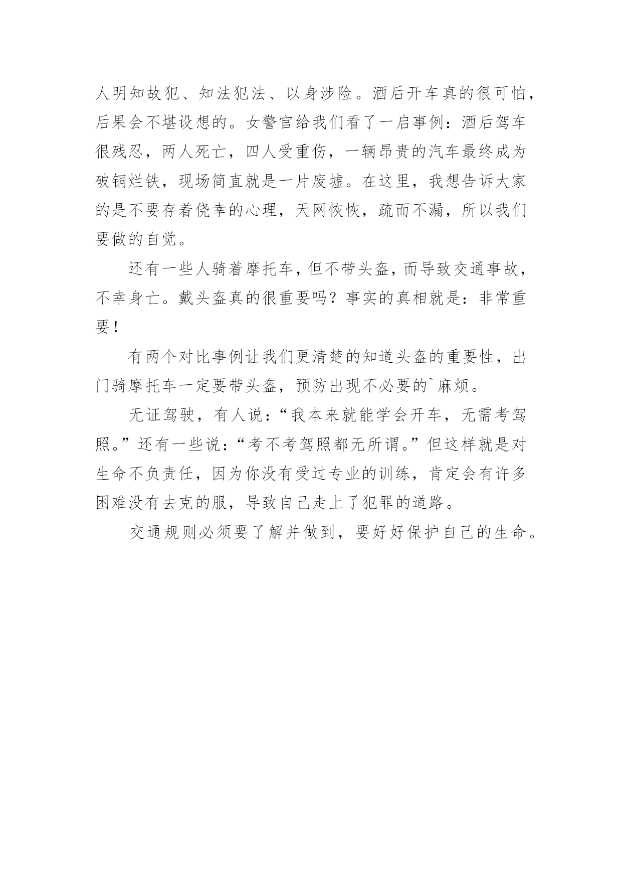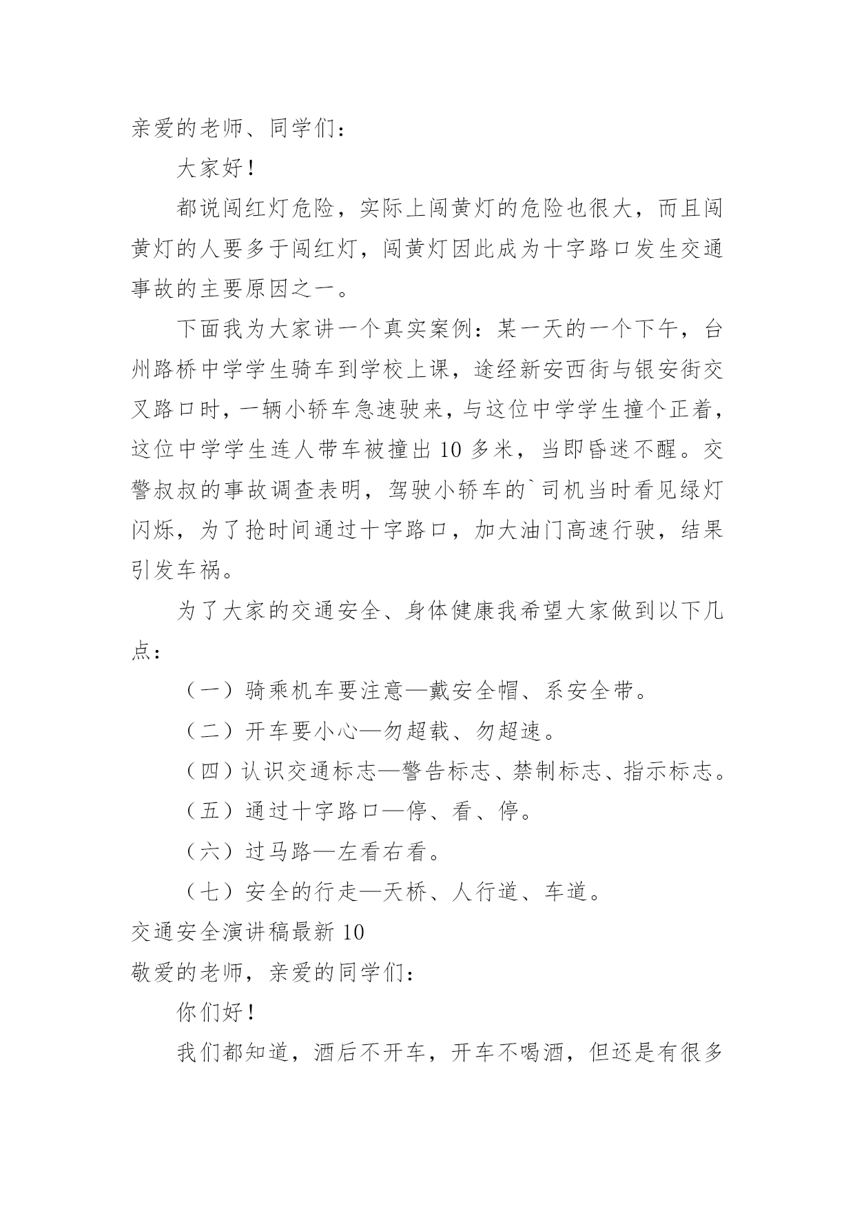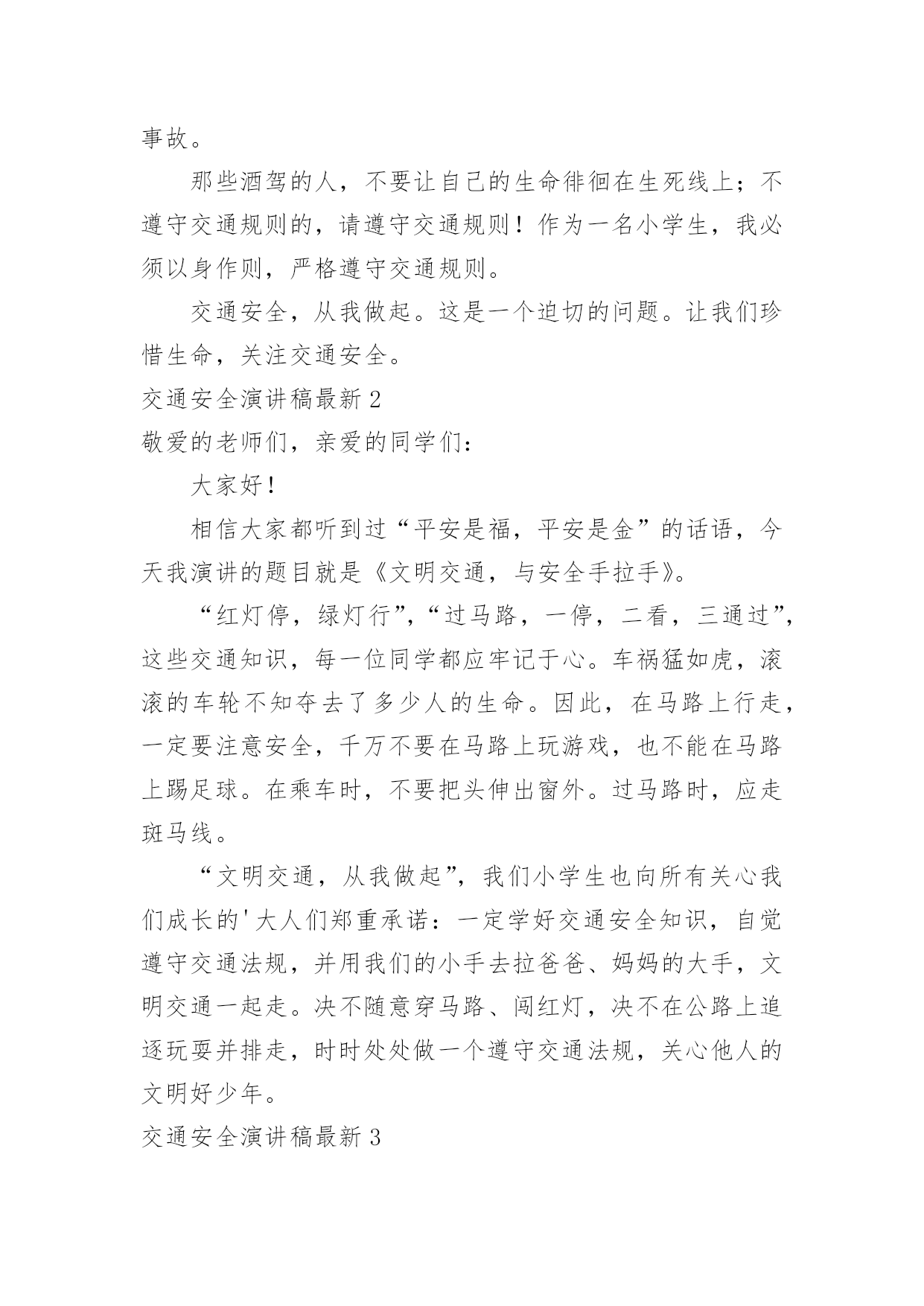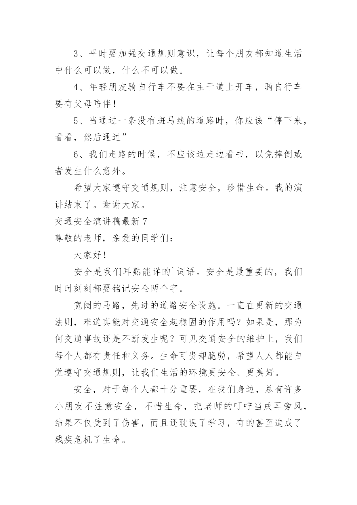 交通安全演讲稿最新交通安全演讲稿最新演讲稿要求内容充实,条理清楚,重点突出。在我们平凡的日常里,我们都可能会用到演讲稿,你所见过的演讲稿是什么样的呢?以下是小编精心整理的交通安全演讲稿最新,仅供参考,希望能够帮助到大家。交通安全演讲稿最新1尊敬的老师、亲爱的同学们:大家好!在现代社会,我们的生活离不开交通,交通安全也是一个不容忽视的问题,必须言出必行,从我做起。然而,有些人不注意交通安全。你有没有想过,一点点的疏忽,可能会让你后悔一辈子?记得有一次,我从学校走回家的路上,突然听到不远处有“嘘——”的`紧急刹车声和撞车声。听说一辆校车和一辆转弯的车相撞,车头撞上了校车尾部,校车的油漆被撞掉了,有的变形了,车的大灯也下来了。当时我的心猛地一抖,心想:校车上那么多学生有多危险!如果司机反应稍微慢一点,含苞待放的小花车可能还没开就被车祸撞死了。一想到这我就吓出一身冷汗。这时候双方业主吵起来了,我也靠近了一点。听说车主身上有股难闻的酒味,显然喝了不少酒。这时,交警也赶到现场处理交通事故。那些酒驾的人,不要让自己的生命徘徊在生死线上;不遵守交通规则的,请遵守交通规则!作为一名小学生,我必须以身作则,严格遵守交通规则。交通安全,从我做起。这是一个迫切的问题。让我们珍惜生命,关注交通安全。交通安全演讲稿最新2敬爱的老师们,亲爱的同学们:大家好!相信大家都听到过“平安是福,平安是金”的话语,今天我演讲的题目就是《文明交通,与安全手拉手》。“红灯停,绿灯行”,“过马路,一停,二看,三通过”,这些交通知识,每一位同学都应牢记于心。车祸猛如虎,滚滚的车轮不知夺去了多少人的生命。因此,在马路上行走,一定要注意安全,千万不要在马路上玩游戏,也不能在马路上踢足球。在乘车时,不要把头伸出窗外。过马路时,应走斑马线。“文明交通,从我做起”,我们小学生也向所有关心我们成长的'大人们郑重承诺:一定学好交通安全知识,自觉遵守交通法规,并用我们的小手去拉爸爸、妈妈的大手,文明交通一起走。决不随意穿马路、闯红灯,决不在公路上追逐玩耍并排走,时时处处做一个遵守交通法规,关心他人的文明好少年。交通安全演讲稿最新3亲爱的老师、同学们:大家好!“红灯停,绿灯行,黄灯亮了等一等。”这首歌我都唱十年了,人家大概已经背得滚瓜烂熟了。但是还是有许多人在过马路时不遵守交通规则。记得那一次,我和妈妈晚上从新世纪生活广场回家,到了十字路口,路口的'交通信号灯由绿变红,妈妈停下车来等候,然而我是个急性子,我对妈妈说:“妈妈,对面虽然是红灯,但两边没有车,也没有交警,我们还是过去吧!”妈妈说:“俗话说‘不怕一万,就怕万一’。万一我们到了路中央,突然有一辆汽车飞驰过来,我们不就危险了吗?”妈妈话音刚落,一名中年男子直接骑着自行车过去了。说时迟那时快,从左边突然冲出了一辆电动三轮车,瞬间撞倒了那位中年男子,自行车一下子被撞出了两米多远,由于电动三轮车来不及刹车,又撞到了旁边的路灯,于是连人带车摔了个四脚朝天。看到这情境,我心里想:“太可怕了,下次我再也不敢闯红灯了。”在生活中,往往绿灯还没有亮,非机动车就会抢先一步,电动车、摩托车、电动三轮车常在几辆汽车的空当之间穿过,欲速而不达,就会有交通事故发生。人的生命只有一次,一旦失去就无可挽回了,所以,我们每个人都应该将交通规则牢记心中。交通安全演讲稿最新4亲爱的老师和同学们:大家好!我今天演讲的题目是《安全在我心中》。安全是什么样的?安全就像一个忠实的保护者,日夜守护着我们,使生命之树高大翠绿;安全是什么样的?安全就像一颗脆弱的心,可能在一瞬间支离破碎;安全是什么样的?安全就像一个警钟,时刻提醒我们珍惜生命,注意安全。每天上学,父母总是提醒我们:安全第一,学习第二;在课堂上,老师经常教我们注意学校内外的安全。我们常常对他们的话充耳不闻,而这所谓的充耳不闻,就是在提醒我们的爱!在往返学校的.路上环顾四周,许多学生不遵守交通规则,比如在高速公路上行走、过马路、走反方向的路,甚至在车流不息的路上追逐打闹。多么危险的行为。人的生命是脆弱的,不小心就可能发生危险。所以我在这里提出:上学路上和放学后,一定要走人行道,向右走;过马路时,走斑马线,注意交通;禁止在路上追逐打闹。希望大家都能遵守,共同珍惜我们的安全!安全似乎离我们很远,又似乎离我们很近,远到天边,近在咫尺。安全在哪里?是的,安全在我们自己心里。人生只有一次。只有珍惜生命,时刻关注安全,才能过上平静的生活。我的发言到此结束,谢谢!交通安全演讲稿最新5尊敬的老师们,亲爱的同学们:大家好!很高兴我今天能参加班里的交通安全演讲,我们平时每时每刻都会与交通在一起。特别是我们小朋友放学回家就跟应该遵守交通规则,我经过平时回家时总结了几条交通规则:1、我们经过马路时应该走斑马线而且要做到红灯停绿灯走!2、当我们走到