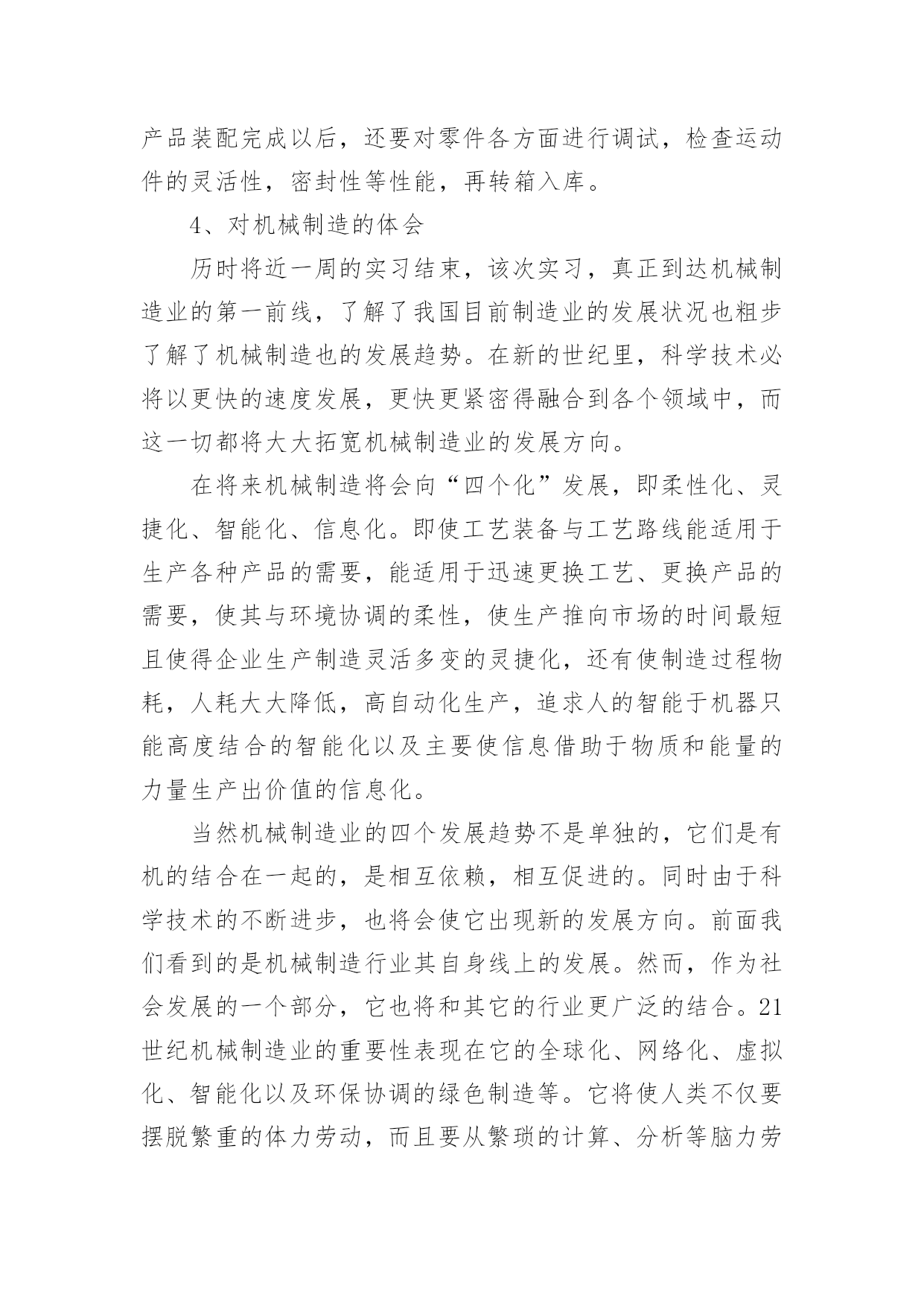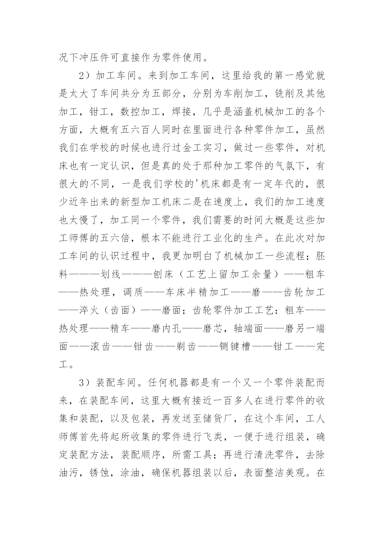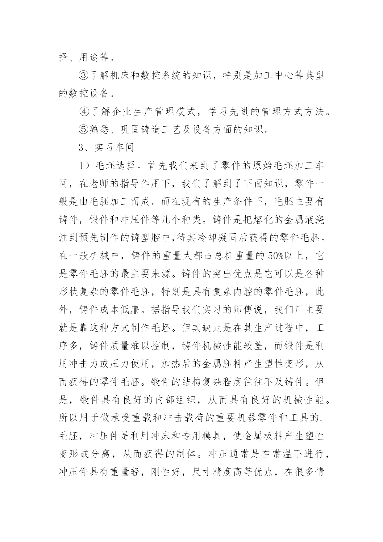 机械生产实习报告机械生产实习报告集合15篇在当下这个社会中,报告使用的频率越来越高,我们在写报告的时候要注意逻辑的合理性。那么报告应该怎么写才合适呢?下面是小编整理的机械生产实习报告,欢迎阅读与收藏。机械生产实习报告11、实习目的:生产实习是我们机自专业知识结构中不可缺少的组成部分,并作为一个独立的项目列入专业教学计划中的。其目的在于通过实习使学生获得基本生产的感性知识,理论联系实际,扩大知识面;同时专业实习又是锻炼和培养学生业务能力及素质的重要渠道,培养当代大学生具有吃苦耐劳的精神,也是学生接触社会、了解产业状况、了解国情的一个重要途径,逐步实现由学生到社会的转变,培养我们初步担任技术工作的能力、初步了解企业管理的基本方法和技能;体验企业工作的内容和方法。这些实际知识,对我们学习后面的课程乃至以后的工作,都是十分必要的基础。2、实习内容:①掌握机械加工工艺方面的知识及方法。②了解切削刀具方面的知识,熟悉常用刀具的结构、选择、用途等。③了解机床和数控系统的知识,特别是加工中心等典型的数控设备。④了解企业生产管理模式,学习先进的管理方式方法。⑤熟悉、巩固铸造工艺及设备方面的知识。3、实习车间1)毛坯选择。首先我们来到了零件的原始毛坯加工车间,在老师的指导作用下,我们了解到了下面知识,零件一般是由毛胚加工而成。而在现有的生产条件下,毛胚主要有铸件,锻件和冲压件等几个种类。铸件是把熔化的金属液浇注到预先制作的铸型腔中,待其冷却凝固后获得的零件毛胚。在一般机械中,铸件的重量大都占总机重量的50%以上,它是零件毛胚的最主要来源。铸件的突出优点是它可以是各种形状复杂的零件毛胚,特别是具有复杂内腔的零件毛胚,此外,铸件成本低廉。据指导我们实习的师傅说,我们厂主要就是靠这种方式制作毛坯。但其缺点是在其生产过程中,工序多,铸件质量难以控制,铸件机械性能较差,而锻件是利用冲击力或压力使用,加热后的金属胚料产生塑性变形,从而获得的零件毛胚。锻件的结构复杂程度往往不及铸件。但是,锻件具有良好的内部组织,从而具有良好的机械性能。所以用于做承受重载和冲击载荷的重要机器零件和工具的.毛胚,冲压件是利用冲床和专用模具,使金属板料产生塑性变形或分离,从而获得的制体。冲压通常是在常温下进行,冲压件具有重量轻,刚性好,尺寸精度高等优点,在很多情况下冲压件可直接作为零件使用。2)加工车间。来到加工车间,这里给我的第一感觉就是太大了车间共分为五部分,分别为车削加工,铣削及其他加工,钳工,数控加工,焊接,几乎是涵盖机械加工的各个方面,大概有五六百人同时在里面进行各种零件加工,虽然我们在学校的时候也进行过金工实习,做过一些零件,对机床也有一定认识,但是真的处于那种加工零件的气氛下,有很大的不同,一是我们学校的'机床都是有一定年代的,很少近年出来的新型加工机床二是在速度上,我们的加工速度也太慢了,加工同一个零件,我们需要的时间大概是这些加工师傅的五六倍,根本不能进行工业化的生产。在此次对加工车间的认识过程中,我更加明白了机械加工一些流程;胚料———划线———刨床(工艺上留加工余量)——粗车——热处理,调质——车床半精加工——磨——齿轮加工——淬火(齿面)——磨面;齿轮零件加工工艺:粗车——热处理——精车——磨内孔——磨芯,轴端面——磨另一端面——滚齿——钳齿——剃齿——铡键槽——钳工——完工。3)装配车间。任何机器都是有一个又一个零件装配而来,在装配车间,这里大概有接近一百多人在进行零件的收集和装配,以及包装,再发送至储货厂,在这个车间,工人师傅首先将起所收集的零件进行飞类,一便于进行组装,确定装配方法,装配顺序,所需工具;再进行清洗零件,去除油污,锈蚀,涂油,确保机器组装以后,表面整洁美观。在产品装配完成以后,还要对零件各方面进行调试,检查运动件的灵活性,密封性等性能,再转箱入库。4、对机械制造的体会历时将近一周的实习结束,该次实习,真正到达机械制造业的第一前线,了解了我国目前制造业的发展状况也粗步了解了机械制造也的发展趋势。在新的世纪里,科学技术必将以更快的速度发展,更快更紧密得融合到各个领域中,而这一切都将大大拓宽机械制造业的发展方向。在将来机械制造将会向“四个化”发展,即柔性化、灵捷化、智能化、信息化。即使工艺装备与工艺路线能适用于生产各种产品的需要,能适用于迅速更换工艺、更换产品的需要,使其与环境协调的柔性,使生产推向市场的时间最短且使得企业生产制造灵活多变的灵捷化,还有使制造过程物耗,人耗大大降低,高自动化生产,追求人的智能于机器只能高度结合的智能化以及主要使信息借助于物质和能量的力量生产出价值的信息化。当然机械制造业的四个发展趋势不是单独的,它们是有机的结合在一起的,是相互依赖,相互促进的。同时由于科学技术的不断进步,也将会使它出现新的发展方向。前面我们看
