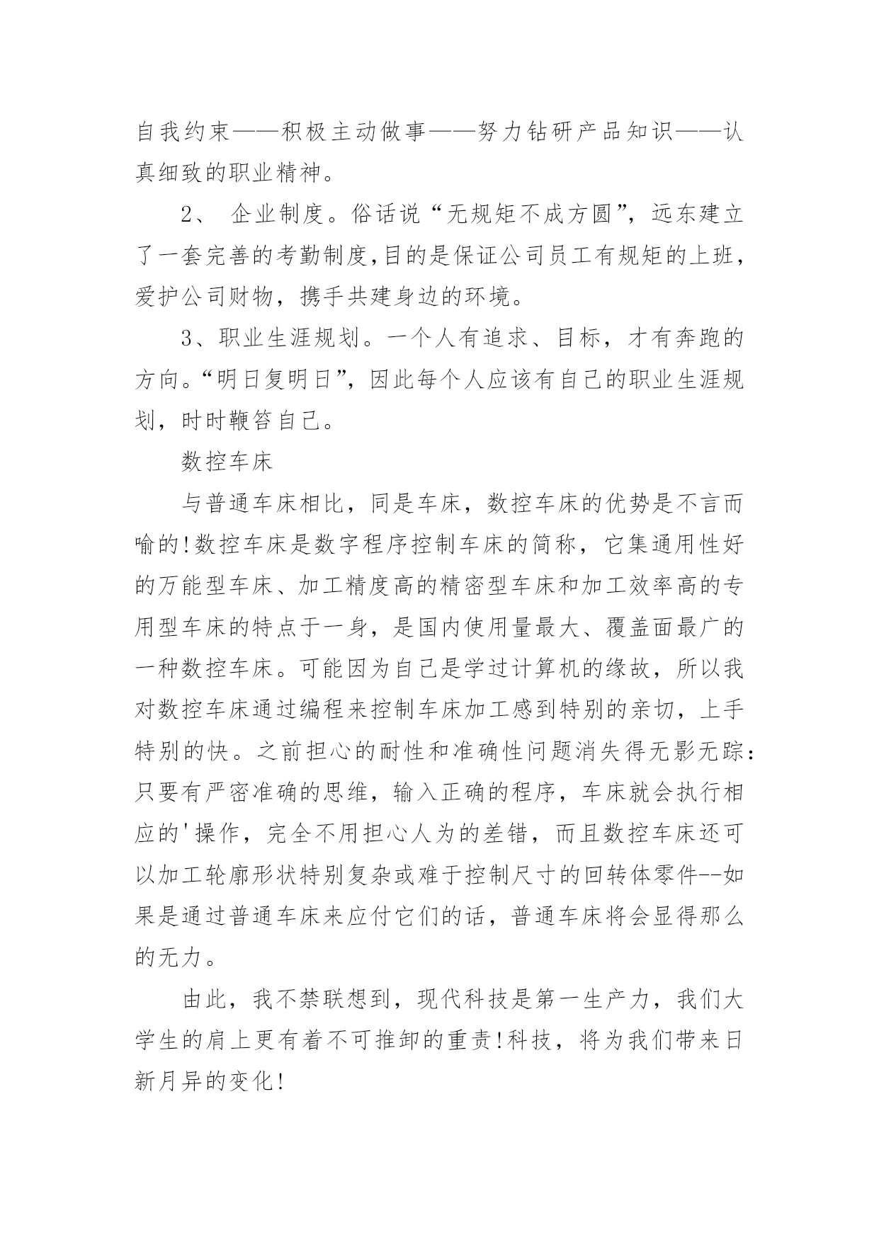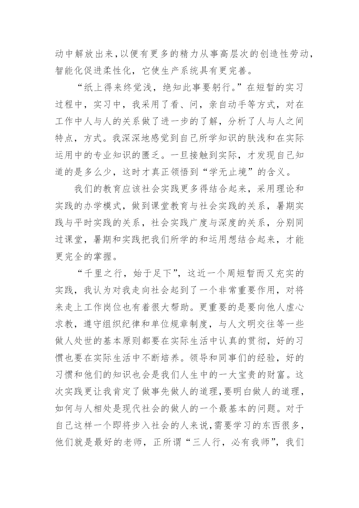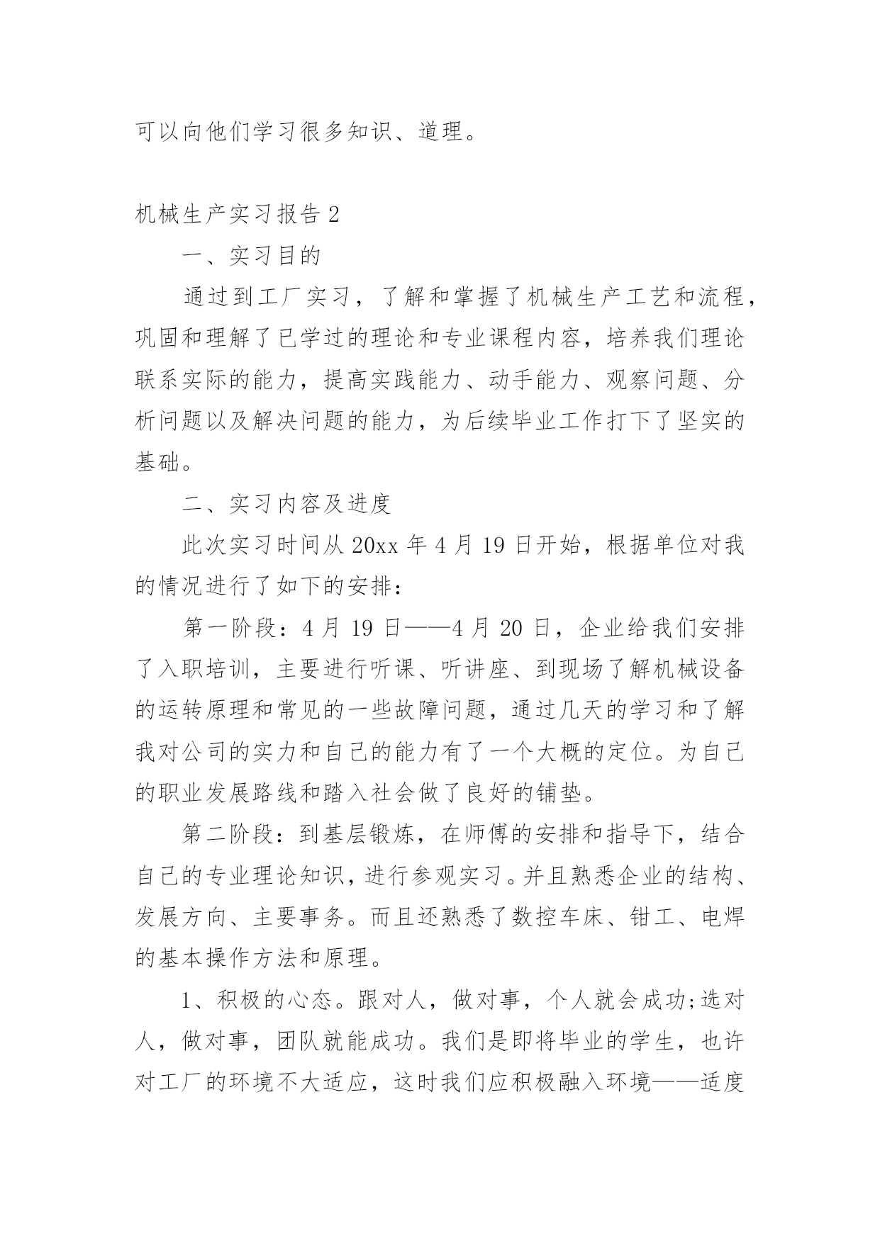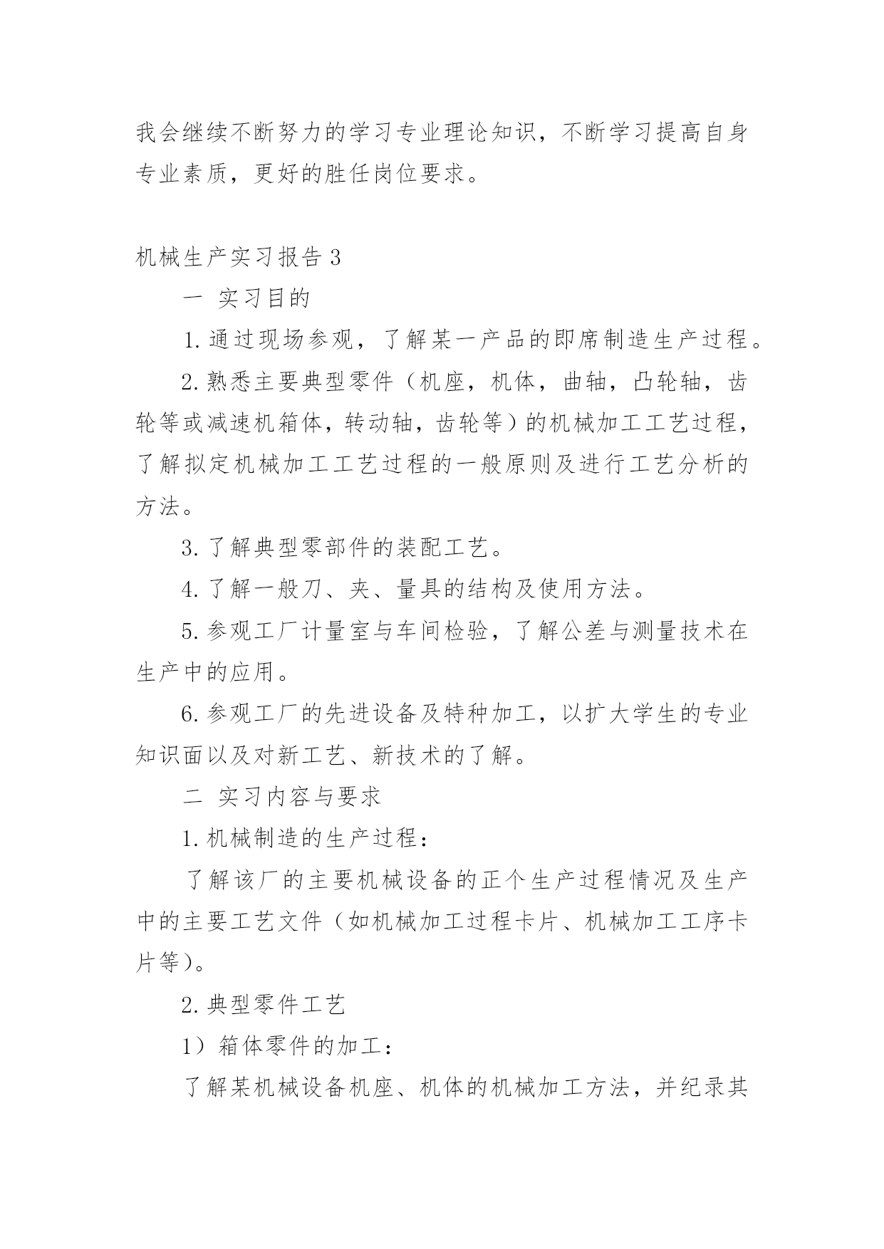 机械生产实习报告机械生产实习报告集合15篇在当下这个社会中,报告使用的频率越来越高,我们在写报告的时候要注意逻辑的合理性。那么报告应该怎么写才合适呢?下面是小编整理的机械生产实习报告,欢迎阅读与收藏。机械生产实习报告11、实习目的:生产实习是我们机自专业知识结构中不可缺少的组成部分,并作为一个独立的项目列入专业教学计划中的。其目的在于通过实习使学生获得基本生产的感性知识,理论联系实际,扩大知识面;同时专业实习又是锻炼和培养学生业务能力及素质的重要渠道,培养当代大学生具有吃苦耐劳的精神,也是学生接触社会、了解产业状况、了解国情的一个重要途径,逐步实现由学生到社会的转变,培养我们初步担任技术工作的能力、初步了解企业管理的基本方法和技能;体验企业工作的内容和方法。这些实际知识,对我们学习后面的课程乃至以后的工作,都是十分必要的基础。2、实习内容:①掌握机械加工工艺方面的知识及方法。②了解切削刀具方面的知识,熟悉常用刀具的结构、选择、用途等。③了解机床和数控系统的知识,特别是加工中心等典型的数控设备。④了解企业生产管理模式,学习先进的管理方式方法。⑤熟悉、巩固铸造工艺及设备方面的知识。3、实习车间1)毛坯选择。首先我们来到了零件的原始毛坯加工车间,在老师的指导作用下,我们了解到了下面知识,零件一般是由毛胚加工而成。而在现有的生产条件下,毛胚主要有铸件,锻件和冲压件等几个种类。铸件是把熔化的金属液浇注到预先制作的铸型腔中,待其冷却凝固后获得的零件毛胚。在一般机械中,铸件的重量大都占总机重量的50%以上,它是零件毛胚的最主要来源。铸件的突出优点是它可以是各种形状复杂的零件毛胚,特别是具有复杂内腔的零件毛胚,此外,铸件成本低廉。据指导我们实习的师傅说,我们厂主要就是靠这种方式制作毛坯。但其缺点是在其生产过程中,工序多,铸件质量难以控制,铸件机械性能较差,而锻件是利用冲击力或压力使用,加热后的金属胚料产生塑性变形,从而获得的零件毛胚。锻件的结构复杂程度往往不及铸件。但是,锻件具有良好的内部组织,从而具有良好的机械性能。所以用于做承受重载和冲击载荷的重要机器零件和工具的.毛胚,冲压件是利用冲床和专用模具,使金属板料产生塑性变形或分离,从而获得的制体。冲压通常是在常温下进行,冲压件具有重量轻,刚性好,尺寸精度高等优点,在很多情况下冲压件可直接作为零件使用。2)加工车间。来到加工车间,这里给我的第一感觉就是太大了车间共分为五部分,分别为车削加工,铣削及其他加工,钳工,数控加工,焊接,几乎是涵盖机械加工的各个方面,大概有五六百人同时在里面进行各种零件加工,虽然我们在学校的时候也进行过金工实习,做过一些零件,对机床也有一定认识,但是真的处于那种加工零件的气氛下,有很大的不同,一是我们学校的'机床都是有一定年代的,很少近年出来的新型加工机床二是在速度上,我们的加工速度也太慢了,加工同一个零件,我们需要的时间大概是这些加工师傅的五六倍,根本不能进行工业化的生产。在此次对加工车间的认识过程中,我更加明白了机械加工一些流程;胚料———划线———刨床(工艺上留加工余量)——粗车——热处理,调质——车床半精加工——磨——齿轮加工——淬火(齿面)——磨面;齿轮零件加工工艺:粗车——热处理——精车——磨内孔——磨芯,轴端面——磨另一端面——滚齿——钳齿——剃齿——铡键槽——钳工——完工。3)装配车间。任何机器都是有一个又一个零件装配而来,在装配车间,这里大概有接近一百多人在进行零件的收集和装配,以及包装,再发送至储货厂,在这个车间,工人师傅首先将起所收集的零件进行飞类,一便于进行组装,确定装配方法,装配顺序,所需工具;再进行清洗零件,去除油污,锈蚀,涂油,确保机器组装以后,表面整洁美观。在产品装配完成以后,还要对零件各方面进行调试,检查运动件的灵活性,密封性等性能,再转箱入库。4、对机械制造的体会历时将近一周的实习结束,该次实习,真正到达机械制造业的第一前线,了解了我国目前制造业的发展状况也粗步了解了机械制造也的发展趋势。在新的世纪里,科学技术必将以更快的速度发展,更快更紧密得融合到各个领域中,而这一切都将大大拓宽机械制造业的发展方向。在将来机械制造将会向“四个化”发展,即柔性化、灵捷化、智能化、信息化。即使工艺装备与工艺路线能适用于生产各种产品的需要,能适用于迅速更换工艺、更换产品的需要,使其与环境协调的柔性,使生产推向市场的时间最短且使得企业生产制造灵活多变的灵捷化,还有使制造过程物耗,人耗大大降低,高自动化生产,追求人的智能于机器只能高度结合的智能化以及主要使信息借助于物质和能量的力量生产出价值的信息化。当然机械制造业的四个发展趋势不是单独的,它们是有机的结合在一起的,是相互依赖,相互促进的。同时由于科学技术的不断进步,也将会使它出现新的发展方向。前面我们看