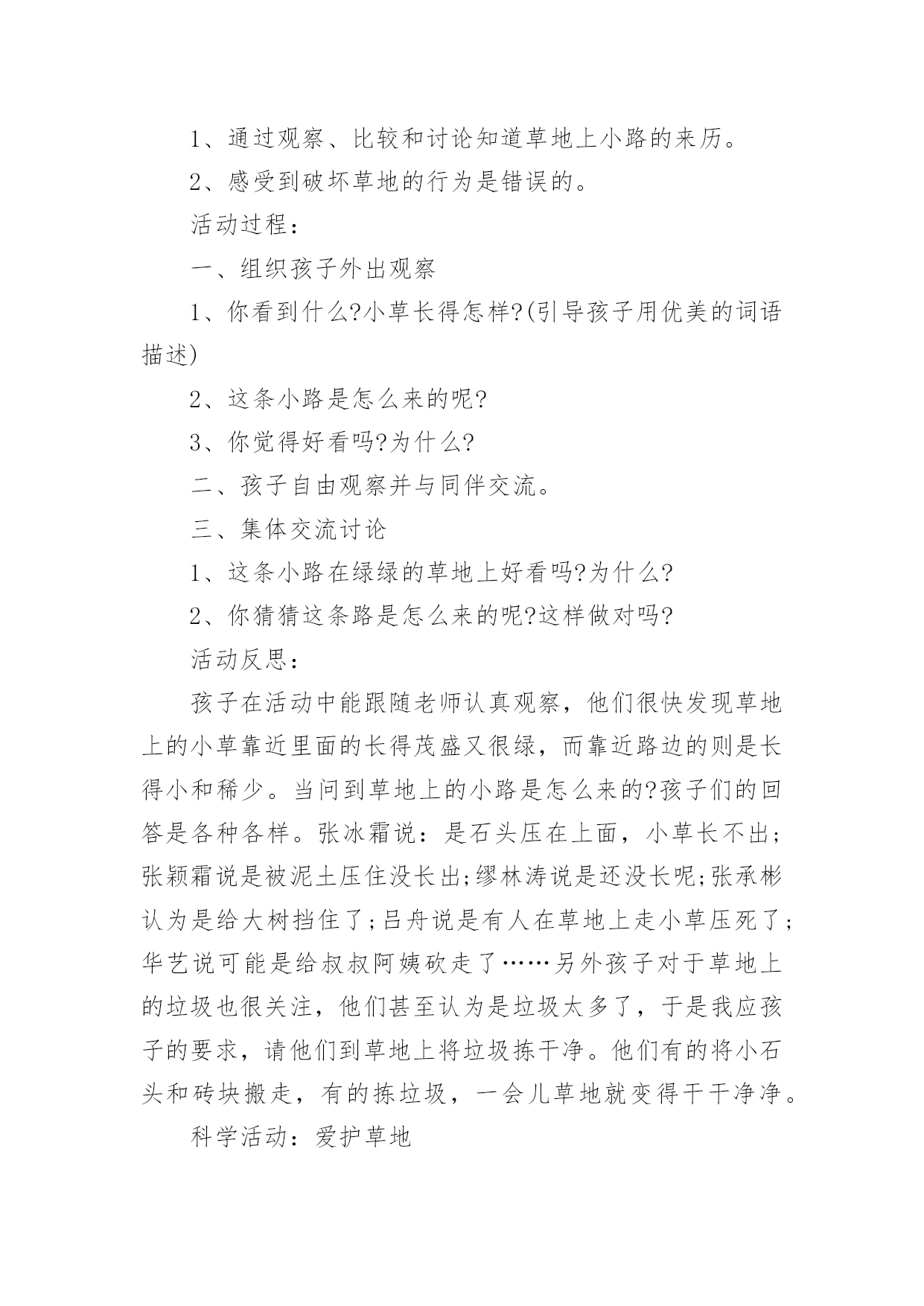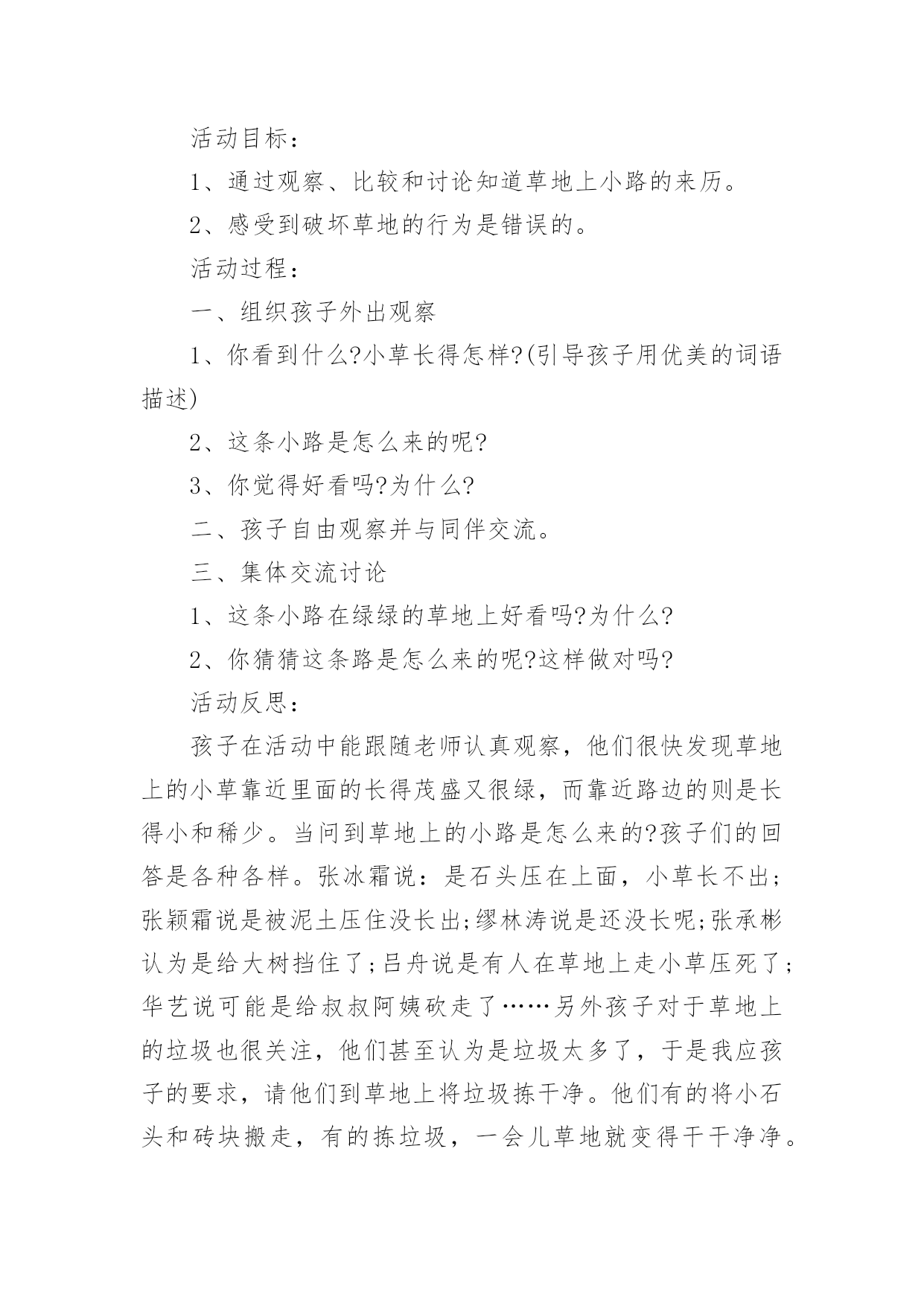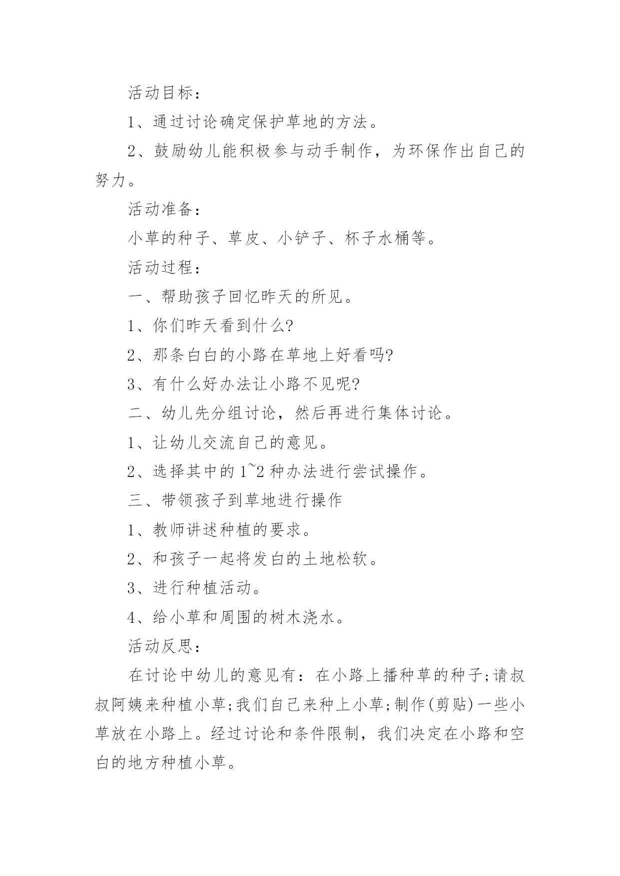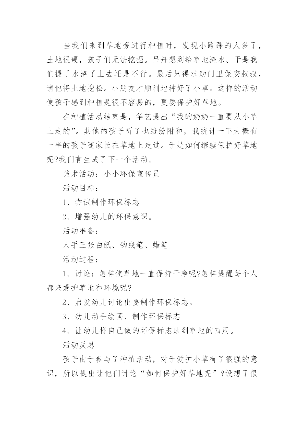 中班环保主题系列教案爱护小草在教学工作者开展教学活动前,通常需要用到教案来辅助教学,教案有助于顺利而有效地开展教学活动。我们应该怎么写教案呢?下面是小编收集整理的中班环保主题系列教案爱护小草,欢迎大家借鉴与参考,希望对大家有所帮助。中班环保主题系列教案爱护小草1环保教育,要从娃娃抓起,孩子是祖国的未来和希望,提高孩子的环境保护意识尤为重要。作为一名幼教工作者,我们该如何把环保意识渗透到平常的教育中去,使他们在自觉与不自觉中去接受这一方面的教育,从而提高他们的"环保意识"呢?我从每天经过的幼儿园附近的绿化带发现,有些家长为抄近路,带领孩子从草地上走,日积月累,绿绿的草地上有了一条非常不协调的“白带子”。何不利用这一有利的因素组织孩子开展有关环保的教育活动呢?于是我带领孩子生成了“爱护小草”的系列活动。主题目标:1、通过观察、讨论知道破坏草地是不好的,激发孩子爱绿、护绿、养绿的意识。2、激发幼儿热爱自然,有初步好奇心和环境责任感。3、并有初步的环境保护的意识。语言活动:小路从哪里来的?活动目标:1、通过观察、比较和讨论知道草地上小路的来历。2、感受到破坏草地的行为是错误的。活动过程:一、组织孩子外出观察1、你看到什么?小草长得怎样?(引导孩子用优美的词语描述)2、这条小路是怎么来的呢?3、你觉得好看吗?为什么?二、孩子自由观察并与同伴交流。三、集体交流讨论1、这条小路在绿绿的草地上好看吗?为什么?2、你猜猜这条路是怎么来的呢?这样做对吗?活动反思:孩子在活动中能跟随老师认真观察,他们很快发现草地上的小草靠近里面的长得茂盛又很绿,而靠近路边的则是长得小和稀少。当问到草地上的小路是怎么来的?孩子们的回答是各种各样。张冰霜说:是石头压在上面,小草长不出;张颖霜说是被泥土压住没长出;缪林涛说是还没长呢;张承彬认为是给大树挡住了;吕舟说是有人在草地上走小草压死了;华艺说可能是给叔叔阿姨砍走了……另外孩子对于草地上的垃圾也很关注,他们甚至认为是垃圾太多了,于是我应孩子的要求,请他们到草地上将垃圾拣干净。他们有的将小石头和砖块搬走,有的拣垃圾,一会儿草地就变得干干净净。科学活动:爱护草地活动目标:1、通过讨论确定保护草地的方法。2、鼓励幼儿能积极参与动手制作,为环保作出自己的努力。活动准备:小草的种子、草皮、小铲子、杯子水桶等。活动过程:一、帮助孩子回忆昨天的所见。1、你们昨天看到什么?2、那条白白的小路在草地上好看吗?3、有什么好办法让小路不见呢?二、幼儿先分组讨论,然后再进行集体讨论。1、让幼儿交流自己的意见。2、选择其中的1~2种办法进行尝试操作。三、带领孩子到草地进行操作1、教师讲述种植的要求。2、和孩子一起将发白的土地松软。3、进行种植活动。4、给小草和周围的树木浇水。活动反思:在讨论中幼儿的意见有:在小路上播种草的种子;请叔叔阿姨来种植小草;我们自己来种上小草;制作(剪贴)一些小草放在小路上。经过讨论和条件限制,我们决定在小路和空白的地方种植小草。当我们来到草地旁进行种植时,发现小路踩的人多了,土地很硬,孩子们无法挖掘。吕舟想到给草地浇水。于是我们提了水浇了上去还是不行。最后只得求助门卫保安叔叔,请他将土地挖松。小朋友才顺利地种好了小草。这样的活动使孩子感到种植是很不容易的,更要保护好草地。在种植活动结束是,华艺提出“我的奶奶一直要从小草上走的”。其他的孩子听了也纷纷附和,我统计一下大概有一半的孩子随家长在草地上走过。于是如何继续保护好草地呢?我们有生成了下一个活动。美术活动:小小环保宣传员活动目标:1、尝试制作环保标志2、增强幼儿的环保意识。活动准备:人手三张白纸、钩线笔、蜡笔活动过程:1、讨论:怎样使草地一直保持干净呢?怎样提醒每个人都来爱护草地和环境呢?2、启发幼儿讨论出要制作环保标志。3、幼儿动手绘画、制作环保标志4、让幼儿将自己做的环保标志贴到草地的四周。活动反思孩子由于参与了种植活动,对于爱护小草有了很强的意识,所以提出让他们讨论“如何保护好草地呢”?设想了很多的办法:在四周的围墙上加高;用木棍插在草地的四周,包小草保护起来;画一些画贴在大树上,提醒大家不能踩小草;用网围起来;请老师写些字包纸贴在草地上。最后我们经过协商决定师生分工合作,有老师准备一些标语,给大人看的。孩子们则是进行绘画活动“爱护小草”给小朋友们看的。在绘画活动中我的感触很深,小朋友现出的热情和智慧使我吃惊。反映出他们对于保护小草的意识非常强烈,表现出的作品是各式各样的,有在小草上走的脚画上大大的叉;有给小草浇水笑眯眯的小草;有伤心落泪的小草与开心的小草的强烈对比;有制止别人在草地上走路的;有黑黑的大石头压着的小草……是孩子们心声的表现,是他们对生活的最好理解。主题活动反思:1、随着社会的不断进步,环境所带来的矛盾也越来越严重,有识之士提出“环保教育