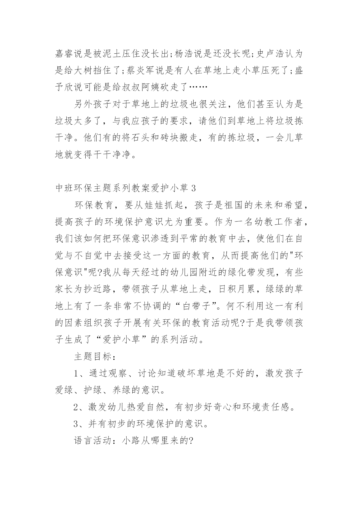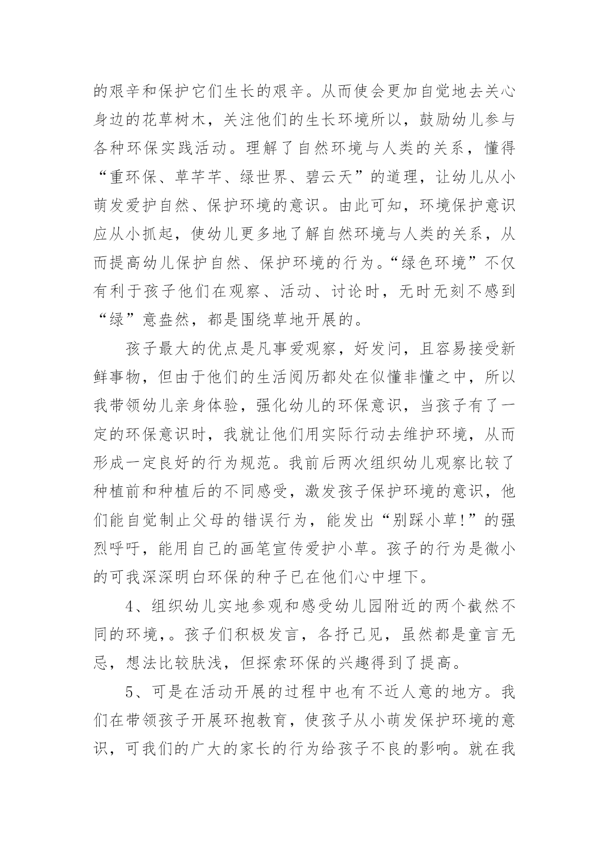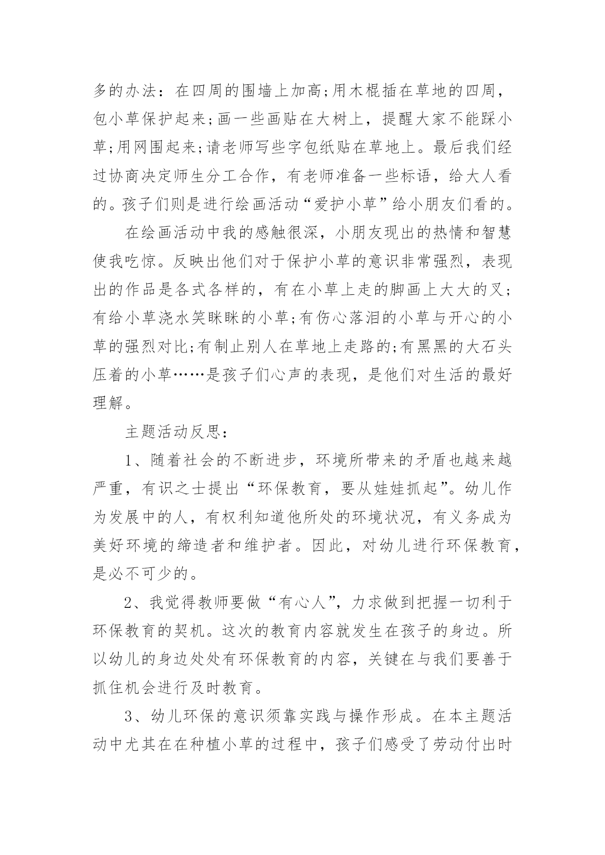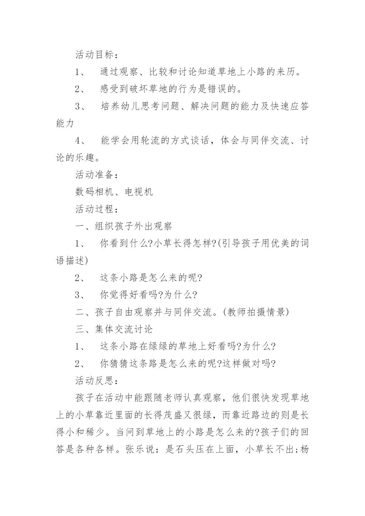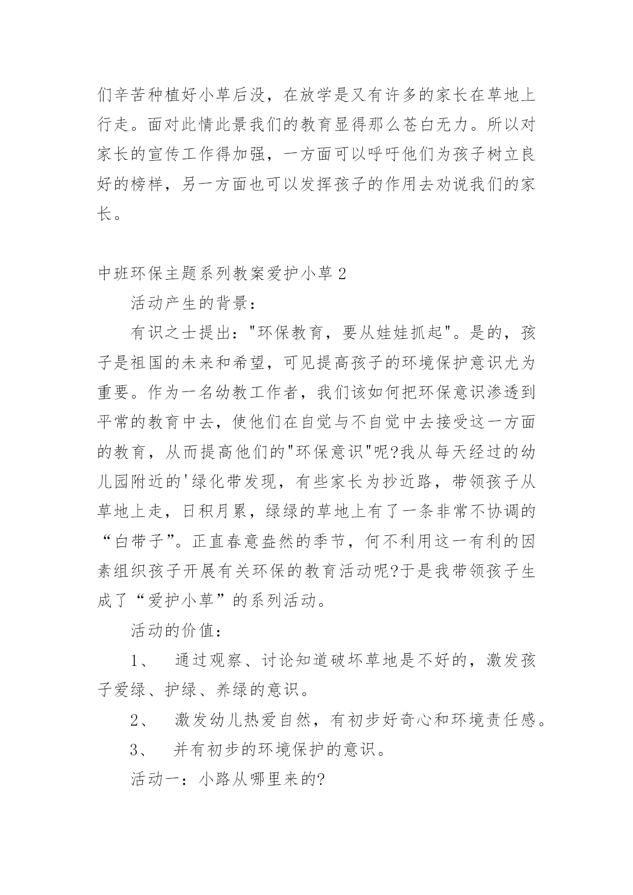 中班环保主题系列教案爱护小草在教学工作者开展教学活动前,通常需要用到教案来辅助教学,教案有助于顺利而有效地开展教学活动。我们应该怎么写教案呢?下面是小编收集整理的中班环保主题系列教案爱护小草,欢迎大家借鉴与参考,希望对大家有所帮助。中班环保主题系列教案爱护小草1环保教育,要从娃娃抓起,孩子是祖国的未来和希望,提高孩子的环境保护意识尤为重要。作为一名幼教工作者,我们该如何把环保意识渗透到平常的教育中去,使他们在自觉与不自觉中去接受这一方面的教育,从而提高他们的"环保意识"呢?我从每天经过的幼儿园附近的绿化带发现,有些家长为抄近路,带领孩子从草地上走,日积月累,绿绿的草地上有了一条非常不协调的“白带子”。何不利用这一有利的因素组织孩子开展有关环保的教育活动呢?于是我带领孩子生成了“爱护小草”的系列活动。主题目标:1、通过观察、讨论知道破坏草地是不好的,激发孩子爱绿、护绿、养绿的意识。2、激发幼儿热爱自然,有初步好奇心和环境责任感。3、并有初步的环境保护的意识。语言活动:小路从哪里来的?活动目标:1、通过观察、比较和讨论知道草地上小路的来历。2、感受到破坏草地的行为是错误的。活动过程:一、组织孩子外出观察1、你看到什么?小草长得怎样?(引导孩子用优美的词语描述)2、这条小路是怎么来的呢?3、你觉得好看吗?为什么?二、孩子自由观察并与同伴交流。三、集体交流讨论1、这条小路在绿绿的草地上好看吗?为什么?2、你猜猜这条路是怎么来的呢?这样做对吗?活动反思:孩子在活动中能跟随老师认真观察,他们很快发现草地上的小草靠近里面的长得茂盛又很绿,而靠近路边的则是长得小和稀少。当问到草地上的小路是怎么来的?孩子们的回答是各种各样。张冰霜说:是石头压在上面,小草长不出;张颖霜说是被泥土压住没长出;缪林涛说是还没长呢;张承彬认为是给大树挡住了;吕舟说是有人在草地上走小草压死了;华艺说可能是给叔叔阿姨砍走了……另外孩子对于草地上的垃圾也很关注,他们甚至认为是垃圾太多了,于是我应孩子的要求,请他们到草地上将垃圾拣干净。他们有的将小石头和砖块搬走,有的拣垃圾,一会儿草地就变得干干净净。科学活动:爱护草地活动目标:1、通过讨论确定保护草地的方法。2、鼓励幼儿能积极参与动手制作,为环保作出自己的努力。活动准备:小草的种子、草皮、小铲子、杯子水桶等。活动过程:一、帮助孩子回忆昨天的所见。1、你们昨天看到什么?2、那条白白的小路在草地上好看吗?3、有什么好办法让小路不见呢?二、幼儿先分组讨论,然后再进行集体讨论。1、让幼儿交流自己的意见。2、选择其中的1~2种办法进行尝试操作。三、带领孩子到草地进行操作1、教师讲述种植的要求。2、和孩子一起将发白的土地松软。3、进行种植活动。4、给小草和周围的树木浇水。活动反思:在讨论中幼儿的意见有:在小路上播种草的种子;请叔叔阿姨来种植小草;我们自己来种上小草;制作(剪贴)一些小草放在小路上。经过讨论和条件限制,我们决定在小路和空白的地方种植小草。当我们来到草地旁进行种植时,发现小路踩的人多了,土地很硬,孩子们无法挖掘。吕舟想到给草地浇水。于是我们提了水浇了上去还是不行。最后只得求助门卫保安叔叔,请他将土地挖松。小朋友才顺利地种好了小草。这样的活动使孩子感到种植是很不容易的,更要保护好草地。在种植活动结束是,华艺提出“我的奶奶一直要从小草上走的”。其他的孩子听了也纷纷附和,我统计一下大概有一半的孩子随家长在草地上走过。于是如何继续保护好草地呢?我们有生成了下一个活动。美术活动:小小环保宣传员活动目标:1、尝试制作环保标志2、增强幼儿的环保意识。活动准备:人手三张白纸、钩线笔、蜡笔活动过程:1、讨论:怎样使草地一直保持干净呢?怎样提醒每个人都来爱护草地和环境呢?2、启发幼儿讨论出要制作环保标志。3、幼儿动手绘画、制作环保标志4、让幼儿将自己做的环保标志贴到草地的四周。活动反思孩子由于参与了种植活动,对于爱护小草有了很强的意识,所以提出让他们讨论“如何保护好草地呢”?设想了很多的办法:在四周的围墙上加高;用木棍插在草地的四周,包小草保护起来;画一些画贴在大树上,提醒大家不能踩小草;用网围起来;请老师写些字包纸贴在草地上。最后我们经过协商决定师生分工合作,有老师准备一些标语,给大人看的。孩子们则是进行绘画活动“爱护小草”给小朋友们看的。在绘画活动中我的感触很深,小朋友现出的热情和智慧使我吃惊。反映出他们对于保护小草的意识非常强烈,表现出的作品是各式各样的,有在小草上走的脚画上大大的叉;有给小草浇水笑眯眯的小草;有伤心落泪的小草与开心的小草的强烈对比;有制止别人在草地上走路的;有黑黑的大石头压着的小草……是孩子们心声的表现,是他们对生活的最好理解。主题活动反思:1、随着社会的不断进步,环境所带来的矛盾也越来越严重,有识之士提出“环保教育