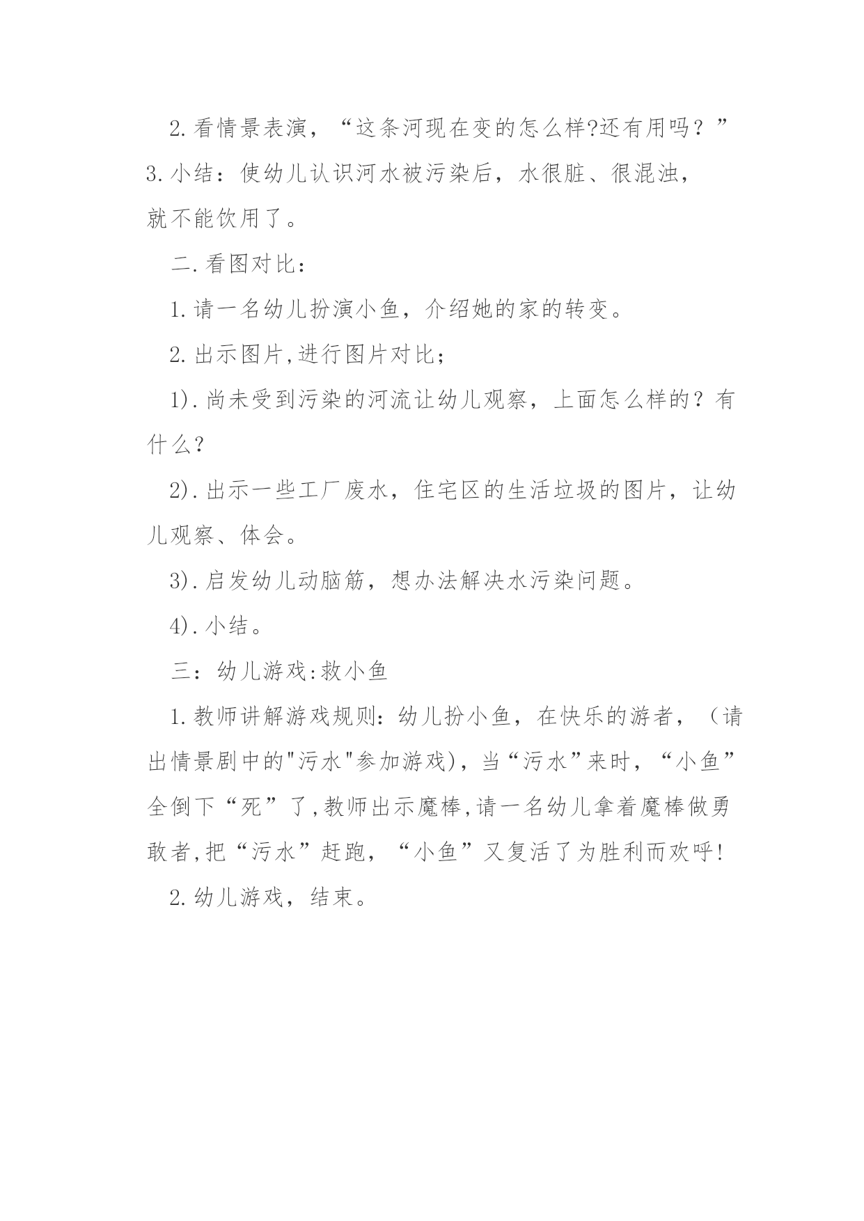 小班环保教案:水为什么变脏了设计意图:环境保护是我国的基本国策之一。“环境教育”已走进课堂,幼儿教育作为基础教育的有机组成部分,也有必要尽早让幼儿——21世纪的主人从小接受环境保护的启蒙教育。结合我园的环保课题我预设了这节课。《水为什么变脏了》通过看情景表演、游戏活动从而让幼儿知道水是如何被污染的,使幼儿知道保护水源清洁的重要性;培养幼儿环境保护的意识。从小懂得保护环境,热爱自然。《纲要》中也指出,要让幼儿亲近自然,接触社会,初步了解人与环境的相互依存关系,有认识和探索的兴趣。教学目的:1.通过看情景表演,让幼儿知道水是如何被污染的,使幼儿知道保护水源清洁的重要性。2.通过游戏活动,培养幼儿环境保护的意识。教学准备:1.大透明框1只,清水;垃圾,污水,图片2副。2.鱼头饰,魔棒,污水,面具各一。3.录音机,磁带。教学过程:一.看情景表演1.(出示有水的透明框)这水干净吗?有什么用?2.看情景表演,“这条河现在变的怎么样?还有用吗?”3.小结:使幼儿认识河水被污染后,水很脏、很混浊,就不能饮用了。二.看图对比:1.请一名幼儿扮演小鱼,介绍她的家的转变。2.出示图片,进行图片对比;1).尚未受到污染的河流让幼儿观察,上面怎么样的?有什么?2).出示一些工厂废水,住宅区的生活垃圾的图片,让幼儿观察、体会。3).启发幼儿动脑筋,想办法解决水污染问题。4).小结。三:幼儿游戏:救小鱼1.教师讲解游戏规则:幼儿扮小鱼,在快乐的游者,(请出情景剧中的"污水"参加游戏),当“污水”来时,“小鱼”全倒下“死”了,教师出示魔棒,请一名幼儿拿着魔棒做勇敢者,把“污水”赶跑,“小鱼”又复活了为胜利而欢呼!2.幼儿游戏,结束。