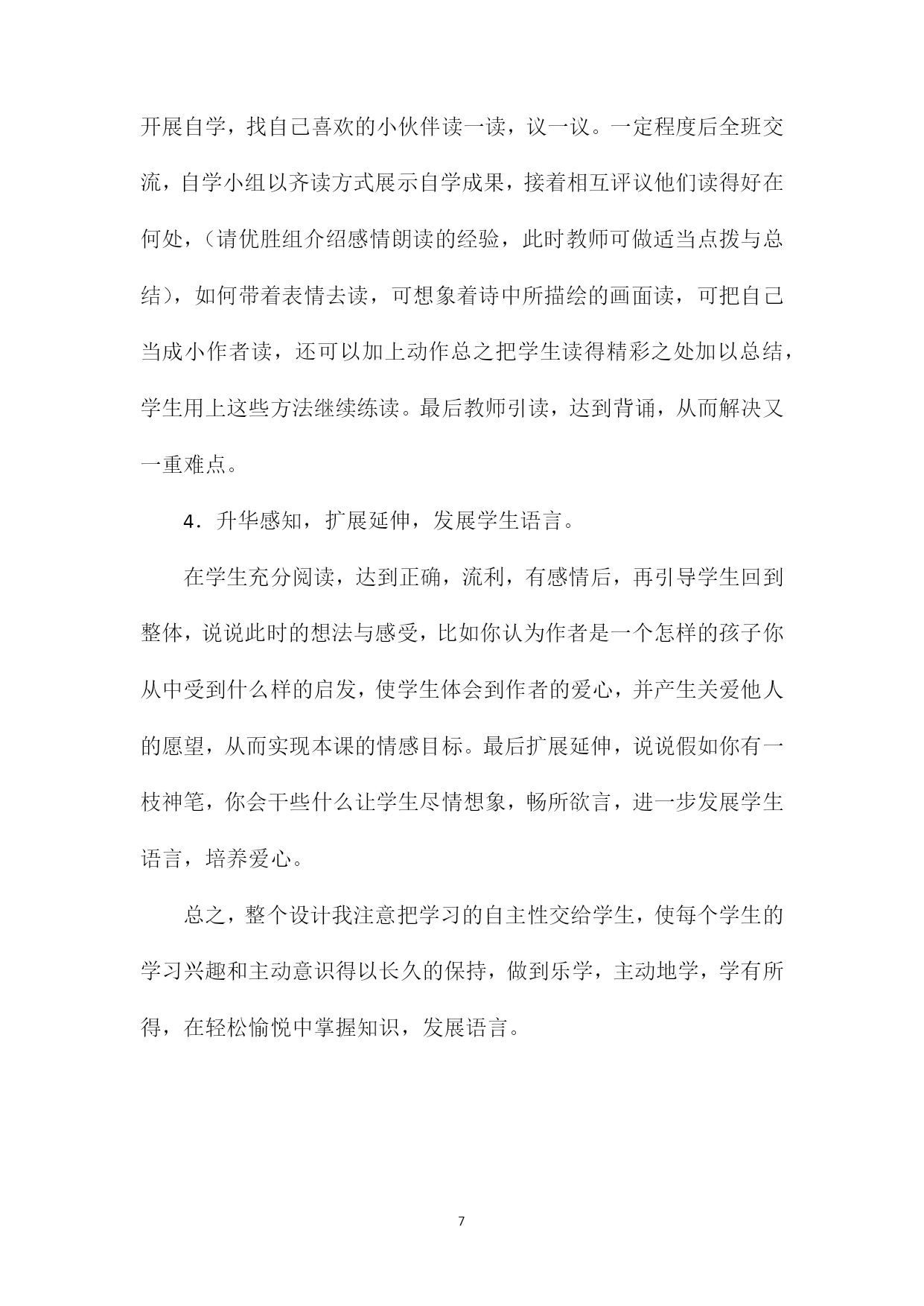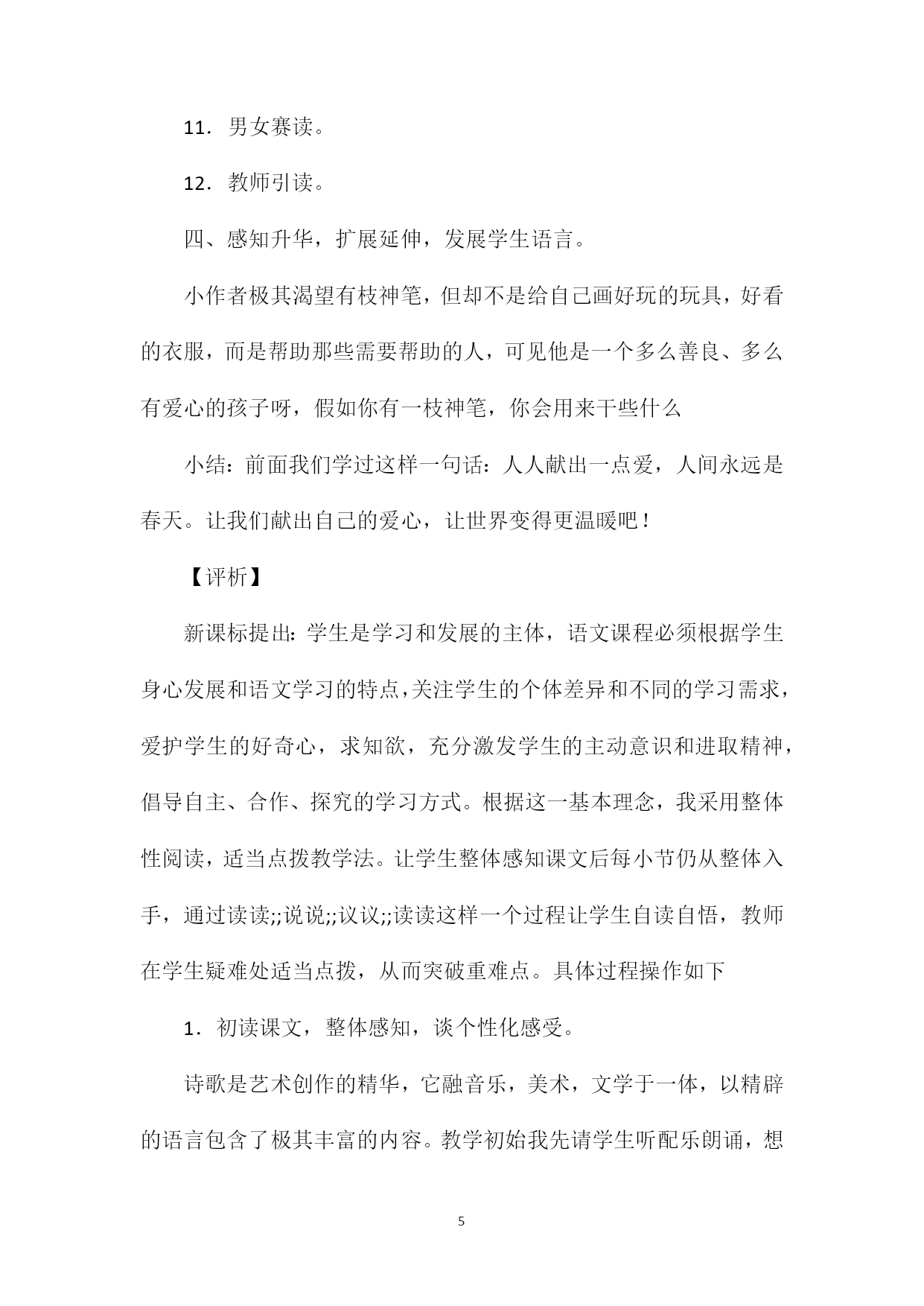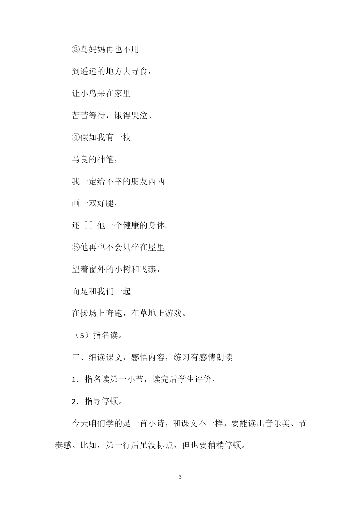 PAGEPAGE7《假如》教学设计五【教具准备】1.生字词语卡片。2.小树,太阳,小鸟等图片。【教学过程】一、初读课文,整体感知,谈个性化感受同学们,你们听过神笔马良的故事吗你知道那枝神笔有什么特殊的作用么马良用这枝神笔为老百姓画了许多有用的东西,使他们过着快乐幸福的生活。怎么样,你们是不是也想有一枝这样的笔有位小朋友和你们的想法一样,那么,他要用神笔来干什么呢让我们一起走进23课《假如》中看一看吧。1.请同学们听配乐朗诵,比比看谁听得最认真。(师范读)2.听完朗诵,你有什么想法3.指名答。4.自由读课文,找一找小作者用神笔画了些什么(自由读课文)5.指名答,师贴出相应的图画。二、识记生字,谈个性化识记方法1.你喜欢这篇课文么,用自己喜欢的方式把课文读通顺,并画出生字。2.四人小组自学生字(1)读一读,相互提醒易错的生字。(2)想办法记住这些字。3.汇报交流(1)抽读卡片,检查自学。(2)提出难记生字(3)学生针对难记生字,谈个性化识记方法。(4)在语言环境中巩固生字同学们,如果我把这些生字放在句子中你还能认识么(出示句子)①假如我有一枝马良的神笔,我要给窗前的小树画一个红红的太阳。②让小树在冬天也能快活地成长,不会在寒冷的北风里缩着身子,轻轻叹息。③鸟妈妈再也不用到遥远的地方去寻食,让小鸟呆在家里苦苦等待,饿得哭泣。④假如我有一枝马良的神笔,我一定给不幸的朋友西西画一双好腿,还[]他一个健康的身体.⑤他再也不会只坐在屋里望着窗外的小树和飞燕,而是和我们一起在操场上奔跑,在草地上游戏。(5)指名读。三、细读课文,感悟内容,练习有感情朗读1.指名读第一小节,读完后学生评价。2.指导停顿。今天咱们学的是一首小诗,和课文不一样,要能读出音乐美、节奏感。比如,第一行后虽没标点,但也要稍稍停顿。3.自己练习,体会。4.理解内容,指导感情。感觉一下小作者画了一个什么样的太阳为什么画这样一个太阳请大家闭上眼睛听叙述:冬天到来了,寒冷的北风呼呼地刮着,一棵小树孤零零地站在窗外,被风吹得摇摇晃晃,冻得瑟瑟发抖。正在这时,天空出现一轮红红的太阳,温暖的阳光撒向大地,把大地照得温暖如春,小树不冷了,在阳光下快活地成长。如果你是这棵小树,你会对小作者说些什么你觉得这一小节应该读出什么样的感情5.试着练练。6.指名读。7.四人小组自学后两小结:读一读,议一议,弄清作者为什么画谷粒和双腿,从中可以看出他是个怎样的人。想办法读出感情。8.指名读,检查自学成果。9.选出读得好的小组介绍经验。教师相机总结:读课文时,可以把重点字词加重语气,可以加上动作读,可以把自己想成小作者进入情境读,还可以想着诗中描绘的画面读。10.学生练习。11.男女赛读。12.教师引读。四、感知升华,扩展延伸,发展学生语言。小作者极其渴望有枝神笔,但却不是给自己画好玩的玩具,好看的衣服,而是帮助那些需要帮助的人,可见他是一个多么善良、多么有爱心的孩子呀,假如你有一枝神笔,你会用来干些什么小结:前面我们学过这样一句话:人人献出一点爱,人间永远是春天。让我们献出自己的爱心,让世界变得更温暖吧!【评析】新课标提出:学生是学习和发展的主体,语文课程必须根据学生身心发展和语文学习的特点,关注学生的个体差异和不同的学习需求,爱护学生的好奇心,求知欲,充分激发学生的主动意识和进取精神,倡导自主、合作、探究的学习方式。根据这一基本理念,我采用整体性阅读,适当点拨教学法。让学生整体感知课文后每小节仍从整体入手,通过读读;;说说;;议议;;读读这样一个过程让学生自读自悟,教师在学生疑难处适当点拨,从而突破重难点。具体过程操作如下1.初读课文,整体感知,谈个性化感受。诗歌是艺术创作的精华,它融音乐,美术,文学于一体,以精辟的语言包含了极其丰富的内容。教学初始我先请学生听配乐朗诵,想象诗中所描绘的画面,形成感性认识,接着自读课文后了解主要内容,提出问题:①作者用神笔画了什么②为什么要画这些东西以此引导学生概括文意,把握全局。在学生逐段概括时,我以简笔画的形式把大家概括的内容展示于黑板,既使学生对诗歌内容有更直观的了解,又能感受诗中所蕴涵的图画美。2.识记生字,理解词语,交流个性化识字方法。传统的学习方式是把学生当做知识的容器,任凭教师无休止的填鸭,忽略了学生学习的主动性和独立性,不利于学生创造潜能的激发。教学中,我努力使学生由被动的接受性学习转变为主动的探究性学习。先四人小组自学生字,相互提醒易错的生字,再向小组成员讲一讲你是怎样记住这个字的,比如熟字加偏旁,熟字换偏旁,把它看成一幅画,培养个性化识字方法。接着全班汇报交流,先以开火车的