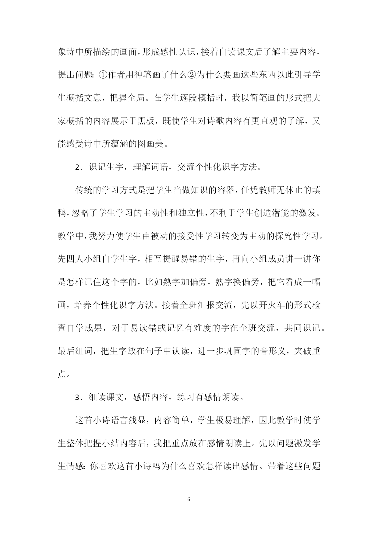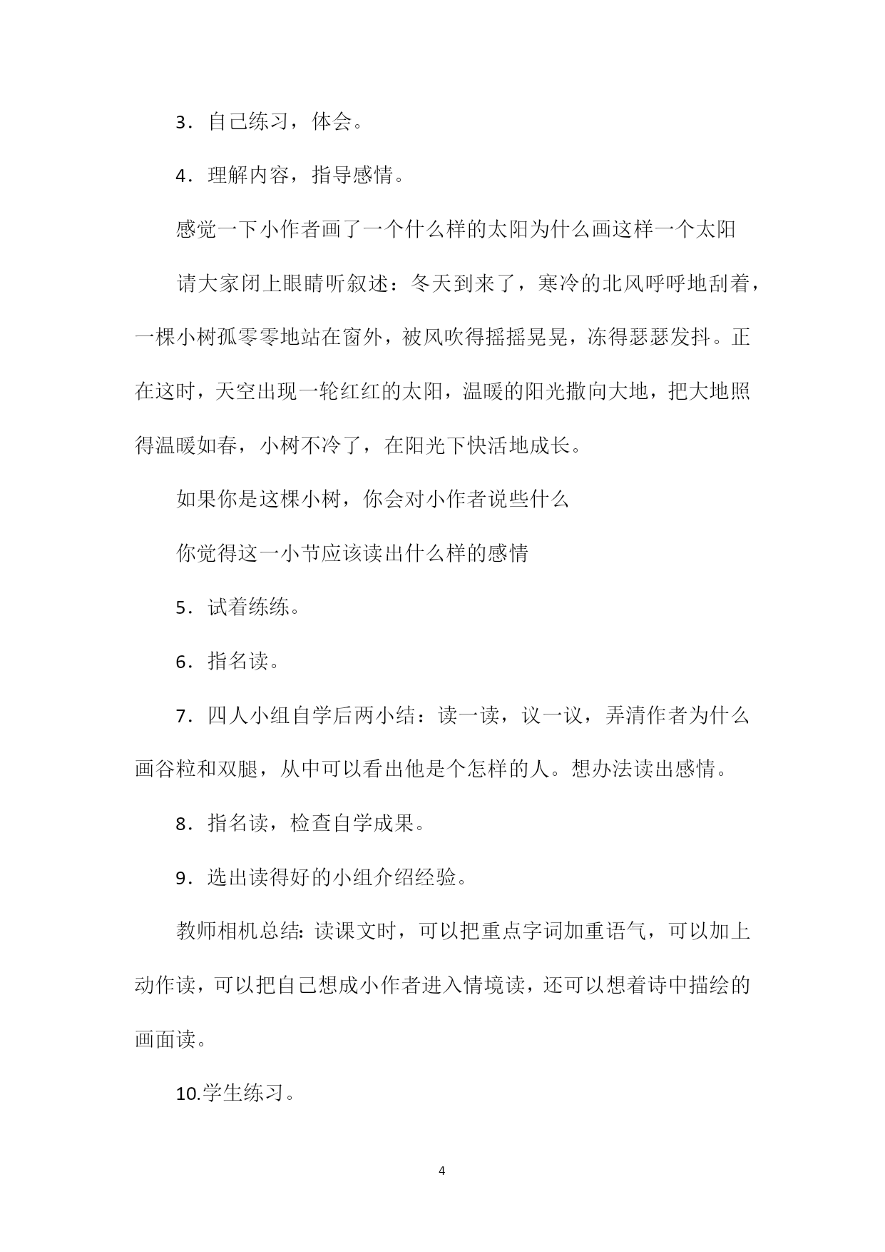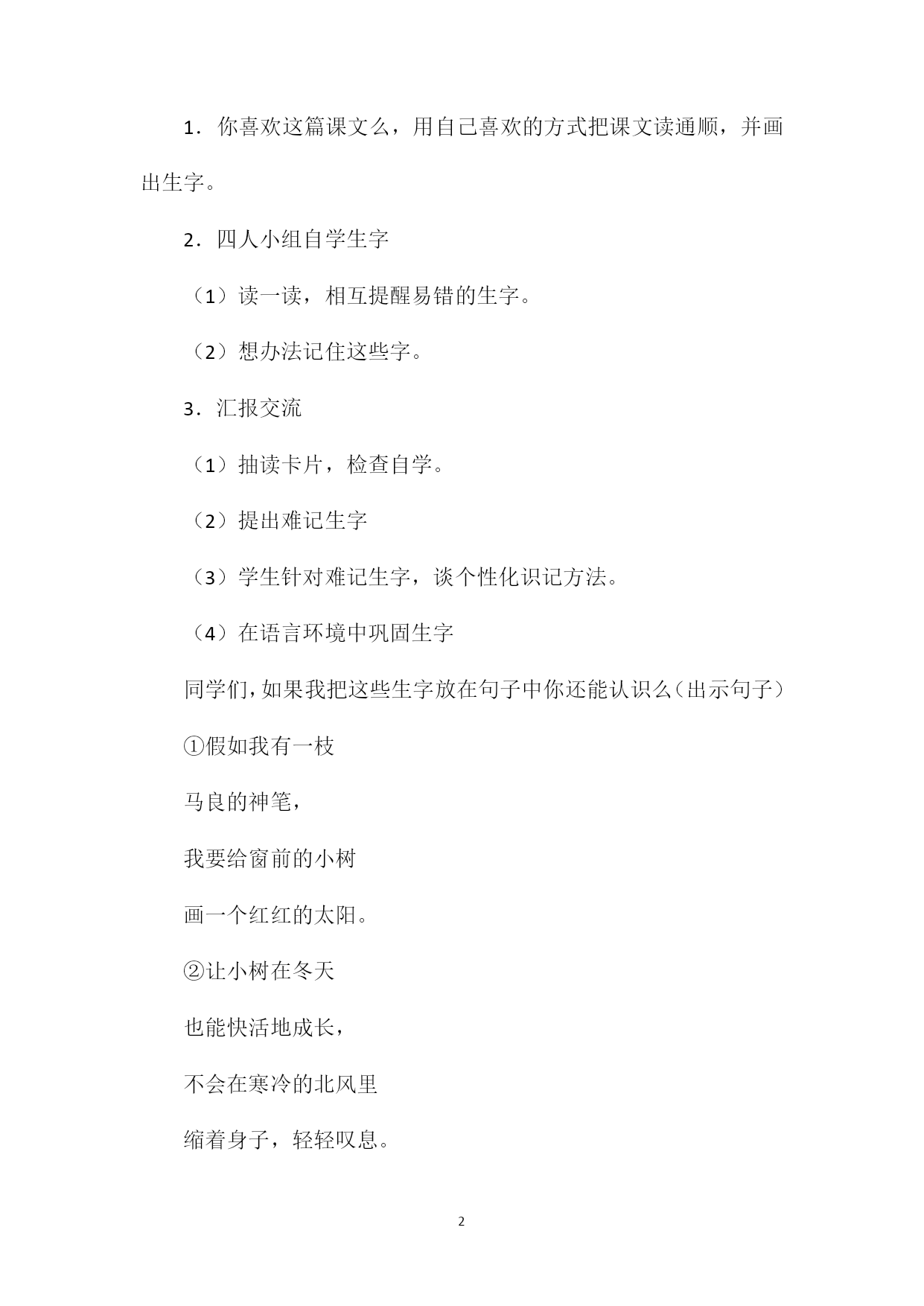 PAGEPAGE7《假如》教学设计五【教具准备】1.生字词语卡片。2.小树,太阳,小鸟等图片。【教学过程】一、初读课文,整体感知,谈个性化感受同学们,你们听过神笔马良的故事吗你知道那枝神笔有什么特殊的作用么马良用这枝神笔为老百姓画了许多有用的东西,使他们过着快乐幸福的生活。怎么样,你们是不是也想有一枝这样的笔有位小朋友和你们的想法一样,那么,他要用神笔来干什么呢让我们一起走进23课《假如》中看一看吧。1.请同学们听配乐朗诵,比比看谁听得最认真。(师范读)2.听完朗诵,你有什么想法3.指名答。4.自由读课文,找一找小作者用神笔画了些什么(自由读课文)5.指名答,师贴出相应的图画。二、识记生字,谈个性化识记方法1.你喜欢这篇课文么,用自己喜欢的方式把课文读通顺,并画出生字。2.四人小组自学生字(1)读一读,相互提醒易错的生字。(2)想办法记住这些字。3.汇报交流(1)抽读卡片,检查自学。(2)提出难记生字(3)学生针对难记生字,谈个性化识记方法。(4)在语言环境中巩固生字同学们,如果我把这些生字放在句子中你还能认识么(出示句子)①假如我有一枝马良的神笔,我要给窗前的小树画一个红红的太阳。②让小树在冬天也能快活地成长,不会在寒冷的北风里缩着身子,轻轻叹息。③鸟妈妈再也不用到遥远的地方去寻食,让小鸟呆在家里苦苦等待,饿得哭泣。④假如我有一枝马良的神笔,我一定给不幸的朋友西西画一双好腿,还[]他一个健康的身体.⑤他再也不会只坐在屋里望着窗外的小树和飞燕,而是和我们一起在操场上奔跑,在草地上游戏。(5)指名读。三、细读课文,感悟内容,练习有感情朗读1.指名读第一小节,读完后学生评价。2.指导停顿。今天咱们学的是一首小诗,和课文不一样,要能读出音乐美、节奏感。比如,第一行后虽没标点,但也要稍稍停顿。3.自己练习,体会。4.理解内容,指导感情。感觉一下小作者画了一个什么样的太阳为什么画这样一个太阳请大家闭上眼睛听叙述:冬天到来了,寒冷的北风呼呼地刮着,一棵小树孤零零地站在窗外,被风吹得摇摇晃晃,冻得瑟瑟发抖。正在这时,天空出现一轮红红的太阳,温暖的阳光撒向大地,把大地照得温暖如春,小树不冷了,在阳光下快活地成长。如果你是这棵小树,你会对小作者说些什么你觉得这一小节应该读出什么样的感情5.试着练练。6.指名读。7.四人小组自学后两小结:读一读,议一议,弄清作者为什么画谷粒和双腿,从中可以看出他是个怎样的人。想办法读出感情。8.指名读,检查自学成果。9.选出读得好的小组介绍经验。教师相机总结:读课文时,可以把重点字词加重语气,可以加上动作读,可以把自己想成小作者进入情境读,还可以想着诗中描绘的画面读。10.学生练习。11.男女赛读。12.教师引读。四、感知升华,扩展延伸,发展学生语言。小作者极其渴望有枝神笔,但却不是给自己画好玩的玩具,好看的衣服,而是帮助那些需要帮助的人,可见他是一个多么善良、多么有爱心的孩子呀,假如你有一枝神笔,你会用来干些什么小结:前面我们学过这样一句话:人人献出一点爱,人间永远是春天。让我们献出自己的爱心,让世界变得更温暖吧!【评析】新课标提出:学生是学习和发展的主体,语文课程必须根据学生身心发展和语文学习的特点,关注学生的个体差异和不同的学习需求,爱护学生的好奇心,求知欲,充分激发学生的主动意识和进取精神,倡导自主、合作、探究的学习方式。根据这一基本理念,我采用整体性阅读,适当点拨教学法。让学生整体感知课文后每小节仍从整体入手,通过读读;;说说;;议议;;读读这样一个过程让学生自读自悟,教师在学生疑难处适当点拨,从而突破重难点。具体过程操作如下1.初读课文,整体感知,谈个性化感受。诗歌是艺术创作的精华,它融音乐,美术,文学于一体,以精辟的语言包含了极其丰富的内容。教学初始我先请学生听配乐朗诵,想象诗中所描绘的画面,形成感性认识,接着自读课文后了解主要内容,提出问题:①作者用神笔画了什么②为什么要画这些东西以此引导学生概括文意,把握全局。在学生逐段概括时,我以简笔画的形式把大家概括的内容展示于黑板,既使学生对诗歌内容有更直观的了解,又能感受诗中所蕴涵的图画美。2.识记生字,理解词语,交流个性化识字方法。传统的学习方式是把学生当做知识的容器,任凭教师无休止的填鸭,忽略了学生学习的主动性和独立性,不利于学生创造潜能的激发。教学中,我努力使学生由被动的接受性学习转变为主动的探究性学习。先四人小组自学生字,相互提醒易错的生字,再向小组成员讲一讲你是怎样记住这个字的,比如熟字加偏旁,熟字换偏旁,把它看成一幅画,培养个性化识字方法。接着全班汇报交流,先以开火车的