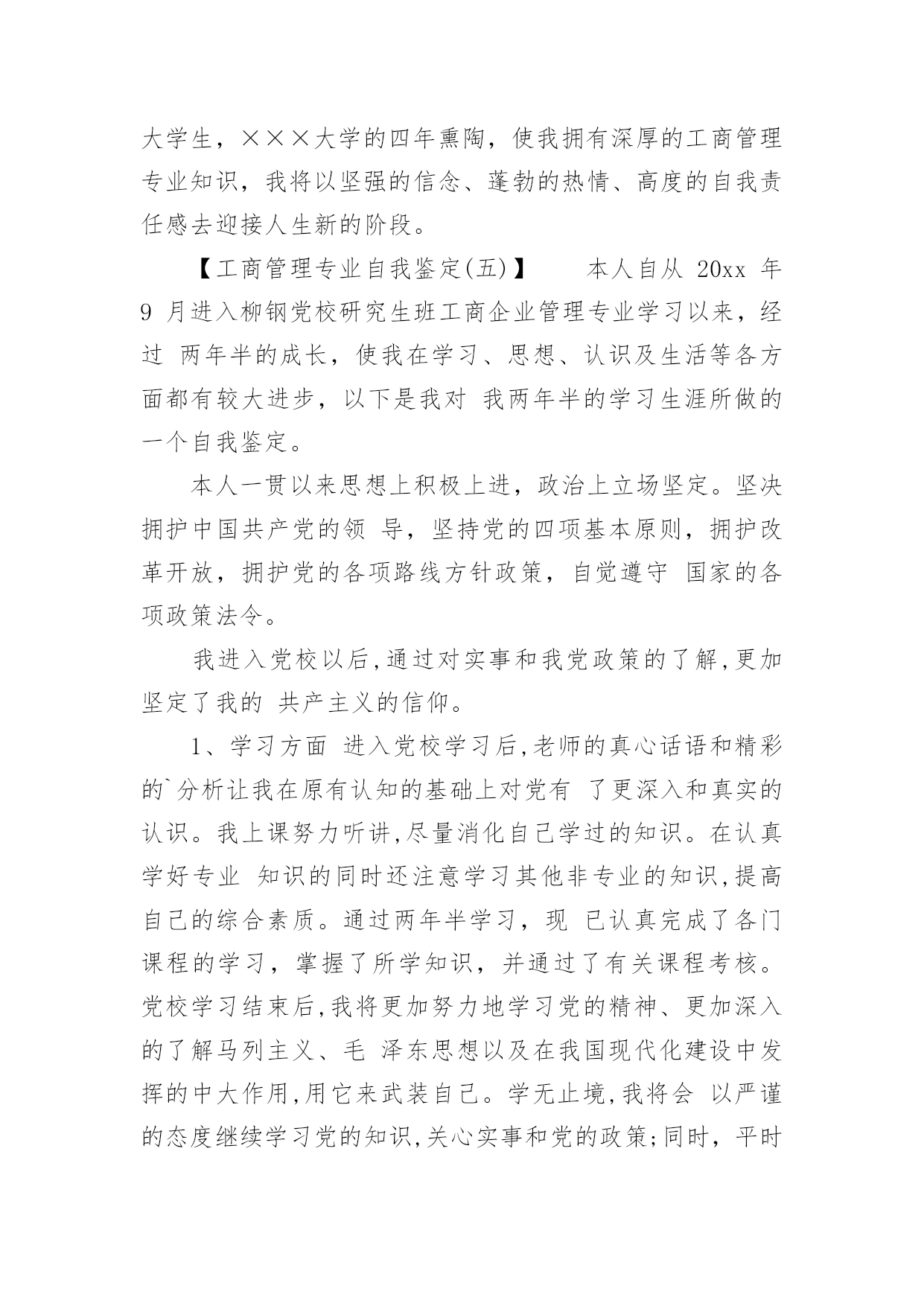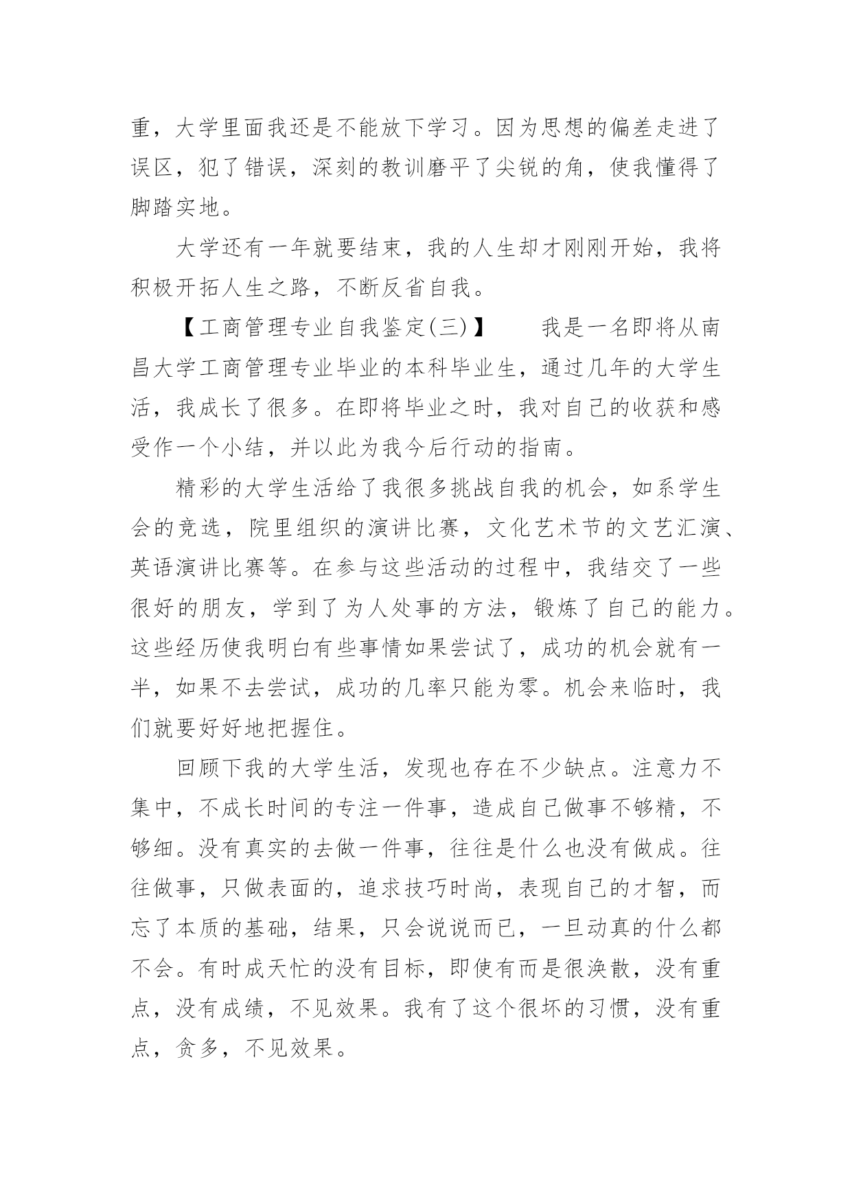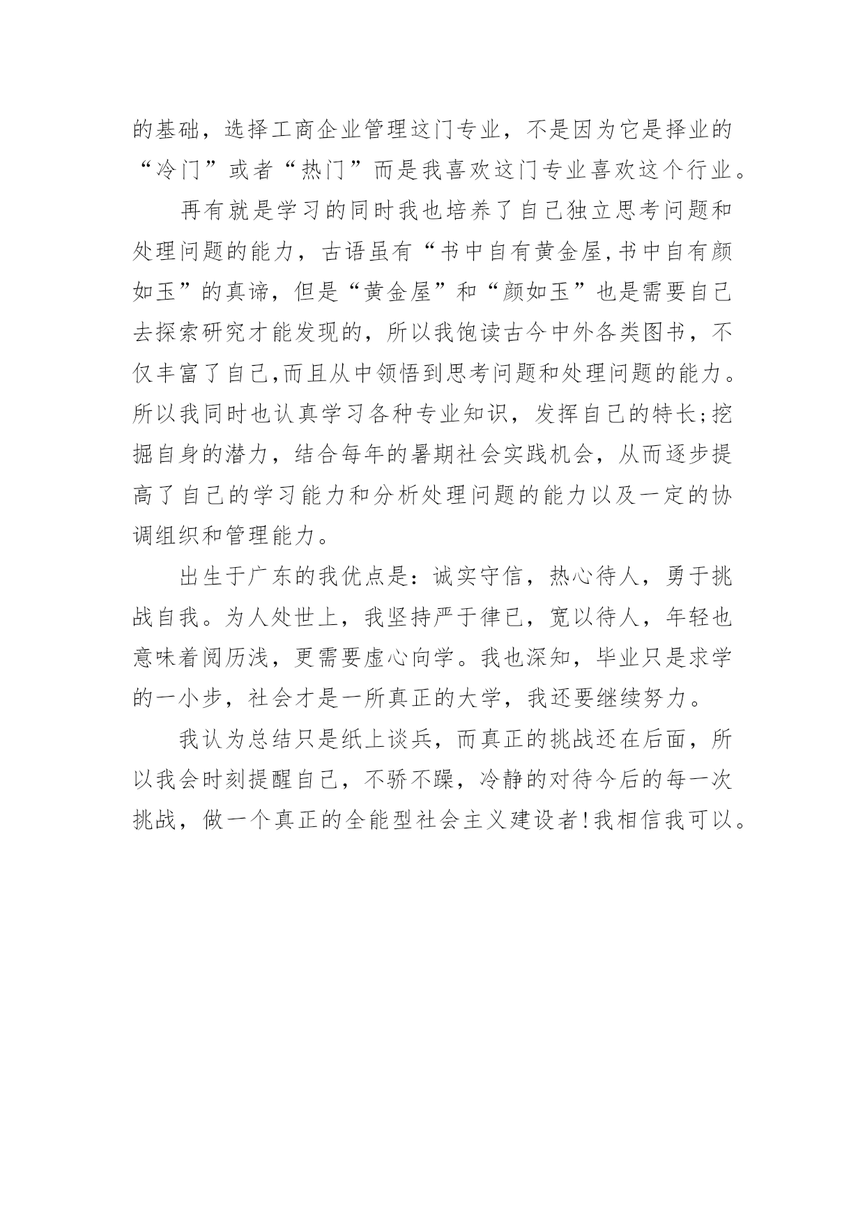 工商管理毕业自我鉴定报告工商管理毕业自我鉴定报告自我鉴定是针对自己的一些工作上、学习上或是生活上的总结,总结自己的优缺点,更能客观的看待自己的问题,下面就是小编整理的工商管理毕业自我鉴定报告,一起来看一下吧。【工商管理专业自我鉴定(一)】20xx年3月,怀揣着对知识的渴求,时隔8年之久,再次踏进校园,久违的亲切和宁静的感觉相拥而至,犹如世外桃源般的隔绝了整个城市的喧嚣。年少时由于家境原因只上到中专毕业,20xx年初涉职场时的青涩与困难让我明白,知识的诉求对我来说是多么的重要,有时哪怕只是一纸文凭,待遇上的差距也相别万千,这时才真正感觉到在学校读书时浪费了太多的时光。20xx—20xx年利用工作的空余时间自考完成了行政管理的大专课程。这期间收获的不仅仅是渴望已久的文凭,对我影响最大的是整个过程,那种学习的快乐与充实的感觉让我时常忘却工作中的艰辛。事实证明在这期间所形成的乐观的心态,坚毅的性格对我今后的职场生涯起到了很大的作用。所以20xx年当我的工作再次遇到瓶颈之时,我又选择了学习,只不过这次是走进校园。学习知识,获取文凭,更主要的是要解决浮躁的心理。经过二年半系统地学习工商管理专业理论及相关知识,我不仅完成了全部课程的学习,取得了优异的成绩,具有了较强的理论素养,更提高了工作管理能力。利业余时间学习紧张有序,边学习边工作,努力提高专业理论水平和实践操作技巧,力求理论知识的纵深化。同时在老师的指点下,在知识的熏陶中,在实践的砥砺上,做到理论与实际相结合,力求将理论简便化,便于可操作性。通过学习,使我在今后的实际工作中,遇到问题能及时有针对性的处理,由此锻炼自己独立分析问题和解决问题能力。同时平日工作中浮躁的心理也得到了沉淀,使我在面对今后工作中出现的种种问题时都能够以一种平和的、包容的、积极的心态去面对、去解决问题。当今社会改革迅速,对人才的要求也越来越高,社会是在不断变化、发展的,这一前提要求我们每个人必须用发展的眼光看问题。在今后的学习、生活和工作中,我将不断提高自己的思想认识,并不断完善自己。未来的我将以实际行动去证明自己的能力,考验自己的意志,接受一切新的挑战。【工商管理专业自我鉴定(二)】四年的大学生活就要结束了,大学期间,我在提高自己科学文化素质的同时,也努力提高自己的思想道德素质,使自己成为德、智、体诸方面全面发展适应21世纪发展要求的复合型人才。通过四年学习,我学习了微观经济学、宏观经济学、市场营销、企业战略管理、生产运作管理、管理心理学、运筹学、管理系统工程、会计学等专业课程。在过去的四年,我努力过,争取过,拼搏过,放弃过,也摔倒过,振作过,生活是充实的,经历也是多样的,体会是复杂的。大一单纯而快乐,作为广工的新生儿,我们充满了对大学生活的期待,憧憬着未来;大二彷徨而充满激情,经过了大一的懵懂,走到当上师姐的时候,于是便自以为是地干一番激情,可是却逐渐接触到这个社会,了解到这世界的现实,深感飘渺而彷徨;大三踏实而努力,要为过去的无知和未来的生活负上责任;展望大四,要坚定而成熟,真的要走上社会了,不再困在校园,这到底是应该值得高兴还是概叹呢?到了大学之后,我深深地了解到要立足于社会,单靠知识并不足以具有竞争力,当今世界,需要的是有学识有才干有能力有经验的人,而经验必须积累,能力必须培养。因此从大一开始就不断地寻找积累经验培养自我能力的机会,兼职、实习成为了我除了学习以外的生活重心,不怕苦不怕累,为的就是可以寻找自己突出于他人的机会。当过市场调查员,当过派单员,当过服务员,当过话务员,当中有欢笑,有泪水,有激动,更有沮丧。曾经因收到上司的肯定而自豪,也曾经因单纯没有经验而吃过苦头。但是无论发生什么事情,我的身边总有家人朋友的支持和鼓励,于是心里再次暗暗为自己加油,时刻勉励自己成功不能骄傲自负,失败更应该振作和检讨。工作为我带来对自己价值的肯定,然而在翻了一个大跟斗之后,我清楚地认识到学习依然是大学的我生活的重中之重,大学里面我还是不能放下学习。因为思想的偏差走进了误区,犯了错误,深刻的教训磨平了尖锐的角,使我懂得了脚踏实地。大学还有一年就要结束,我的人生却才刚刚开始,我将积极开拓人生之路,不断反省自我。【工商管理专业自我鉴定(三)】我是一名即将从南昌大学工商管理专业毕业的本科毕业生,通过几年的大学生活,我成长了很多。在即将毕业之时,我对自己的收获和感受作一个小结,并以此为我今后行动的指南。精彩的大学生活给了我很多挑战自我的机会,如系学生会的竞选,院里组织的演讲比赛,文化艺术节的文艺汇演、英语演讲比赛等。在参与这些活动的过程中,我结交了一些很好的朋友,学到了为人处事的方法,锻炼了自己的能力。这些经历使我明白有些事情如果尝试了,成功的机会就有一半,如果不去尝试,成功的几率只能为零。机会来临时,我们就要好好地把握住。