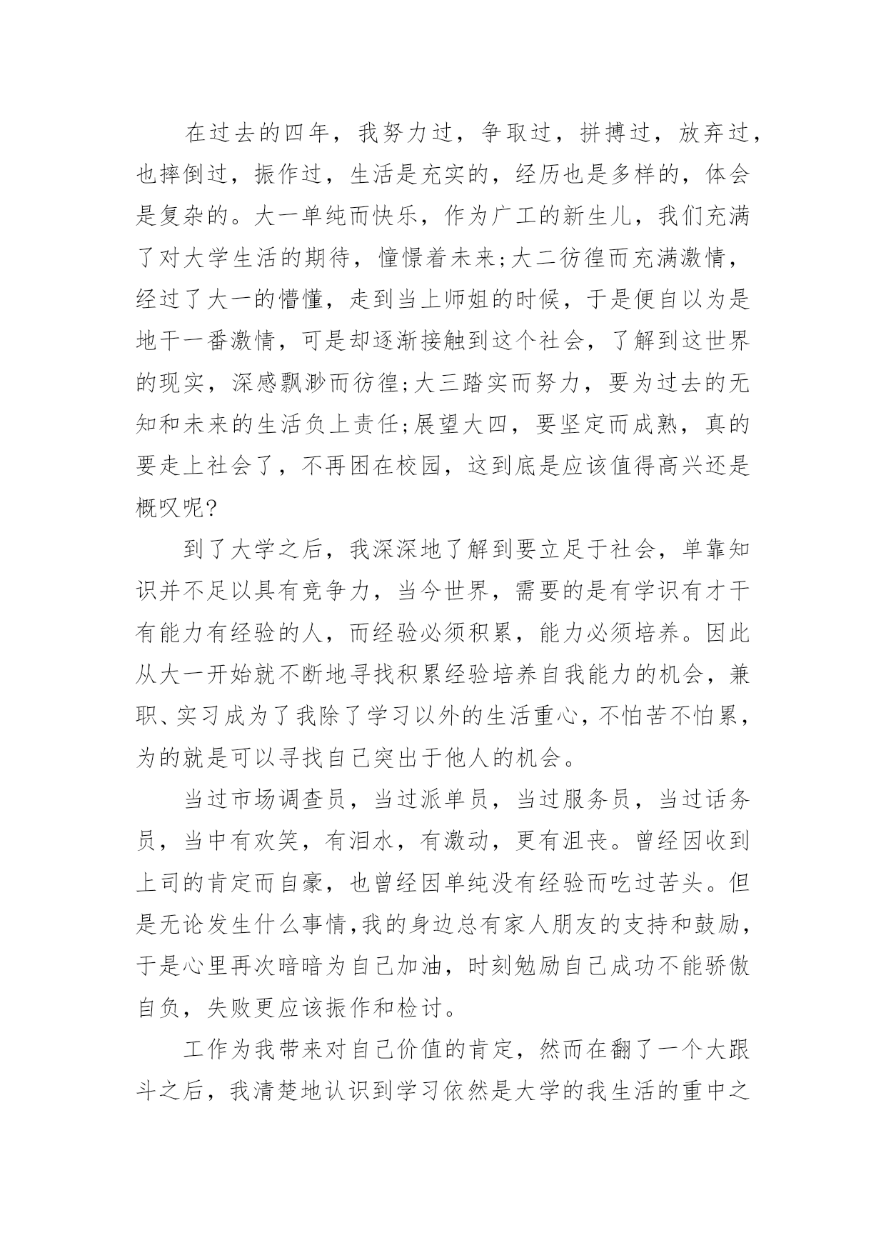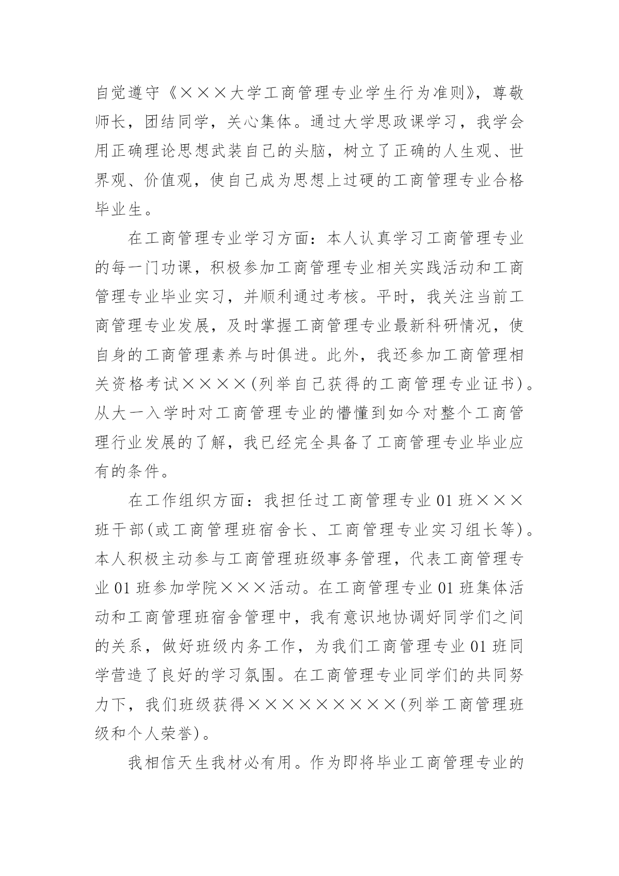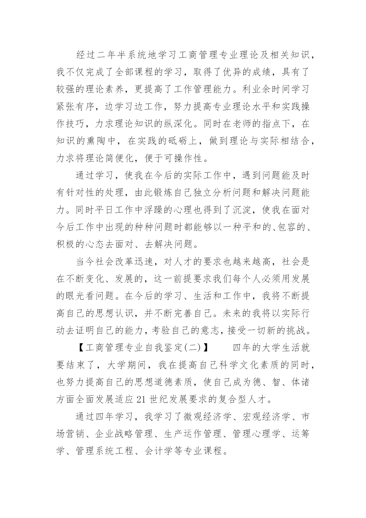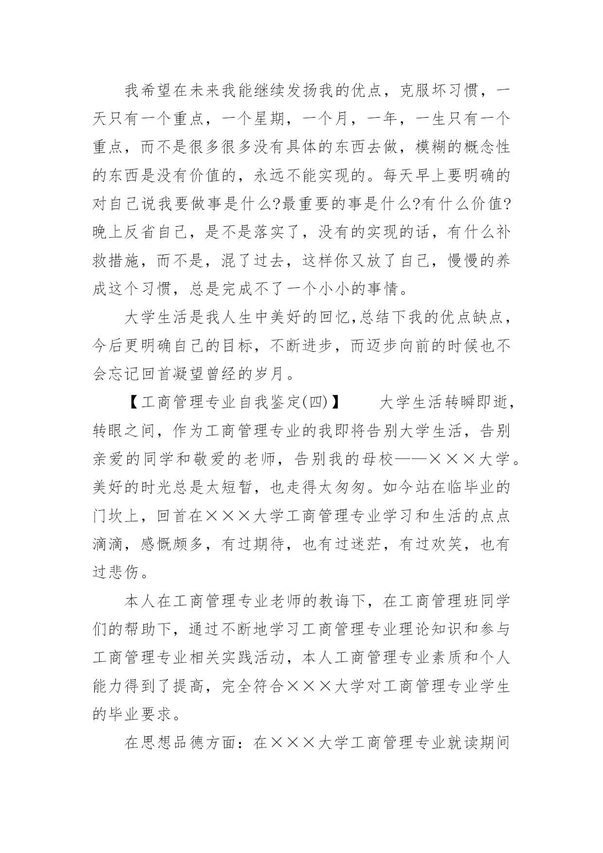 工商管理毕业自我鉴定报告工商管理毕业自我鉴定报告自我鉴定是针对自己的一些工作上、学习上或是生活上的总结,总结自己的优缺点,更能客观的看待自己的问题,下面就是小编整理的工商管理毕业自我鉴定报告,一起来看一下吧。【工商管理专业自我鉴定(一)】20xx年3月,怀揣着对知识的渴求,时隔8年之久,再次踏进校园,久违的亲切和宁静的感觉相拥而至,犹如世外桃源般的隔绝了整个城市的喧嚣。年少时由于家境原因只上到中专毕业,20xx年初涉职场时的青涩与困难让我明白,知识的诉求对我来说是多么的重要,有时哪怕只是一纸文凭,待遇上的差距也相别万千,这时才真正感觉到在学校读书时浪费了太多的时光。20xx—20xx年利用工作的空余时间自考完成了行政管理的大专课程。这期间收获的不仅仅是渴望已久的文凭,对我影响最大的是整个过程,那种学习的快乐与充实的感觉让我时常忘却工作中的艰辛。事实证明在这期间所形成的乐观的心态,坚毅的性格对我今后的职场生涯起到了很大的作用。所以20xx年当我的工作再次遇到瓶颈之时,我又选择了学习,只不过这次是走进校园。学习知识,获取文凭,更主要的是要解决浮躁的心理。经过二年半系统地学习工商管理专业理论及相关知识,我不仅完成了全部课程的学习,取得了优异的成绩,具有了较强的理论素养,更提高了工作管理能力。利业余时间学习紧张有序,边学习边工作,努力提高专业理论水平和实践操作技巧,力求理论知识的纵深化。同时在老师的指点下,在知识的熏陶中,在实践的砥砺上,做到理论与实际相结合,力求将理论简便化,便于可操作性。通过学习,使我在今后的实际工作中,遇到问题能及时有针对性的处理,由此锻炼自己独立分析问题和解决问题能力。同时平日工作中浮躁的心理也得到了沉淀,使我在面对今后工作中出现的种种问题时都能够以一种平和的、包容的、积极的心态去面对、去解决问题。当今社会改革迅速,对人才的要求也越来越高,社会是在不断变化、发展的,这一前提要求我们每个人必须用发展的眼光看问题。在今后的学习、生活和工作中,我将不断提高自己的思想认识,并不断完善自己。未来的我将以实际行动去证明自己的能力,考验自己的意志,接受一切新的挑战。【工商管理专业自我鉴定(二)】四年的大学生活就要结束了,大学期间,我在提高自己科学文化素质的同时,也努力提高自己的思想道德素质,使自己成为德、智、体诸方面全面发展适应21世纪发展要求的复合型人才。通过四年学习,我学习了微观经济学、宏观经济学、市场营销、企业战略管理、生产运作管理、管理心理学、运筹学、管理系统工程、会计学等专业课程。在过去的四年,我努力过,争取过,拼搏过,放弃过,也摔倒过,振作过,生活是充实的,经历也是多样的,体会是复杂的。大一单纯而快乐,作为广工的新生儿,我们充满了对大学生活的期待,憧憬着未来;大二彷徨而充满激情,经过了大一的懵懂,走到当上师姐的时候,于是便自以为是地干一番激情,可是却逐渐接触到这个社会,了解到这世界的现实,深感飘渺而彷徨;大三踏实而努力,要为过去的无知和未来的生活负上责任;展望大四,要坚定而成熟,真的要走上社会了,不再困在校园,这到底是应该值得高兴还是概叹呢?到了大学之后,我深深地了解到要立足于社会,单靠知识并不足以具有竞争力,当今世界,需要的是有学识有才干有能力有经验的人,而经验必须积累,能力必须培养。因此从大一开始就不断地寻找积累经验培养自我能力的机会,兼职、实习成为了我除了学习以外的生活重心,不怕苦不怕累,为的就是可以寻找自己突出于他人的机会。当过市场调查员,当过派单员,当过服务员,当过话务员,当中有欢笑,有泪水,有激动,更有沮丧。曾经因收到上司的肯定而自豪,也曾经因单纯没有经验而吃过苦头。但是无论发生什么事情,我的身边总有家人朋友的支持和鼓励,于是心里再次暗暗为自己加油,时刻勉励自己成功不能骄傲自负,失败更应该振作和检讨。工作为我带来对自己价值的肯定,然而在翻了一个大跟斗之后,我清楚地认识到学习依然是大学的我生活的重中之重,大学里面我还是不能放下学习。因为思想的偏差走进了误区,犯了错误,深刻的教训磨平了尖锐的角,使我懂得了脚踏实地。大学还有一年就要结束,我的人生却才刚刚开始,我将积极开拓人生之路,不断反省自我。【工商管理专业自我鉴定(三)】我是一名即将从南昌大学工商管理专业毕业的本科毕业生,通过几年的大学生活,我成长了很多。在即将毕业之时,我对自己的收获和感受作一个小结,并以此为我今后行动的指南。精彩的大学生活给了我很多挑战自我的机会,如系学生会的竞选,院里组织的演讲比赛,文化艺术节的文艺汇演、英语演讲比赛等。在参与这些活动的过程中,我结交了一些很好的朋友,学到了为人处事的方法,锻炼了自己的能力。这些经历使我明白有些事情如果尝试了,成功的机会就有一半,如果不去尝试,成功的几率只能为零。机会来临时,我们就要好好地把握住。