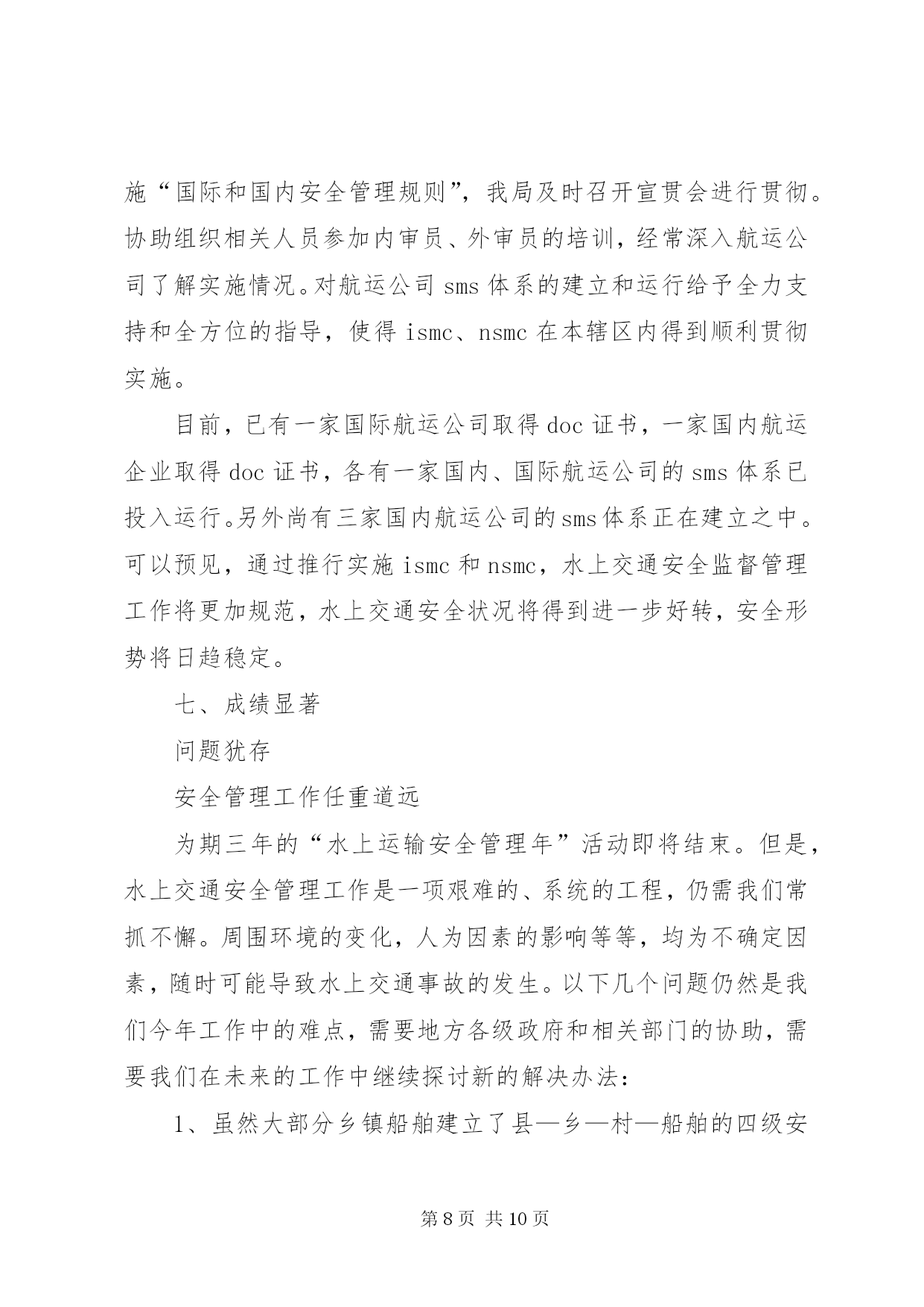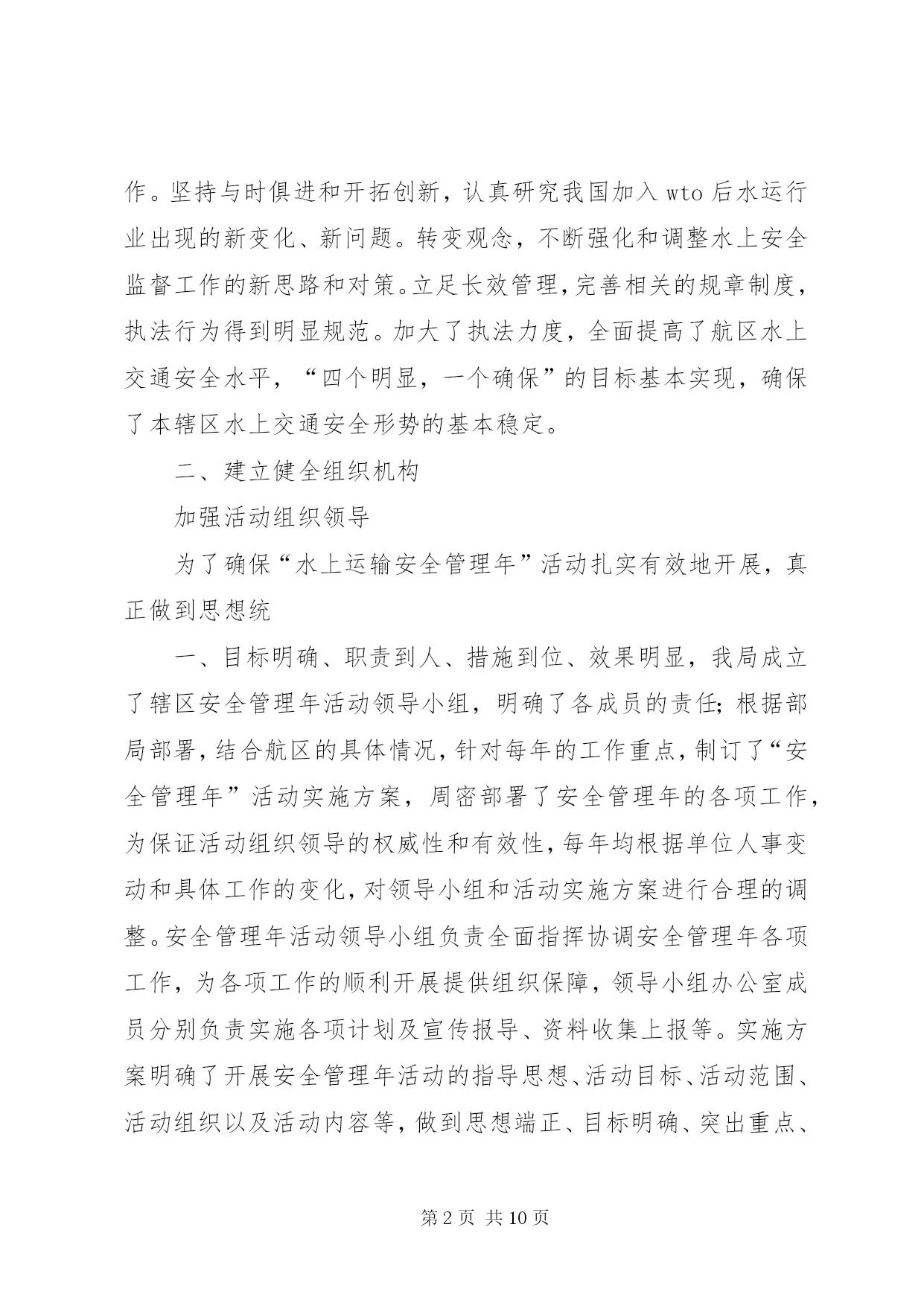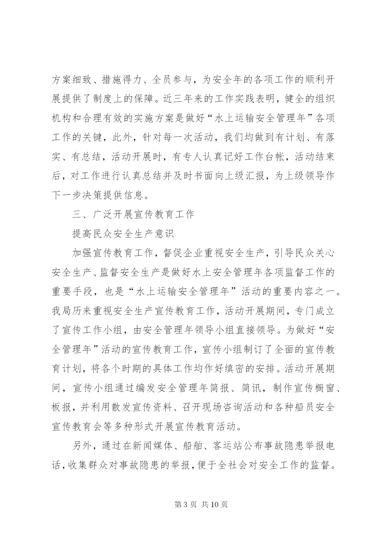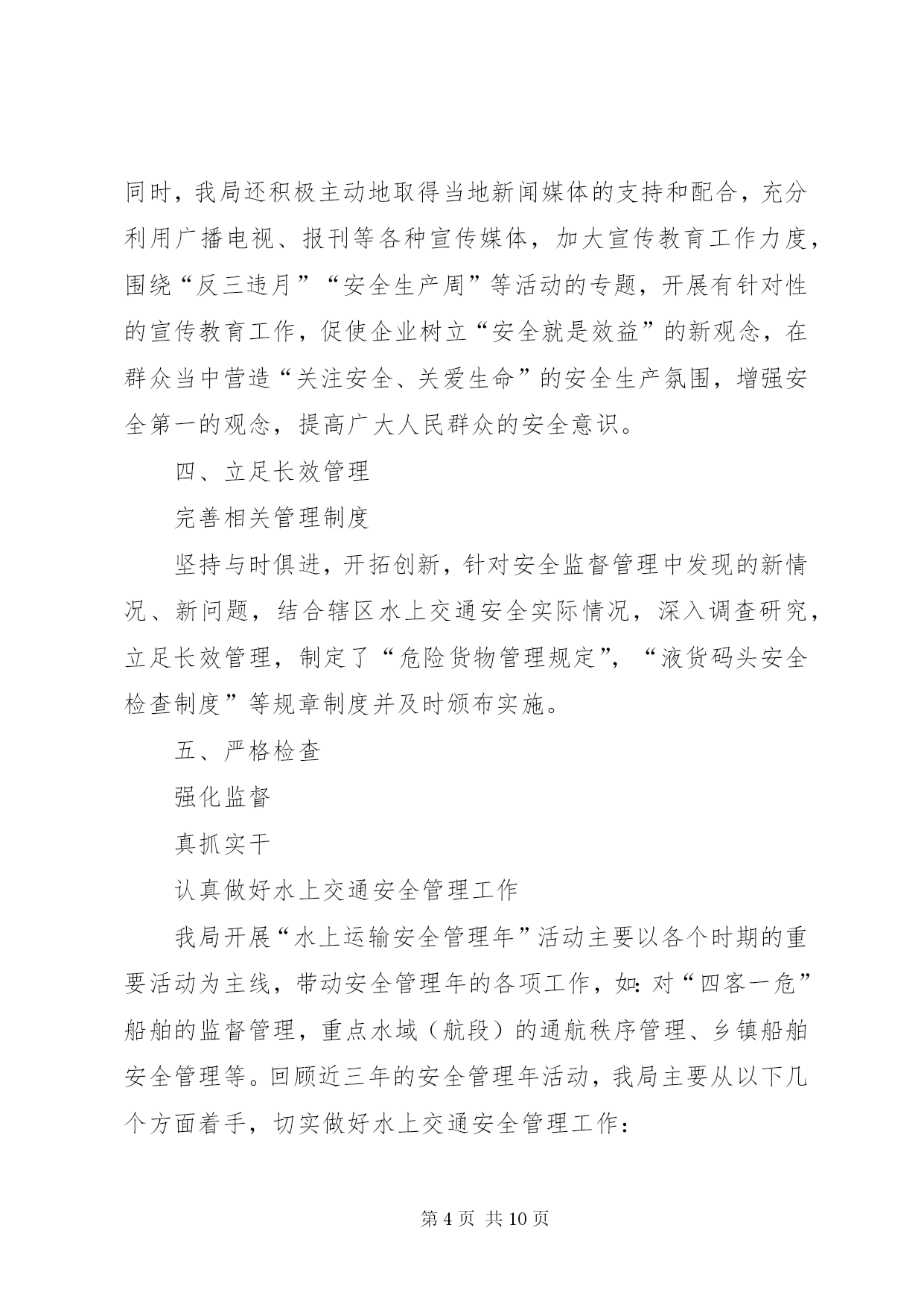 第PAGE\*Arabic\*MERGEFORMAT10页共NUMPAGES\*MERGEFORMAT10页交通安全管理规范为加强水上交通安全管理,稳定水上交通安全形势,保障国家和广大人民群众的生命财产安全,我局在上级部门的缜密部署和正确领导下,从2000年开始,连续开展了为期三年的“水上运输安全管理年”活动。活动开展以来,我局根据交通部的统一部署,结合航区的实际情况,投入了大量的人力物力,积极开展安全管理年各项工作。第一年抓基础管理,第二年以“四客一危”船舶、重点航区(航段)为重心开展“四项整顿”工作,第三年在前两年的基础上,立足长效管理,深化安全管理责任制,夯实水上安全管理基础,重点整改存在的安全隐患。通过近三年的努力,航区水上交通安全工作取得了阶段性成果,水上安全形势持续稳定,基本实际了“四个明显,一个确保”的活动目标,为今后水上交通安全的长效管理打下了良好的基础。现将我局开展“水上运输安全管理年”活动情况总结如下:一、明确指导思想和目标我们始终坚持以江泽民总书记“三个代表”的重要思想作为指导,以实现“四个明显,一个确保”作为活动的目标。充分认识到水上交通安全工作事关发展和稳定大局,事关海事人能否全心全意实践“三个代表”的重要思想,从“讲政治、保稳定、促发展”的高度和努力实践“三个代表”的要求出发,以海事人特有的责任感和使命感,认真细致地开展安全管理年活动的各项工作。坚持与时俱进和开拓创新,认真研究我国加入wto后水运行业出现的新变化、新问题。转变观念,不断强化和调整水上安全监督工作的新思路和对策。立足长效管理,完善相关的规章制度,执法行为得到明显规范。加大了执法力度,全面提高了航区水上交通安全水平,“四个明显,一个确保”的目标基本实现,确保了本辖区水上交通安全形势的基本稳定。二、建立健全组织机构加强活动组织领导为了确保“水上运输安全管理年”活动扎实有效地开展,真正做到思想统一、目标明确、职责到人、措施到位、效果明显,我局成立了辖区安全管理年活动领导小组,明确了各成员的责任;根据部局部署,结合航区的具体情况,针对每年的工作重点,制订了“安全管理年”活动实施方案,周密部署了安全管理年的各项工作,为保证活动组织领导的权威性和有效性,每年均根据单位人事变动和具体工作的变化,对领导小组和活动实施方案进行合理的调整。安全管理年活动领导小组负责全面指挥协调安全管理年各项工作,为各项工作的顺利开展提供组织保障,领导小组办公室成员分别负责实施各项计划及宣传报导、资料收集上报等。实施方案明确了开展安全管理年活动的指导思想、活动目标、活动范围、活动组织以及活动内容等,做到思想端正、目标明确、突出重点、方案细致、措施得力、全员参与,为安全年的各项工作的顺利开展提供了制度上的保障。近三年来的工作实践表明,健全的组织机构和合理有效的实施方案是做好“水上运输安全管理年”各项工作的关键,此外,针对每一次活动,我们均做到有计划、有落实、有总结,活动开展时,有专人认真记好工作台帐,活动结束后,对工作进行认真总结并及时书面向上级汇报,为上级领导作下一步决策提供信息。三、广泛开展宣传教育工作提高民众安全生产意识加强宣传教育工作,督促企业重视安全生产,引导民众关心安全生产、监督安全生产是做好水上安全管理年各项监督工作的重要手段,也是“水上运输安全管理年”活动的重要内容之一。我局历来重视安全生产宣传教育工作,活动开展期间,专门成立了宣传工作小组,由安全管理年领导小组直接领导。为做好“安全管理年”活动的宣传教育工作,宣传小组制订了全面的宣传教育计划,将各个时期的具体工作均作好缜密的安排。活动开展期间,宣传小组通过编发安全管理年简报、简讯,制作宣传橱窗、板报,并利用散发宣传资料、召开现场咨询活动和各种船员安全宣传教育会等多种形式开展宣传教育活动。另外,通过在新闻媒体、船舶、客运站公布事故隐患举报电话,收集群众对事故隐患的举报,便于全社会对安全工作的监督。同时,我局还积极主动地取得当地新闻媒体的支持和配合,充分利用广播电视、报刊等各种宣传媒体,加大宣传教育工作力度,围绕“反三违月”“安全生产周”等活动的专题,开展有针对性的宣传教育工作,促使企业树立“安全就是效益”的新观念,在群众当中营造“关注安全、关爱生命”的安全生产氛围,增强安全第一的观念,提高广大人民群众的安全意识。四、立足长效管理完善相关管理制度坚持与时俱进,开拓创新,针对安全监督管理中发现的新情况、新问题,结合辖区水上交通安全实际情况,深入调查研究,立足长效管理,制定了“危险货物管理规定”,“液货码头安全检查制度”等规章制度并及时颁布实施。五、严格检查强化监督真抓实干认真做好水上交通安全管理工作我局开展“水上运输安全管理年”活动主要以各个时期的重要活动为主线,带动安全管理年的各项工作