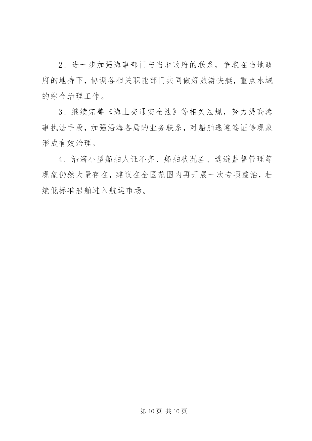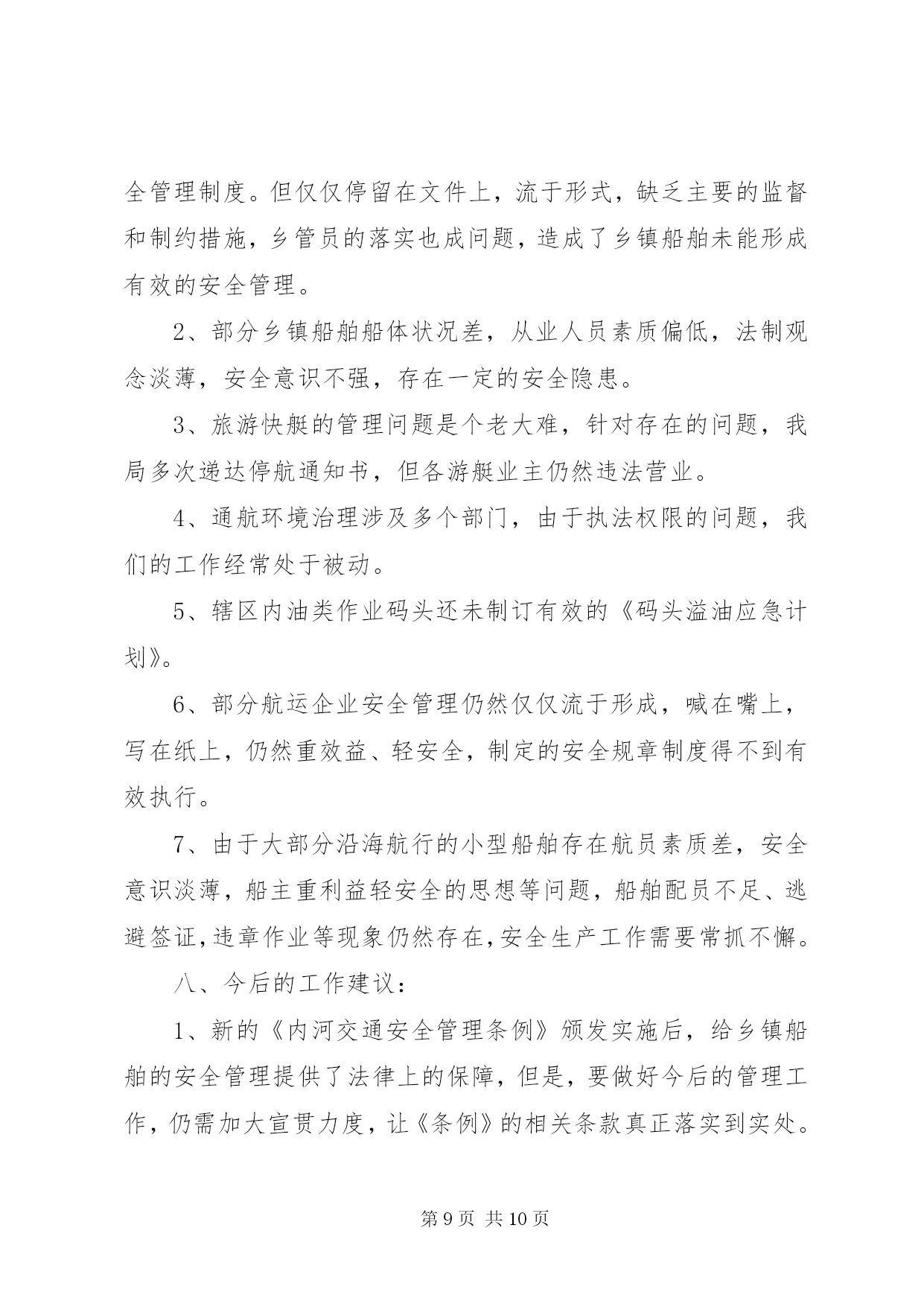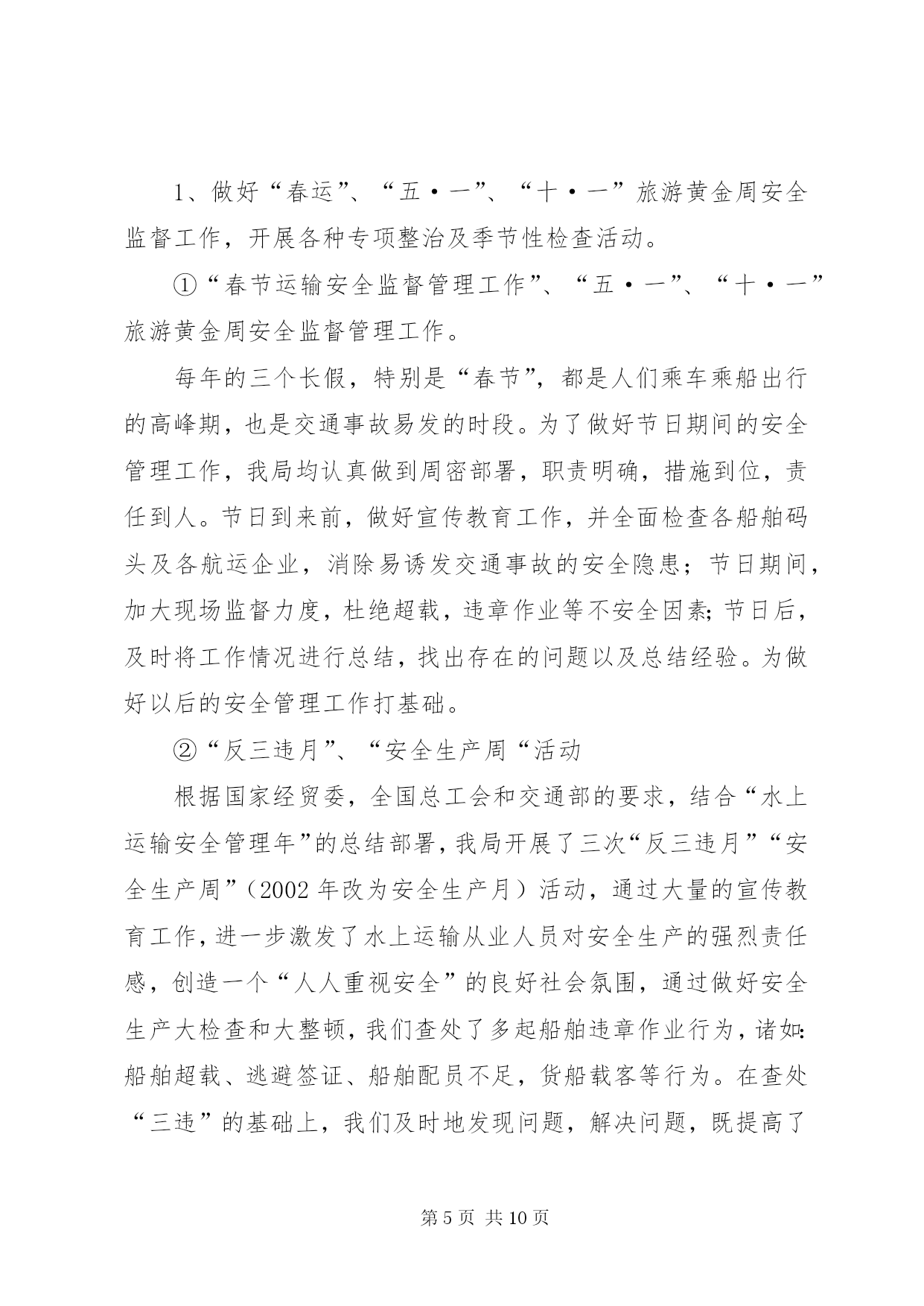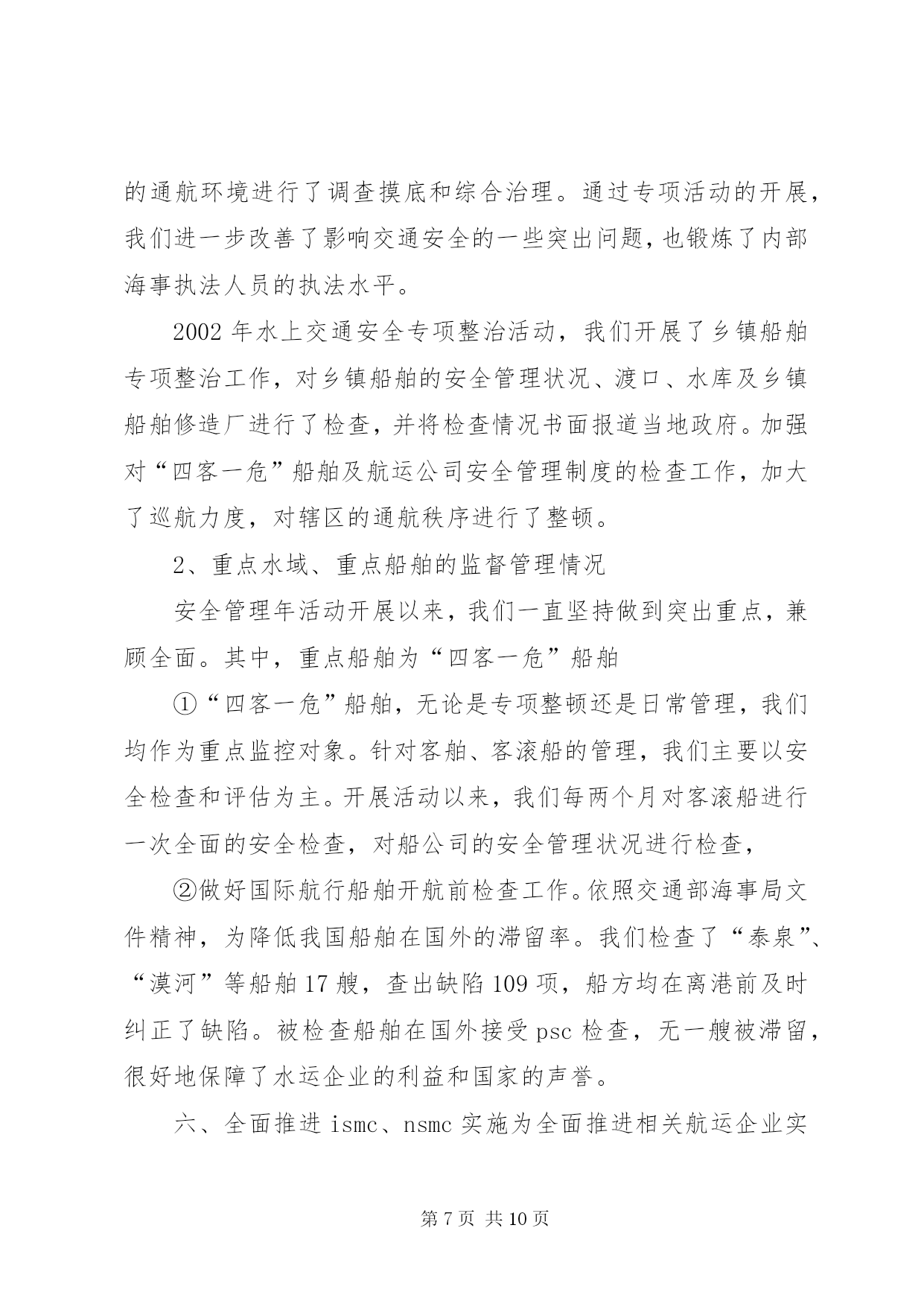 第PAGE\*Arabic\*MERGEFORMAT10页共NUMPAGES\*MERGEFORMAT10页交通安全管理规范为加强水上交通安全管理,稳定水上交通安全形势,保障国家和广大人民群众的生命财产安全,我局在上级部门的缜密部署和正确领导下,从2000年开始,连续开展了为期三年的“水上运输安全管理年”活动。活动开展以来,我局根据交通部的统一部署,结合航区的实际情况,投入了大量的人力物力,积极开展安全管理年各项工作。第一年抓基础管理,第二年以“四客一危”船舶、重点航区(航段)为重心开展“四项整顿”工作,第三年在前两年的基础上,立足长效管理,深化安全管理责任制,夯实水上安全管理基础,重点整改存在的安全隐患。通过近三年的努力,航区水上交通安全工作取得了阶段性成果,水上安全形势持续稳定,基本实际了“四个明显,一个确保”的活动目标,为今后水上交通安全的长效管理打下了良好的基础。现将我局开展“水上运输安全管理年”活动情况总结如下:一、明确指导思想和目标我们始终坚持以江泽民总书记“三个代表”的重要思想作为指导,以实现“四个明显,一个确保”作为活动的目标。充分认识到水上交通安全工作事关发展和稳定大局,事关海事人能否全心全意实践“三个代表”的重要思想,从“讲政治、保稳定、促发展”的高度和努力实践“三个代表”的要求出发,以海事人特有的责任感和使命感,认真细致地开展安全管理年活动的各项工作。坚持与时俱进和开拓创新,认真研究我国加入wto后水运行业出现的新变化、新问题。转变观念,不断强化和调整水上安全监督工作的新思路和对策。立足长效管理,完善相关的规章制度,执法行为得到明显规范。加大了执法力度,全面提高了航区水上交通安全水平,“四个明显,一个确保”的目标基本实现,确保了本辖区水上交通安全形势的基本稳定。二、建立健全组织机构加强活动组织领导为了确保“水上运输安全管理年”活动扎实有效地开展,真正做到思想统一、目标明确、职责到人、措施到位、效果明显,我局成立了辖区安全管理年活动领导小组,明确了各成员的责任;根据部局部署,结合航区的具体情况,针对每年的工作重点,制订了“安全管理年”活动实施方案,周密部署了安全管理年的各项工作,为保证活动组织领导的权威性和有效性,每年均根据单位人事变动和具体工作的变化,对领导小组和活动实施方案进行合理的调整。安全管理年活动领导小组负责全面指挥协调安全管理年各项工作,为各项工作的顺利开展提供组织保障,领导小组办公室成员分别负责实施各项计划及宣传报导、资料收集上报等。实施方案明确了开展安全管理年活动的指导思想、活动目标、活动范围、活动组织以及活动内容等,做到思想端正、目标明确、突出重点、方案细致、措施得力、全员参与,为安全年的各项工作的顺利开展提供了制度上的保障。近三年来的工作实践表明,健全的组织机构和合理有效的实施方案是做好“水上运输安全管理年”各项工作的关键,此外,针对每一次活动,我们均做到有计划、有落实、有总结,活动开展时,有专人认真记好工作台帐,活动结束后,对工作进行认真总结并及时书面向上级汇报,为上级领导作下一步决策提供信息。三、广泛开展宣传教育工作提高民众安全生产意识加强宣传教育工作,督促企业重视安全生产,引导民众关心安全生产、监督安全生产是做好水上安全管理年各项监督工作的重要手段,也是“水上运输安全管理年”活动的重要内容之一。我局历来重视安全生产宣传教育工作,活动开展期间,专门成立了宣传工作小组,由安全管理年领导小组直接领导。为做好“安全管理年”活动的宣传教育工作,宣传小组制订了全面的宣传教育计划,将各个时期的具体工作均作好缜密的安排。活动开展期间,宣传小组通过编发安全管理年简报、简讯,制作宣传橱窗、板报,并利用散发宣传资料、召开现场咨询活动和各种船员安全宣传教育会等多种形式开展宣传教育活动。另外,通过在新闻媒体、船舶、客运站公布事故隐患举报电话,收集群众对事故隐患的举报,便于全社会对安全工作的监督。同时,我局还积极主动地取得当地新闻媒体的支持和配合,充分利用广播电视、报刊等各种宣传媒体,加大宣传教育工作力度,围绕“反三违月”“安全生产周”等活动的专题,开展有针对性的宣传教育工作,促使企业树立“安全就是效益”的新观念,在群众当中营造“关注安全、关爱生命”的安全生产氛围,增强安全第一的观念,提高广大人民群众的安全意识。四、立足长效管理完善相关管理制度坚持与时俱进,开拓创新,针对安全监督管理中发现的新情况、新问题,结合辖区水上交通安全实际情况,深入调查研究,立足长效管理,制定了“危险货物管理规定”,“液货码头安全检查制度”等规章制度并及时颁布实施。五、严格检查强化监督真抓实干认真做好水上交通安全管理工作我局开展“水上运输安全管理年”活动主要以各个时期的重要活动为主线,带动安全管理年的各项工作