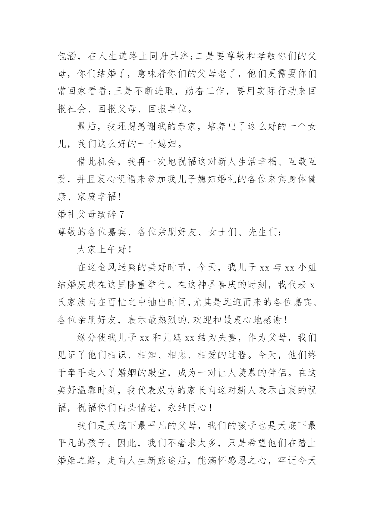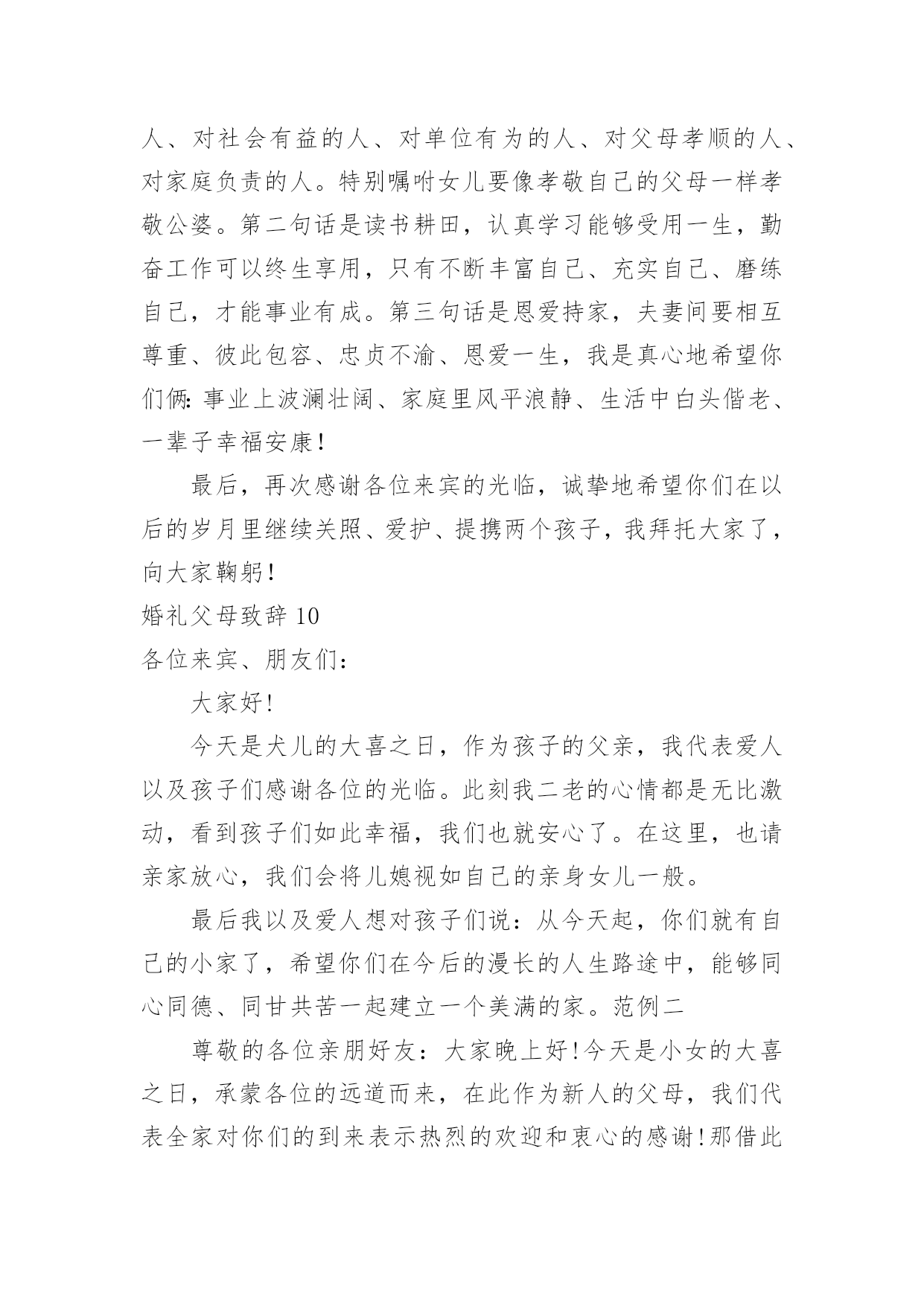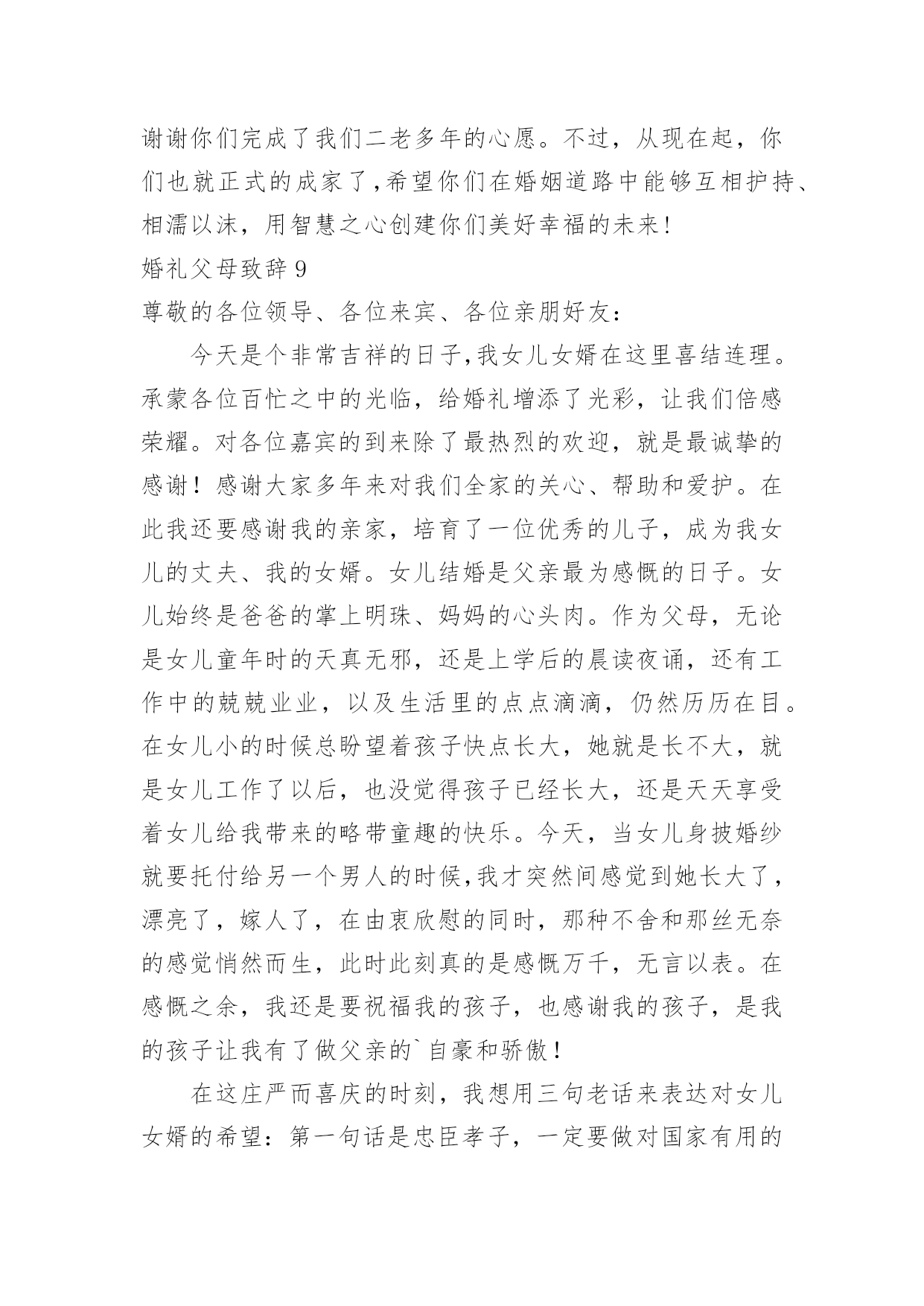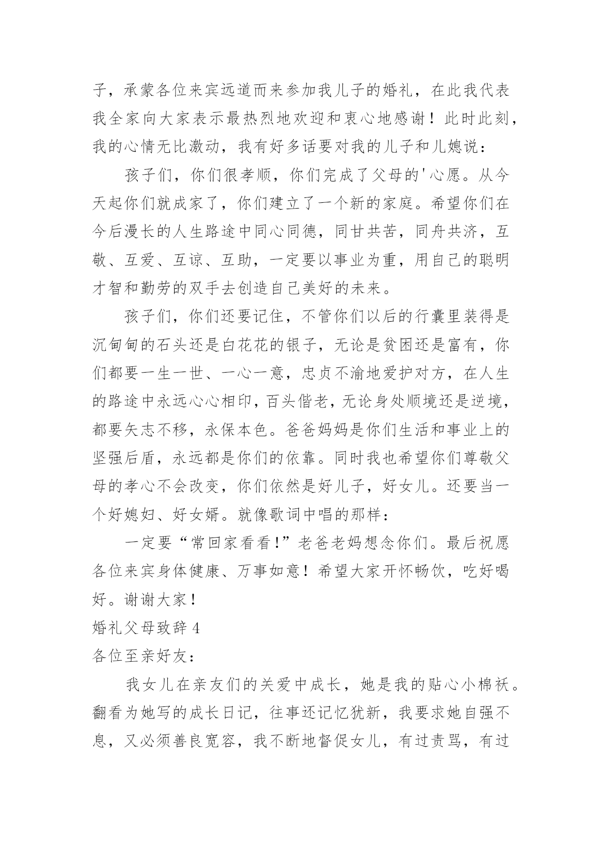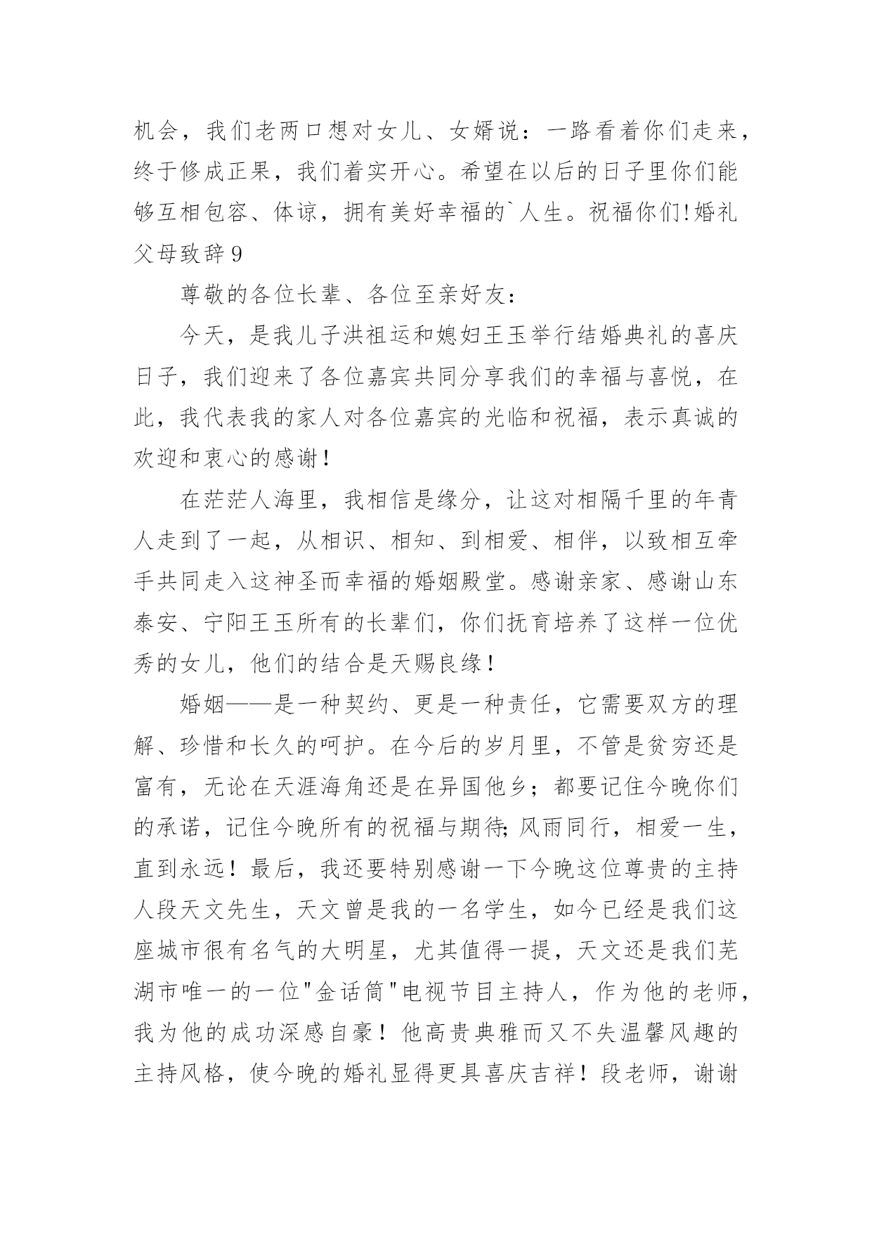 婚礼父母致辞婚礼父母致辞[优选]无论在学习、工作或是生活中,大家都经常接触到致辞吧,致辞具有“礼仪性”或“仪式化”的特点,要特别注意措辞得体。那么你有真正了解过致辞吗?下面是小编为大家收集的婚礼父母致辞,欢迎阅读,希望大家能够喜欢。婚礼父母致辞1尊敬的各位领导、各位来宾:大家好!今天是小儿新婚大喜的日子,我和我的家人心情非常激动,感谢各位来宾的光临,使他们的`新婚典礼更加隆重、更加圆满。在这个大喜的日子里,我要感谢在成长过程中付出了艰辛努力的单位领导及亲朋好友,正是你们的辛勤培养,才使他从一个不懂事的孩子成长为一个对社会、对国家有用的人,我代表xxX的母亲向各位亲朋好友表示衷心的感谢!同时呢,今天我还要向亲家表示衷心的感谢,谢谢你们把这么一个好女儿嫁给了xx。尽管今天结婚了,我还是要对陈青涛说几句,以后你要好好工作、好好做人,在外与朋友们好好相处,在家里要好好孝敬双方老人,对xxX要好好对待,一定要尽到一个做丈夫的责任,维护好自己的小家庭。最后,让我再次感谢各位来宾的光临,请大家吃好、喝好、玩得开心,谢谢!婚礼父母致辞2尊敬的各位来宾:大家好!今天我的心情非常激动,今天是我儿子xxx和儿媳xxx喜结良缘的美好日子,我感到非常高兴和荣欣。高兴的是这对新人今天携手共同走进了他们婚礼的殿堂,开始了他们新的人生,我们也算完成了一个光荣的.任务。荣幸的是有那么多的亲朋好友和父老乡亲送来了他们真挚的祝福。我要感谢亲家父母,养育了知书达理、文静娴淑的好女儿,能让她成为我们家庭中的一员,我们很有幸。以后的日子里,我们会像对待亲生女儿一样关心她、呵护她,请亲家放心。作为父母,看到xxx、xxx,由相识到相知,情意相投,心息相通,志同道合,今日喜结连理定终身,我们非常高兴。看到他们在生活和工作中不断成长,日益成熟,我们深感欣慰。你们要珍惜美好情缘,互敬互爱;要做到温存仁爱胸宽,互慰互谅;要学会体贴谦和大度,互助互让;要能够坦诚携手向前,互信互励。你们要尊敬长辈,孝顺父母,善待他人,知恩感恩,懂得回报。希望你们:永远比翼双飞,始终相濡以沫,让岁月见证承诺,让恩爱相伴一生。最后,祝福两位新人新婚愉快、幸福美满。婚礼父母致辞3各位来宾:大家中午好!今天是我儿子x与xx喜结良缘的大喜日子,承蒙各位来宾远道而来参加我儿子的婚礼,在此我代表我全家向大家表示最热烈地欢迎和衷心地感谢!此时此刻,我的心情无比激动,我有好多话要对我的儿子和儿媳说:孩子们,你们很孝顺,你们完成了父母的'心愿。从今天起你们就成家了,你们建立了一个新的家庭。希望你们在今后漫长的人生路途中同心同德,同甘共苦,同舟共济,互敬、互爱、互谅、互助,一定要以事业为重,用自己的聪明才智和勤劳的双手去创造自己美好的未来。孩子们,你们还要记住,不管你们以后的行囊里装得是沉甸甸的石头还是白花花的银子,无论是贫困还是富有,你们都要一生一世、一心一意,忠贞不渝地爱护对方,在人生的路途中永远心心相印,百头偕老,无论身处顺境还是逆境,都要矢志不移,永保本色。爸爸妈妈是你们生活和事业上的坚强后盾,永远都是你们的依靠。同时我也希望你们尊敬父母的孝心不会改变,你们依然是好儿子,好女儿。还要当一个好媳妇、好女婿。就像歌词中唱的那样:一定要“常回家看看!”老爸老妈想念你们。最后祝愿各位来宾身体健康、万事如意!希望大家开怀畅饮,吃好喝好。谢谢大家!婚礼父母致辞4各位至亲好友:我女儿在亲友们的关爱中成长,她是我的贴心小棉袄。翻看为她写的成长日记,往事还记忆犹新,我要求她自强不息,又必须善良宽容,我不断地督促女儿,有过责骂,有过担心。今天,女儿让我有了做父亲的欣慰,我祝福女儿,也感谢女儿。随着女儿渐渐长大,我和她母亲对女儿的感情也更加复杂,一方面她要离开父母,一方面她的未来如何?我们祈盼女儿能受到爱神光顾,获得她应有的幸福。今天,我们要把她交给值得托付的人。希望女婿永远保护、爱惜女儿。在这庄重的婚礼上,我要向儿女说三句话:第一句,是一副老对联:“一等人忠臣孝子,两件事读书耕田”,做对国家有用的人,做对家庭有责任的人,好读书能受用一生,认真工作就一辈子有饭吃;第二句,是一句老话:“浴不必江海,要之去垢;马不必骐骥,到爱神光顾,获得她应有的幸福。今天,我们要把她交给值得托付的人。希望女婿永远保护、爱惜女儿。在这庄重的婚礼上,我要向儿女说三句话:第一句,是一副老对联:“一等人忠臣孝子,两件事读书耕田”,做对国家有用的人,做对家庭有责任的人,好读书能受用一生,认真工作就一辈子有饭吃;第二句,是一句老话:“浴不必江海,要之去垢;马不必骐骥,要之善走”,做普通人,干正经事,可以爱钱,但必须取之有道。第三句话:“心往一处想,劲往一处使”,一起过日子,要磨合、培养、建设、完善你们的婚姻。婚姻是生活化的爱情,会遇到矛盾和问题。希望儿女追求生活