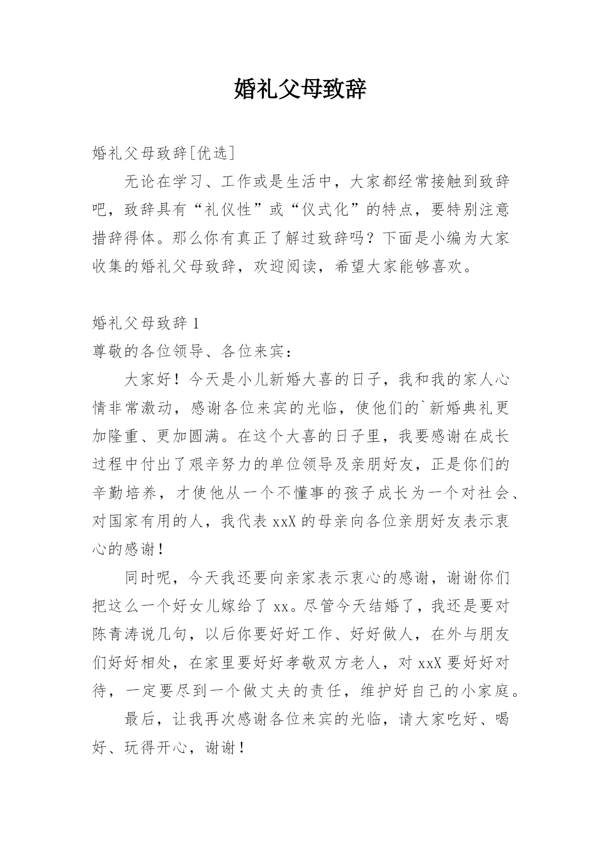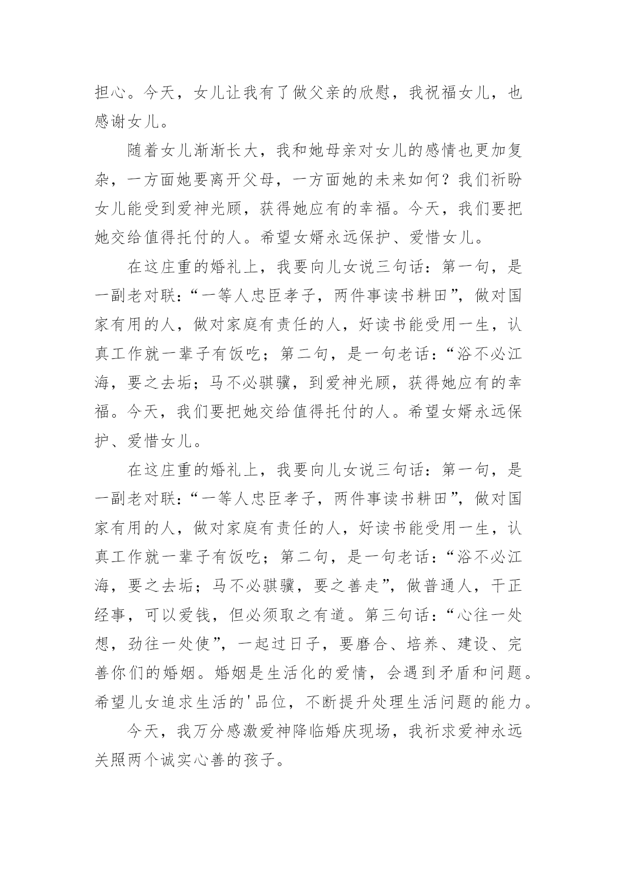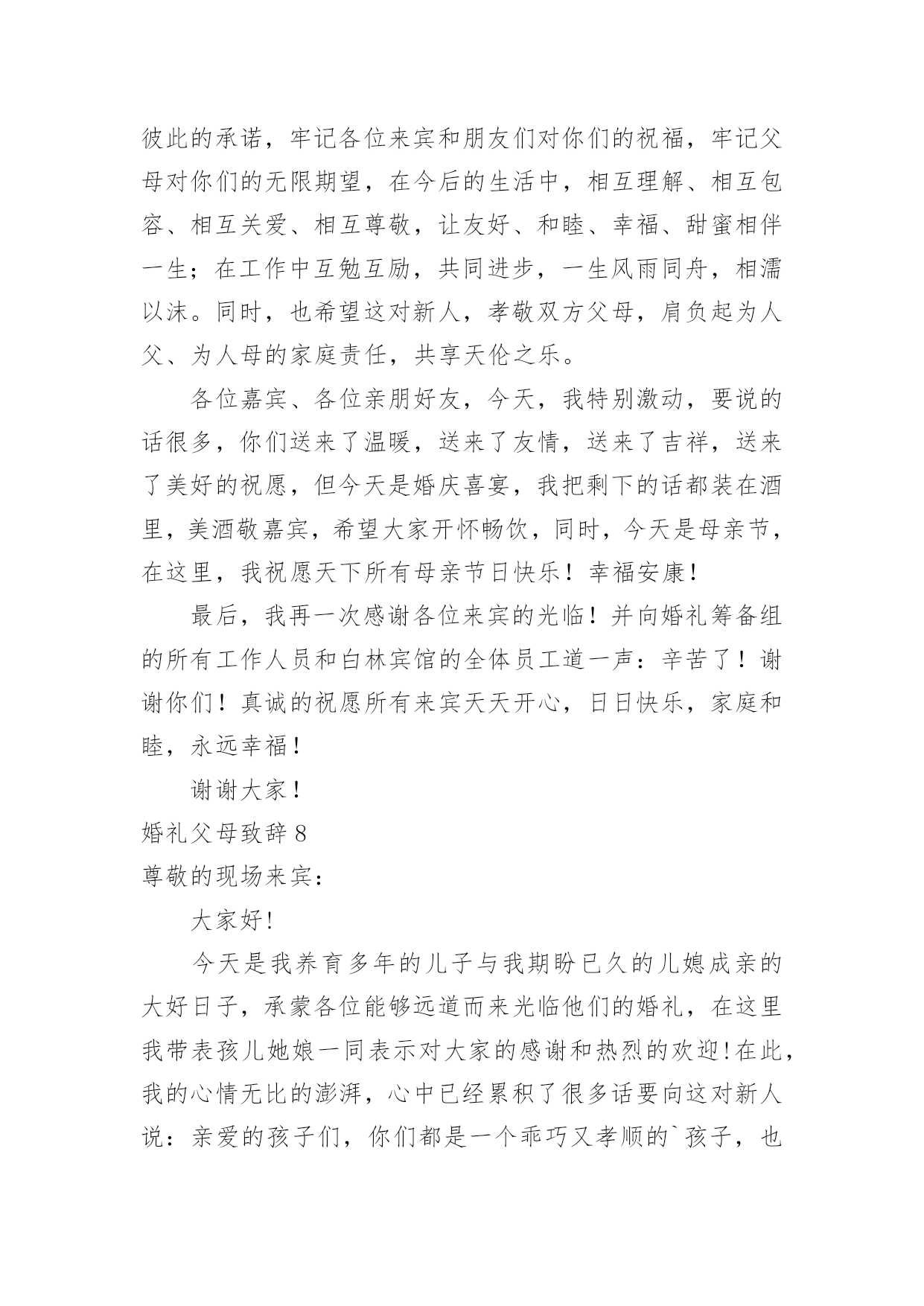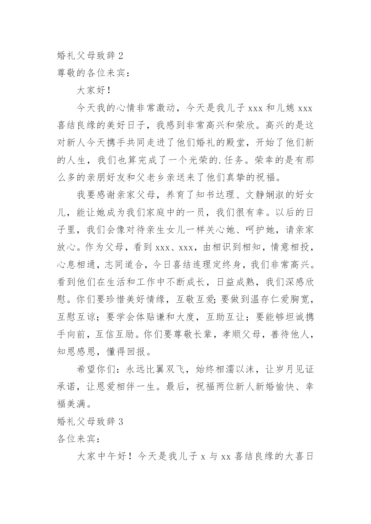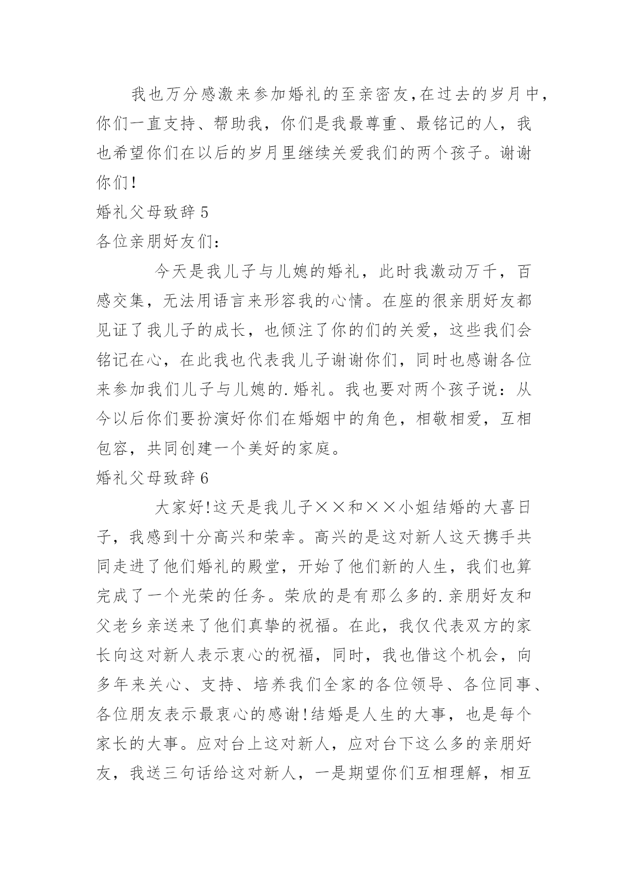 婚礼父母致辞婚礼父母致辞[优选]无论在学习、工作或是生活中,大家都经常接触到致辞吧,致辞具有“礼仪性”或“仪式化”的特点,要特别注意措辞得体。那么你有真正了解过致辞吗?下面是小编为大家收集的婚礼父母致辞,欢迎阅读,希望大家能够喜欢。婚礼父母致辞1尊敬的各位领导、各位来宾:大家好!今天是小儿新婚大喜的日子,我和我的家人心情非常激动,感谢各位来宾的光临,使他们的`新婚典礼更加隆重、更加圆满。在这个大喜的日子里,我要感谢在成长过程中付出了艰辛努力的单位领导及亲朋好友,正是你们的辛勤培养,才使他从一个不懂事的孩子成长为一个对社会、对国家有用的人,我代表xxX的母亲向各位亲朋好友表示衷心的感谢!同时呢,今天我还要向亲家表示衷心的感谢,谢谢你们把这么一个好女儿嫁给了xx。尽管今天结婚了,我还是要对陈青涛说几句,以后你要好好工作、好好做人,在外与朋友们好好相处,在家里要好好孝敬双方老人,对xxX要好好对待,一定要尽到一个做丈夫的责任,维护好自己的小家庭。最后,让我再次感谢各位来宾的光临,请大家吃好、喝好、玩得开心,谢谢!婚礼父母致辞2尊敬的各位来宾:大家好!今天我的心情非常激动,今天是我儿子xxx和儿媳xxx喜结良缘的美好日子,我感到非常高兴和荣欣。高兴的是这对新人今天携手共同走进了他们婚礼的殿堂,开始了他们新的人生,我们也算完成了一个光荣的.任务。荣幸的是有那么多的亲朋好友和父老乡亲送来了他们真挚的祝福。我要感谢亲家父母,养育了知书达理、文静娴淑的好女儿,能让她成为我们家庭中的一员,我们很有幸。以后的日子里,我们会像对待亲生女儿一样关心她、呵护她,请亲家放心。作为父母,看到xxx、xxx,由相识到相知,情意相投,心息相通,志同道合,今日喜结连理定终身,我们非常高兴。看到他们在生活和工作中不断成长,日益成熟,我们深感欣慰。你们要珍惜美好情缘,互敬互爱;要做到温存仁爱胸宽,互慰互谅;要学会体贴谦和大度,互助互让;要能够坦诚携手向前,互信互励。你们要尊敬长辈,孝顺父母,善待他人,知恩感恩,懂得回报。希望你们:永远比翼双飞,始终相濡以沫,让岁月见证承诺,让恩爱相伴一生。最后,祝福两位新人新婚愉快、幸福美满。婚礼父母致辞3各位来宾:大家中午好!今天是我儿子x与xx喜结良缘的大喜日子,承蒙各位来宾远道而来参加我儿子的婚礼,在此我代表我全家向大家表示最热烈地欢迎和衷心地感谢!此时此刻,我的心情无比激动,我有好多话要对我的儿子和儿媳说:孩子们,你们很孝顺,你们完成了父母的'心愿。从今天起你们就成家了,你们建立了一个新的家庭。希望你们在今后漫长的人生路途中同心同德,同甘共苦,同舟共济,互敬、互爱、互谅、互助,一定要以事业为重,用自己的聪明才智和勤劳的双手去创造自己美好的未来。孩子们,你们还要记住,不管你们以后的行囊里装得是沉甸甸的石头还是白花花的银子,无论是贫困还是富有,你们都要一生一世、一心一意,忠贞不渝地爱护对方,在人生的路途中永远心心相印,百头偕老,无论身处顺境还是逆境,都要矢志不移,永保本色。爸爸妈妈是你们生活和事业上的坚强后盾,永远都是你们的依靠。同时我也希望你们尊敬父母的孝心不会改变,你们依然是好儿子,好女儿。还要当一个好媳妇、好女婿。就像歌词中唱的那样:一定要“常回家看看!”老爸老妈想念你们。最后祝愿各位来宾身体健康、万事如意!希望大家开怀畅饮,吃好喝好。谢谢大家!婚礼父母致辞4各位至亲好友:我女儿在亲友们的关爱中成长,她是我的贴心小棉袄。翻看为她写的成长日记,往事还记忆犹新,我要求她自强不息,又必须善良宽容,我不断地督促女儿,有过责骂,有过担心。今天,女儿让我有了做父亲的欣慰,我祝福女儿,也感谢女儿。随着女儿渐渐长大,我和她母亲对女儿的感情也更加复杂,一方面她要离开父母,一方面她的未来如何?我们祈盼女儿能受到爱神光顾,获得她应有的幸福。今天,我们要把她交给值得托付的人。希望女婿永远保护、爱惜女儿。在这庄重的婚礼上,我要向儿女说三句话:第一句,是一副老对联:“一等人忠臣孝子,两件事读书耕田”,做对国家有用的人,做对家庭有责任的人,好读书能受用一生,认真工作就一辈子有饭吃;第二句,是一句老话:“浴不必江海,要之去垢;马不必骐骥,到爱神光顾,获得她应有的幸福。今天,我们要把她交给值得托付的人。希望女婿永远保护、爱惜女儿。在这庄重的婚礼上,我要向儿女说三句话:第一句,是一副老对联:“一等人忠臣孝子,两件事读书耕田”,做对国家有用的人,做对家庭有责任的人,好读书能受用一生,认真工作就一辈子有饭吃;第二句,是一句老话:“浴不必江海,要之去垢;马不必骐骥,要之善走”,做普通人,干正经事,可以爱钱,但必须取之有道。第三句话:“心往一处想,劲往一处使”,一起过日子,要磨合、培养、建设、完善你们的婚姻。婚姻是生活化的爱情,会遇到矛盾和问题。希望儿女追求生活