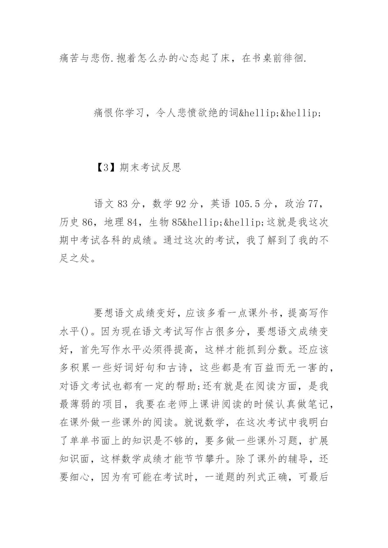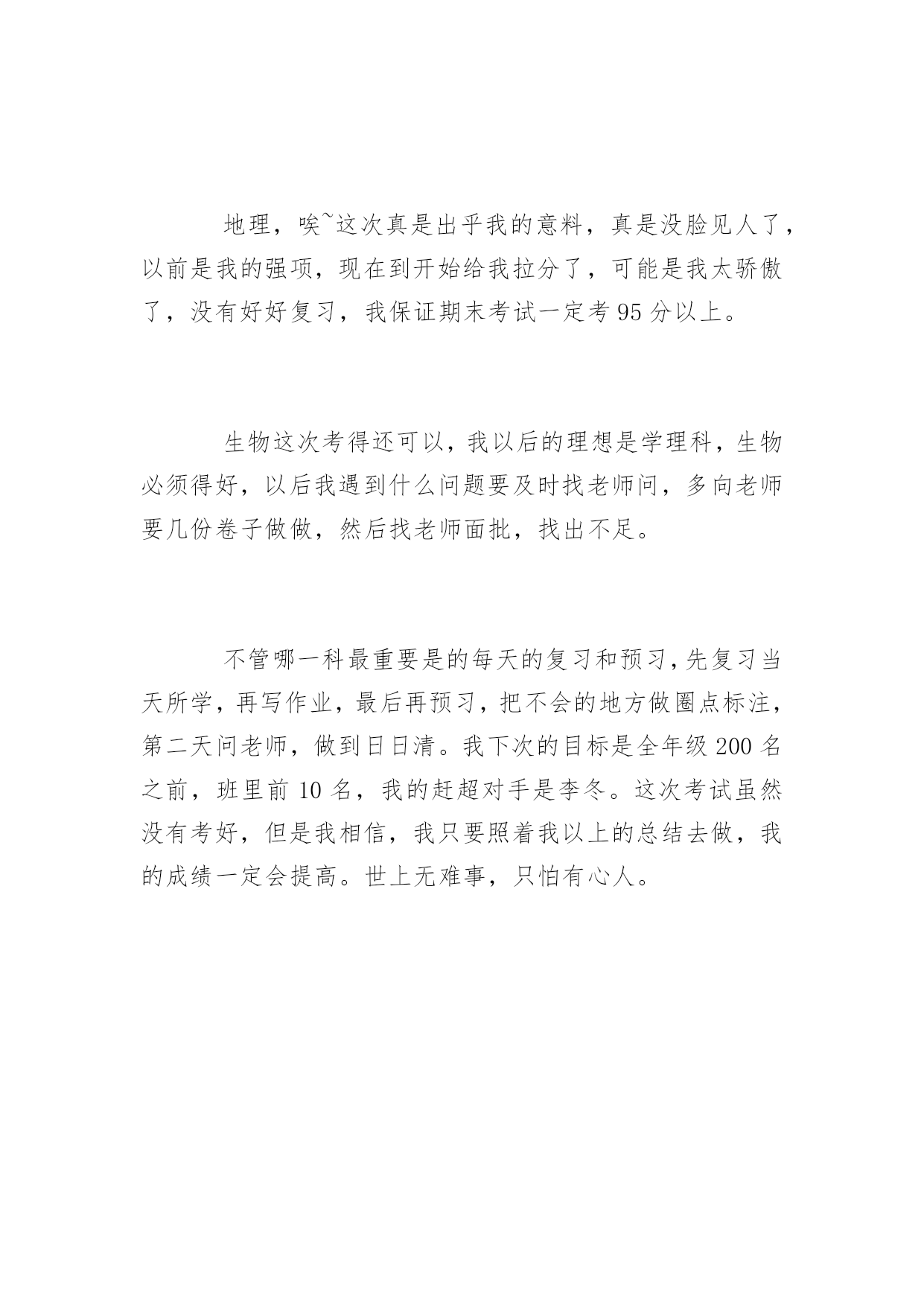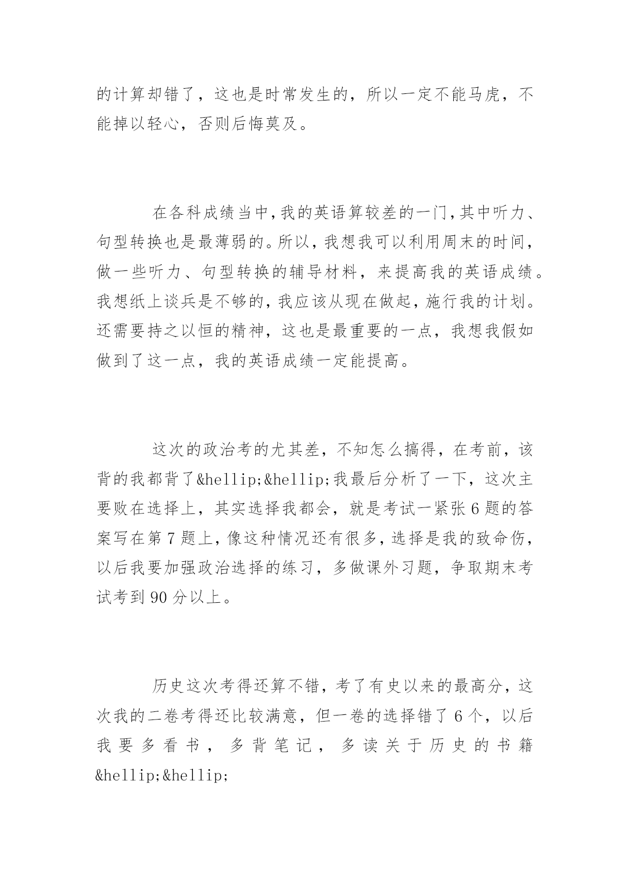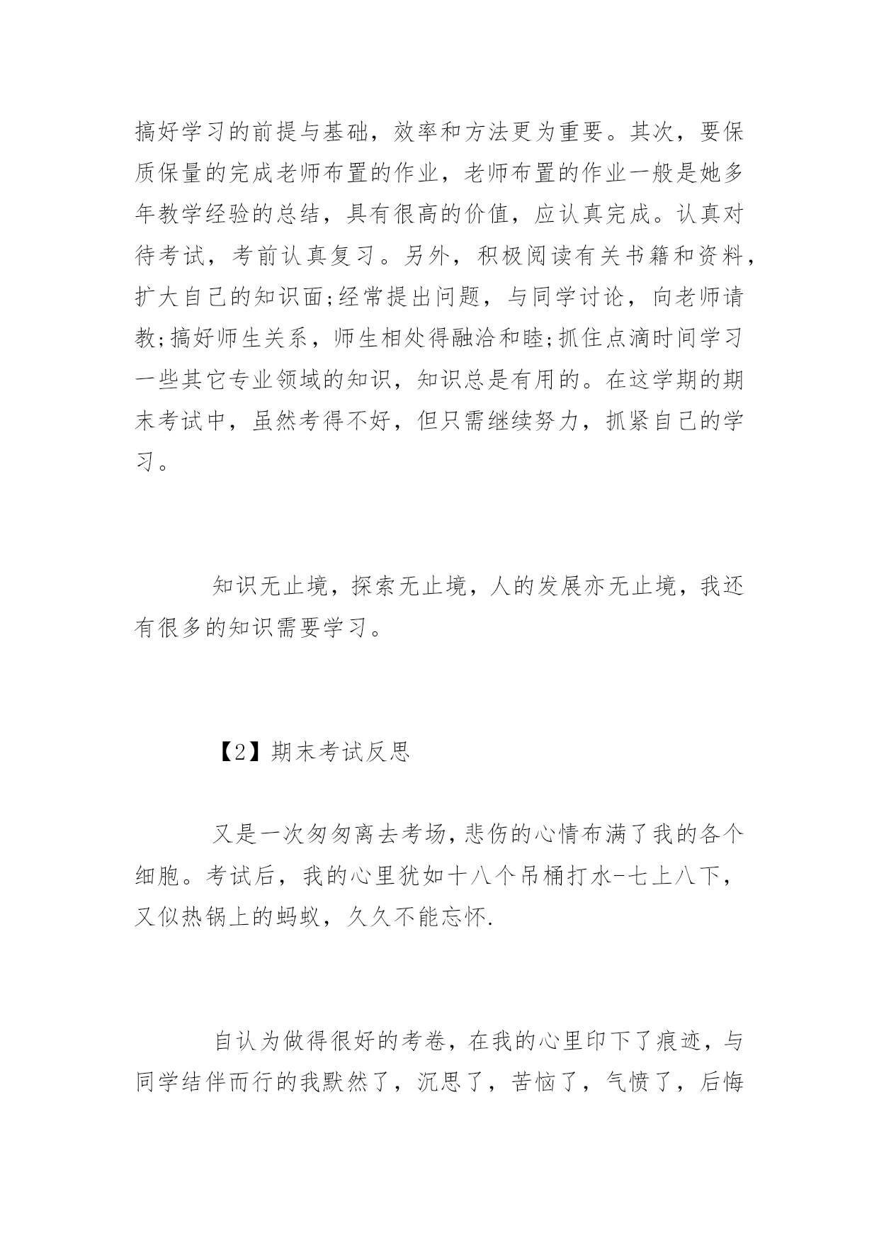 期末考试反思期末考试反思1000字又一个学期就这样结束了。迎来了盼望已久的寒假。下面是小编精选的期末考试反思,欢迎参考!【1】期末考试反思时光飞逝,斗转星移。回首这半年的点点滴滴,朝朝暮暮,心中顿生了许多感触。这半年中经历的每一天,都已在我心中留下了永久的印记,因为这些印记见证我这样一个新生的成长。在过去半年的内,通过不断地学习,我收获了很多。时间就是这么无情头也不回的向前走着,而我们却在为了不被它丢下死命的追赶着。是的,谁都不想被时间丢下。而我们也随着时间的流逝一点一点的成长。而美好的纯真随着风雨的磨灭化成了成熟。或许这正是成长的代价。回想自己还是考生的那段日子,显得是那么的遥远。我在憧憬中懂得了来之不易的珍惜;在思索中了解了酝酿已久的真理;在收获后才知道努力的甜美。突然觉得自己似乎明白了许多事情,但是仔细琢磨后又不尽然……原来过去所见所识都是那么的偏见而又肤浅,以前的天真似乎在一瞬间幻化成无知和可笑,我想谁又不是这样的呢?或许在以后也会嘲笑现在的渺小……我们不得不笑着回首我们所走过的路:出勤情况:请了一次病假。拉下一天的课希望下学期争取做到全勤本学期没有迟到的情况。在日常生活上:以前我是一个衣来伸手饭来张口的小孩子,而通过紧张的学习生活和这半年老师和同学们的帮助,使我养成了独立性,不再娇生惯养,现在我已经能做一些力所能及的家务了。在学习上:我深知学习的重要性。面对二十一世纪这个知识的时代,面对知识就是力量,科学技术是第一生产力的科学论断,我认为离开了知识将是一个一无是处的废人。以资本为最重要生产力的“资本家”的时代将要过去,以知识为特征的“知本家”的时代即将到来。而中学时代是学习现代科学知识的黄金时代,中国的本科教育又是世界一流的,我应该抓住这个有利的时机,用知识来武装自己的头脑,知识是无价的。首先,合理安排时间,调整好作息时间,分配好学习、工作、娱乐的时间。时间是搞好学习的前提与基础,效率和方法更为重要。其次,要保质保量的完成老师布置的作业,老师布置的作业一般是她多年教学经验的总结,具有很高的价值,应认真完成。认真对待考试,考前认真复习。另外,积极阅读有关书籍和资料,扩大自己的知识面;经常提出问题,与同学讨论,向老师请教;搞好师生关系,师生相处得融洽和睦;抓住点滴时间学习一些其它专业领域的知识,知识总是有用的。在这学期的期末考试中,虽然考得不好,但只需继续努力,抓紧自己的学习。知识无止境,探索无止境,人的发展亦无止境,我还有很多的知识需要学习。【2】期末考试反思又是一次匆匆离去考场,悲伤的心情布满了我的各个细胞。考试后,我的心里犹如十八个吊桶打水-七上八下,又似热锅上的蚂蚁,久久不能忘怀.自认为做得很好的考卷,在我的心里印下了痕迹,与同学结伴而行的我默然了,沉思了,苦恼了,气愤了,后悔了,伤心了……悲伤的感觉同时充溢了我的大脑,内心的恐惧抑制不住得释放出来.失败的考试似乎毁灭了我的信心,讽刺、批评、嘲笑……种种声音跃在我的耳畔.当我知道我只考了96.5时,心里非常难过,我立马看了看错的题,结果让我大吃一惊!别的同学都考了很好的分数,但是我却考了……呜呜呜呜呜呜!背着沉重的书包,再一次感叹世界的不平,再一次后悔考试时的.发挥,再一次气愤无情的学习,再一次痛恨残酷的竞争.泪珠在眼眶里不停地打转,充实的血管似乎即将爆裂,凄凉地我仰天眺望,期待着老天再一次将我的末日吞噬.“哦,天上的神仙,看看我这个无助的女孩,让快乐降临在我的身上.”我不停地祈祷.考试后的心情,苦涩交加,像打翻的五味盒。又像是吃了还未成熟的果子。考试后的心情,像最后一颗糖,化在舌尖时那么一点点的惋惜!考试后的眼泪,如苦涩青果,化在这雪白的纸上。考试后的时间,为何过的那样慢,如凝固了一般!一系列的试后保佑,并没有赶走我凄凉地心情,反而愈发不可收拾.终于迈着沉重的步伐回到了家,无情的泪水夺眶而出,又一次拿起笔,做着永远做不完的作业,幻想用此法将痛苦至于心底.窗外忽然下起了雨,冲动的我恨不得冲出门外,让雨点尽情打湿我的衣裳,赶走我悲伤的乌云.我做到了,摆脱了雨伞的束缚,让无情的雨点布满我的全身,似乎只有这样,心情才会得到好转.此时,一声哈欠打破了我白日做梦的思维,回到温暖的屋子不知怎的,似乎使我再一次坠入了深谷.以往我自认为我很棒,可是,现在就证明了,我还是不行的。之前,每天放学回家,做完老师的作业后,我马上飞奔出去,玩去了。总觉得一个人在家太孤单了。作文的分数也是很多的我们不能小看它也不能因为自己的一点小弱点