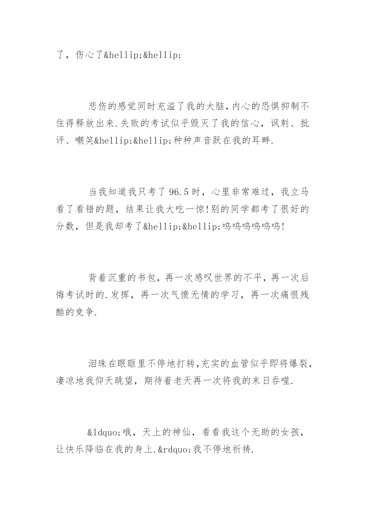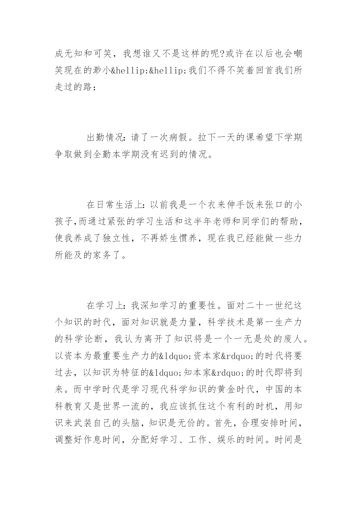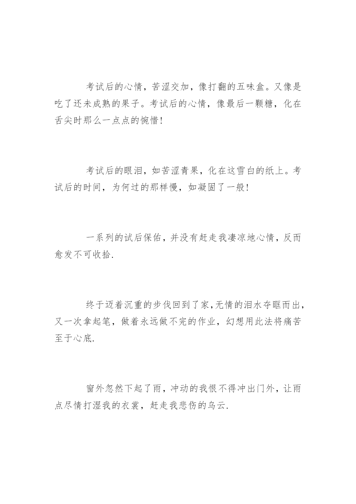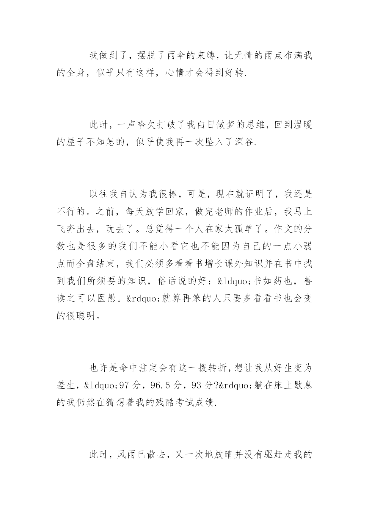 期末考试反思期末考试反思1000字又一个学期就这样结束了。迎来了盼望已久的寒假。下面是小编精选的期末考试反思,欢迎参考!【1】期末考试反思时光飞逝,斗转星移。回首这半年的点点滴滴,朝朝暮暮,心中顿生了许多感触。这半年中经历的每一天,都已在我心中留下了永久的印记,因为这些印记见证我这样一个新生的成长。在过去半年的内,通过不断地学习,我收获了很多。时间就是这么无情头也不回的向前走着,而我们却在为了不被它丢下死命的追赶着。是的,谁都不想被时间丢下。而我们也随着时间的流逝一点一点的成长。而美好的纯真随着风雨的磨灭化成了成熟。或许这正是成长的代价。回想自己还是考生的那段日子,显得是那么的遥远。我在憧憬中懂得了来之不易的珍惜;在思索中了解了酝酿已久的真理;在收获后才知道努力的甜美。突然觉得自己似乎明白了许多事情,但是仔细琢磨后又不尽然……原来过去所见所识都是那么的偏见而又肤浅,以前的天真似乎在一瞬间幻化成无知和可笑,我想谁又不是这样的呢?或许在以后也会嘲笑现在的渺小……我们不得不笑着回首我们所走过的路:出勤情况:请了一次病假。拉下一天的课希望下学期争取做到全勤本学期没有迟到的情况。在日常生活上:以前我是一个衣来伸手饭来张口的小孩子,而通过紧张的学习生活和这半年老师和同学们的帮助,使我养成了独立性,不再娇生惯养,现在我已经能做一些力所能及的家务了。在学习上:我深知学习的重要性。面对二十一世纪这个知识的时代,面对知识就是力量,科学技术是第一生产力的科学论断,我认为离开了知识将是一个一无是处的废人。以资本为最重要生产力的“资本家”的时代将要过去,以知识为特征的“知本家”的时代即将到来。而中学时代是学习现代科学知识的黄金时代,中国的本科教育又是世界一流的,我应该抓住这个有利的时机,用知识来武装自己的头脑,知识是无价的。首先,合理安排时间,调整好作息时间,分配好学习、工作、娱乐的时间。时间是搞好学习的前提与基础,效率和方法更为重要。其次,要保质保量的完成老师布置的作业,老师布置的作业一般是她多年教学经验的总结,具有很高的价值,应认真完成。认真对待考试,考前认真复习。另外,积极阅读有关书籍和资料,扩大自己的知识面;经常提出问题,与同学讨论,向老师请教;搞好师生关系,师生相处得融洽和睦;抓住点滴时间学习一些其它专业领域的知识,知识总是有用的。在这学期的期末考试中,虽然考得不好,但只需继续努力,抓紧自己的学习。知识无止境,探索无止境,人的发展亦无止境,我还有很多的知识需要学习。【2】期末考试反思又是一次匆匆离去考场,悲伤的心情布满了我的各个细胞。考试后,我的心里犹如十八个吊桶打水-七上八下,又似热锅上的蚂蚁,久久不能忘怀.自认为做得很好的考卷,在我的心里印下了痕迹,与同学结伴而行的我默然了,沉思了,苦恼了,气愤了,后悔了,伤心了……悲伤的感觉同时充溢了我的大脑,内心的恐惧抑制不住得释放出来.失败的考试似乎毁灭了我的信心,讽刺、批评、嘲笑……种种声音跃在我的耳畔.当我知道我只考了96.5时,心里非常难过,我立马看了看错的题,结果让我大吃一惊!别的同学都考了很好的分数,但是我却考了……呜呜呜呜呜呜!背着沉重的书包,再一次感叹世界的不平,再一次后悔考试时的.发挥,再一次气愤无情的学习,再一次痛恨残酷的竞争.泪珠在眼眶里不停地打转,充实的血管似乎即将爆裂,凄凉地我仰天眺望,期待着老天再一次将我的末日吞噬.“哦,天上的神仙,看看我这个无助的女孩,让快乐降临在我的身上.”我不停地祈祷.考试后的心情,苦涩交加,像打翻的五味盒。又像是吃了还未成熟的果子。考试后的心情,像最后一颗糖,化在舌尖时那么一点点的惋惜!考试后的眼泪,如苦涩青果,化在这雪白的纸上。考试后的时间,为何过的那样慢,如凝固了一般!一系列的试后保佑,并没有赶走我凄凉地心情,反而愈发不可收拾.终于迈着沉重的步伐回到了家,无情的泪水夺眶而出,又一次拿起笔,做着永远做不完的作业,幻想用此法将痛苦至于心底.窗外忽然下起了雨,冲动的我恨不得冲出门外,让雨点尽情打湿我的衣裳,赶走我悲伤的乌云.我做到了,摆脱了雨伞的束缚,让无情的雨点布满我的全身,似乎只有这样,心情才会得到好转.此时,一声哈欠打破了我白日做梦的思维,回到温暖的屋子不知怎的,似乎使我再一次坠入了深谷.以往我自认为我很棒,可是,现在就证明了,我还是不行的。之前,每天放学回家,做完老师的作业后,我马上飞奔出去,玩去了。总觉得一个人在家太孤单了。作文的分数也是很多的我们不能小看它也不能因为自己的一点小弱点