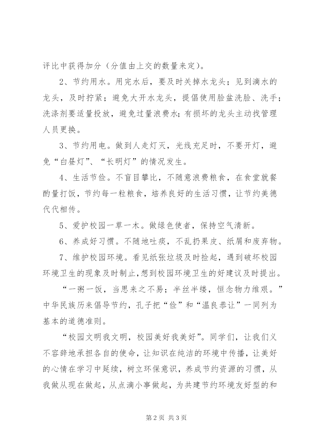 第PAGE\*Arabic\*MERGEFORMAT3页共NUMPAGES\*MERGEFORMAT3页校园环保倡议书格式亲爱的同学们:你们知道吗。中国人均资源量仅为世界平均水平的1/2,人均水资源量仅为1/4,森林覆盖率仅为世界水平的60%左右,于是国家提出了建设节约型社会的号召,校园环保倡议书。教育资源是社会资源的重要组成部分,节约型社会呼唤节约型校园,期待建设节约型校园。学校是育人的场所,环境教育是提高我们思想道德素质和科学文化素质的基本手段之一,建立节约型和环境友好型校园,这不仅是学校自身发展的需要,更是我们小学生应有的社会责任。当你在这美丽的校园中学习,为我们美好的未来而努力着时,相信我们每一个同学都渴望有一个干净的校园,渴望健康的生命,渴望绿色,渴望我们有一个良好的生活环境,倡议书《校园环保倡议书》。为了增强大家的环境保护意识,营造建设节约型校园的良好氛围,让校园、班级环境更加整洁靓丽,我校少队恳切地向师生们提出如下倡议:1、废品回收:每班在各自的教室后面设置一个资源回收角(可用纸箱或袋子代替),将可回收垃圾,如:废纸、废塑料、废金属、废橡胶、废织物等置入其中,每周五中午1:00由各班班长将其上交到我校少队辅导员处,上交的班可在当周文明班级评比中获得加分(分值由上交的数量来定)。2、节约用水。用完水后,要及时关掉水龙头;见到滴水的龙头,及时拧紧;避免大开水龙头,提倡使用脸盆洗脸、洗手;洗涤剂要适量投放,避免过量浪费水;有损坏的龙头主动找管理人员更换。3、节约用电。做到人走灯灭,光线充足时,不要开灯,避免“白昼灯”、“长明灯”的情况发生。4、生活节俭。不盲目攀比,不随意浪费粮食,在食堂就餐酌量打饭,节约每一粒粮食,培养良好的生活习惯,让节约美德代代相传。5、爱护校园一草一木。做绿色使者,保持空气清新。6、养成好习惯。不随地吐痰,不乱扔果皮、纸屑和废弃物。7、维护校园环境。看见纸张垃圾及时捡起,遇到破坏校园环境卫生的现象及时制止,想到校园环境卫生的好建议及时提出。“一粥一饭,当思来之不易;半丝半缕,恒念物力维艰。”中华民族历来倡导节约,孔子把“俭”和“温良恭让”一同列为基本的道德准则。“校园文明我文明,校园美好我美好”。同学们,让我们义不容辞地承担各自的使命,让知识在纯洁的环境中传播,让美好的心情在学习中延续,树立环保意识,养成节约资源的习惯,从我做从现在做起,从点滴小事做起,为共建节约环境友好型的和谐校园而努力吧。