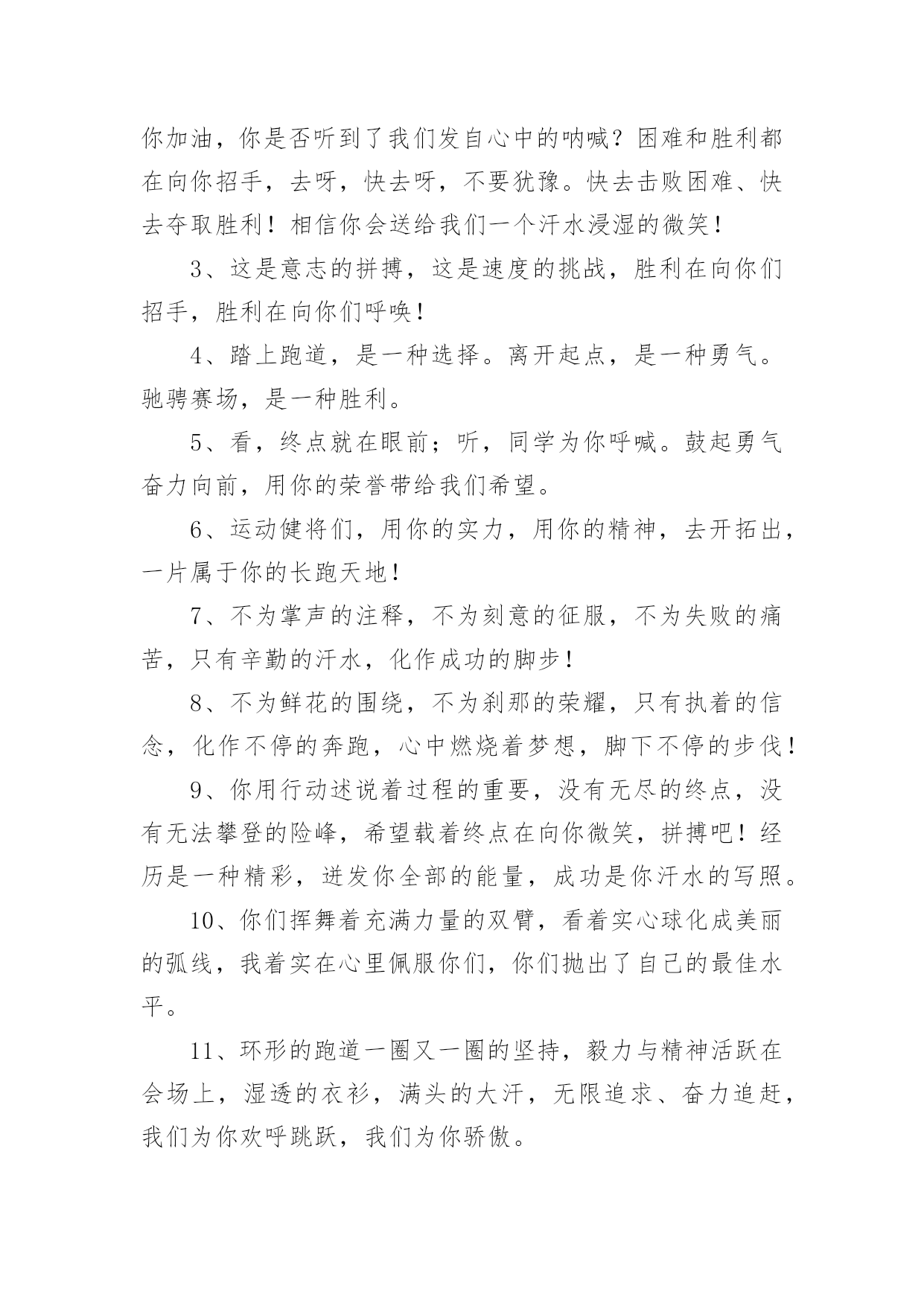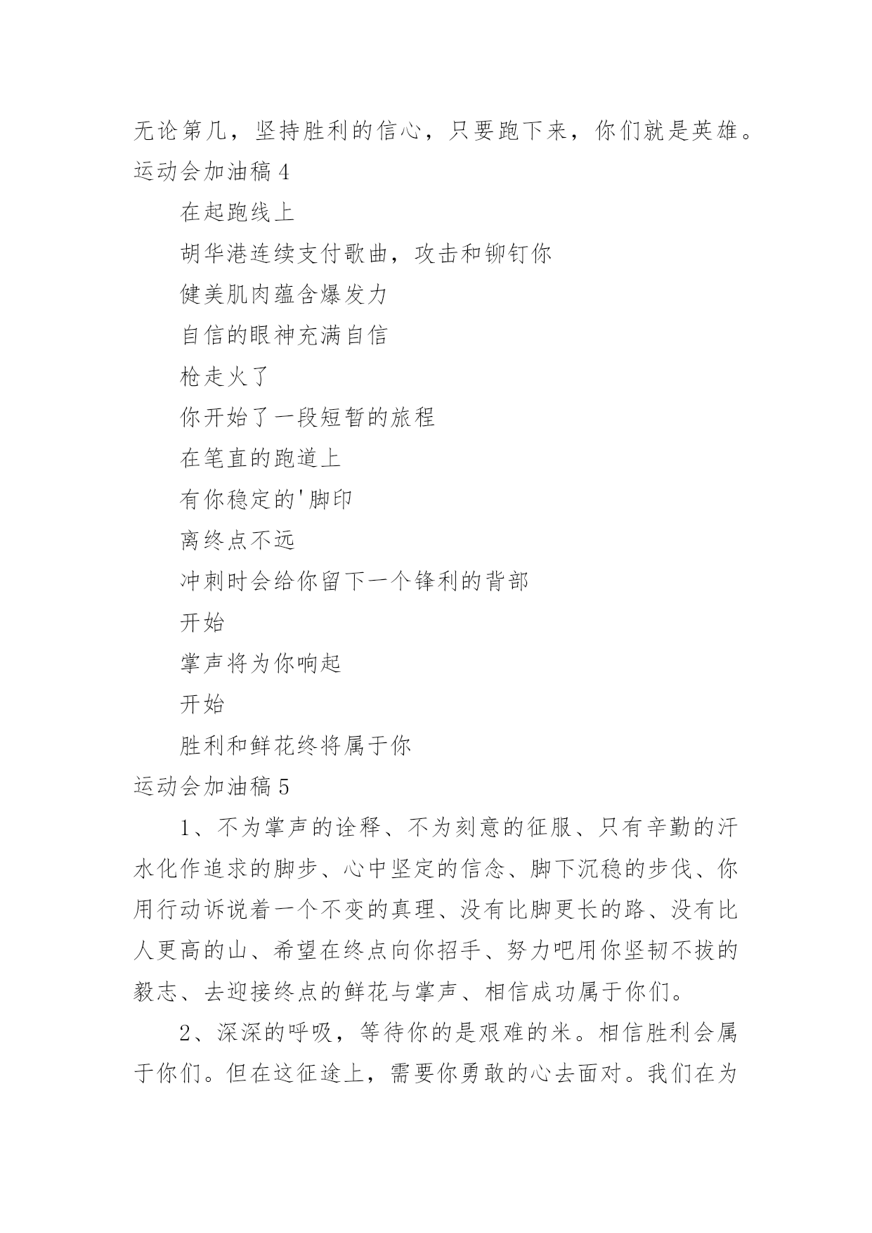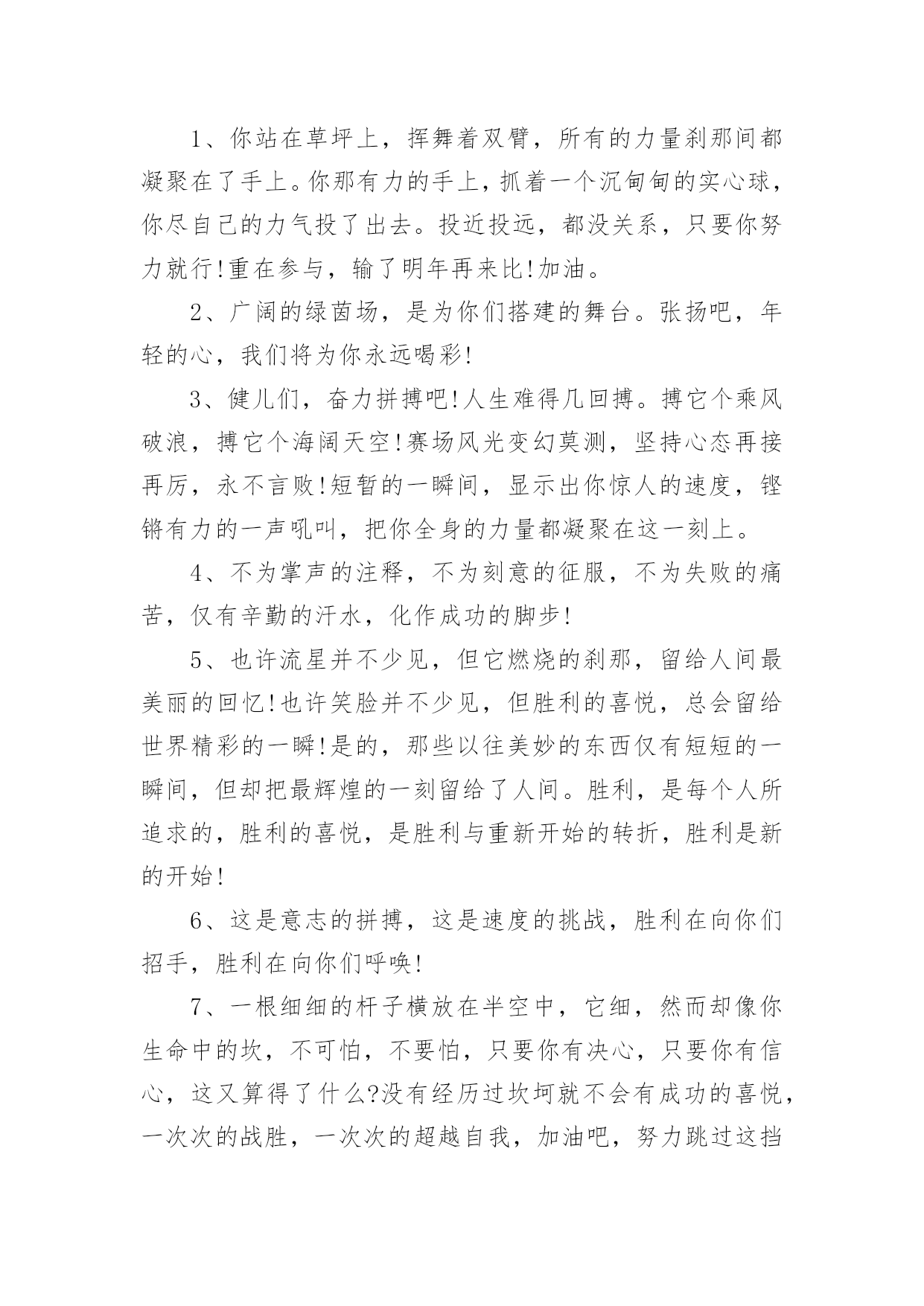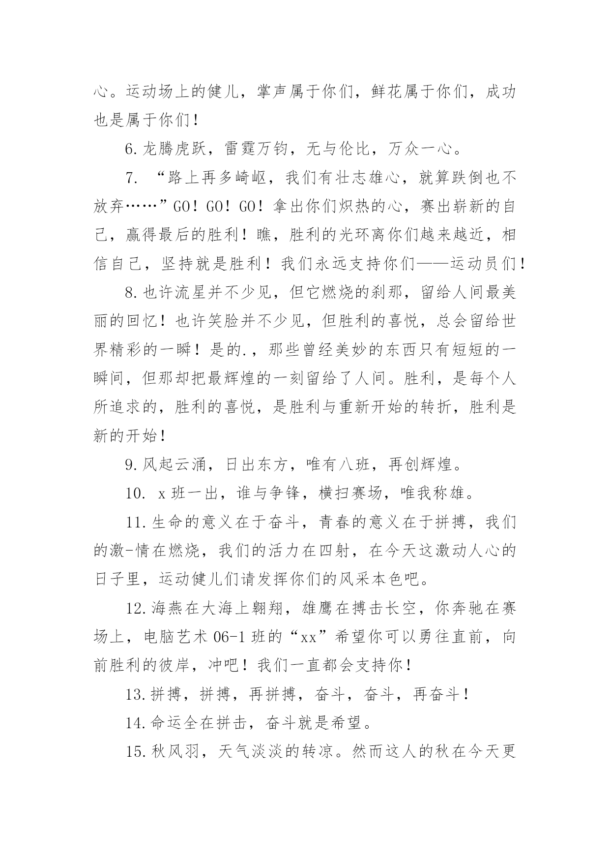运动会加油稿【荐】运动会加油稿15篇在日新月异的现代社会中,我们可以使用加油稿的机会越来越多,借助加油稿可以激励他人的士气。那么问题来了,到底应如何写好一份加油稿呢?以下是小编精心整理的运动会加油稿,欢迎阅读,希望大家能够喜欢。运动会加油稿11.不卑不亢,奋发向上,生命辉煌,我们开创。2.龙腾虎跃,雷霆万钧,无与伦比,万众一心。3.青春无畏,逐梦扬威!4.沉甸甸的铅球,寄托着你的希望,奋力一抛的瞬间,一道闪亮的弧线划破美丽的长空,希望向前,再向前!你胜利了,望着远方红色的终点线,那是汗水铺成的路,泪水堆成的山,平时的努力与奋战,不就为这一瞬间,于是你们用尽全身力气,冲向那决定命运的红线,你胜利了,耳旁飘来了同学们的欢呼与赞叹。5.每一份辛劳都有一份收获,每一次的痛苦都是快乐的开始,没一声呐喊都是力量的呼唤。我们有着大浪拍岸的豪迈,所以你不必在乎小荷初露的恬静,我们有着春日的阳光明媚,所以不用去羡慕冬日乱玉碎琼,我们是雨天的一把伞,是寒冷冬日里的一盆碳火,温暖的不只是你我,而是大家的心。运动场上的健儿,掌声属于你们,鲜花属于你们,成功也是属于你们!6.龙腾虎跃,雷霆万钧,无与伦比,万众一心。7.“路上再多崎岖,我们有壮志雄心,就算跌倒也不放弃……”GO!GO!GO!拿出你们炽热的心,赛出崭新的自己,赢得最后的胜利!瞧,胜利的光环离你们越来越近,相信自己,坚持就是胜利!我们永远支持你们——运动员们!8.也许流星并不少见,但它燃烧的刹那,留给人间最美丽的回忆!也许笑脸并不少见,但胜利的喜悦,总会留给世界精彩的一瞬!是的.,那些曾经美妙的东西只有短短的一瞬间,但那却把最辉煌的一刻留给了人间。胜利,是每个人所追求的,胜利的喜悦,是胜利与重新开始的转折,胜利是新的开始!9.风起云涌,日出东方,唯有八班,再创辉煌。10.x班一出,谁与争锋,横扫赛场,唯我称雄。11.生命的意义在于奋斗,青春的意义在于拼搏,我们的激-情在燃烧,我们的活力在四射,在今天这激动人心的日子里,运动健儿们请发挥你们的风采本色吧。12.海燕在大海上翱翔,雄鹰在搏击长空,你奔驰在赛场上,电脑艺术06-1班的“xx”希望你可以勇往直前,向前胜利的彼岸,冲吧!我们一直都会支持你!13.拼搏,拼搏,再拼搏,奋斗,奋斗,再奋斗!14.命运全在拼击,奋斗就是希望。15.秋风羽,天气淡淡的转凉。然而这人的秋在今天更加迷人,不是因为它的秋高气爽,也不是因为它的明媚阳光,是因为今天的人儿倍加精神气爽。看!运动场上那一幕幕,一股股,无论是哭是笑,市喜是悲,其中都融入了他们的汗水、辛劳。他们是真正的矫健者,是运动场上的骄儿,更是我们心中的英雄。加油吧!英雄们!16.奥林匹克精神佳,运动健将拼搏强。在运动场上的运动健儿们,发挥你们的特长,展示你们的风采,让你们的身影在运动场上留下优美的风景线,让你们的雄心壮志在运动场上发挥的淋漓尽致。17.十班十班,唯有我先,奋力拼搏,勇往直前。18.努力拼搏,永不言弃。19.超越自我,秀出风采!20.在同一片晴空下,我们相聚一齐,或欢乐、或失落、或兴奋、或悲伤,尽数写在我们的脸旁。我们曾一齐悲伤,在那个败北的沙坑上;我们也一齐击掌,在这红色的跑道上。在同一片晴空下,我们拼搏,为美丽的目标;我们奋斗,为班级的辉煌。这就是团结、奋进、礼貌的xx班。运动会加油稿2走过荒山野岭高峡低谷,我们在沿途燃起篝火。一站一站的路被抛在身后,我们感到疲惫感到困惑。还有那么长的`路伸向远方,远方那片星光藏在哪儿,远方那颗童话树躲在何处?努力吧,奋斗吧!远方有我们的理想,有我们的希望!运动会加油稿31、你站在草坪上,挥舞着双臂,所有的力量刹那间都凝聚在了手上。你那有力的手上,抓着一个沉甸甸的实心球,你尽自己的力气投了出去。投近投远,都没关系,只要你努力就行!重在参与,输了明年再来比!加油。2、广阔的绿茵场,是为你们搭建的舞台。张扬吧,年轻的心,我们将为你永远喝彩!3、健儿们,奋力拼搏吧!人生难得几回搏。搏它个乘风破浪,搏它个海阔天空!赛场风光变幻莫测,坚持心态再接再厉,永不言败!短暂的一瞬间,显示出你惊人的速度,铿锵有力的一声吼叫,把你全身的力量都凝聚在这一刻上。4、不为掌声的注释,不为刻意的征服,不为失败的痛苦,仅有辛勤的汗水,化作成功的脚步!5、也许流星并不少见,但它燃烧的刹那,留给人间最美丽的回忆!也许笑脸并不少见,但胜利的喜悦,总会留给世界精彩的一瞬!是的,那些以往美妙的东西仅有短短的一瞬间,但却把最辉煌的一刻留给了人间。胜利,是每个人所追求的,胜利的喜悦,是胜利与重新开始的转折,胜利是新的开始!6、这是意志的拼搏,这是速度的挑战,胜利在向你们招手,胜利在向你们呼唤!7、一根细细的杆子横放在半空中,它细,然而却像你生命中的坎,不可怕,不要怕,只要你有决心,只要你有信心,