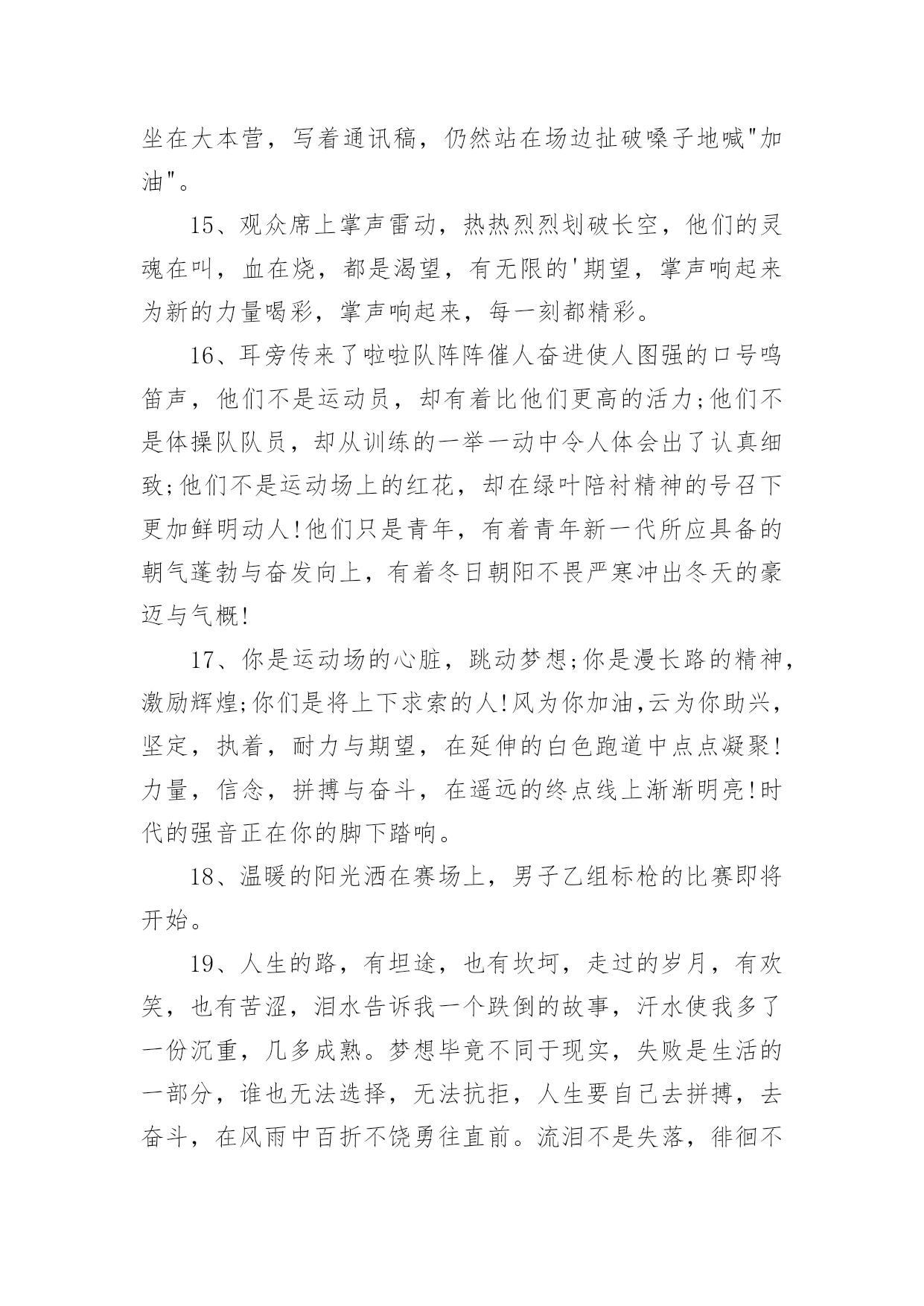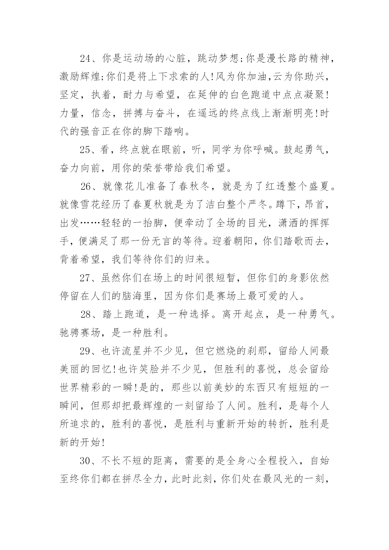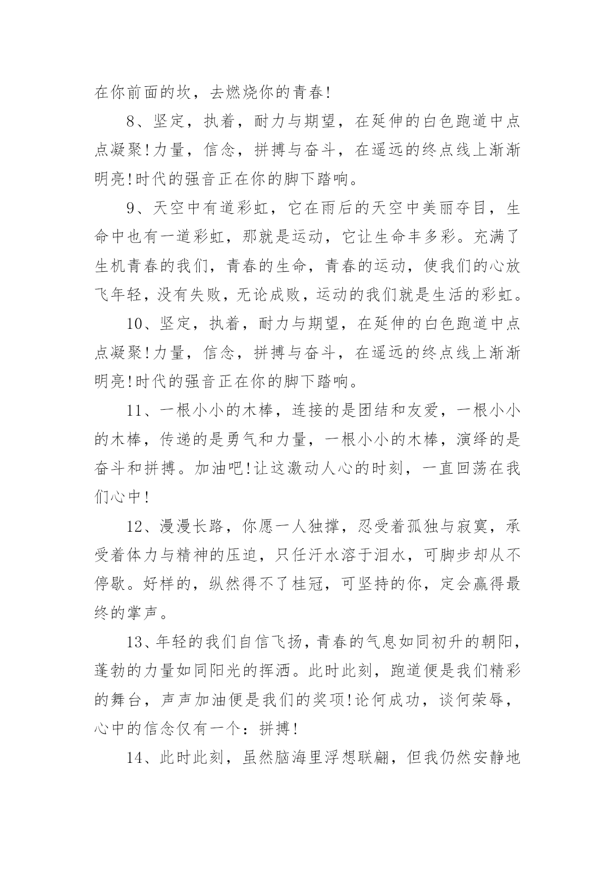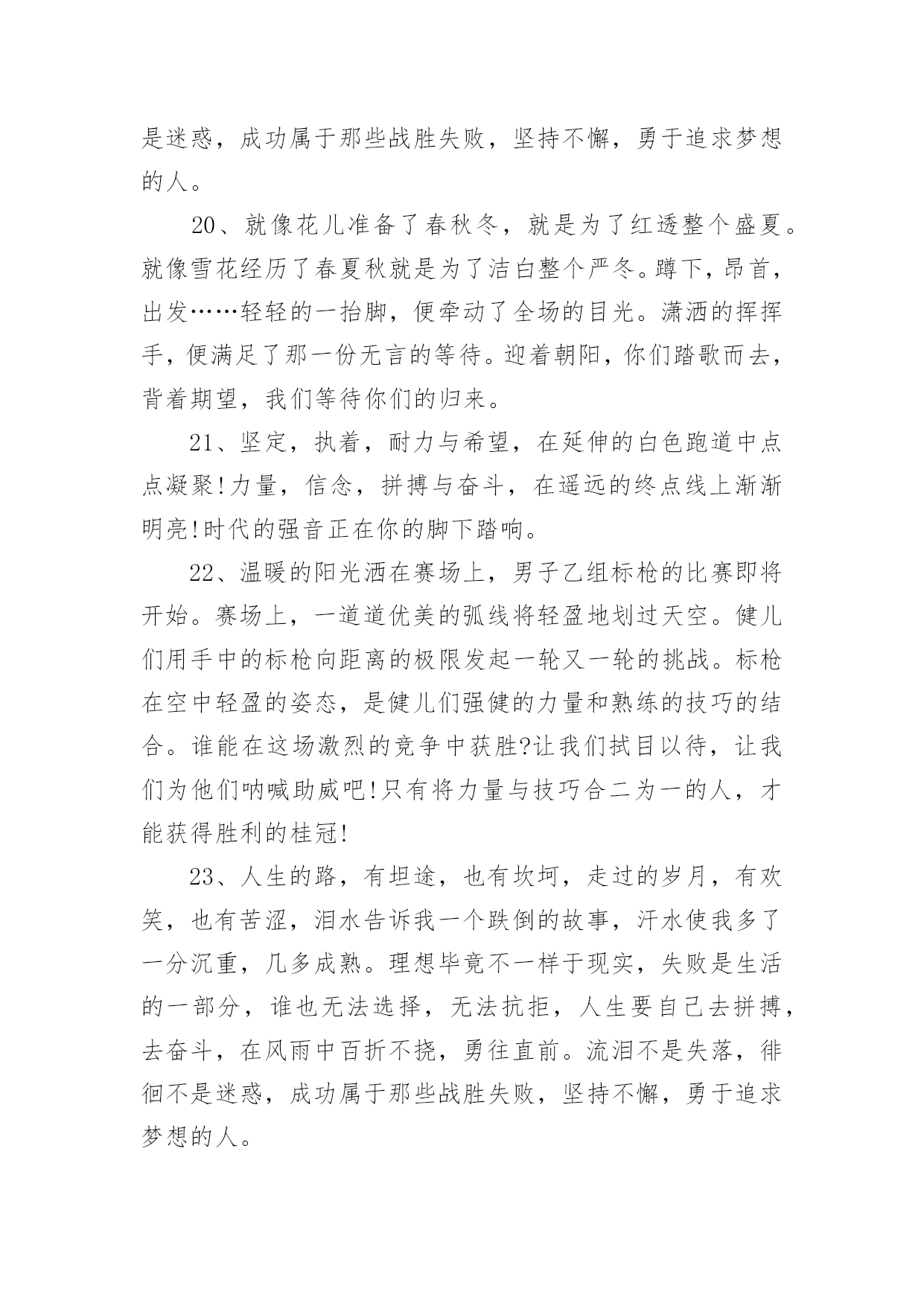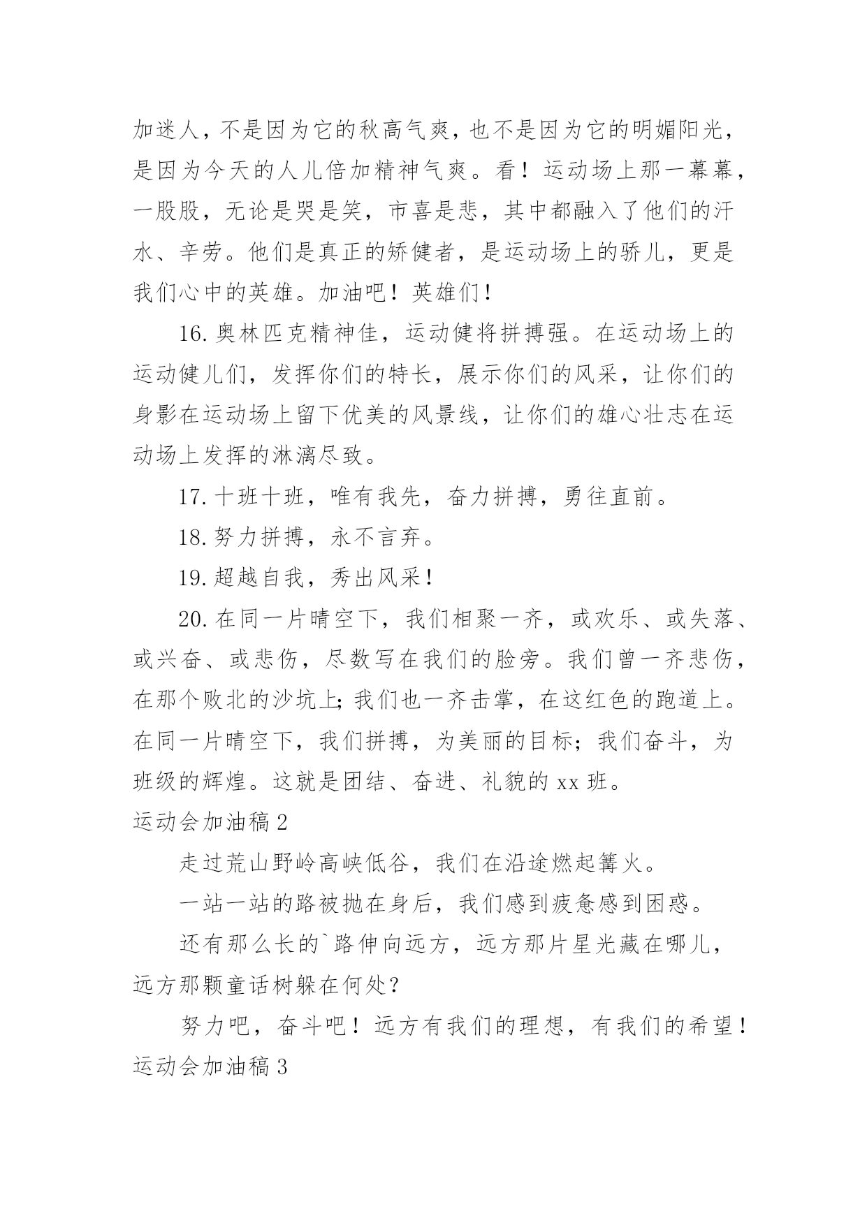 运动会加油稿【荐】运动会加油稿15篇在日新月异的现代社会中,我们可以使用加油稿的机会越来越多,借助加油稿可以激励他人的士气。那么问题来了,到底应如何写好一份加油稿呢?以下是小编精心整理的运动会加油稿,欢迎阅读,希望大家能够喜欢。运动会加油稿11.不卑不亢,奋发向上,生命辉煌,我们开创。2.龙腾虎跃,雷霆万钧,无与伦比,万众一心。3.青春无畏,逐梦扬威!4.沉甸甸的铅球,寄托着你的希望,奋力一抛的瞬间,一道闪亮的弧线划破美丽的长空,希望向前,再向前!你胜利了,望着远方红色的终点线,那是汗水铺成的路,泪水堆成的山,平时的努力与奋战,不就为这一瞬间,于是你们用尽全身力气,冲向那决定命运的红线,你胜利了,耳旁飘来了同学们的欢呼与赞叹。5.每一份辛劳都有一份收获,每一次的痛苦都是快乐的开始,没一声呐喊都是力量的呼唤。我们有着大浪拍岸的豪迈,所以你不必在乎小荷初露的恬静,我们有着春日的阳光明媚,所以不用去羡慕冬日乱玉碎琼,我们是雨天的一把伞,是寒冷冬日里的一盆碳火,温暖的不只是你我,而是大家的心。运动场上的健儿,掌声属于你们,鲜花属于你们,成功也是属于你们!6.龙腾虎跃,雷霆万钧,无与伦比,万众一心。7.“路上再多崎岖,我们有壮志雄心,就算跌倒也不放弃……”GO!GO!GO!拿出你们炽热的心,赛出崭新的自己,赢得最后的胜利!瞧,胜利的光环离你们越来越近,相信自己,坚持就是胜利!我们永远支持你们——运动员们!8.也许流星并不少见,但它燃烧的刹那,留给人间最美丽的回忆!也许笑脸并不少见,但胜利的喜悦,总会留给世界精彩的一瞬!是的.,那些曾经美妙的东西只有短短的一瞬间,但那却把最辉煌的一刻留给了人间。胜利,是每个人所追求的,胜利的喜悦,是胜利与重新开始的转折,胜利是新的开始!9.风起云涌,日出东方,唯有八班,再创辉煌。10.x班一出,谁与争锋,横扫赛场,唯我称雄。11.生命的意义在于奋斗,青春的意义在于拼搏,我们的激-情在燃烧,我们的活力在四射,在今天这激动人心的日子里,运动健儿们请发挥你们的风采本色吧。12.海燕在大海上翱翔,雄鹰在搏击长空,你奔驰在赛场上,电脑艺术06-1班的“xx”希望你可以勇往直前,向前胜利的彼岸,冲吧!我们一直都会支持你!13.拼搏,拼搏,再拼搏,奋斗,奋斗,再奋斗!14.命运全在拼击,奋斗就是希望。15.秋风羽,天气淡淡的转凉。然而这人的秋在今天更加迷人,不是因为它的秋高气爽,也不是因为它的明媚阳光,是因为今天的人儿倍加精神气爽。看!运动场上那一幕幕,一股股,无论是哭是笑,市喜是悲,其中都融入了他们的汗水、辛劳。他们是真正的矫健者,是运动场上的骄儿,更是我们心中的英雄。加油吧!英雄们!16.奥林匹克精神佳,运动健将拼搏强。在运动场上的运动健儿们,发挥你们的特长,展示你们的风采,让你们的身影在运动场上留下优美的风景线,让你们的雄心壮志在运动场上发挥的淋漓尽致。17.十班十班,唯有我先,奋力拼搏,勇往直前。18.努力拼搏,永不言弃。19.超越自我,秀出风采!20.在同一片晴空下,我们相聚一齐,或欢乐、或失落、或兴奋、或悲伤,尽数写在我们的脸旁。我们曾一齐悲伤,在那个败北的沙坑上;我们也一齐击掌,在这红色的跑道上。在同一片晴空下,我们拼搏,为美丽的目标;我们奋斗,为班级的辉煌。这就是团结、奋进、礼貌的xx班。运动会加油稿2走过荒山野岭高峡低谷,我们在沿途燃起篝火。一站一站的路被抛在身后,我们感到疲惫感到困惑。还有那么长的`路伸向远方,远方那片星光藏在哪儿,远方那颗童话树躲在何处?努力吧,奋斗吧!远方有我们的理想,有我们的希望!运动会加油稿31、你站在草坪上,挥舞着双臂,所有的力量刹那间都凝聚在了手上。你那有力的手上,抓着一个沉甸甸的实心球,你尽自己的力气投了出去。投近投远,都没关系,只要你努力就行!重在参与,输了明年再来比!加油。2、广阔的绿茵场,是为你们搭建的舞台。张扬吧,年轻的心,我们将为你永远喝彩!3、健儿们,奋力拼搏吧!人生难得几回搏。搏它个乘风破浪,搏它个海阔天空!赛场风光变幻莫测,坚持心态再接再厉,永不言败!短暂的一瞬间,显示出你惊人的速度,铿锵有力的一声吼叫,把你全身的力量都凝聚在这一刻上。4、不为掌声的注释,不为刻意的征服,不为失败的痛苦,仅有辛勤的汗水,化作成功的脚步!5、也许流星并不少见,但它燃烧的刹那,留给人间最美丽的回忆!也许笑脸并不少见,但胜利的喜悦,总会留给世界精彩的一瞬!是的,那些以往美妙的东西仅有短短的一瞬间,但却把最辉煌的一刻留给了人间。胜利,是每个人所追求的,胜利的喜悦,是胜利与重新开始的转折,胜利是新的开始!6、这是意志的拼搏,这是速度的挑战,胜利在向你们招手,胜利在向你们呼唤!7、一根细细的杆子横放在半空中,它细,然而却像你生命中的坎,不可怕,不要怕,只要你有决心,只要你有信心,